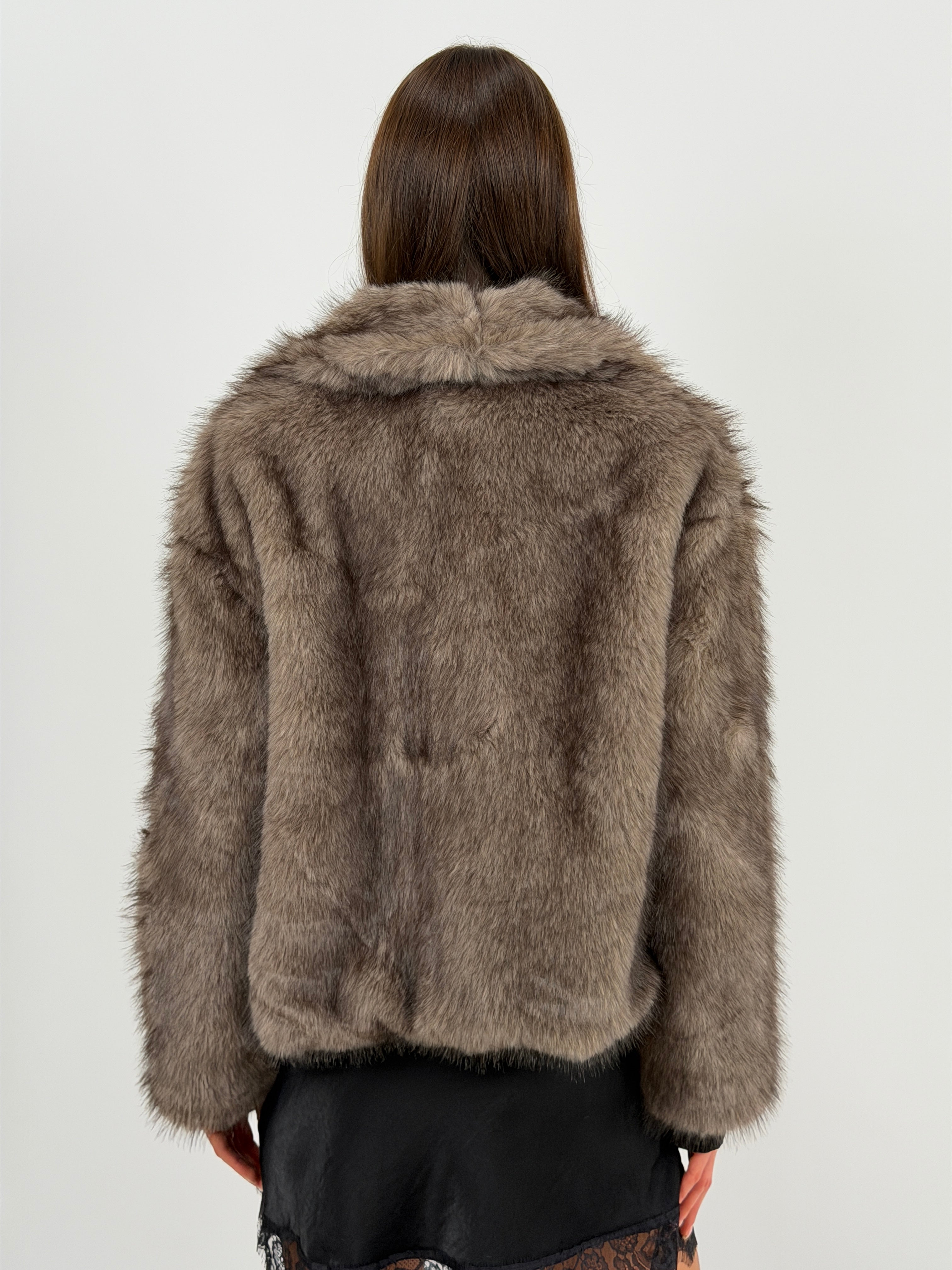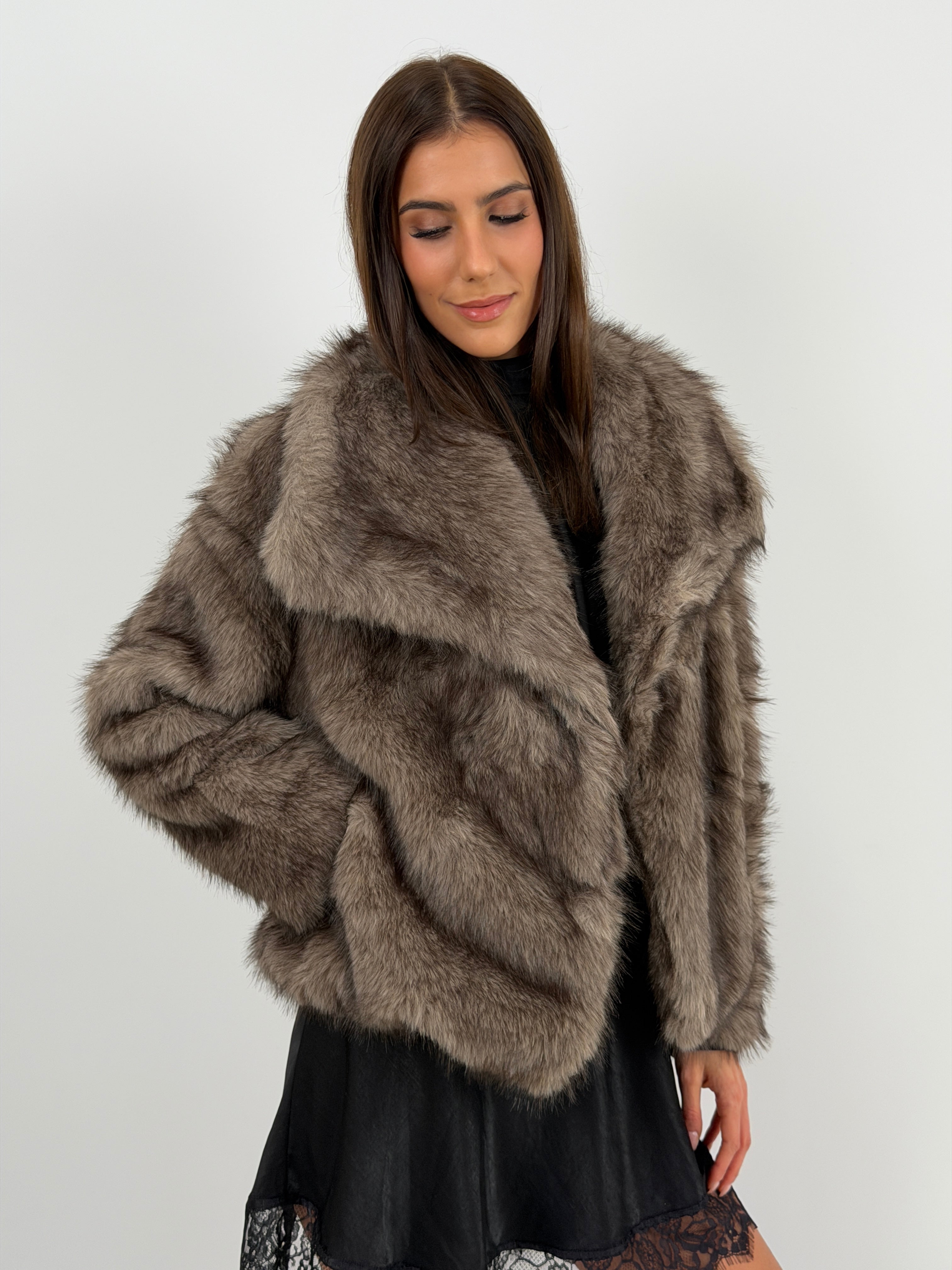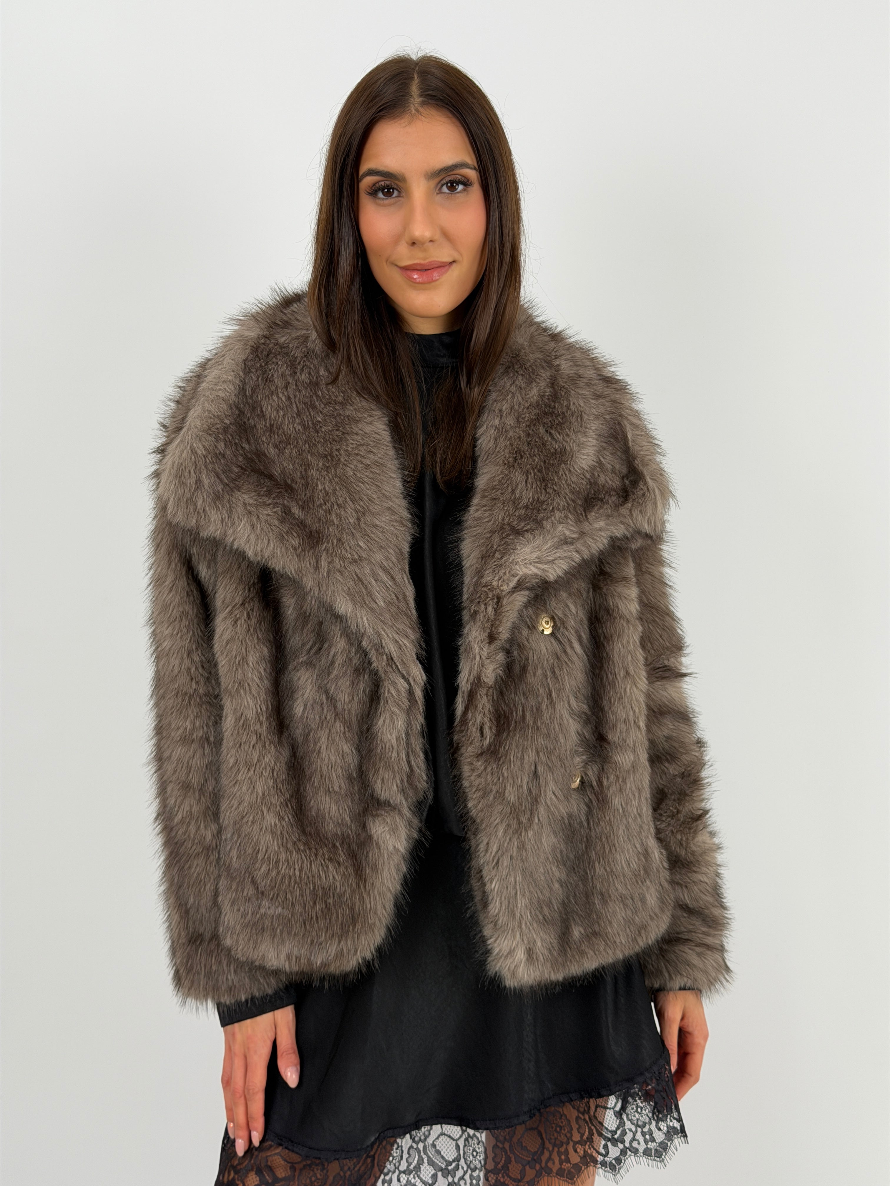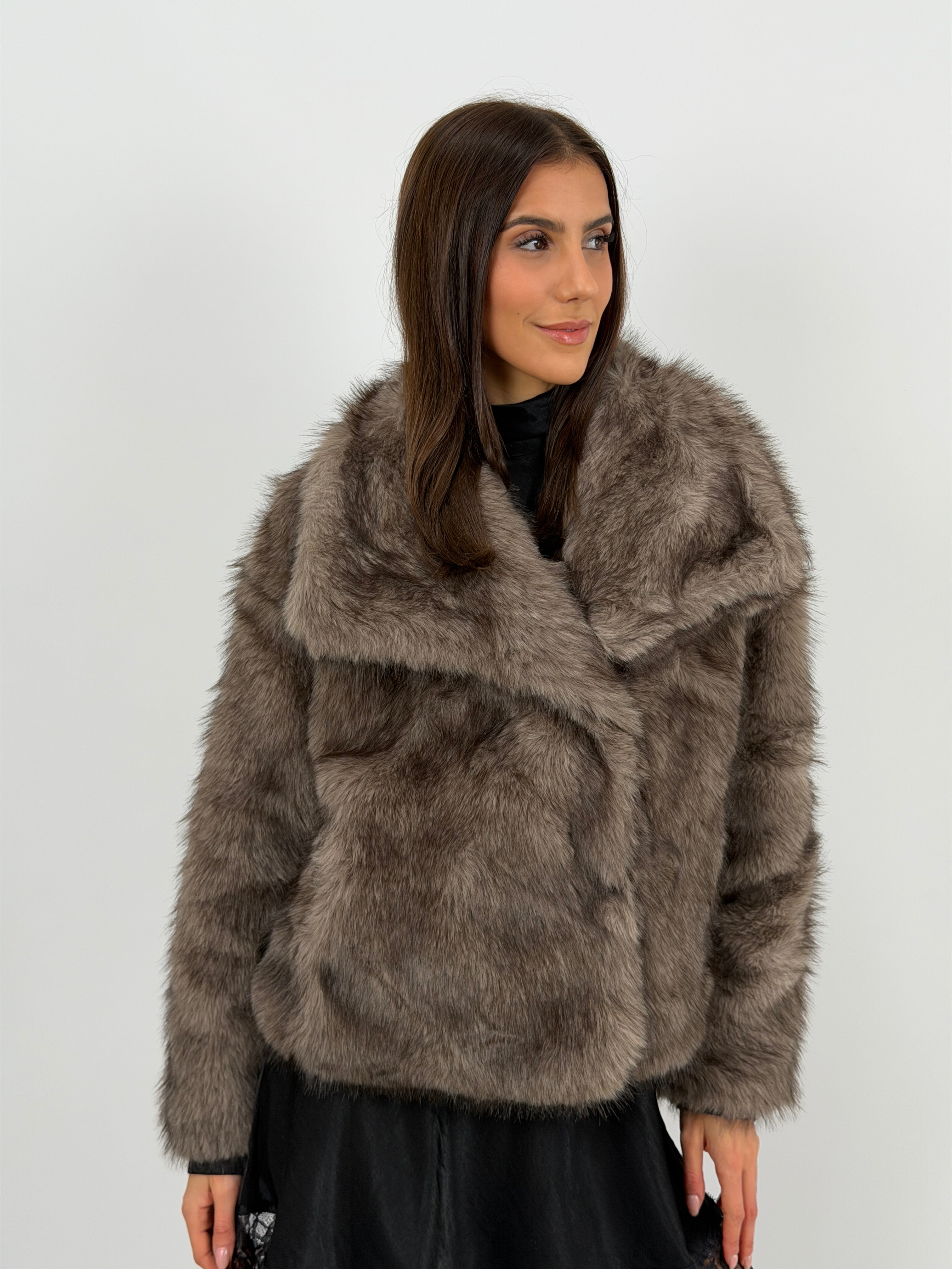 Eco pelliccia tortora morbida con collo ampio a revers, tasche laterali e fodera interna. Struttura avvolgente e tessuto soffice.