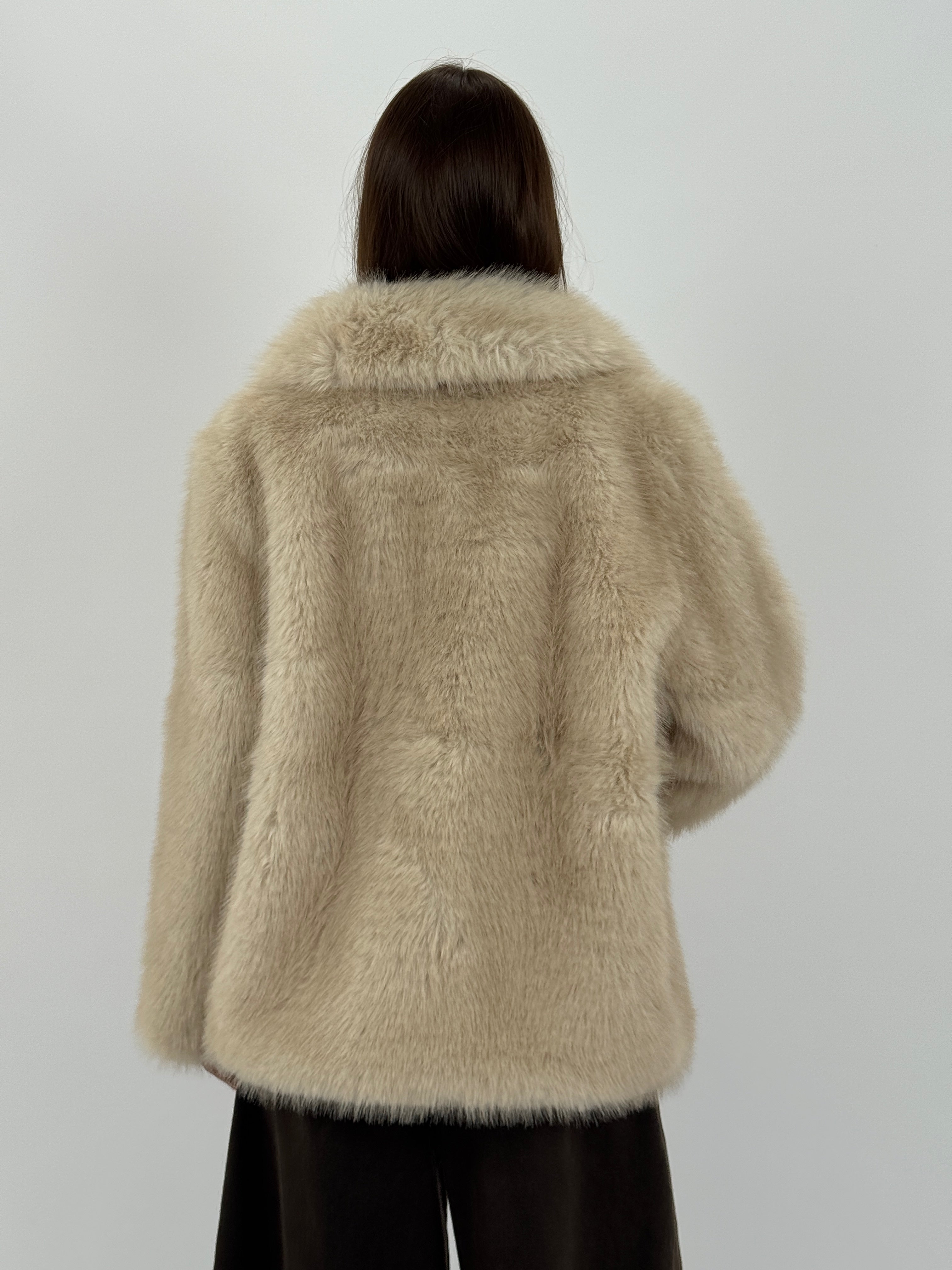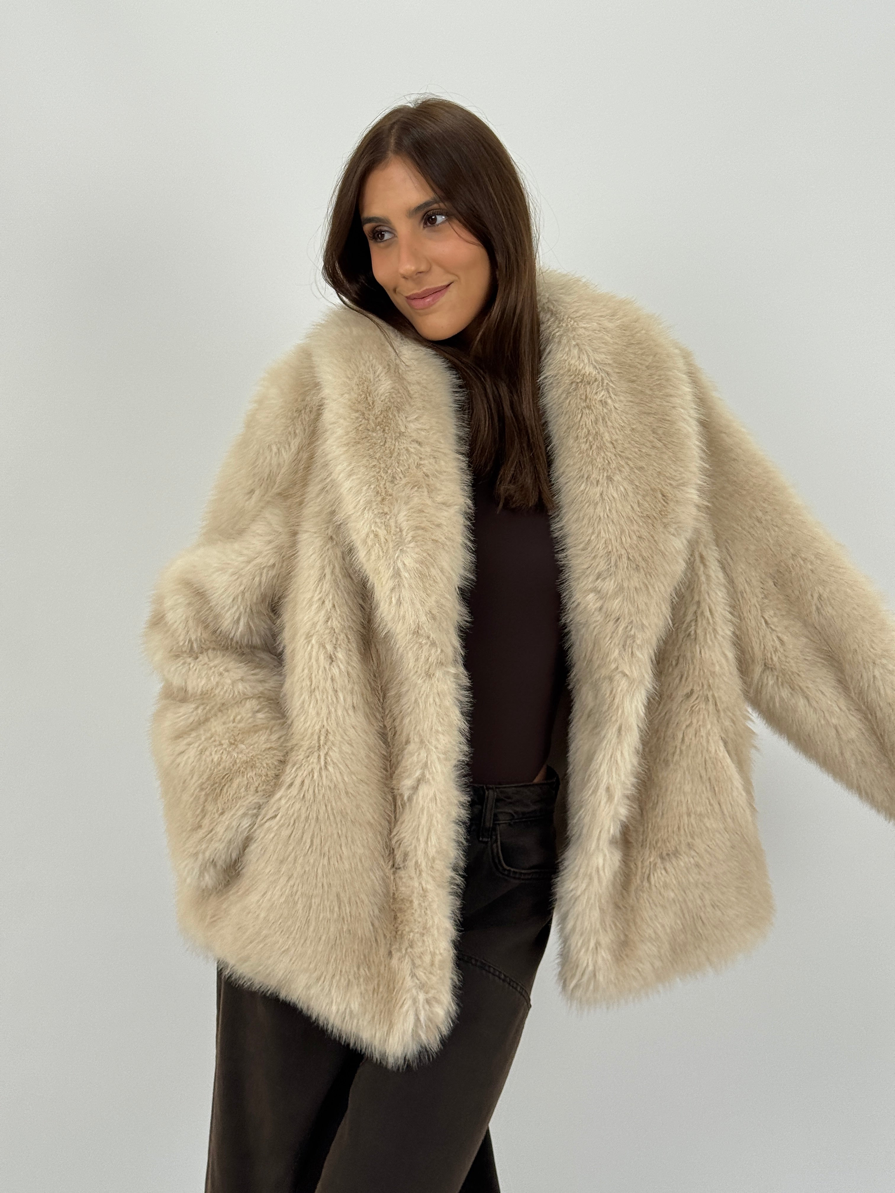 Eco pelliccia morbida color miele, con collo ampio. Tasche laterali e fodera interna.