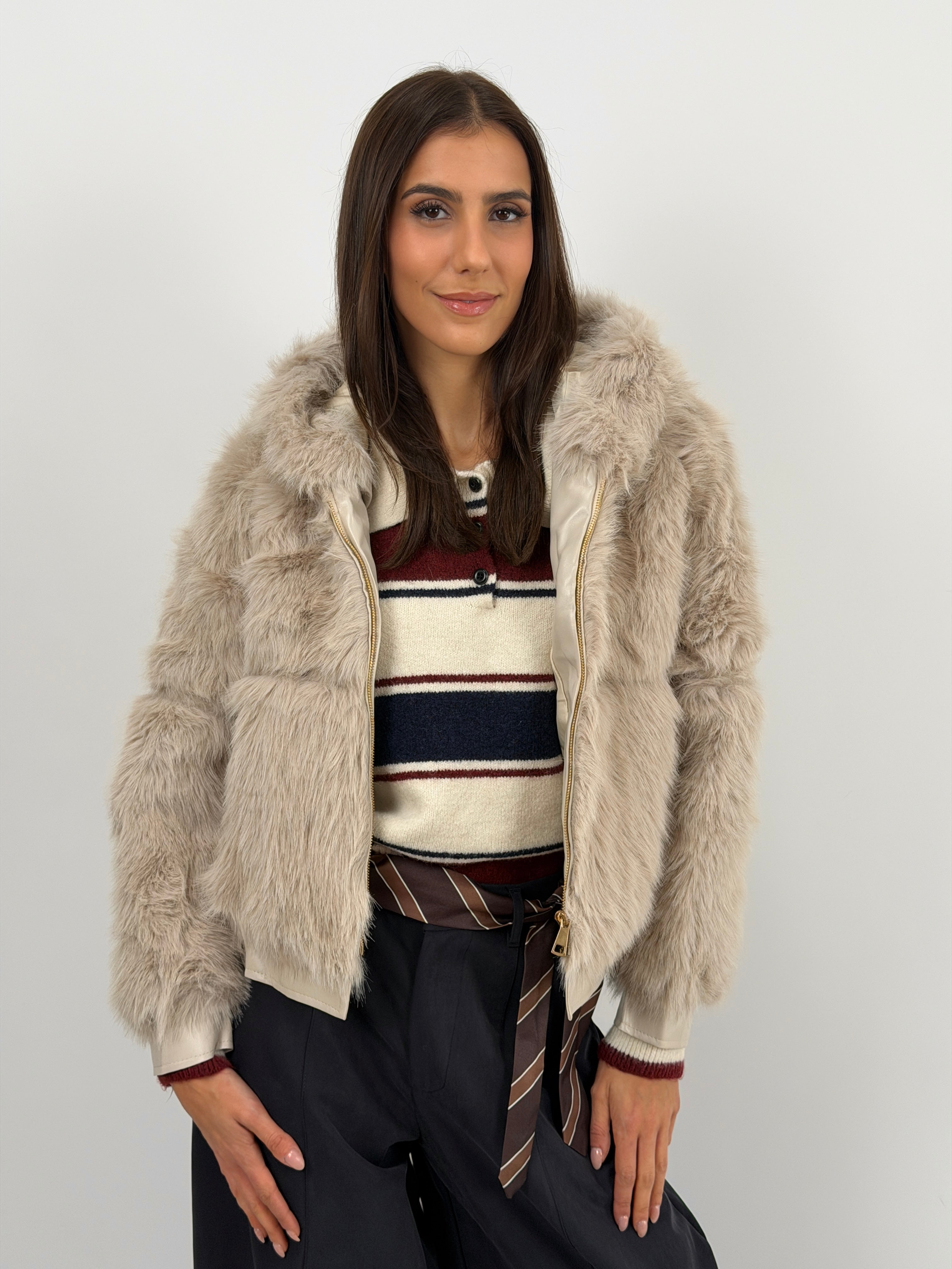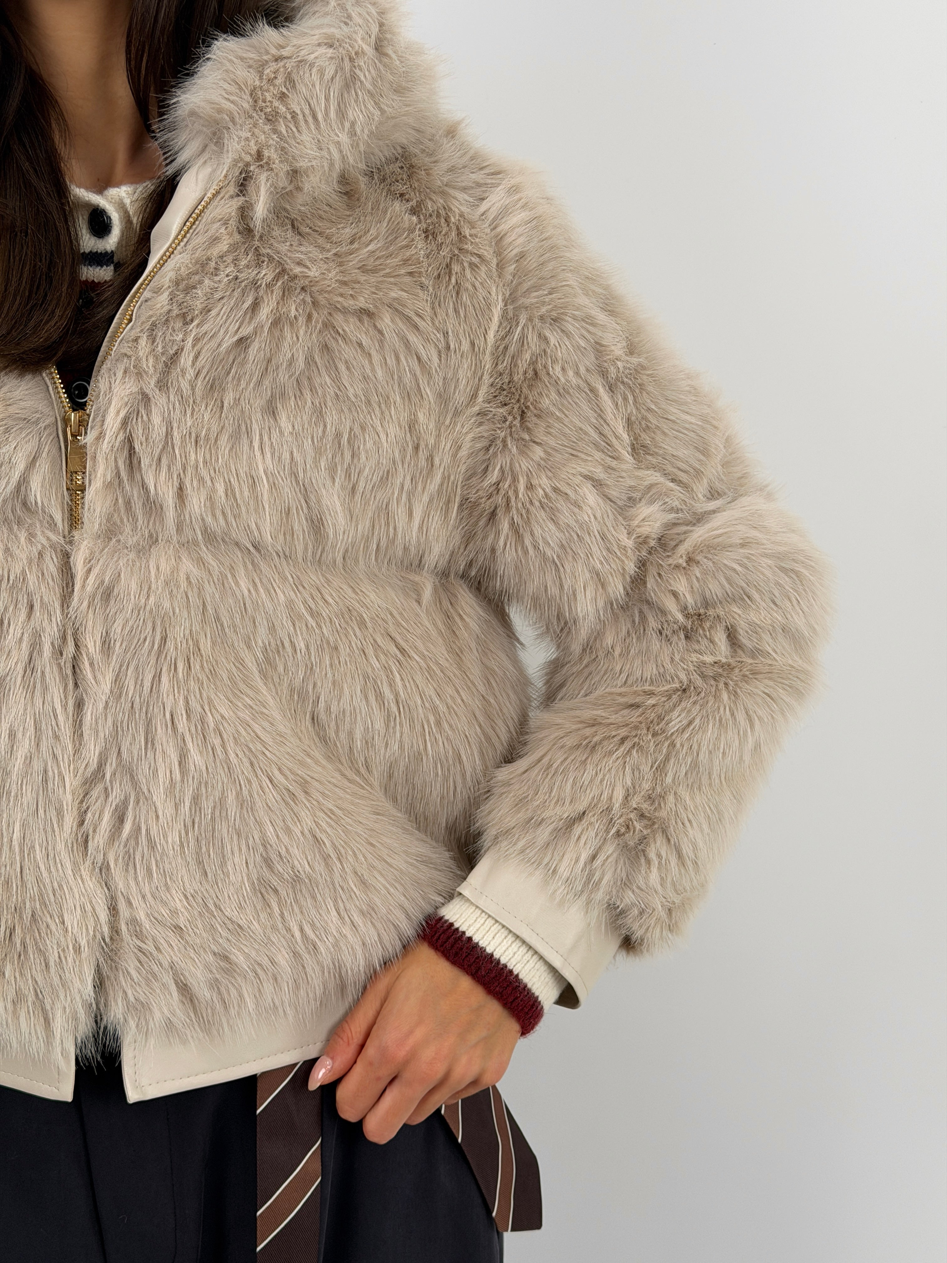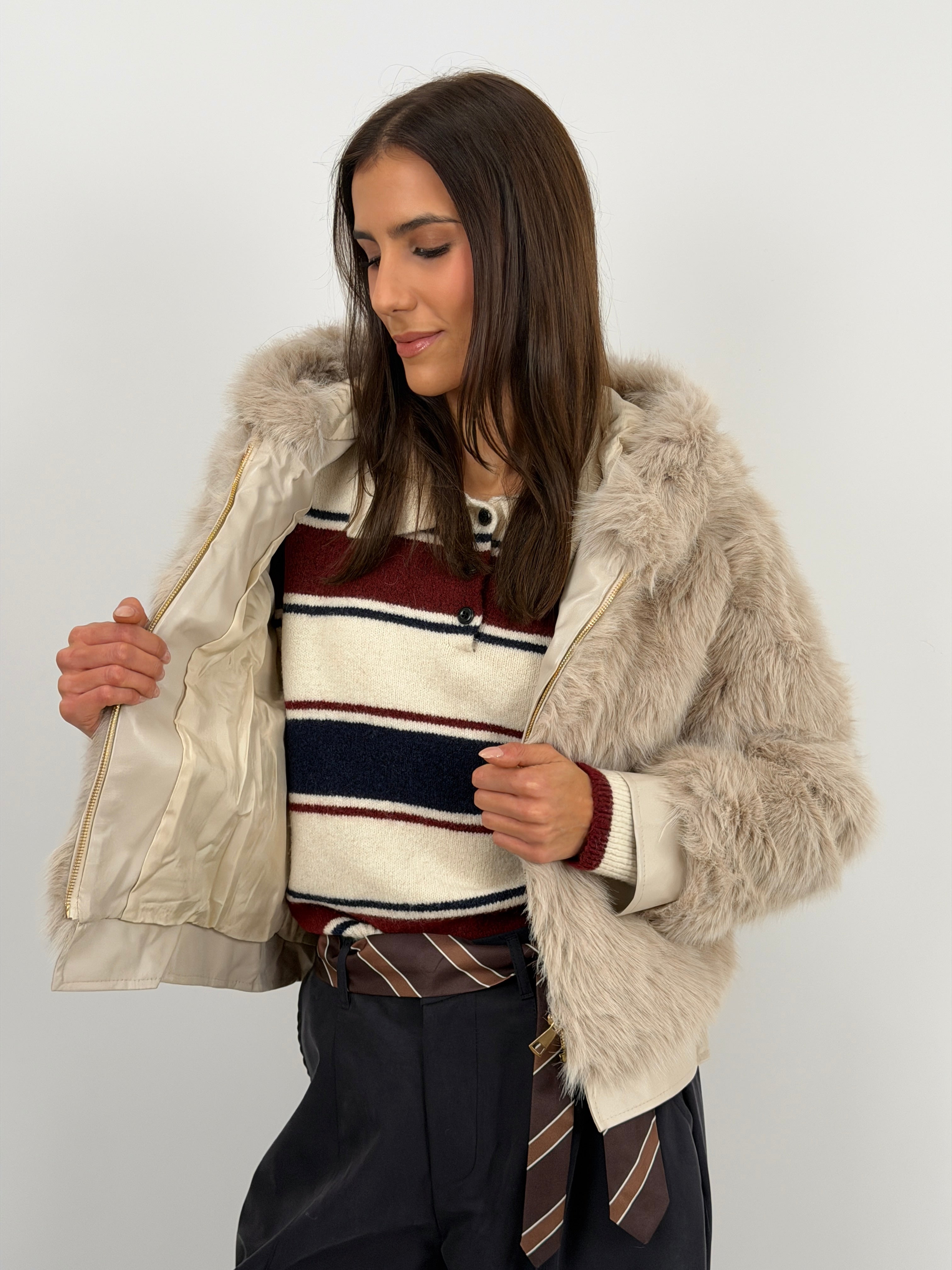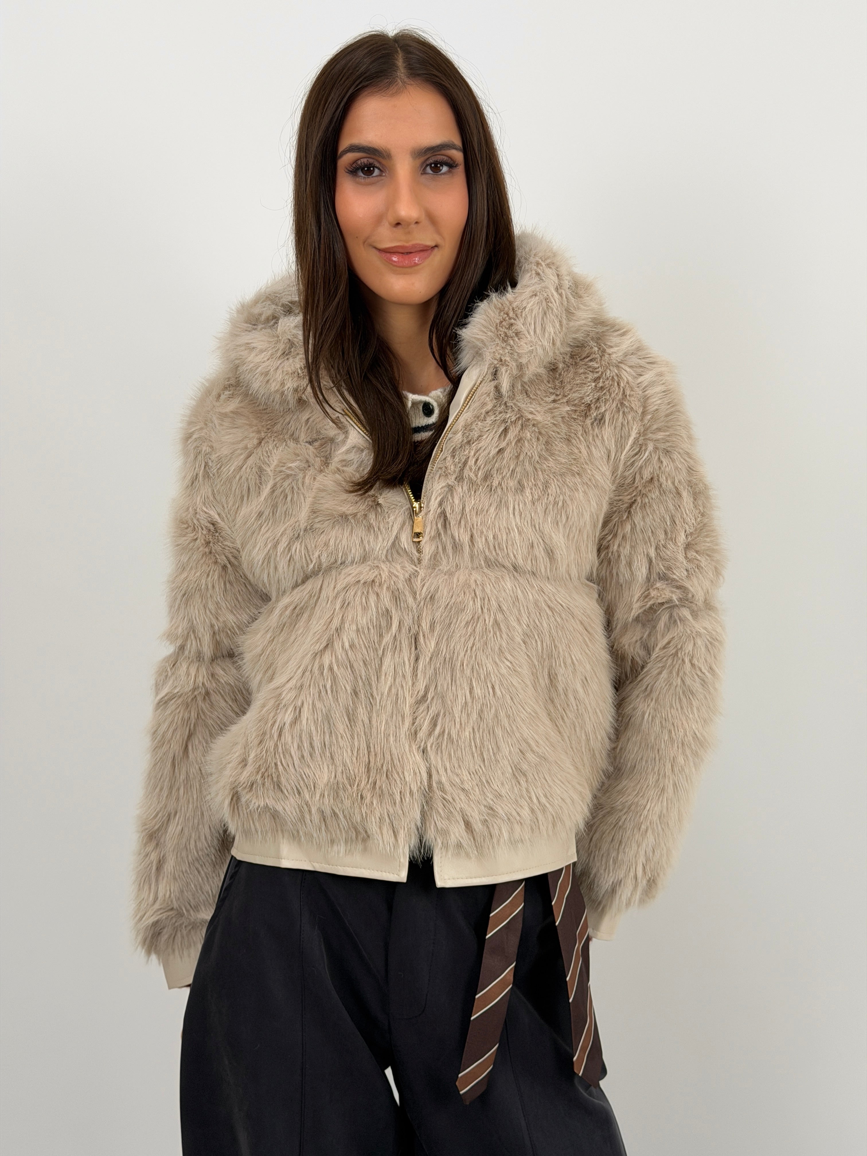 Eco pelliccia beige morbida con cappuccio e chiusura a zip, inserti in eco pelle, tasche laterali e fodera interna.