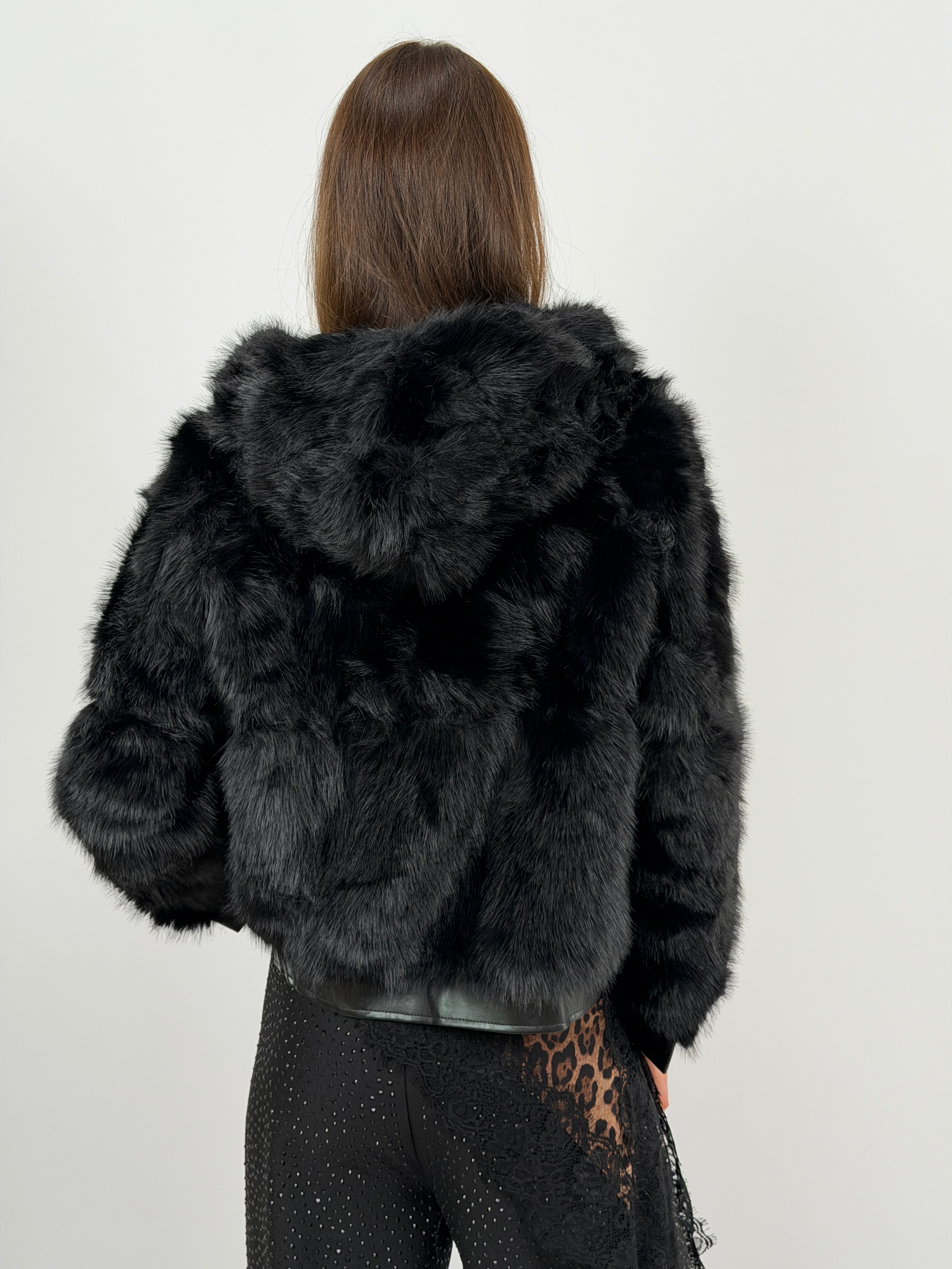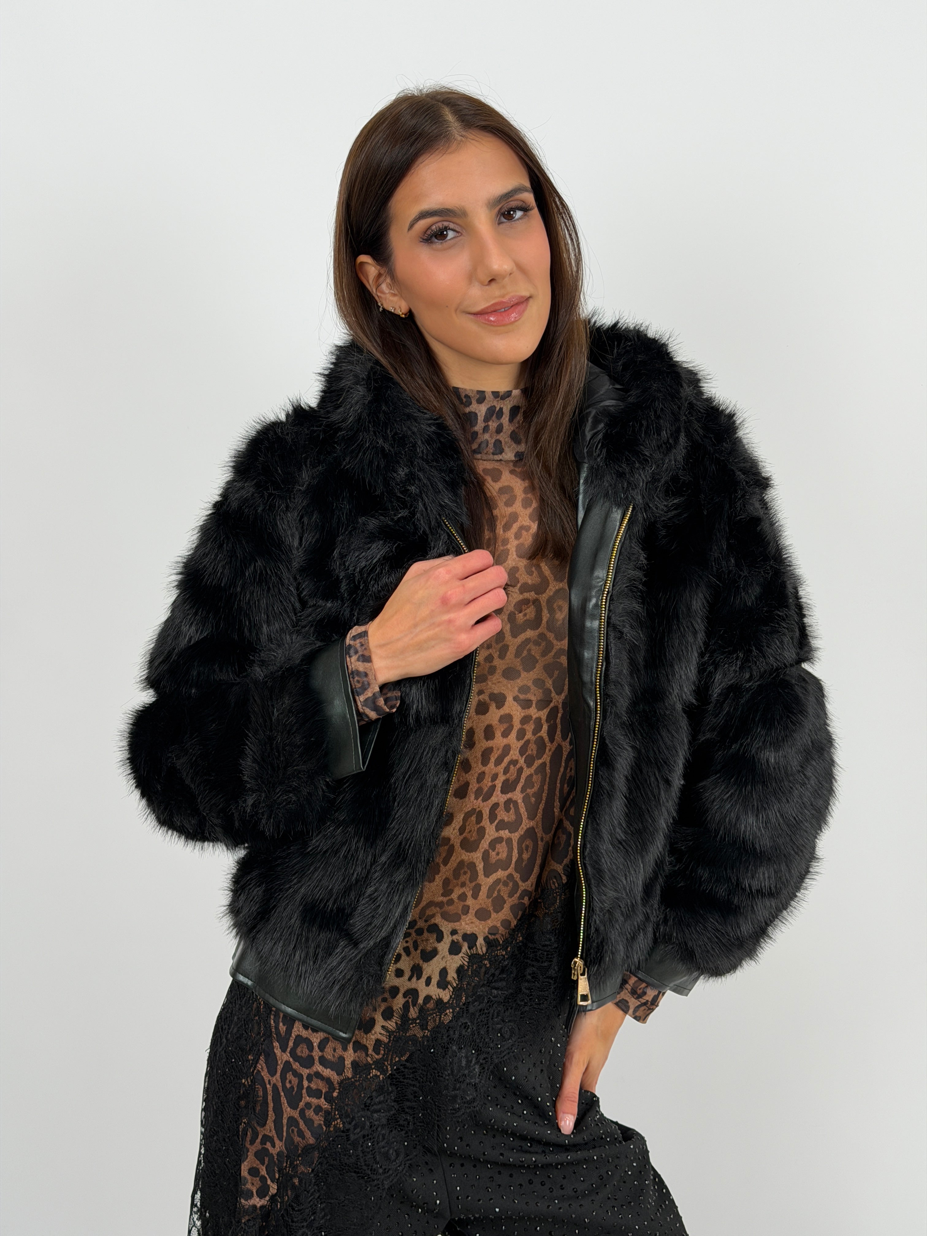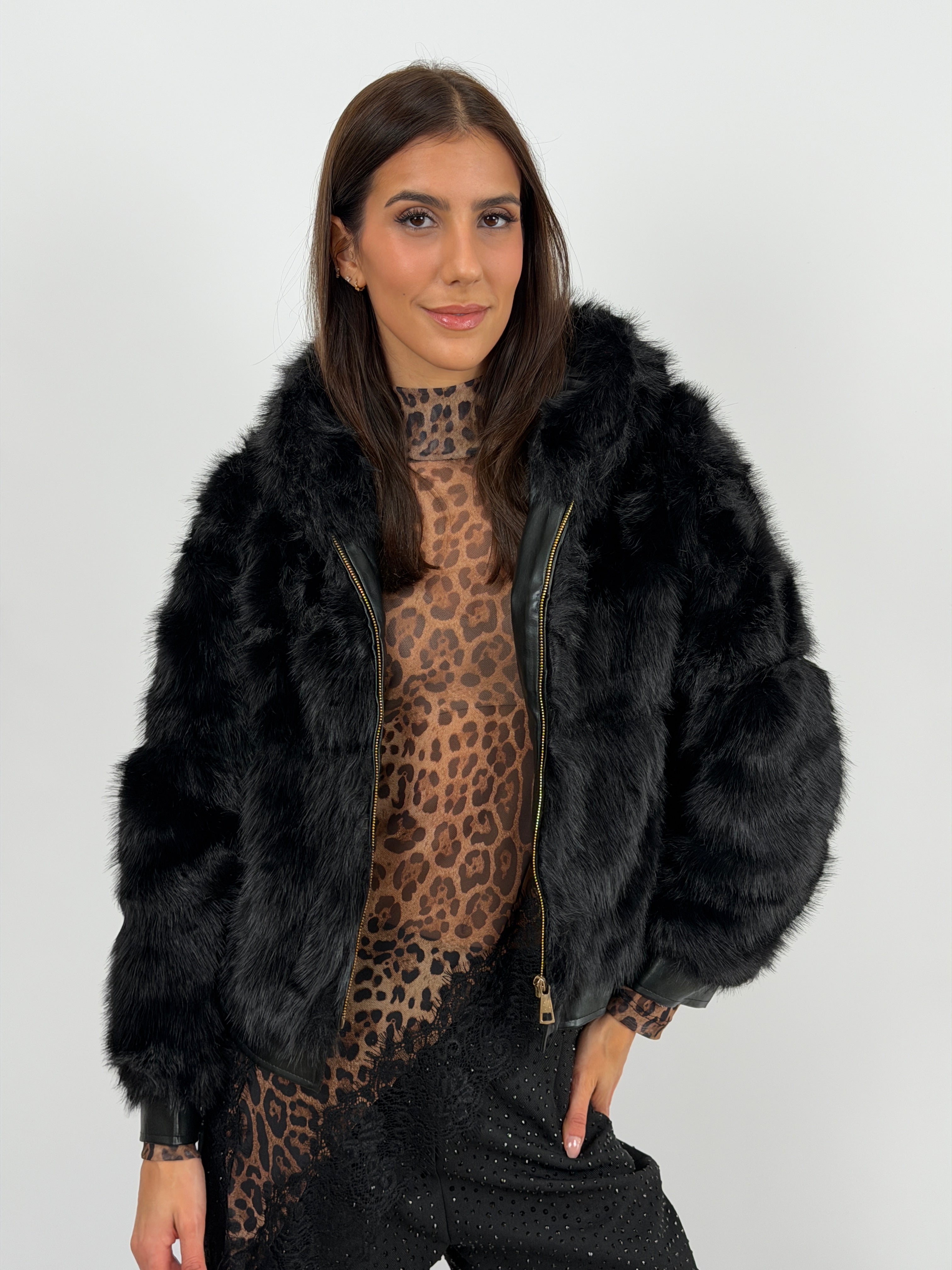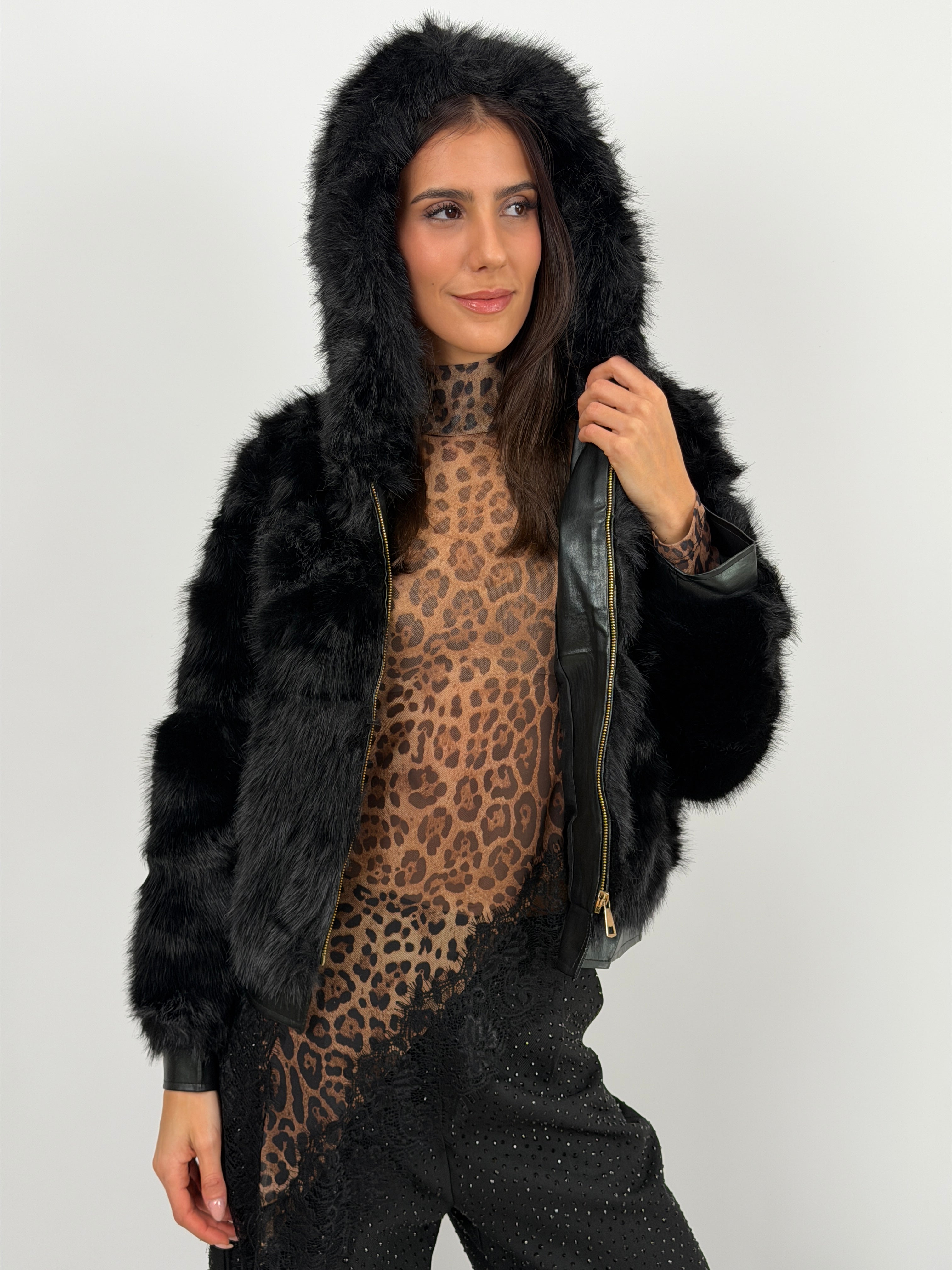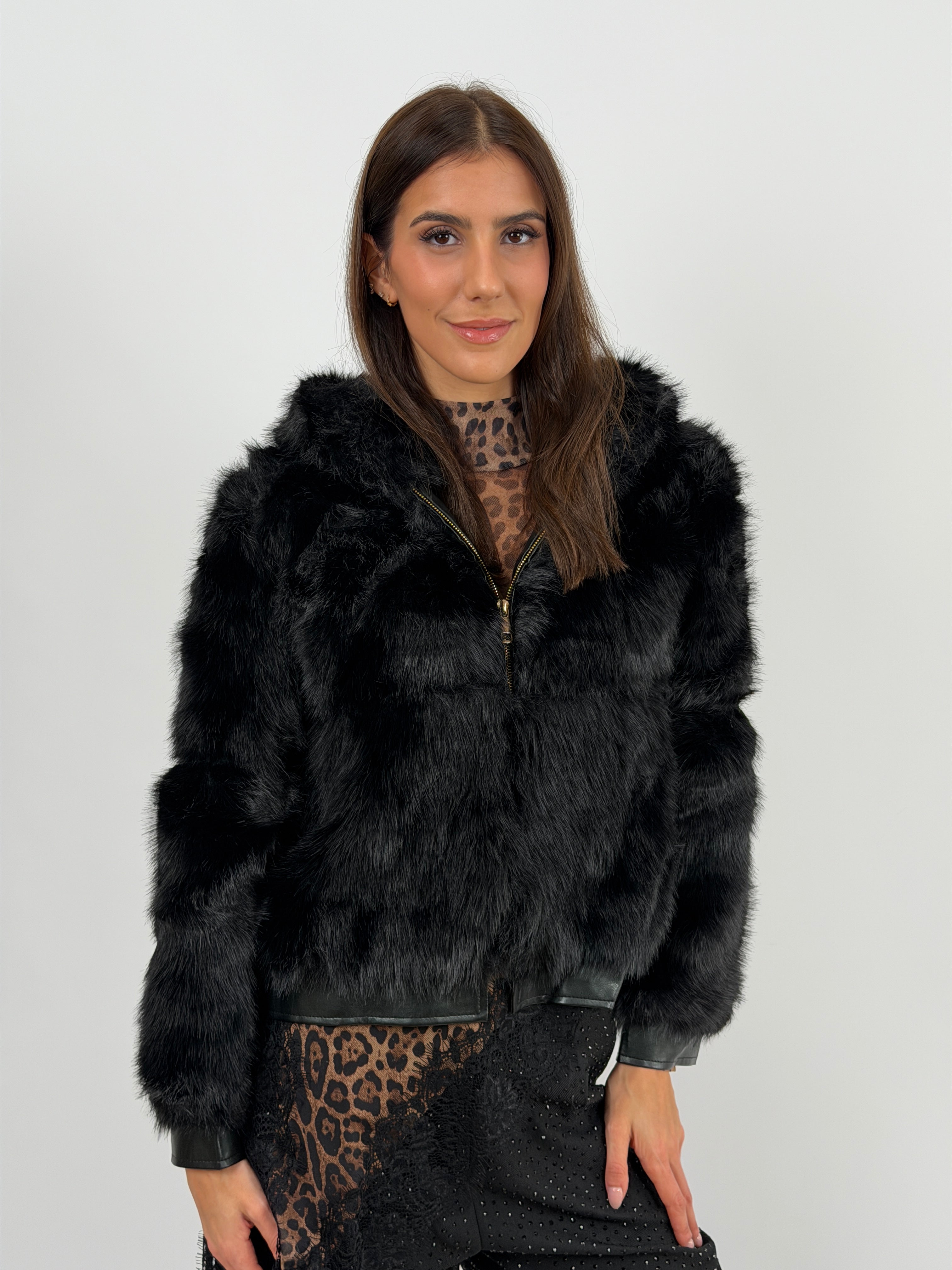 Eco pelliccia nera morbida con cappuccio e chiusura a zip, inserti in eco pelle, tasche laterali e fodera interna.