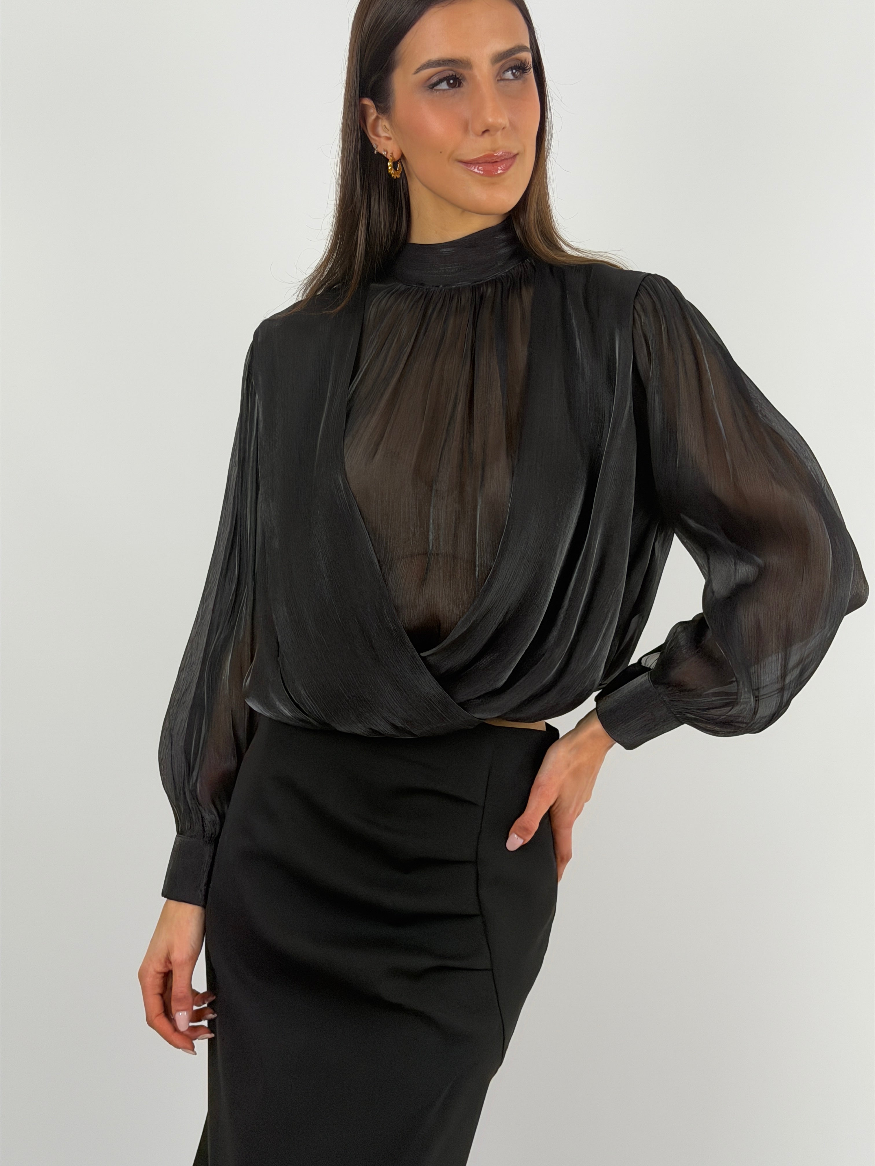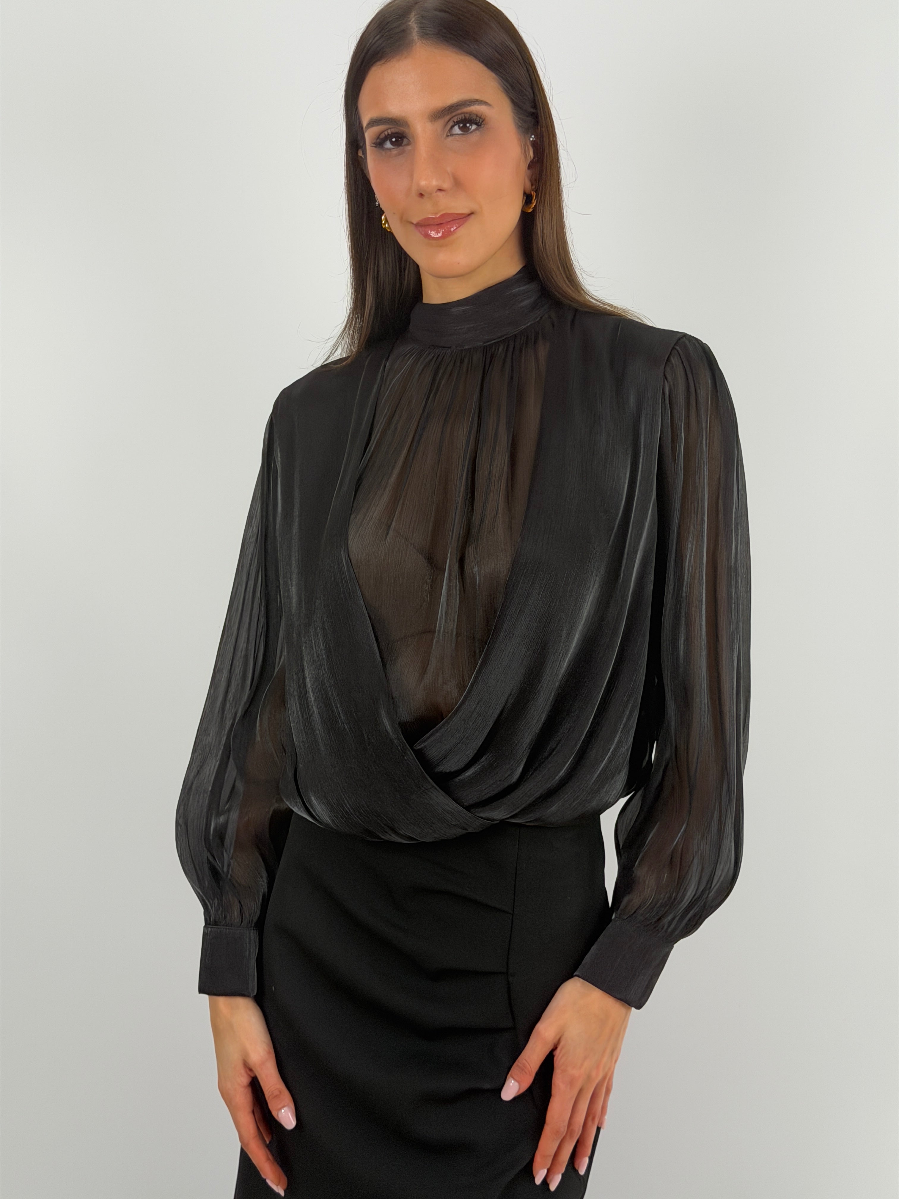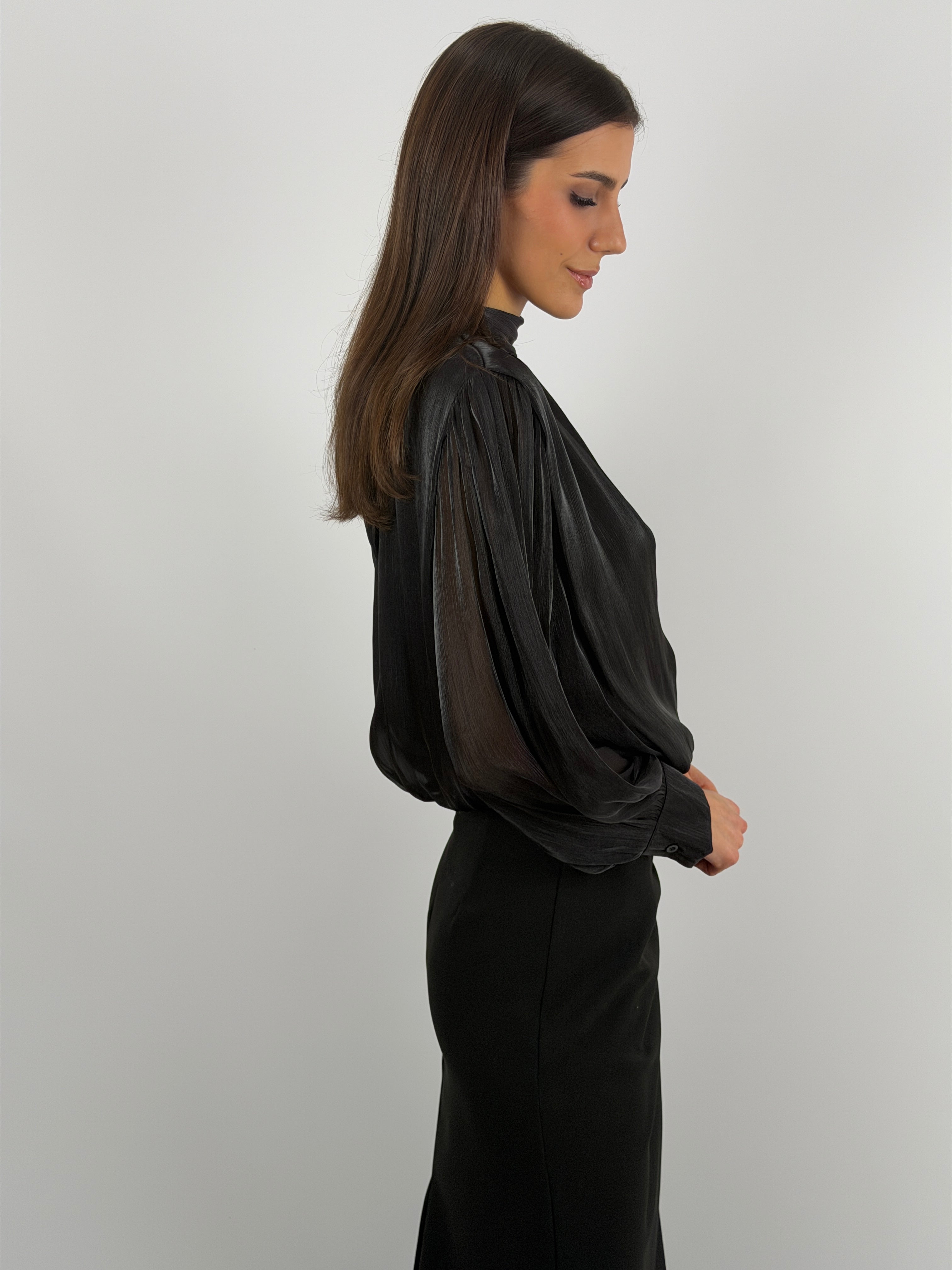 Camicetta nera in chiffon con tessuto brillante, arricciature sul fondo, collo alto con fiocco sul retro e polsini con bottoni