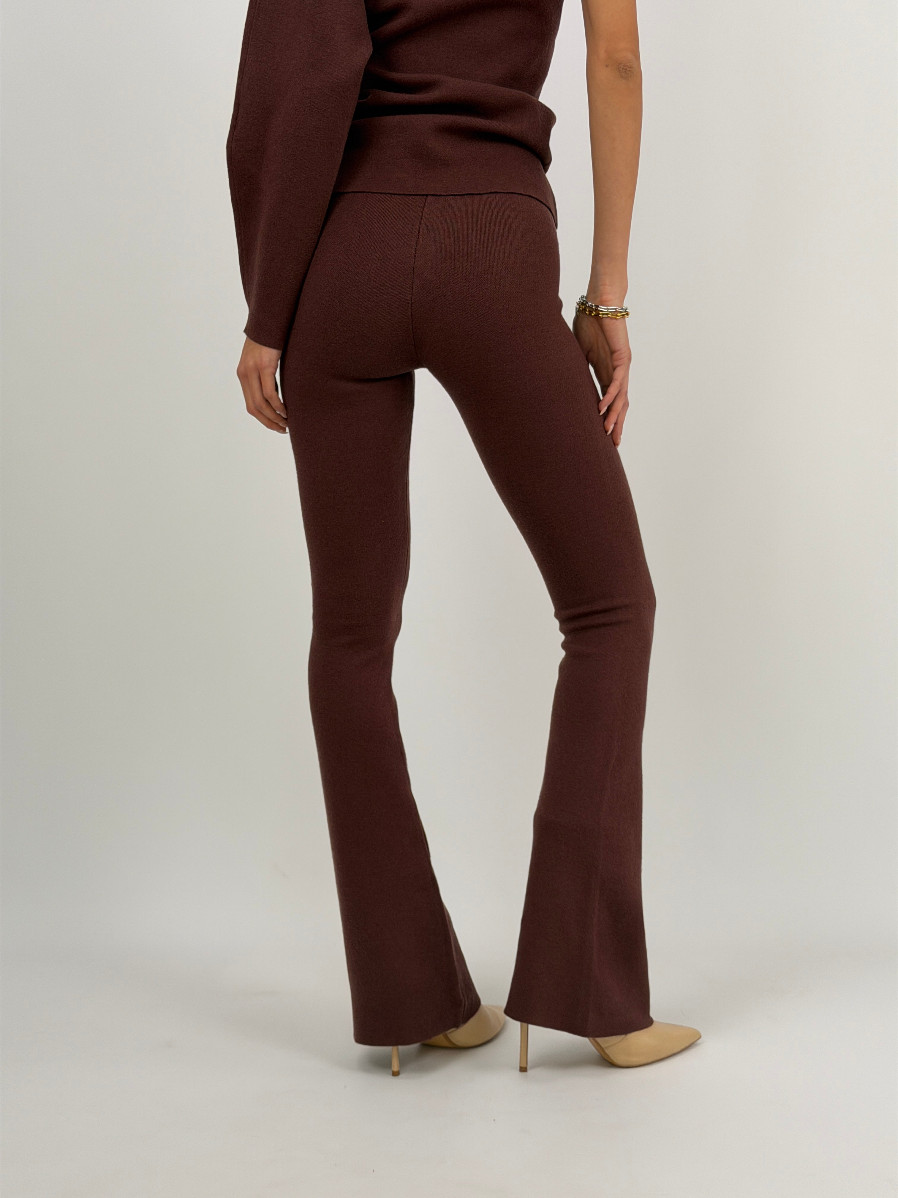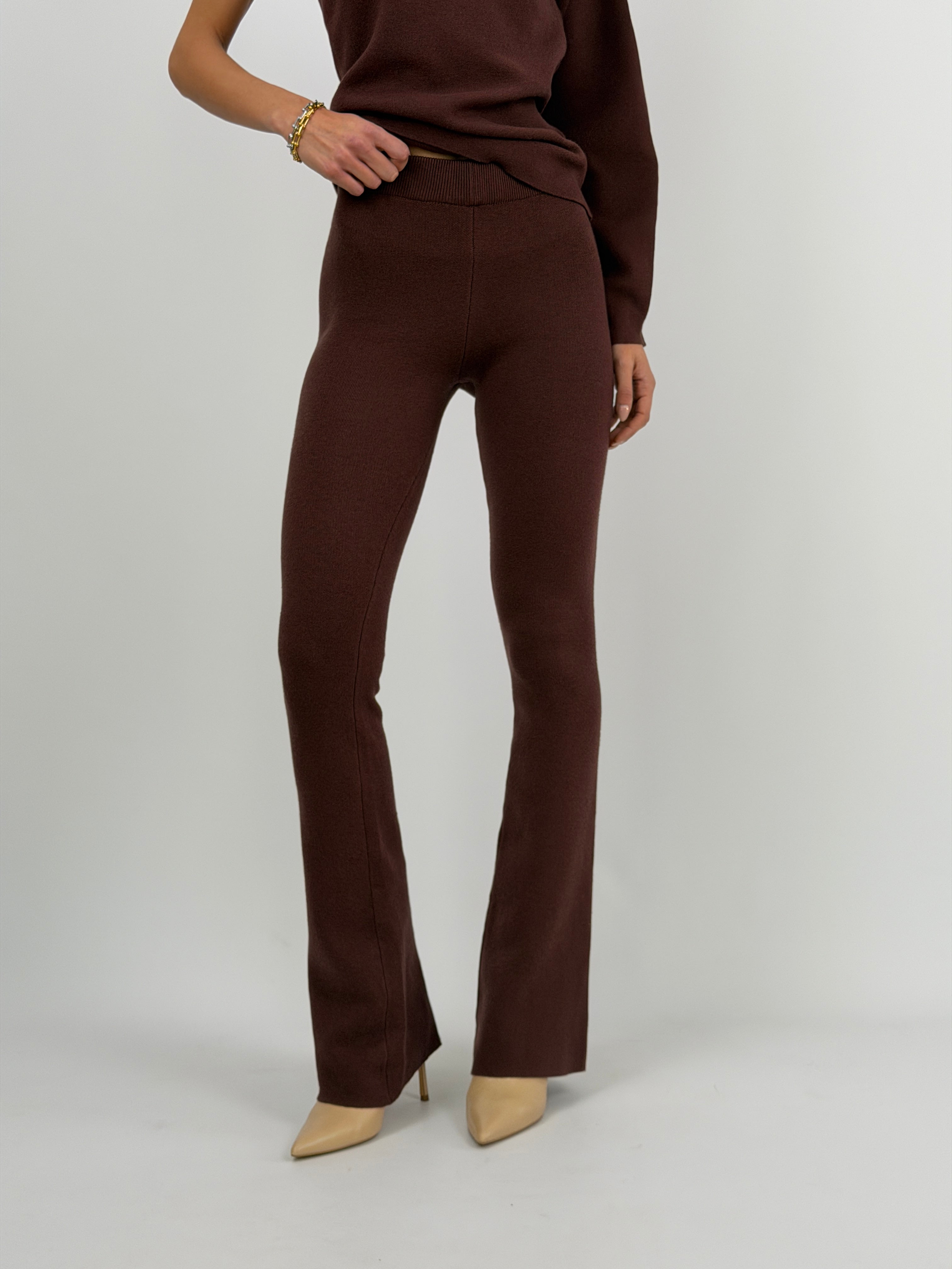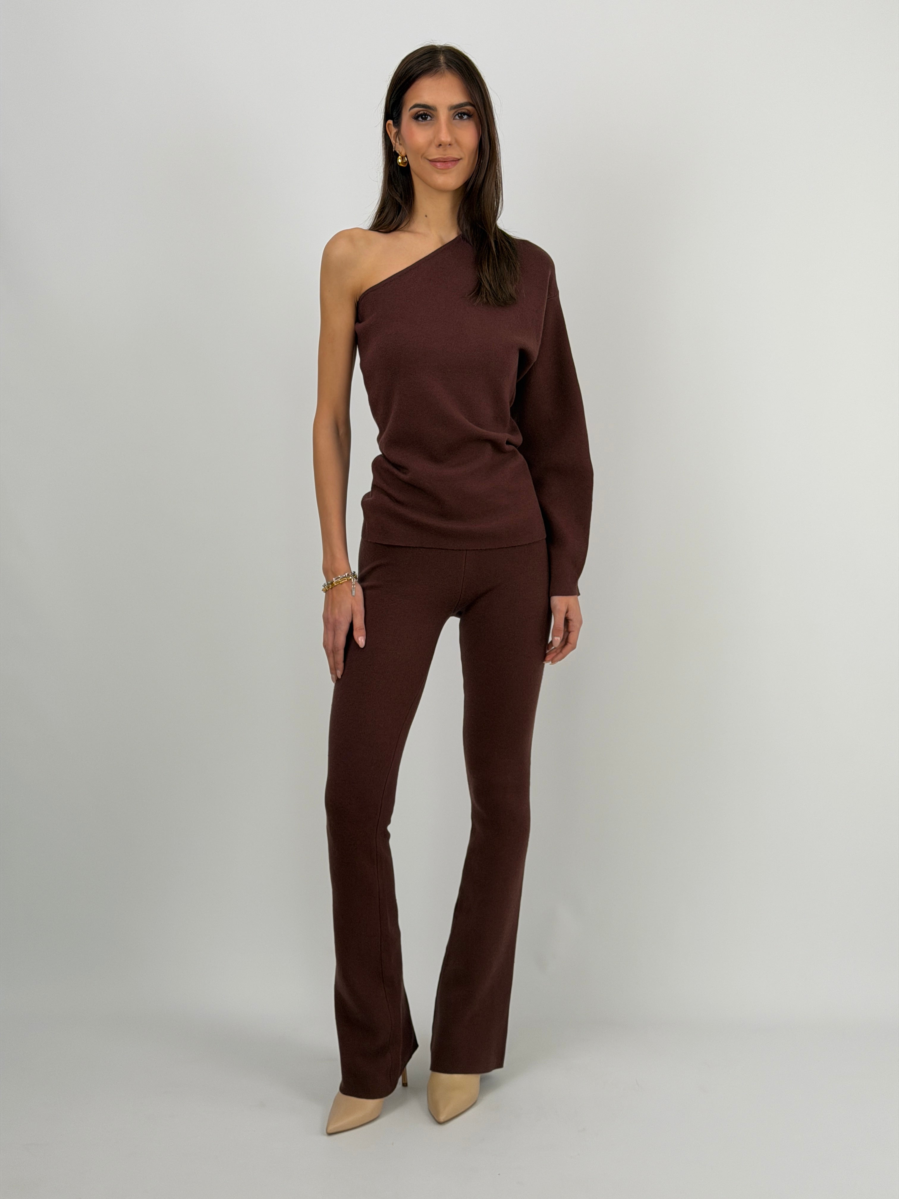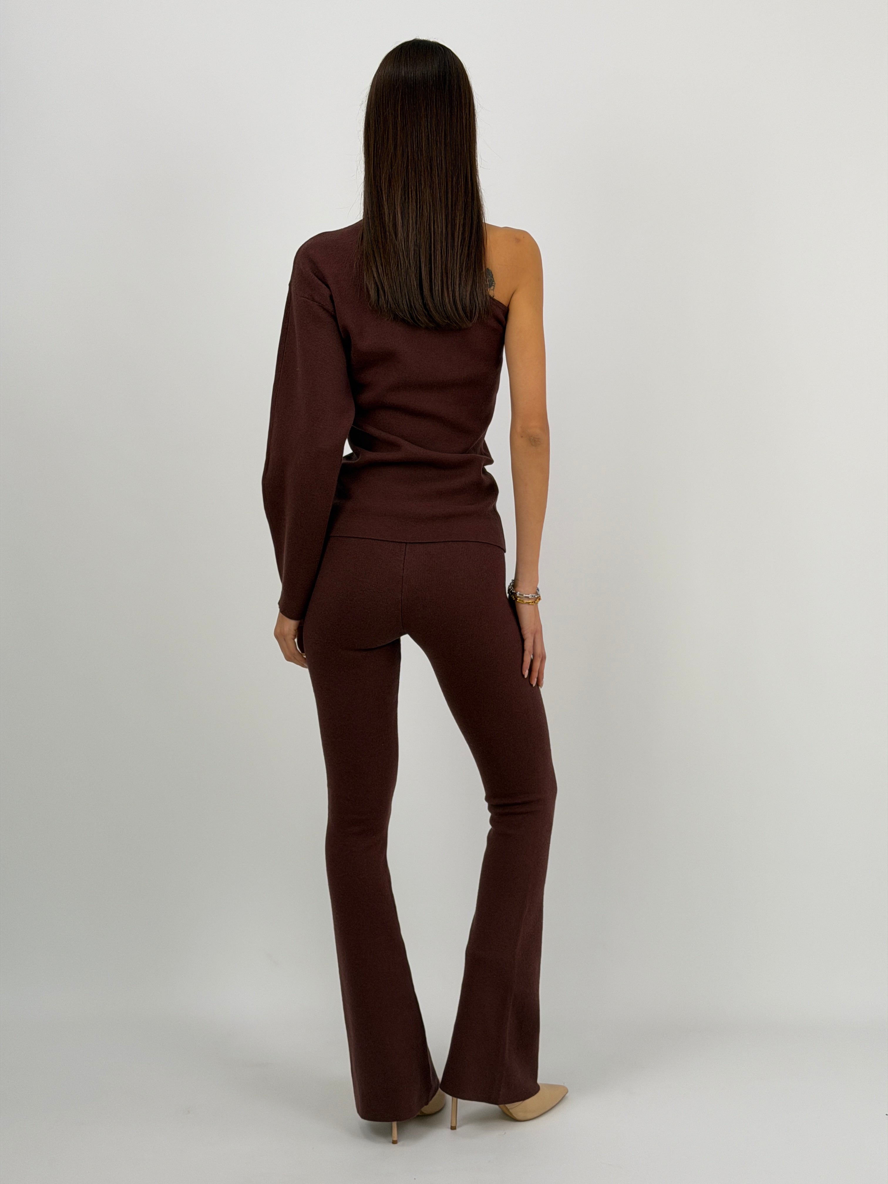 Set coordinato marrone in maglia con top monospalla e pantalone aderente bootcut con elastico in vita.