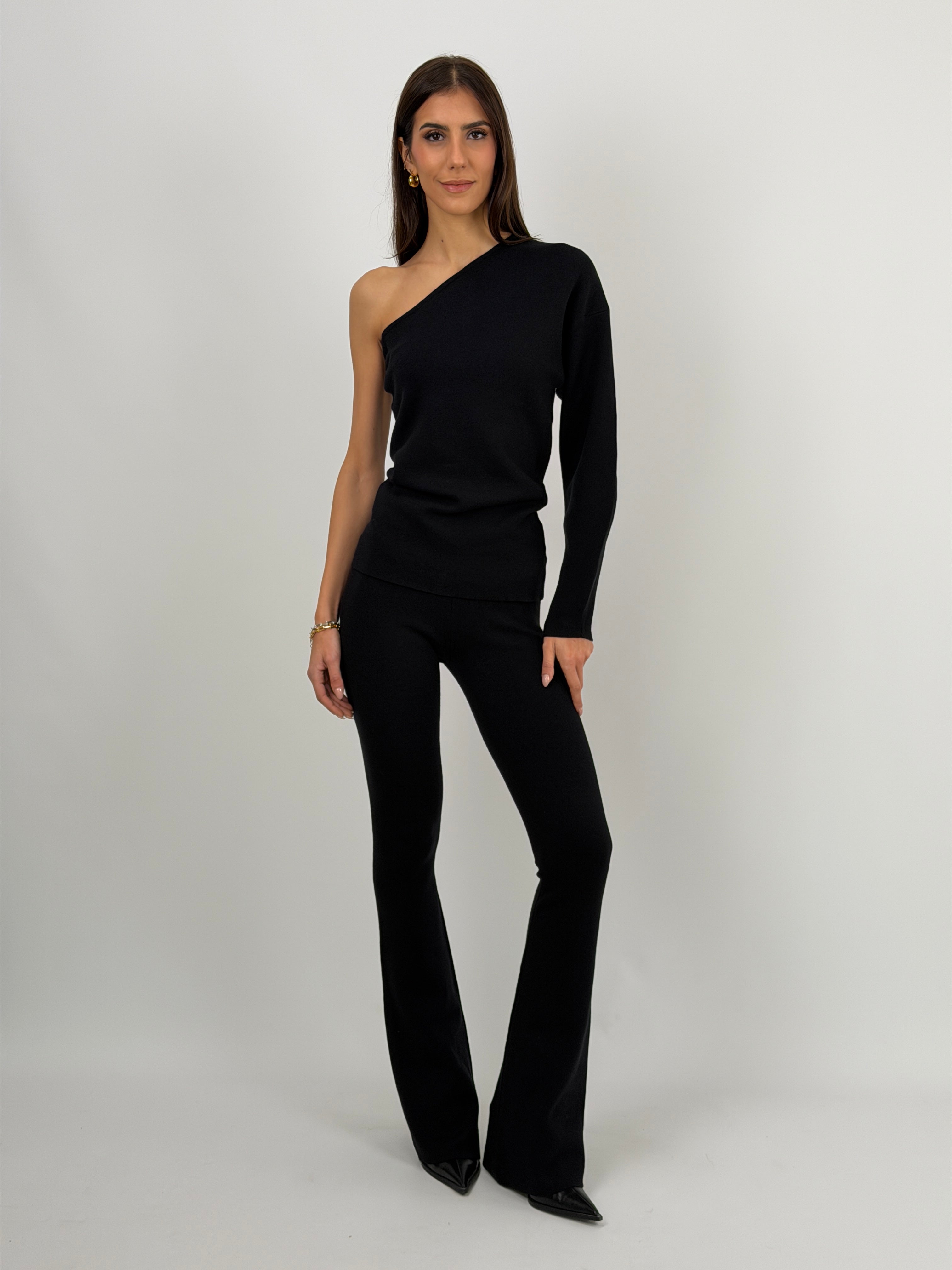 Set coordinato nero in maglia con top monospalla e pantalone aderente bootcut con elastico in vita.