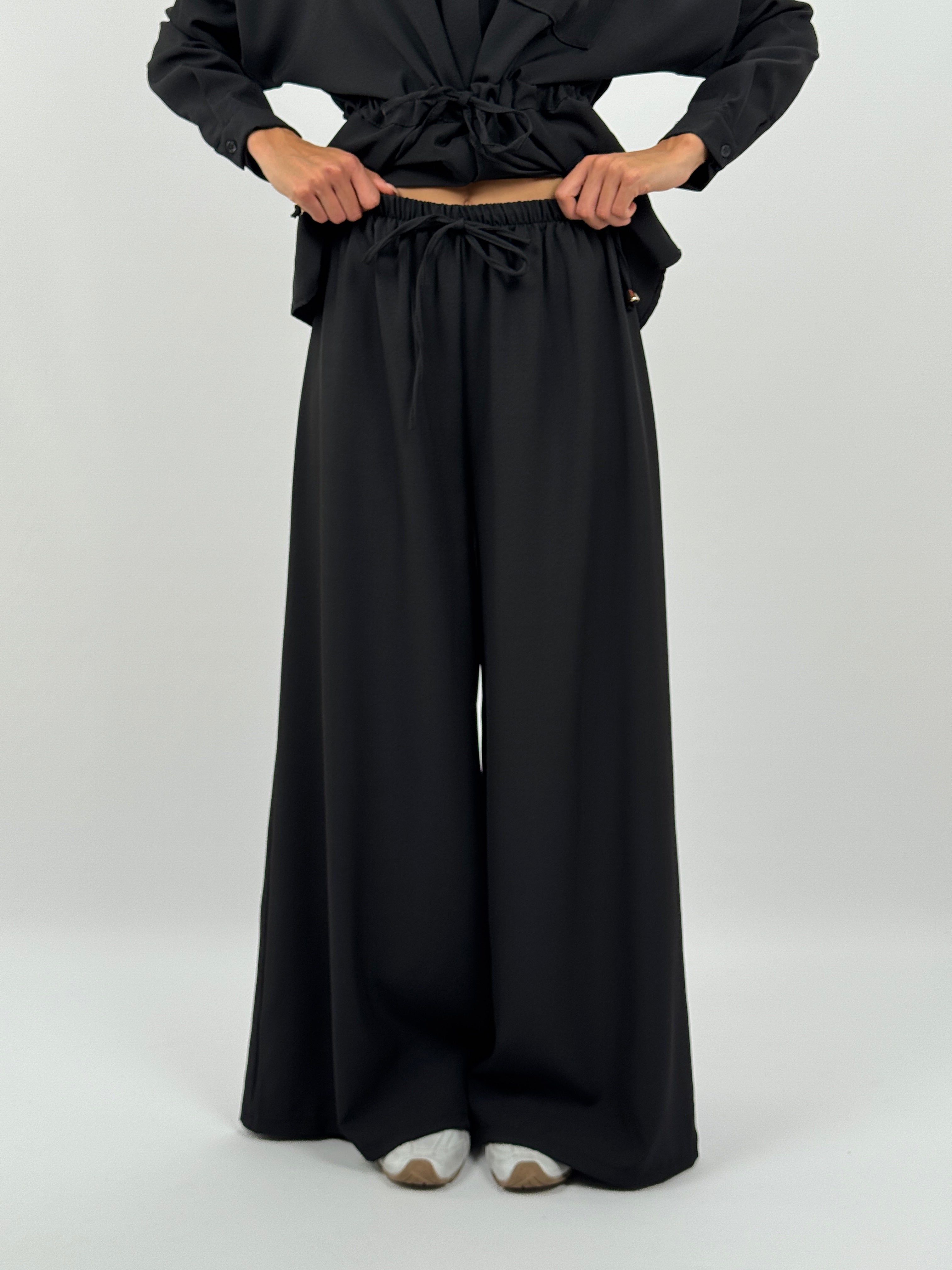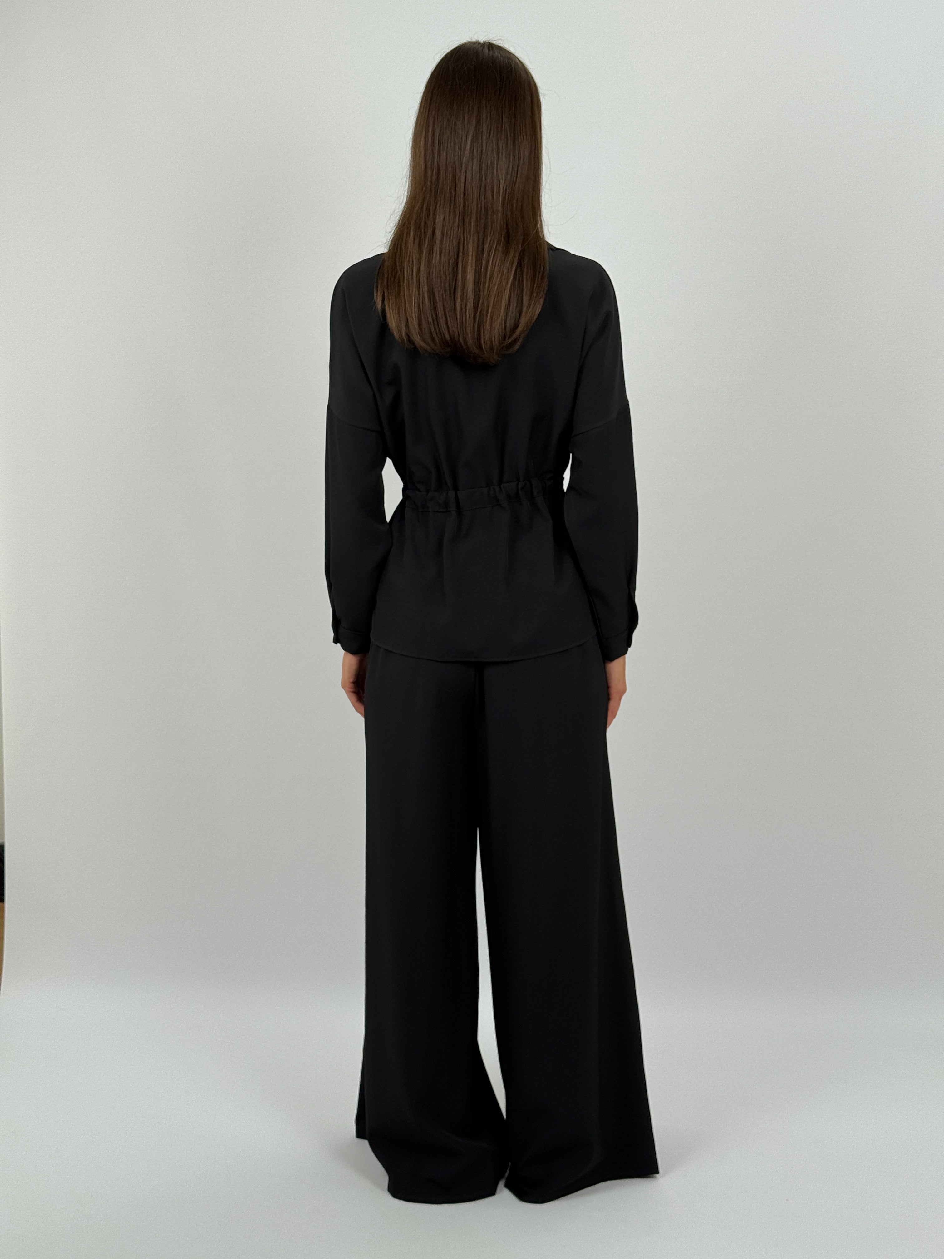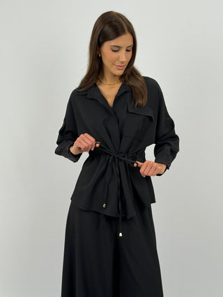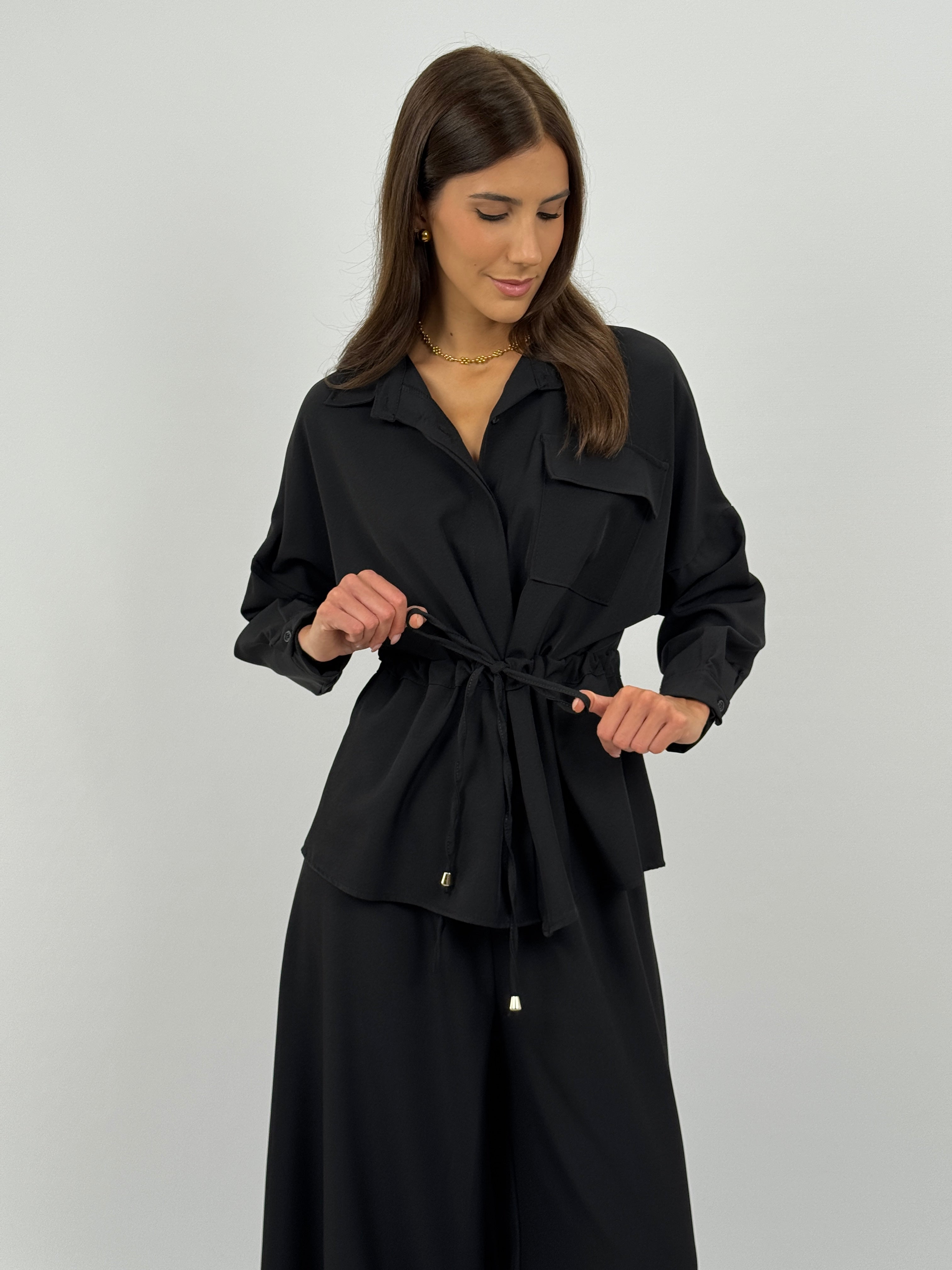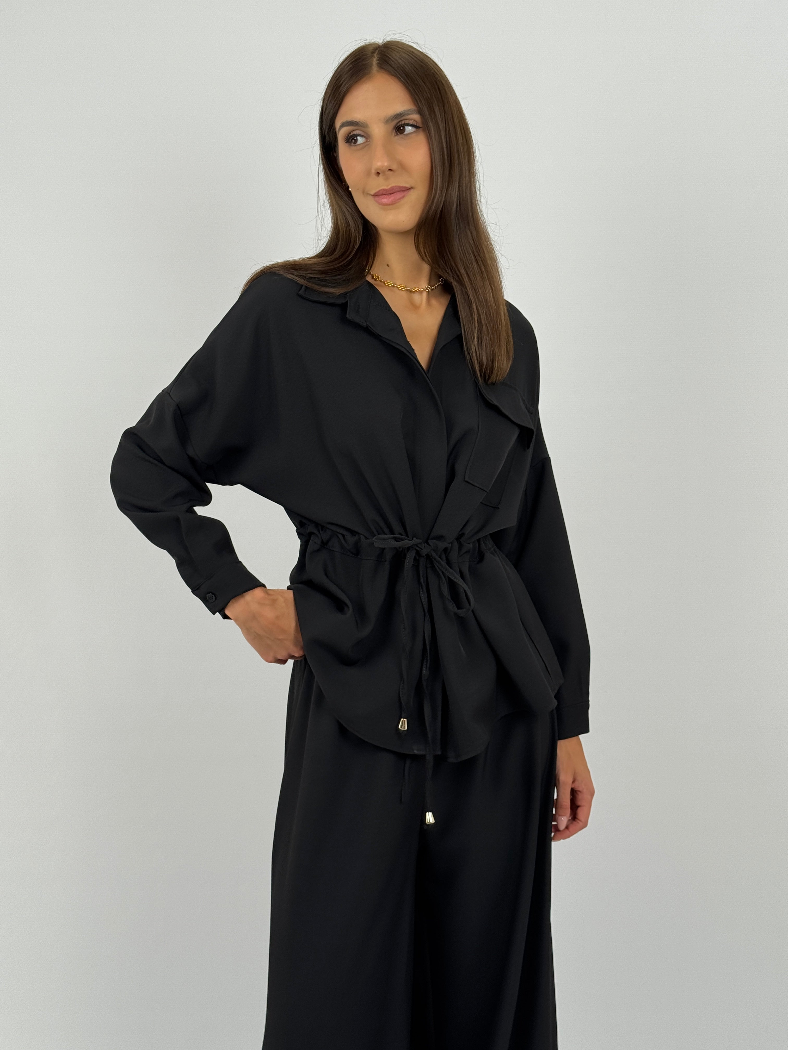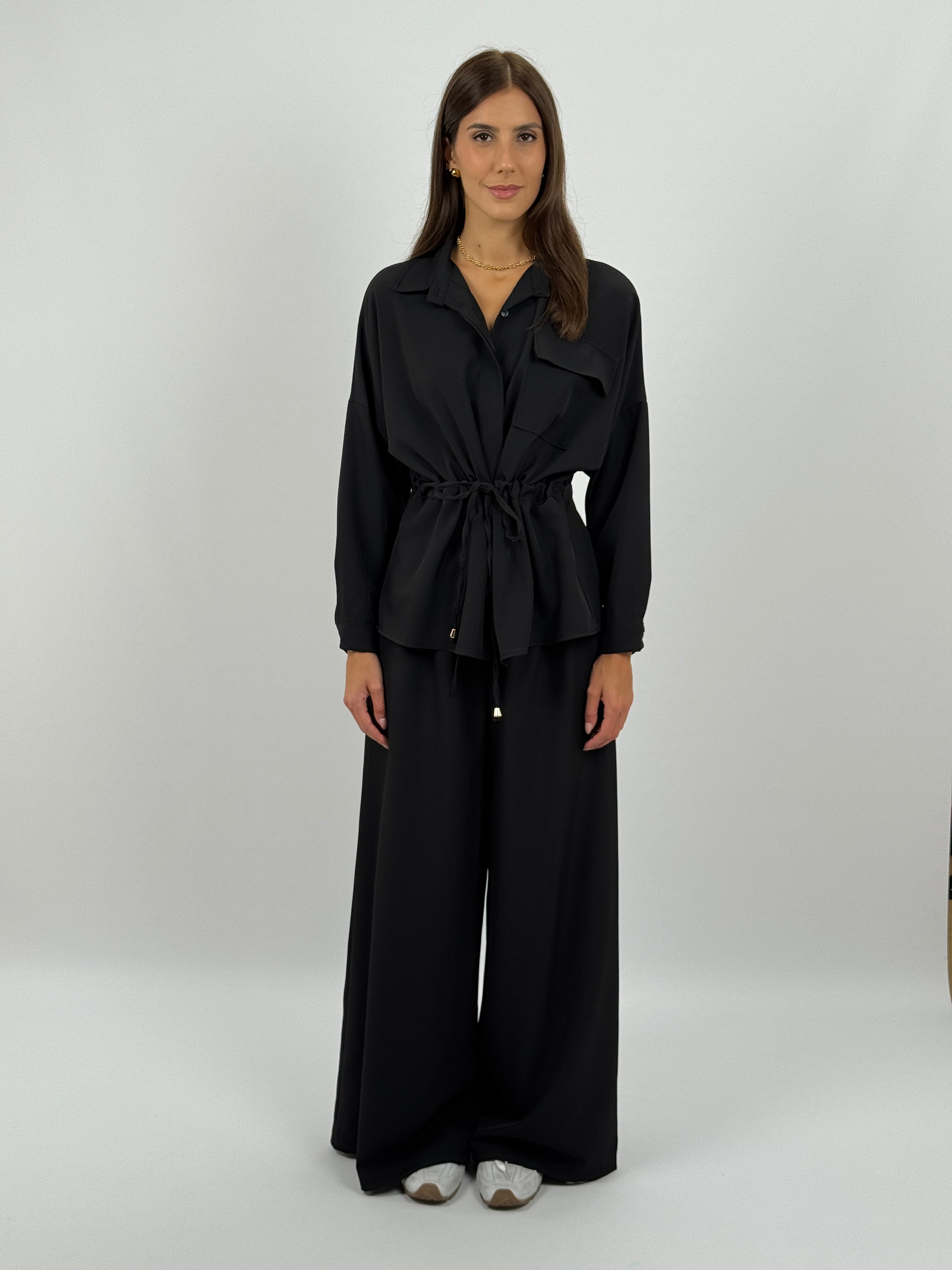 Set coordinato nero con camicia dotata di coulisse in vita, tasca frontale e bottoni, abbinata a pantalone lungo a palazzo con elastico e laccio regolabile in vita.