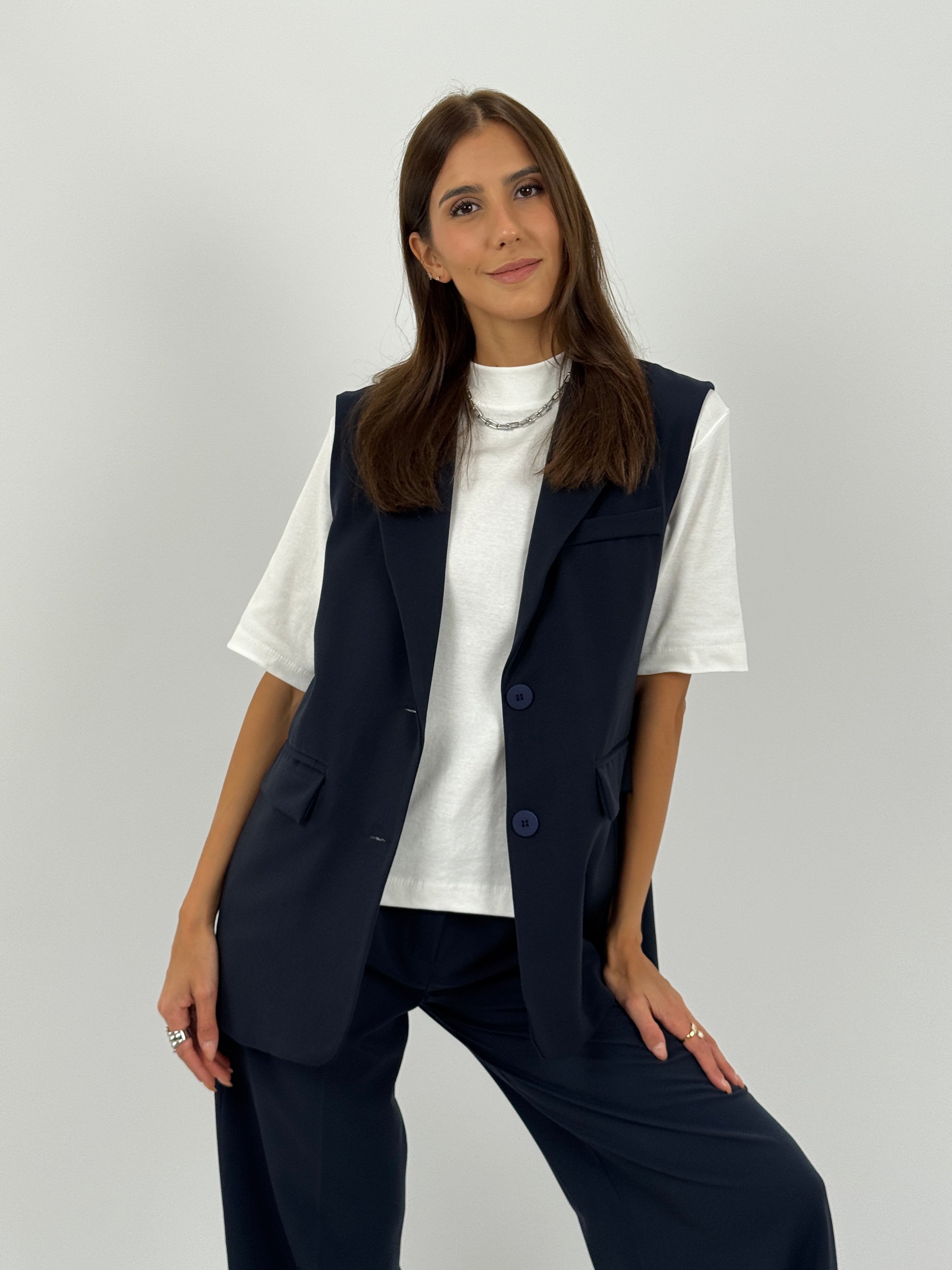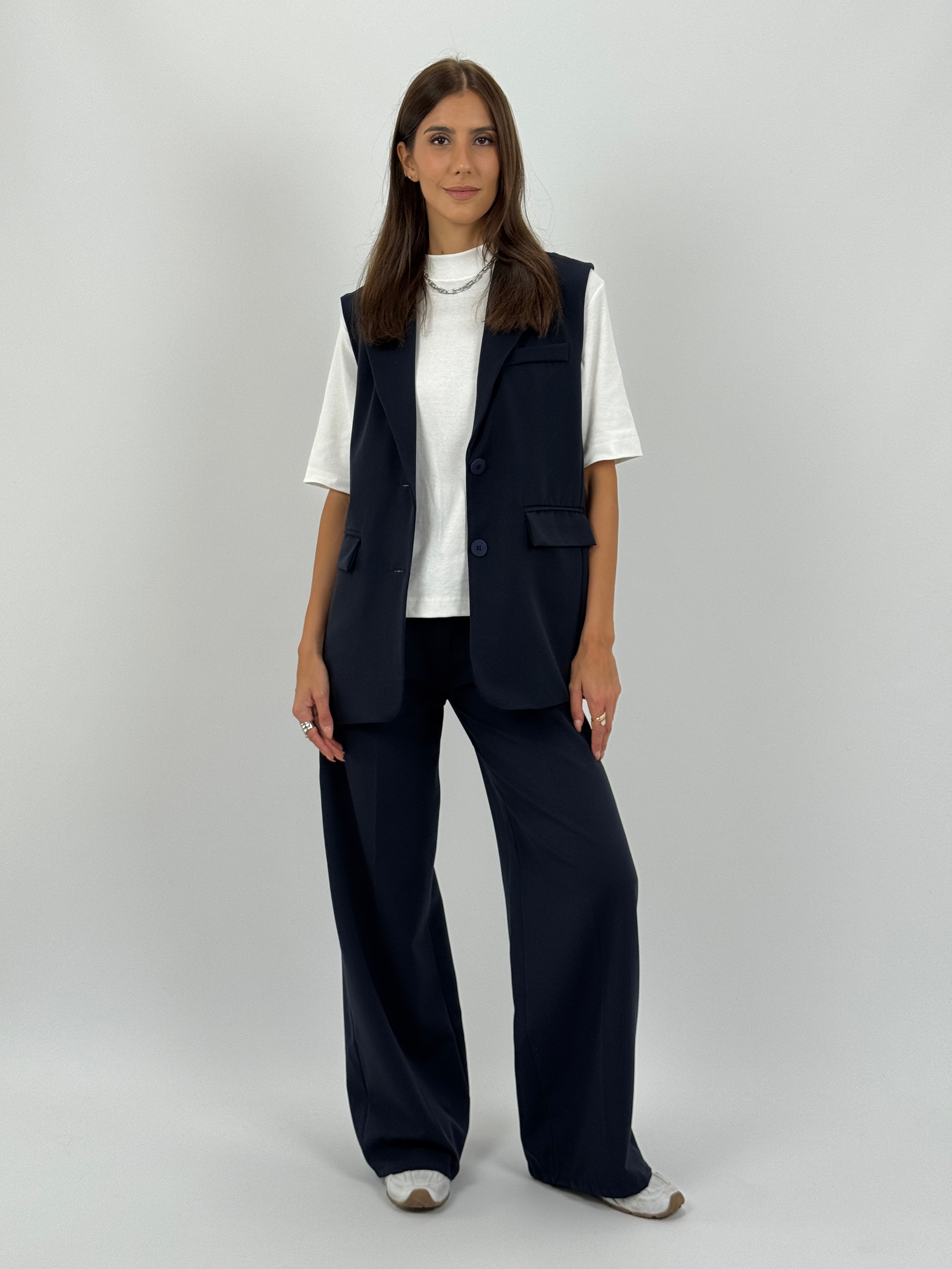 Set coordinato blu con maxi gilet smanicato lungo a revers e fodera interna, abbinato a pantalone wide leg con elastico sul retro, tasche laterali e chiusura con zip e bottone.