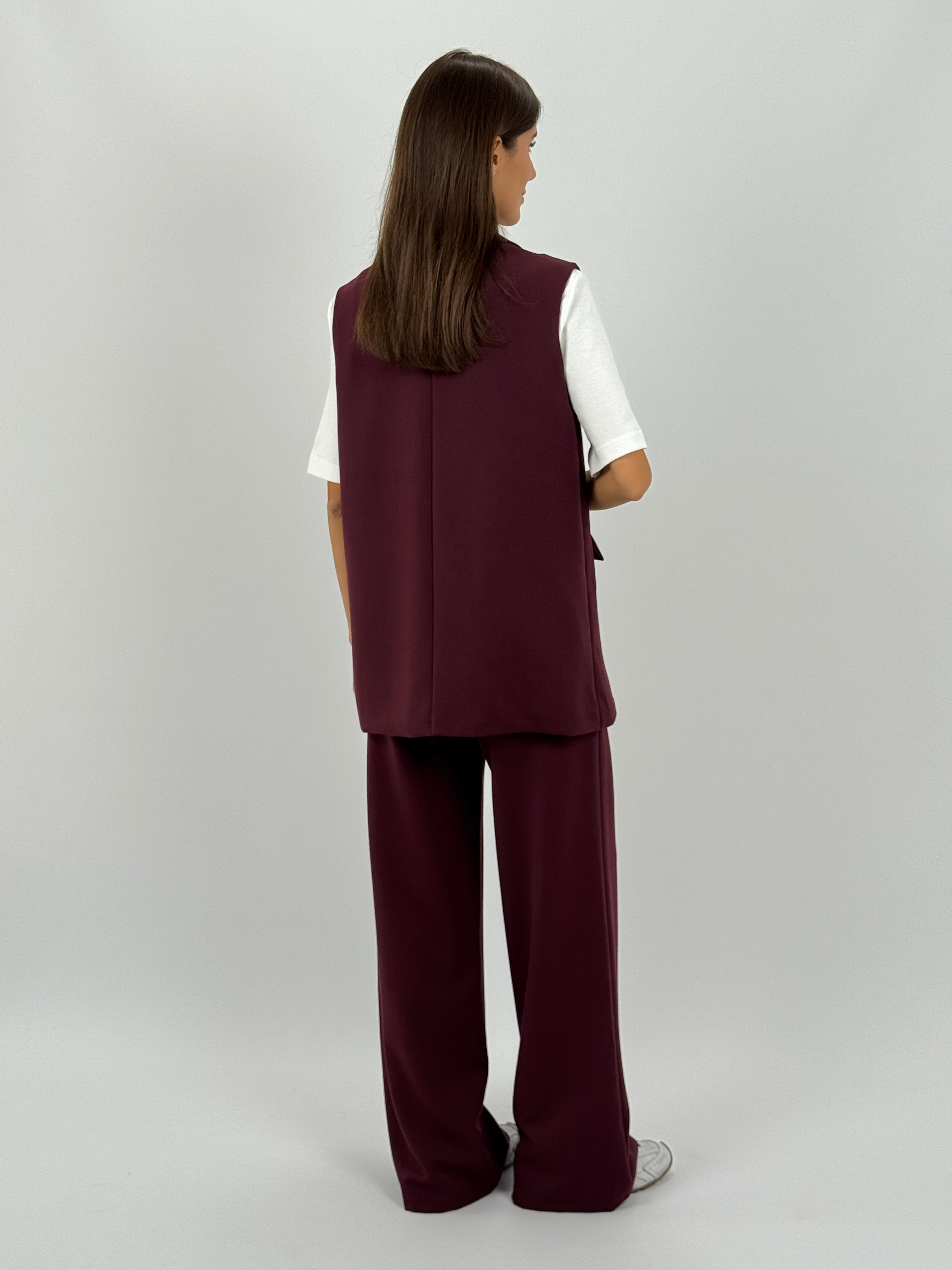 Set coordinato bordeaux con maxi gilet smanicato lungo a revers e fodera interna, abbinato a pantalone wide leg con elastico sul retro, tasche laterali e chiusura con zip e bottone.