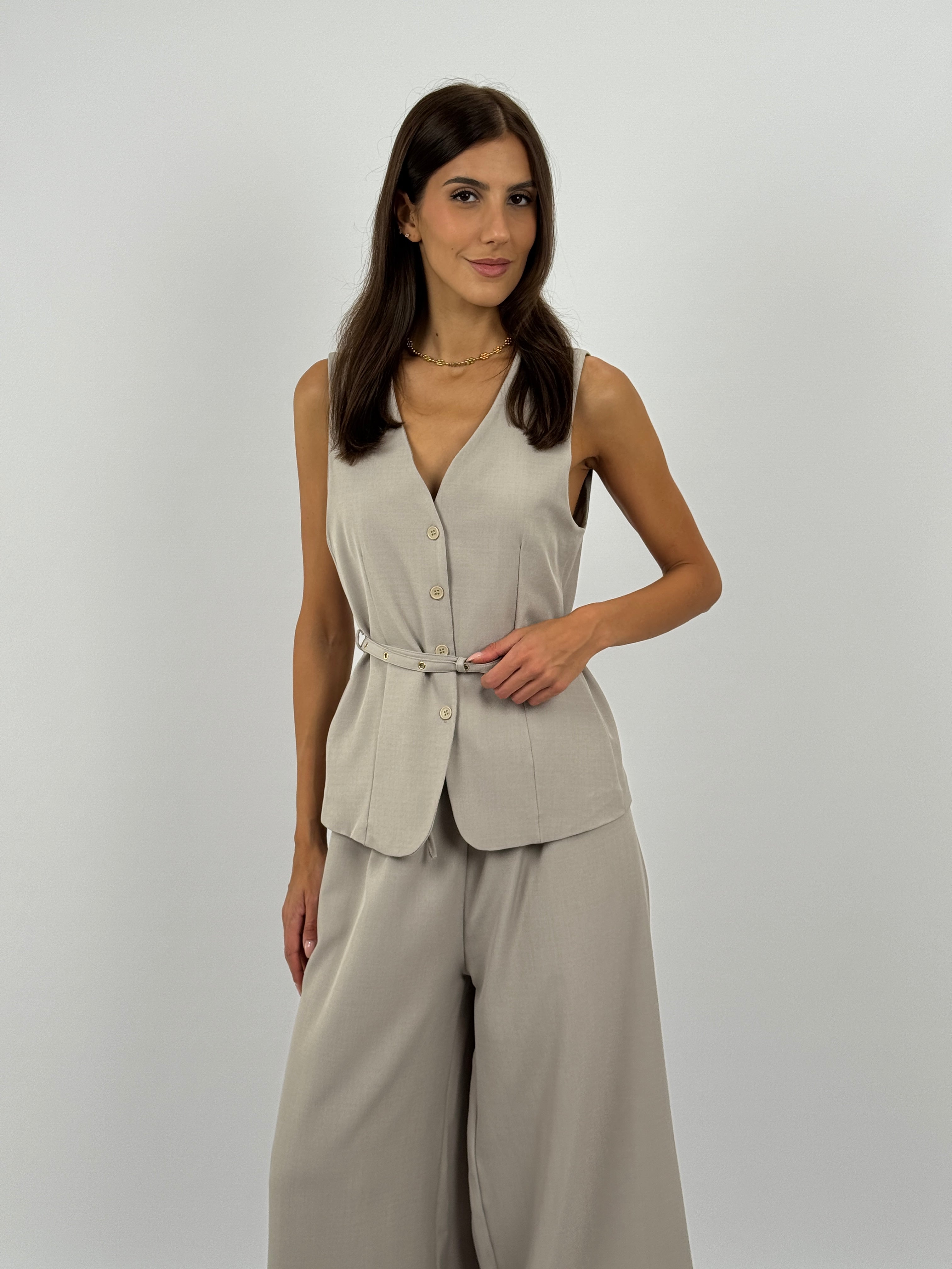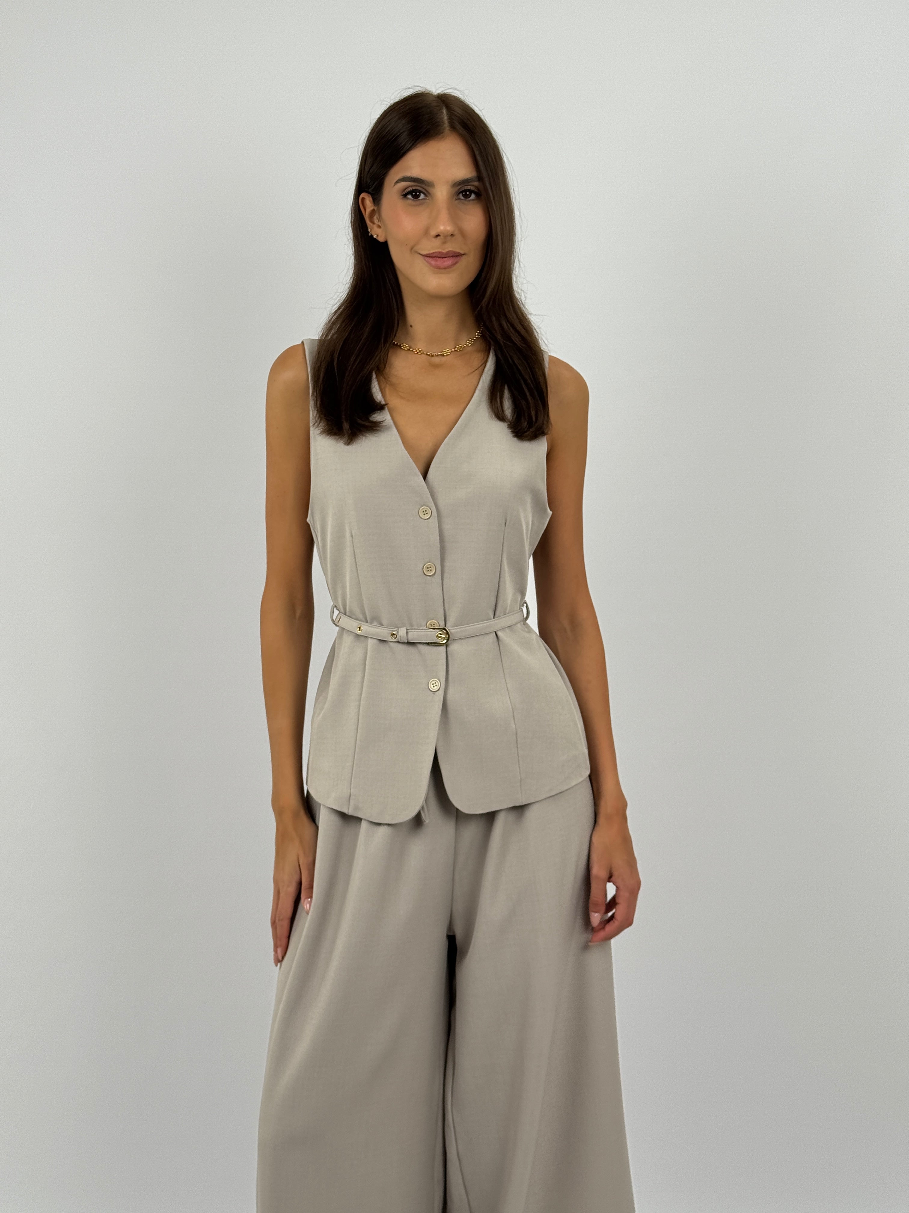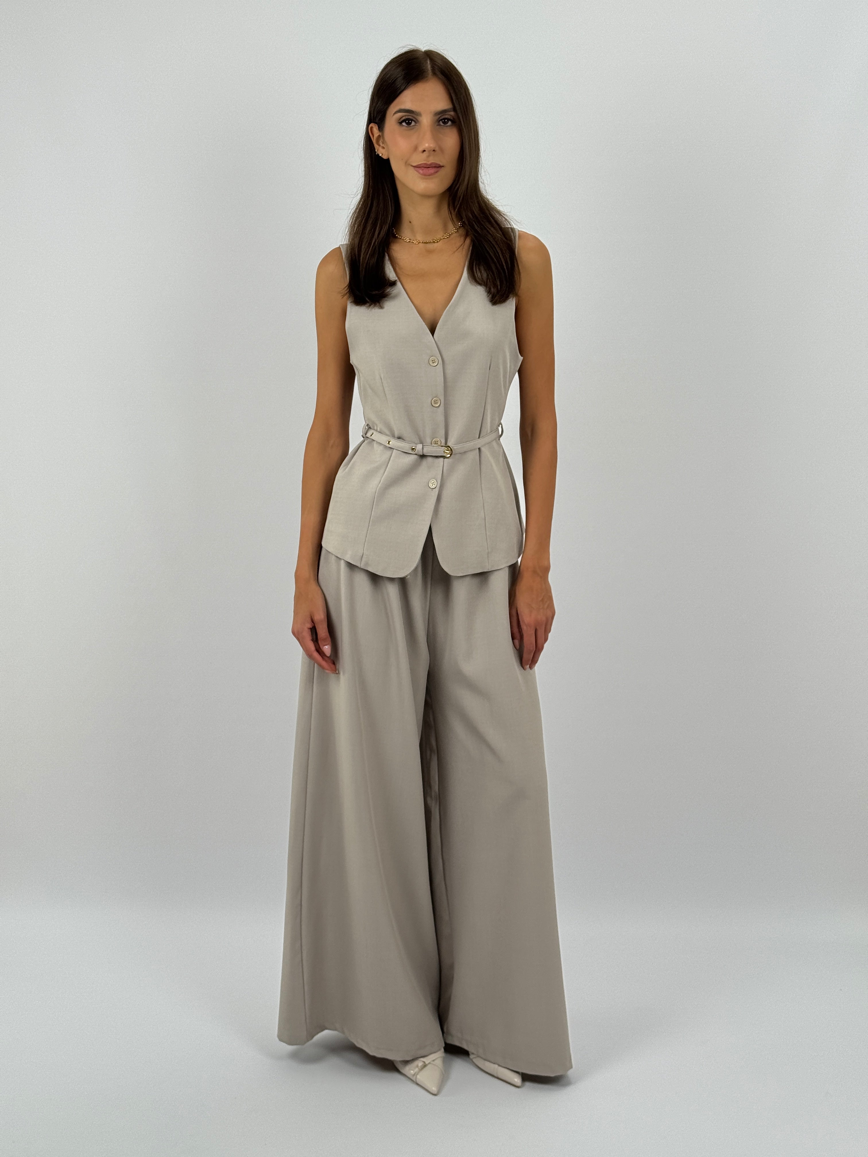 Set coordinato grigio con gilet dotato di cintura sottile con fibbia dorata, bottoni tono su tono e fodera interna, abbinato a pantalone lungo a palazzo con elastico e laccio in vita.