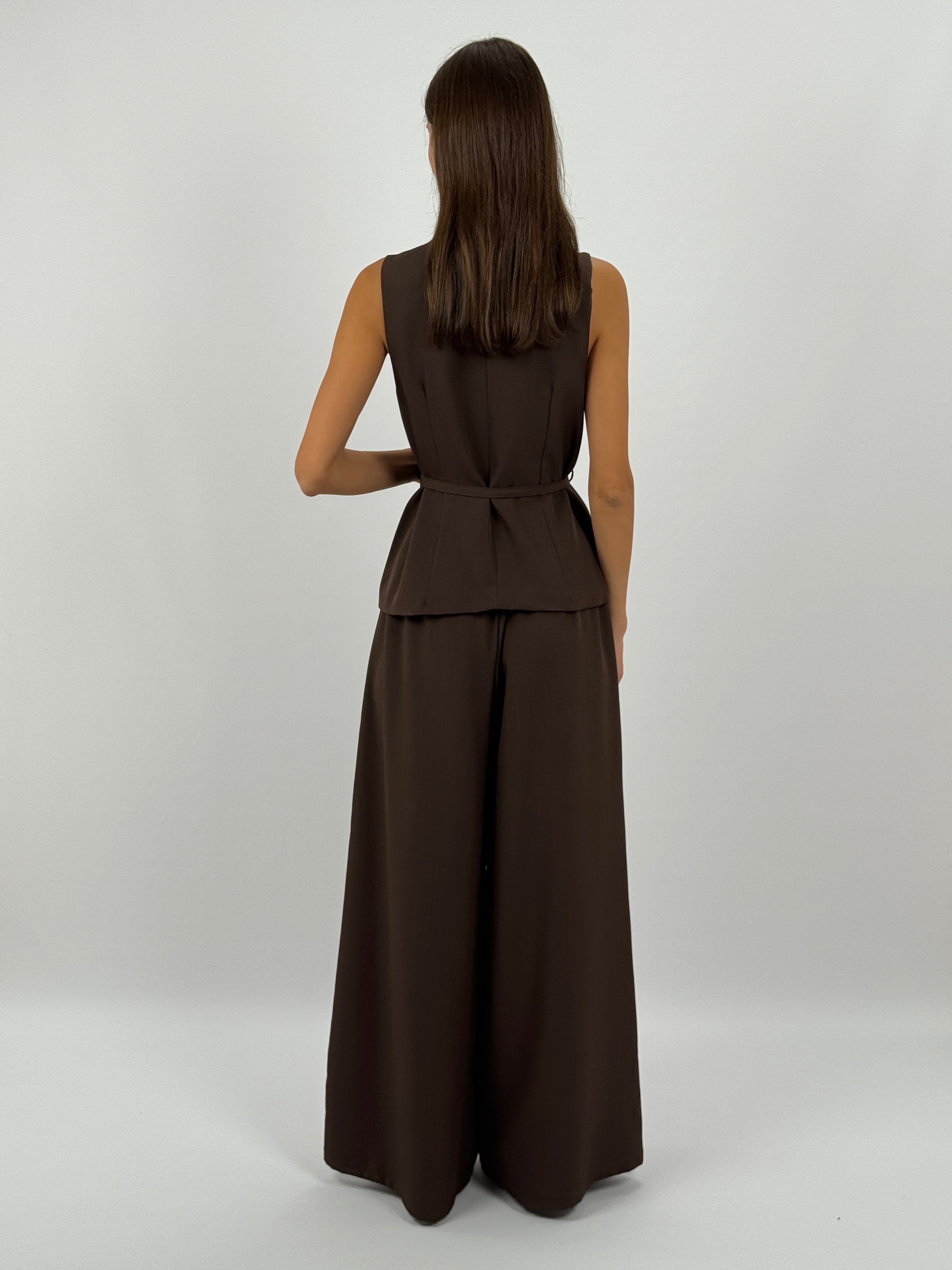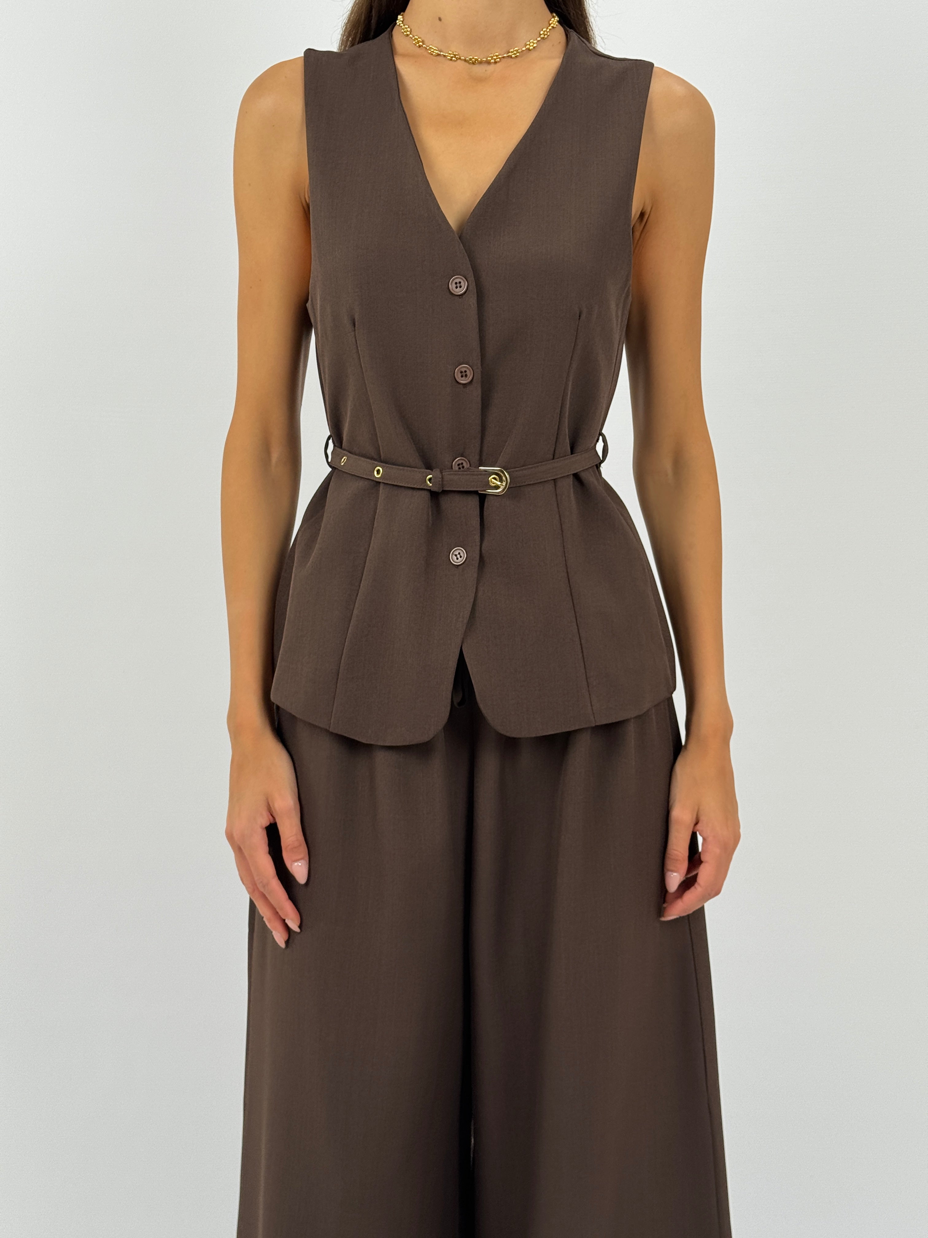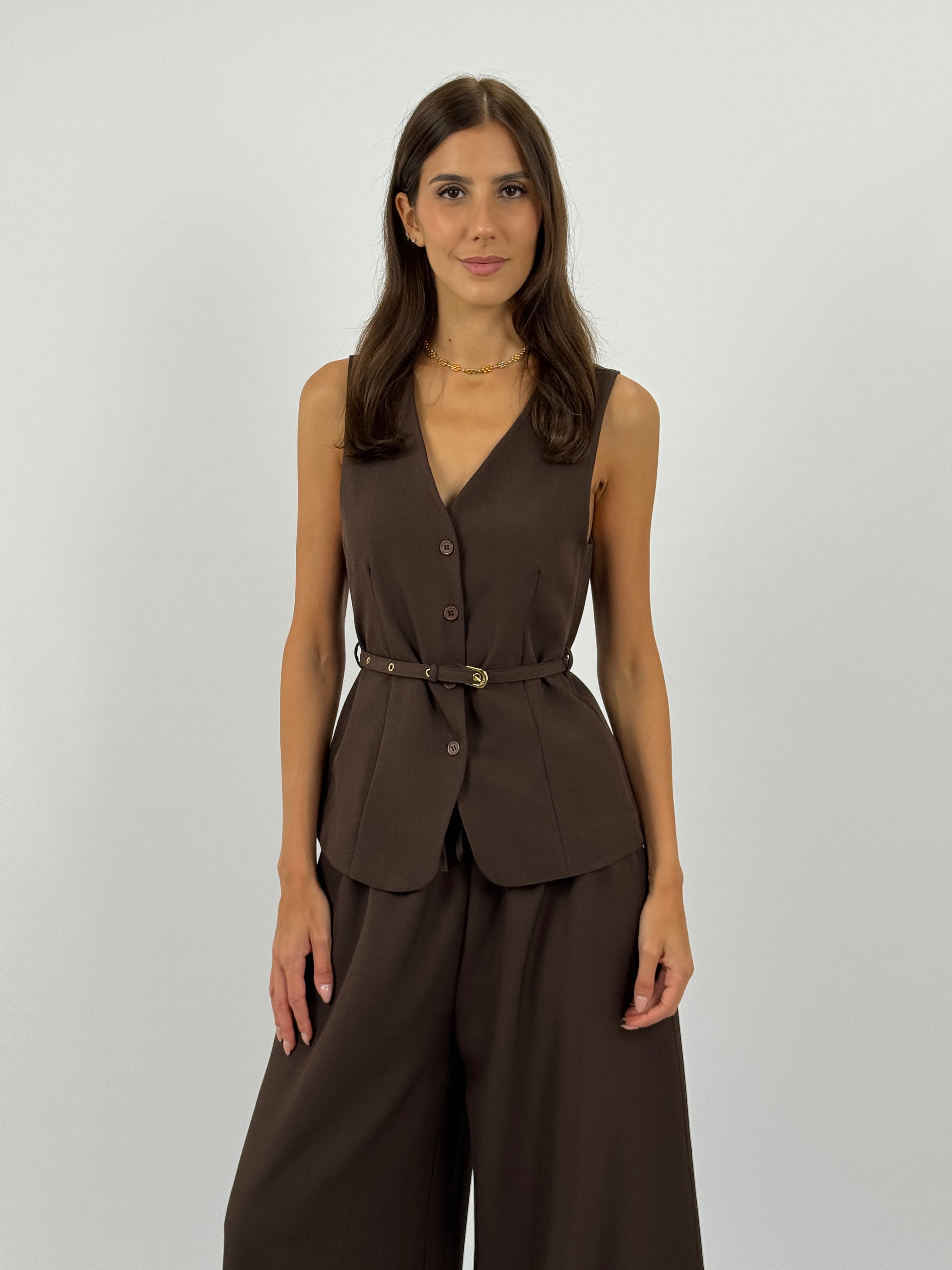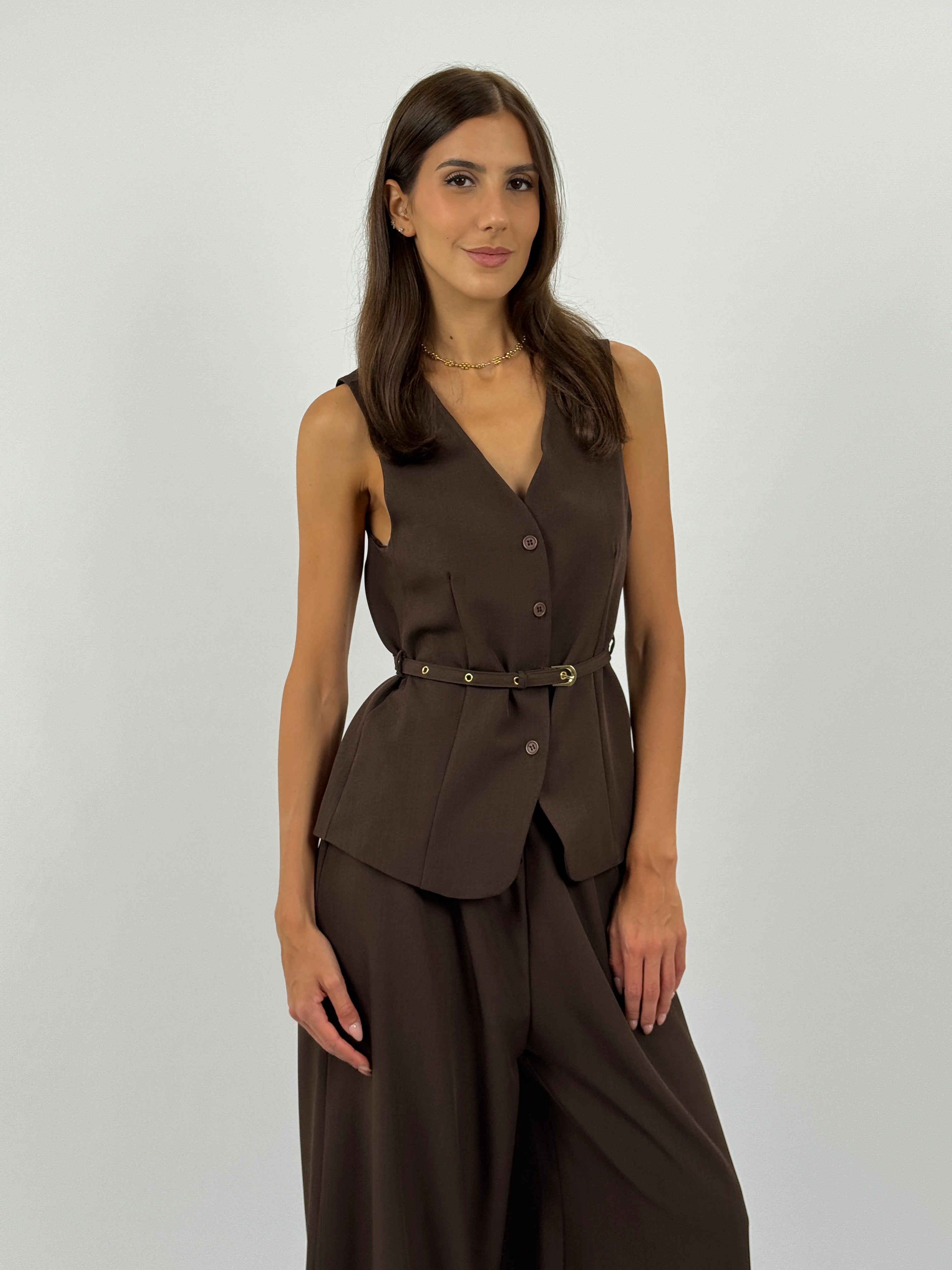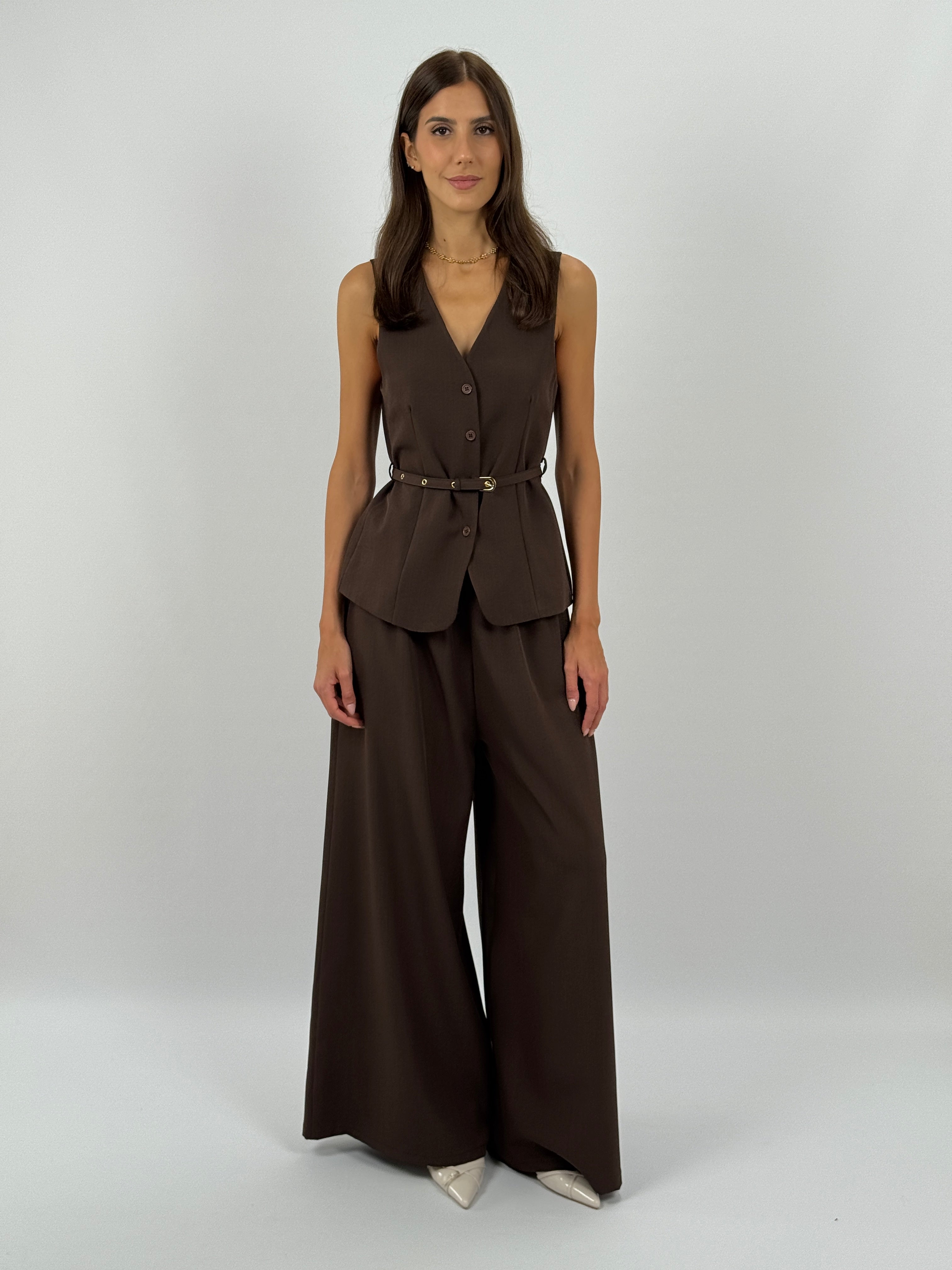 Set coordinato marrone con gilet dotato di cintura sottile con fibbia dorata, bottoni tono su tono e fodera interna, abbinato a pantalone lungo a palazzo con elastico e laccio in vita.