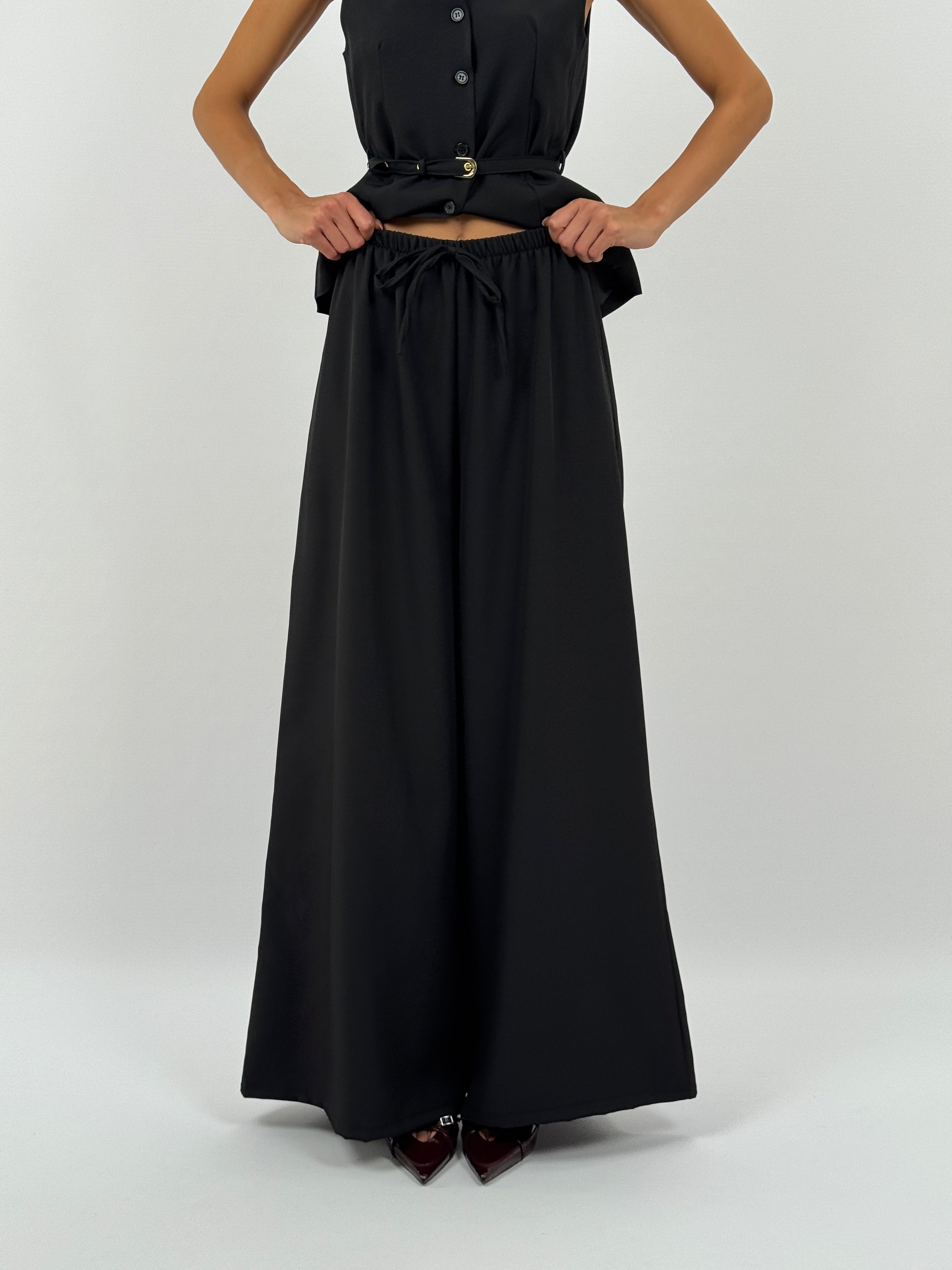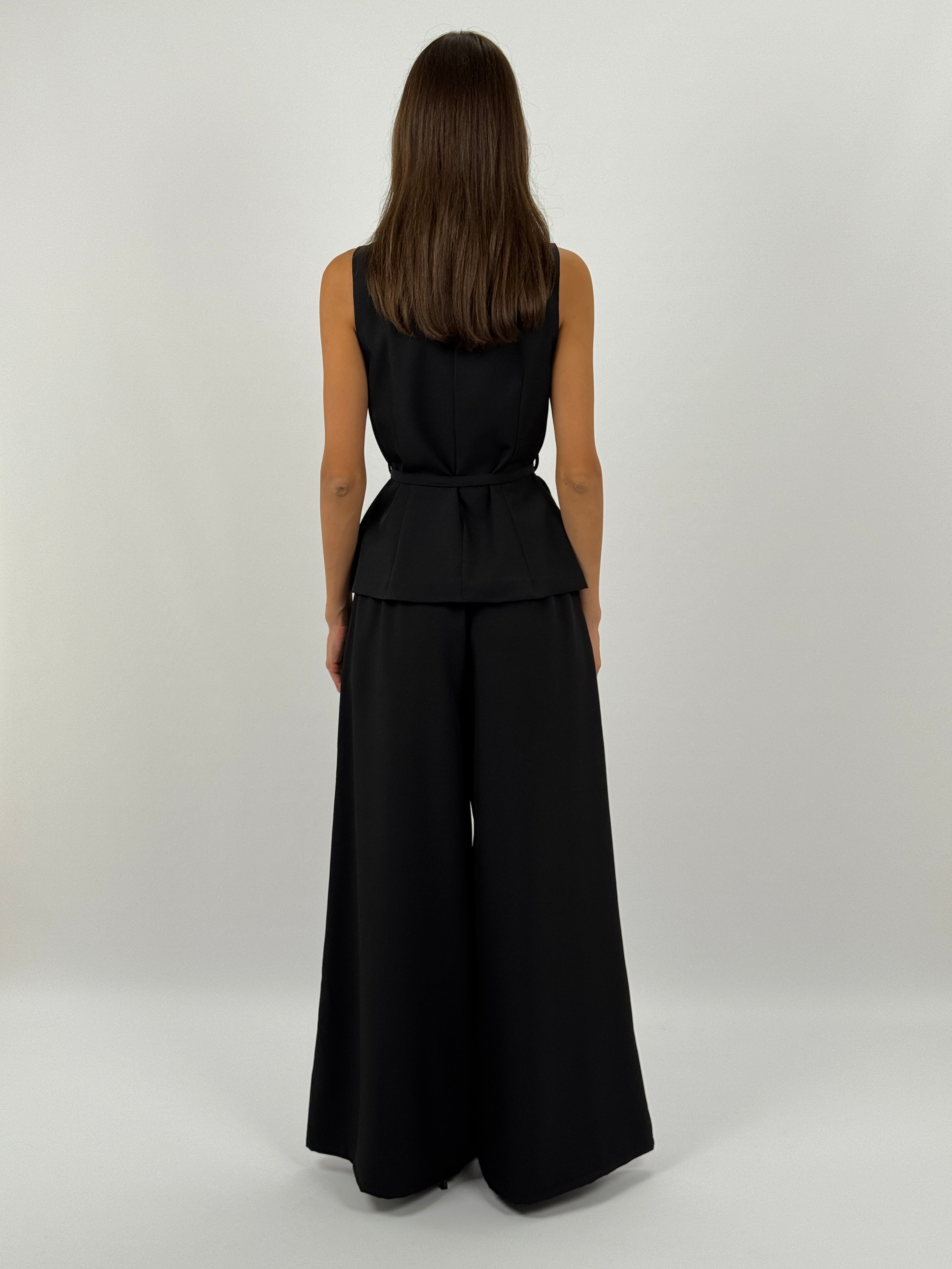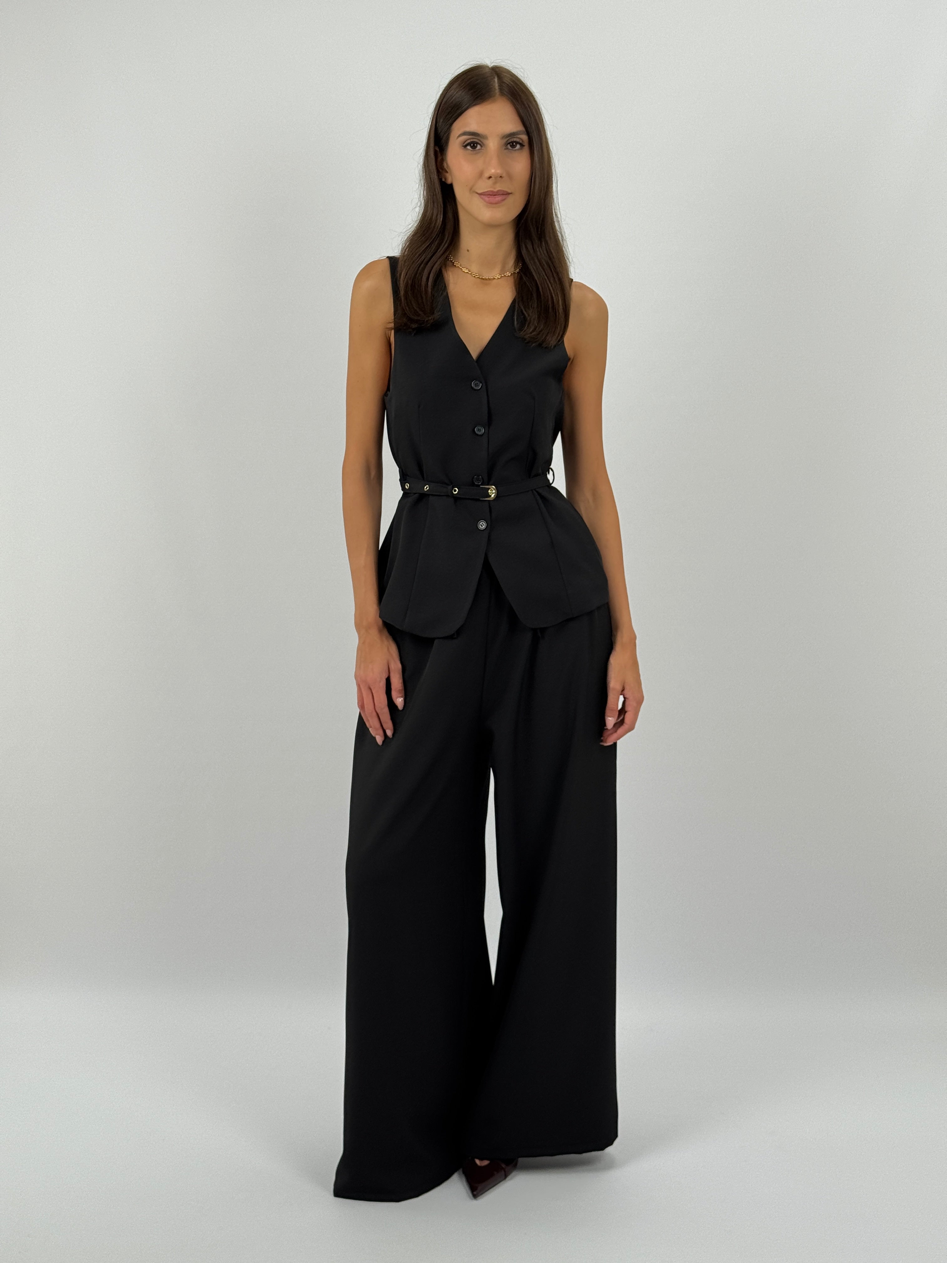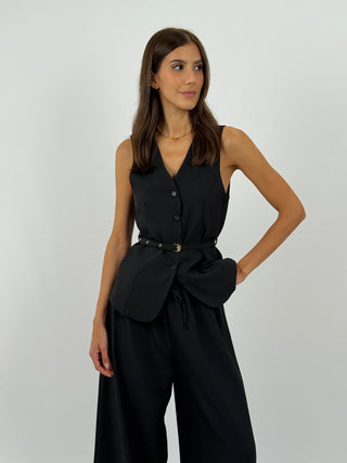 Set coordinato nero con gilet dotato di cintura sottile con fibbia dorata, bottoni tono su tono e fodera interna, abbinato a pantalone lungo a palazzo con elastico e laccio in vita.