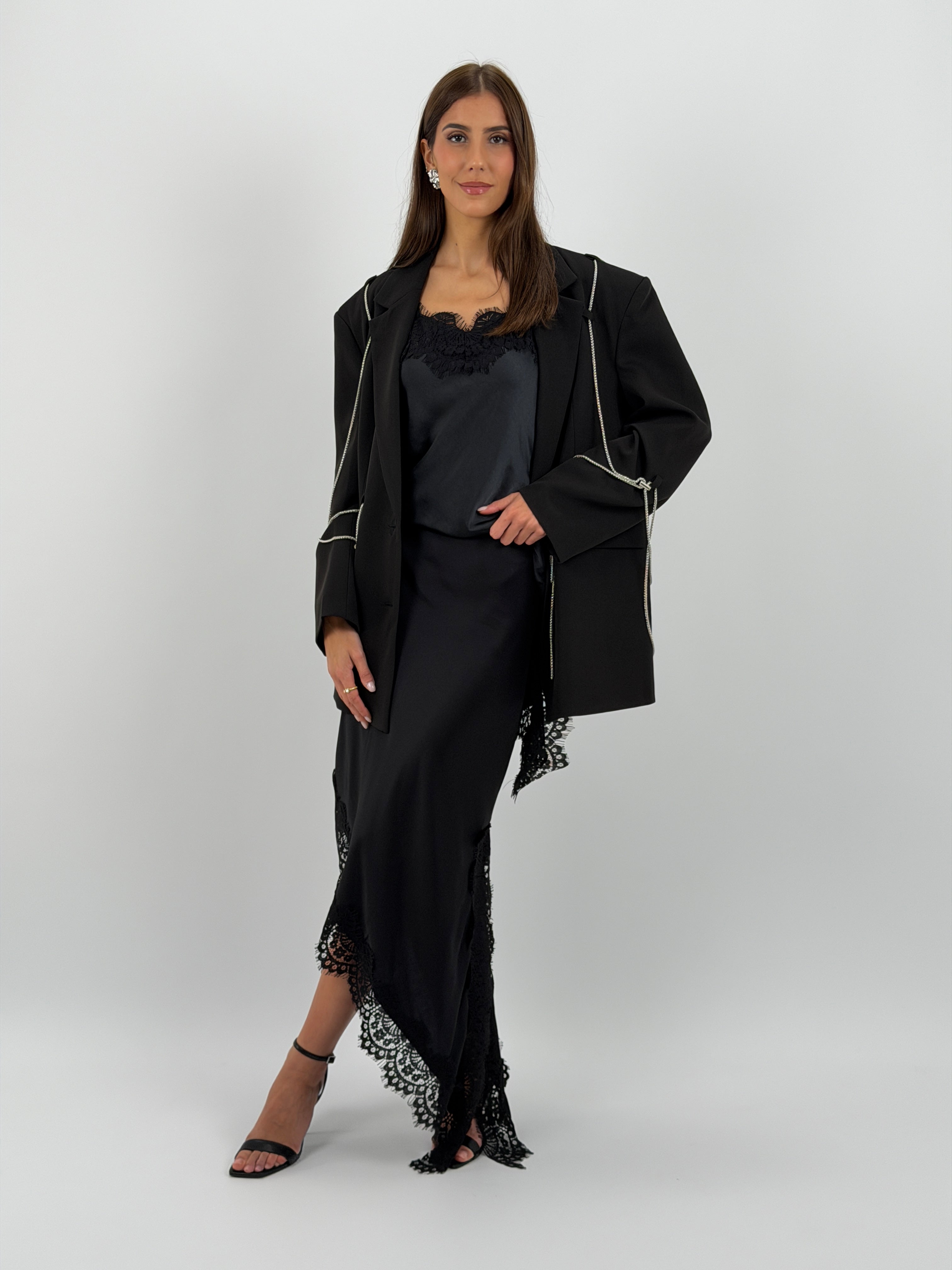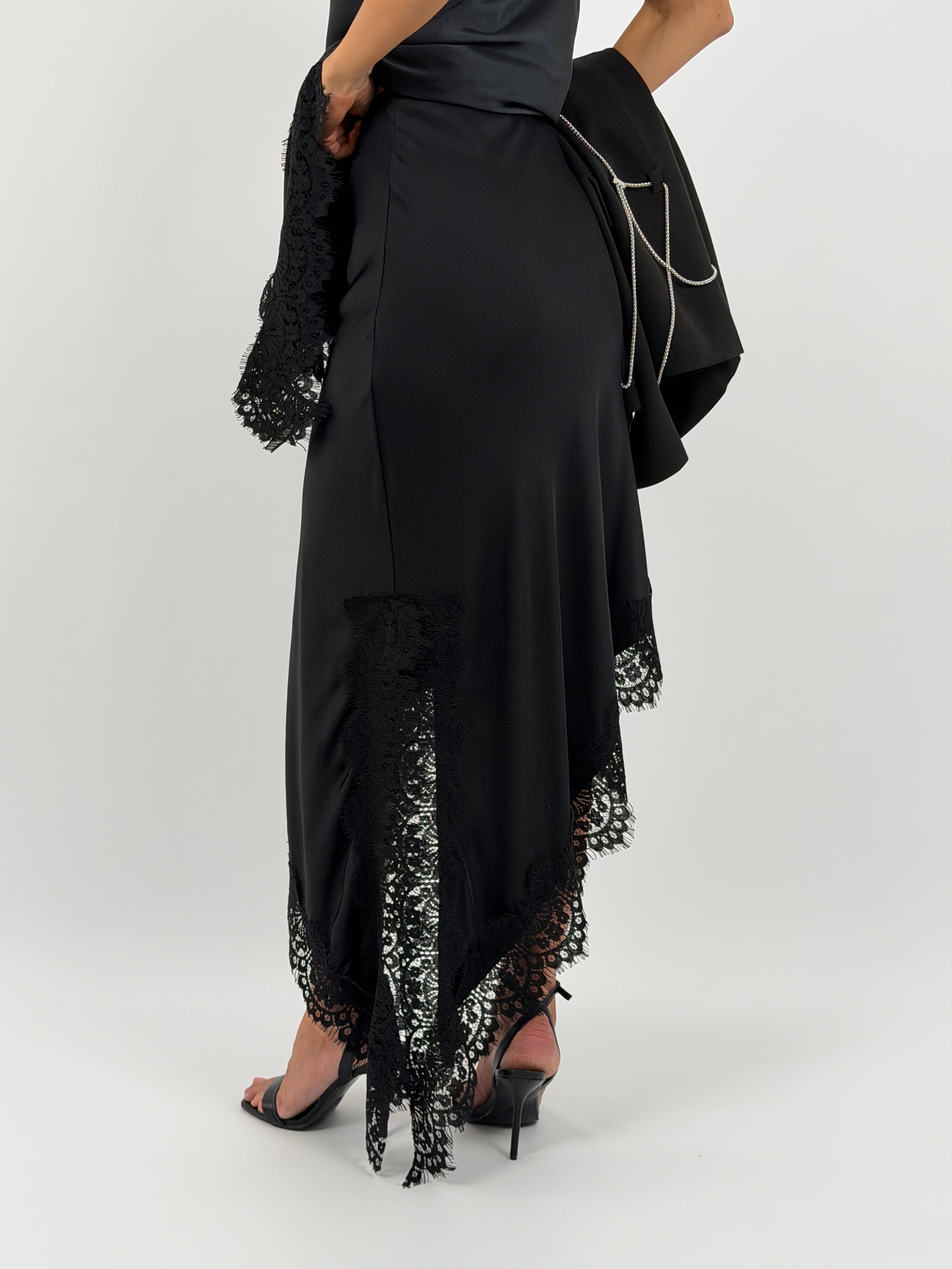 Gonna midi nera in tessuto satinato con lunghezza asimmetrica, bordo in pizzo e elastico in vita.