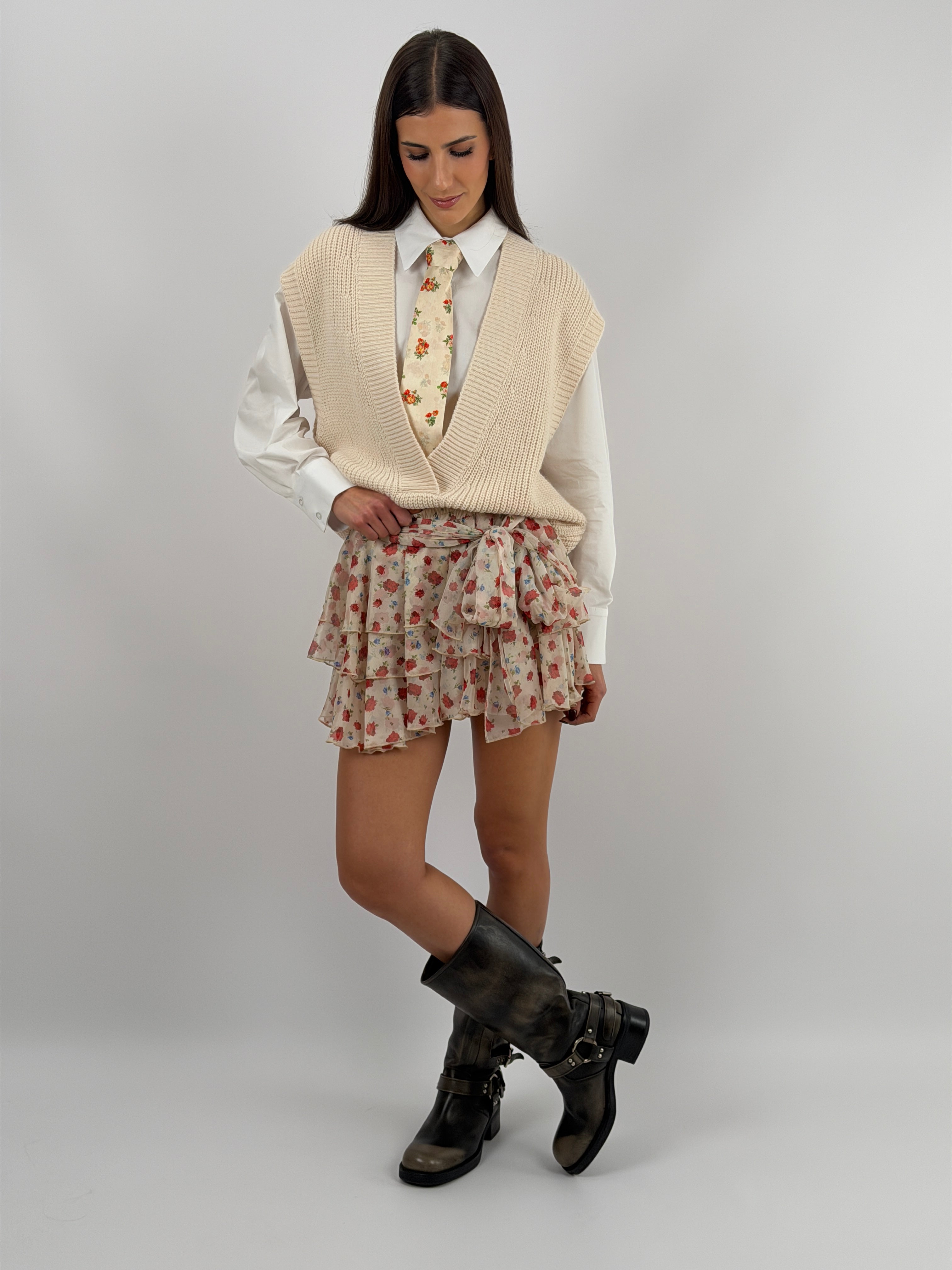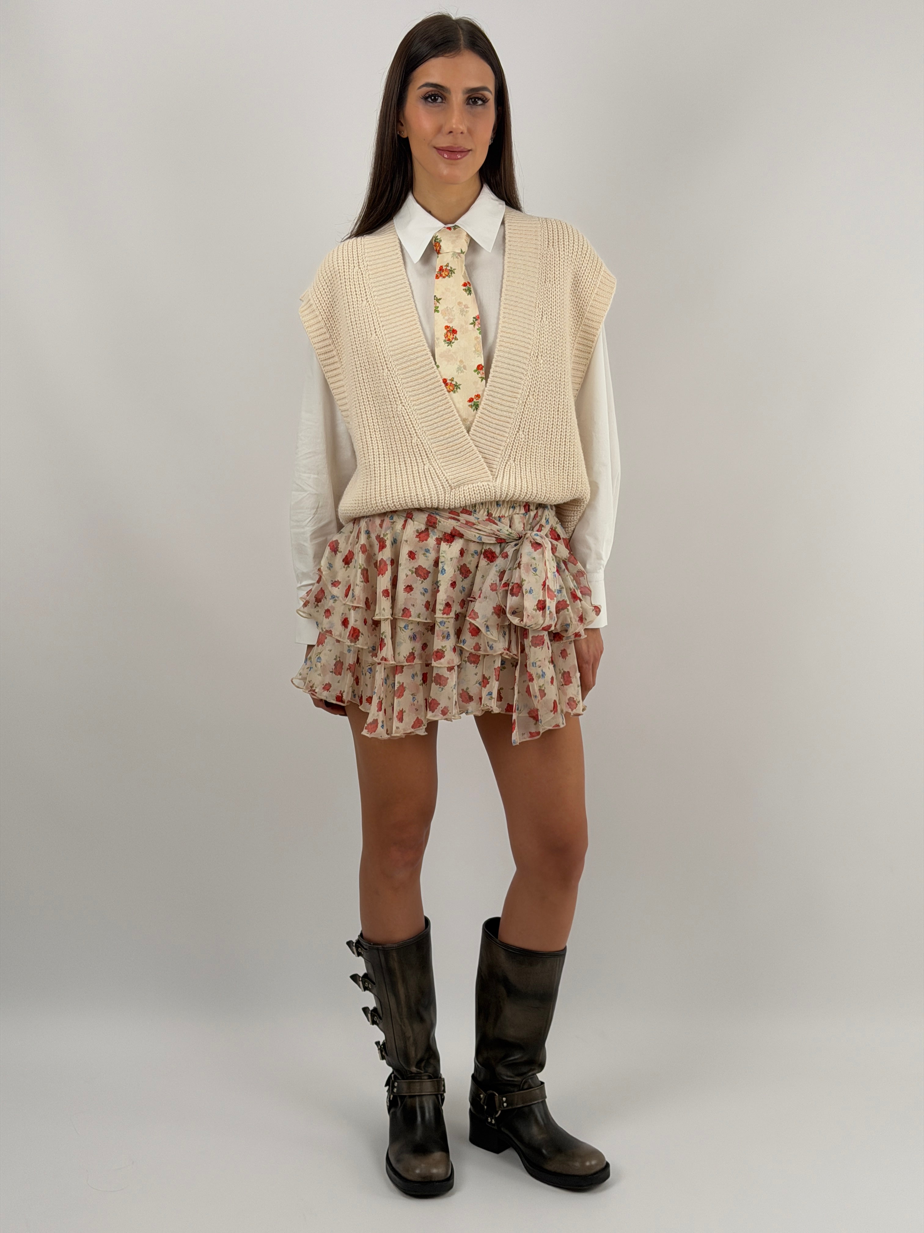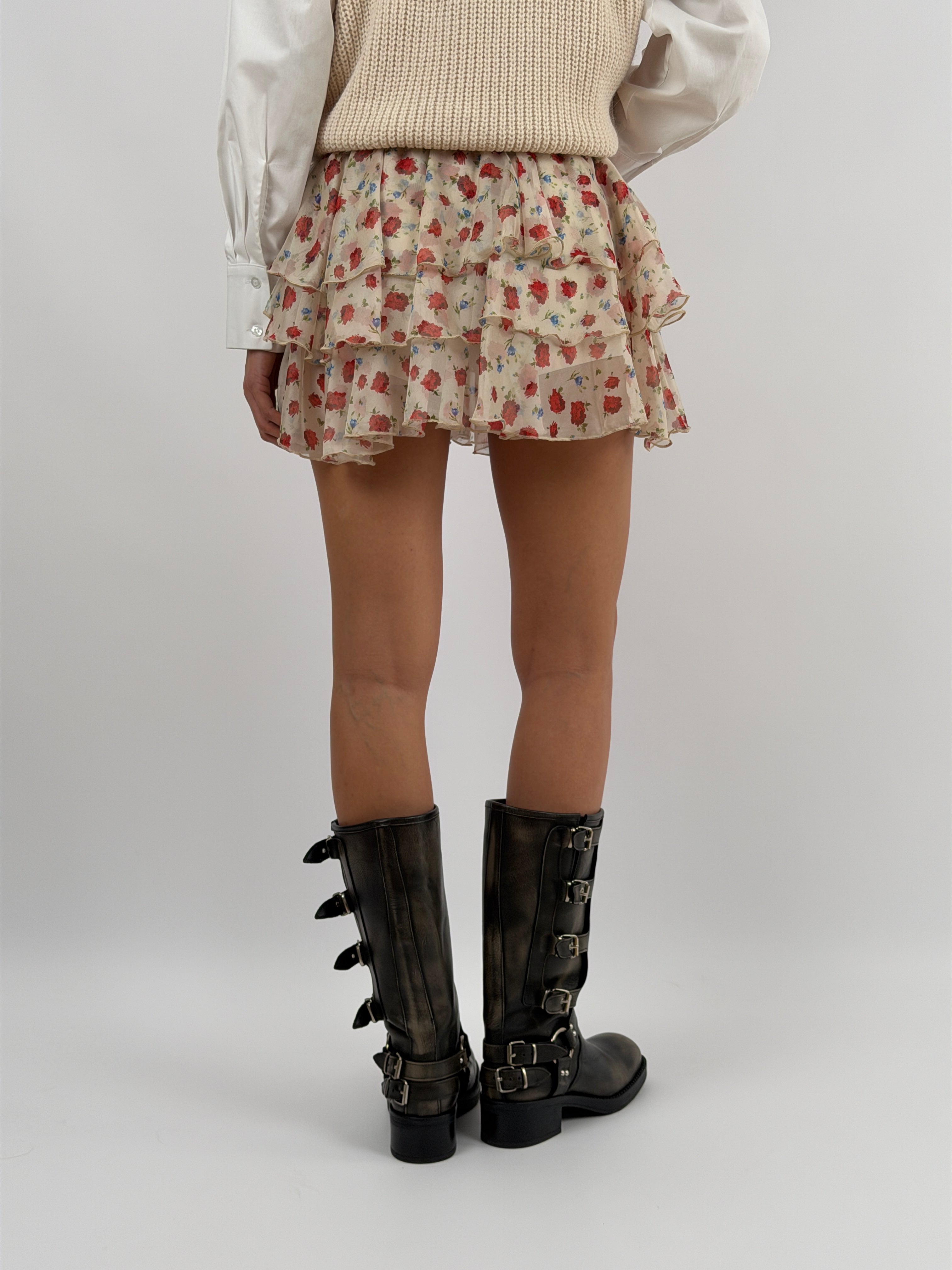 Gonna Lumina corta con motivo a fiori rossi, tripla balza, elastico e fusciacca in vita, con coulotte interna.