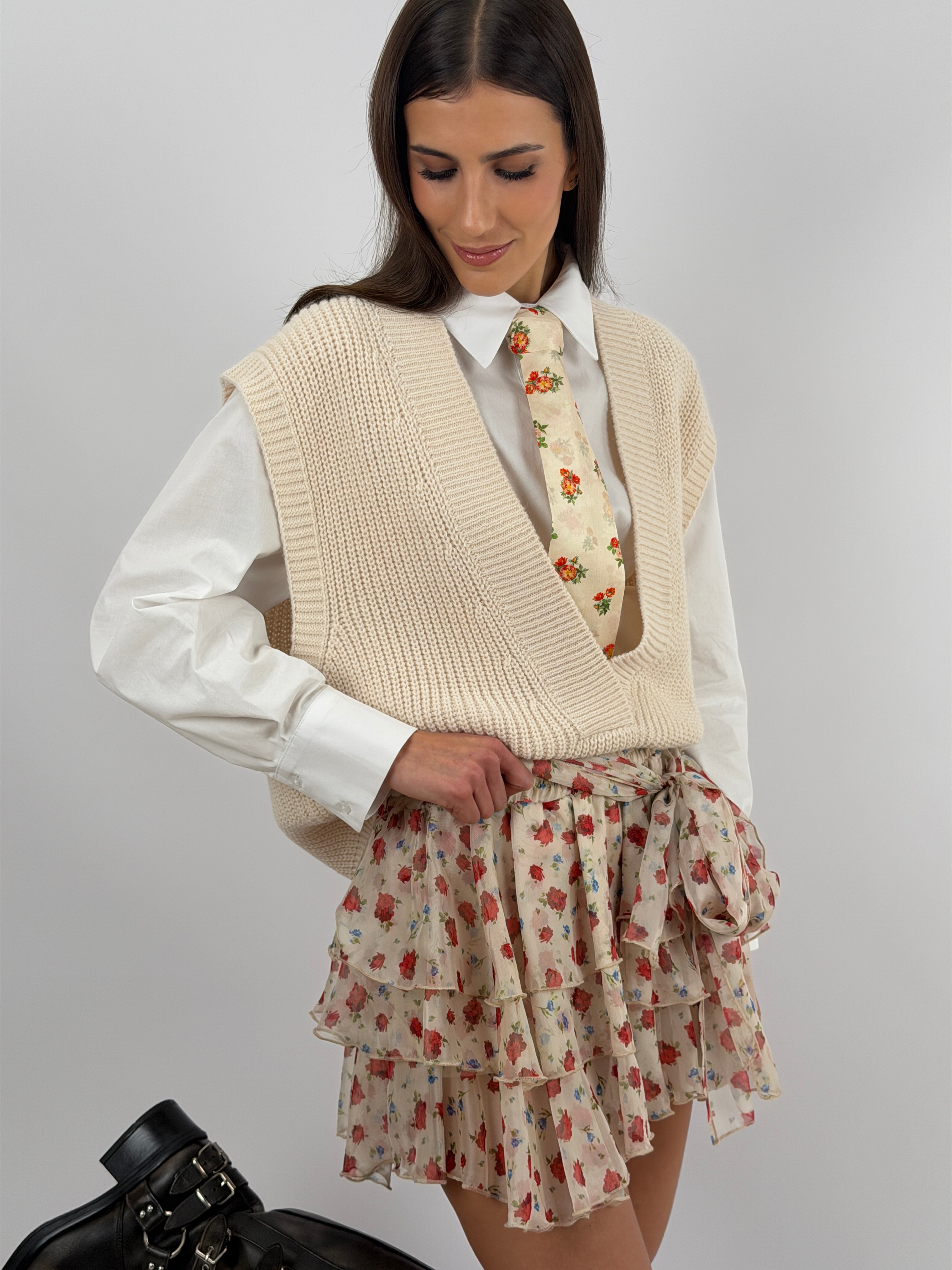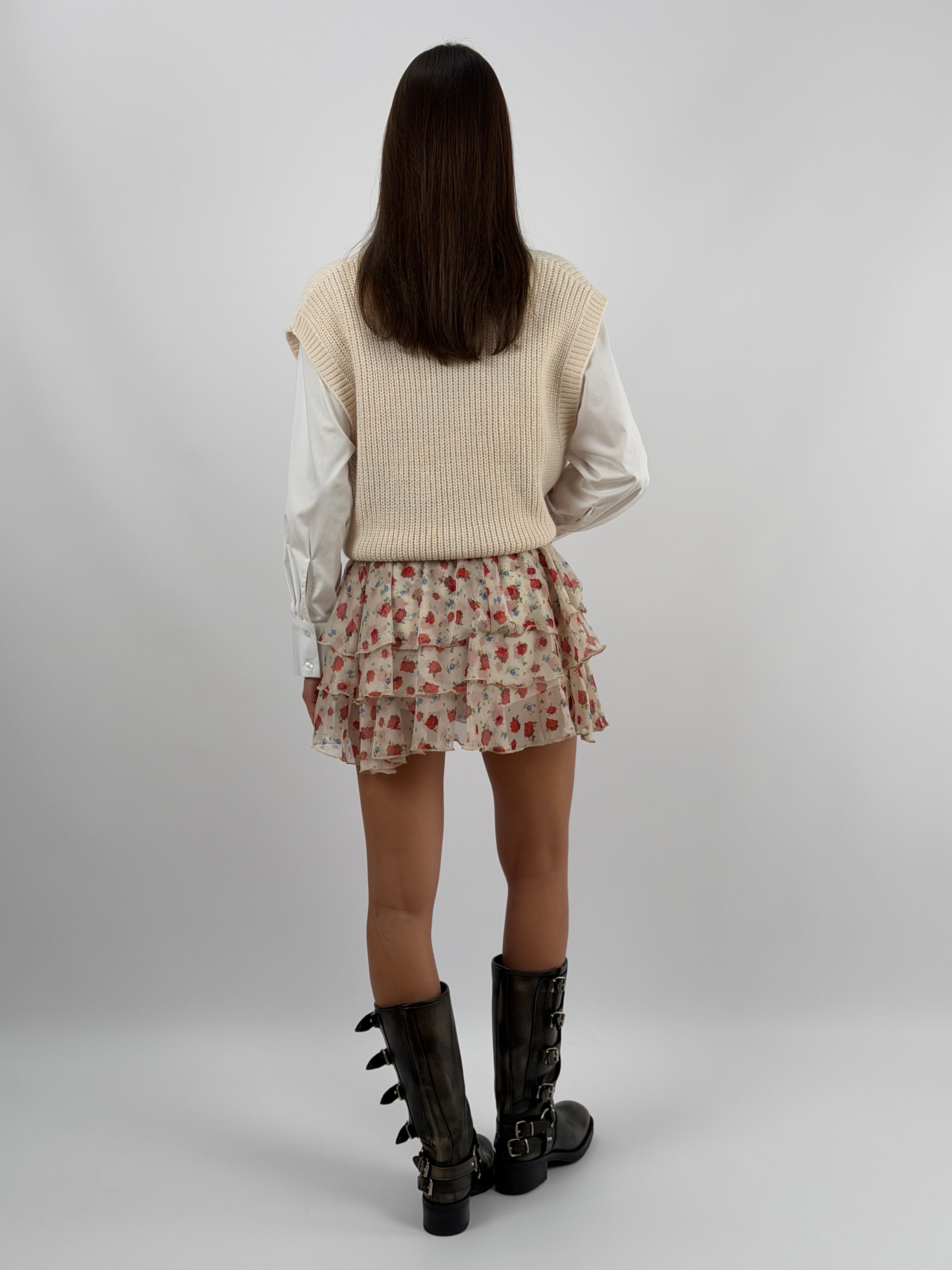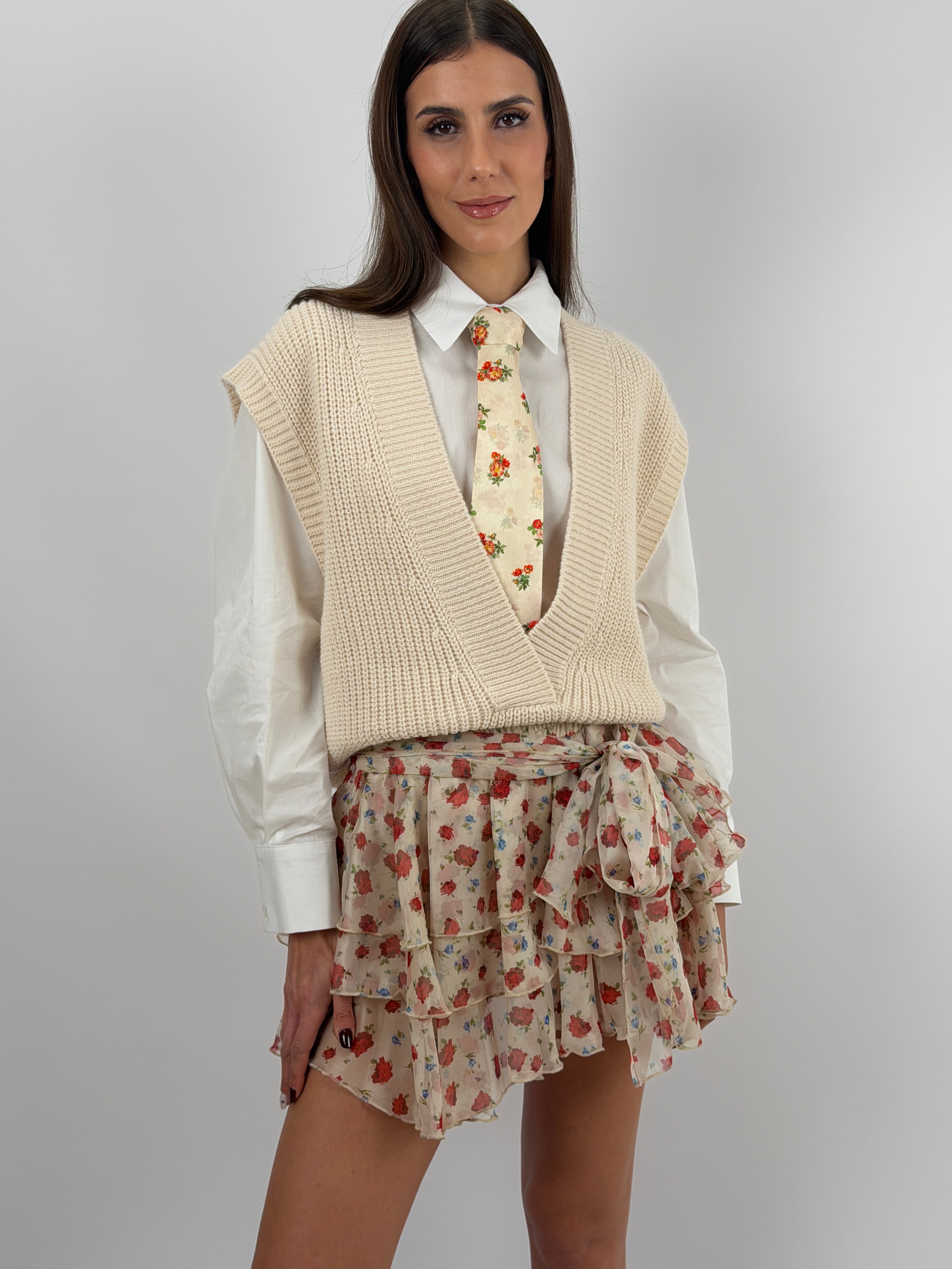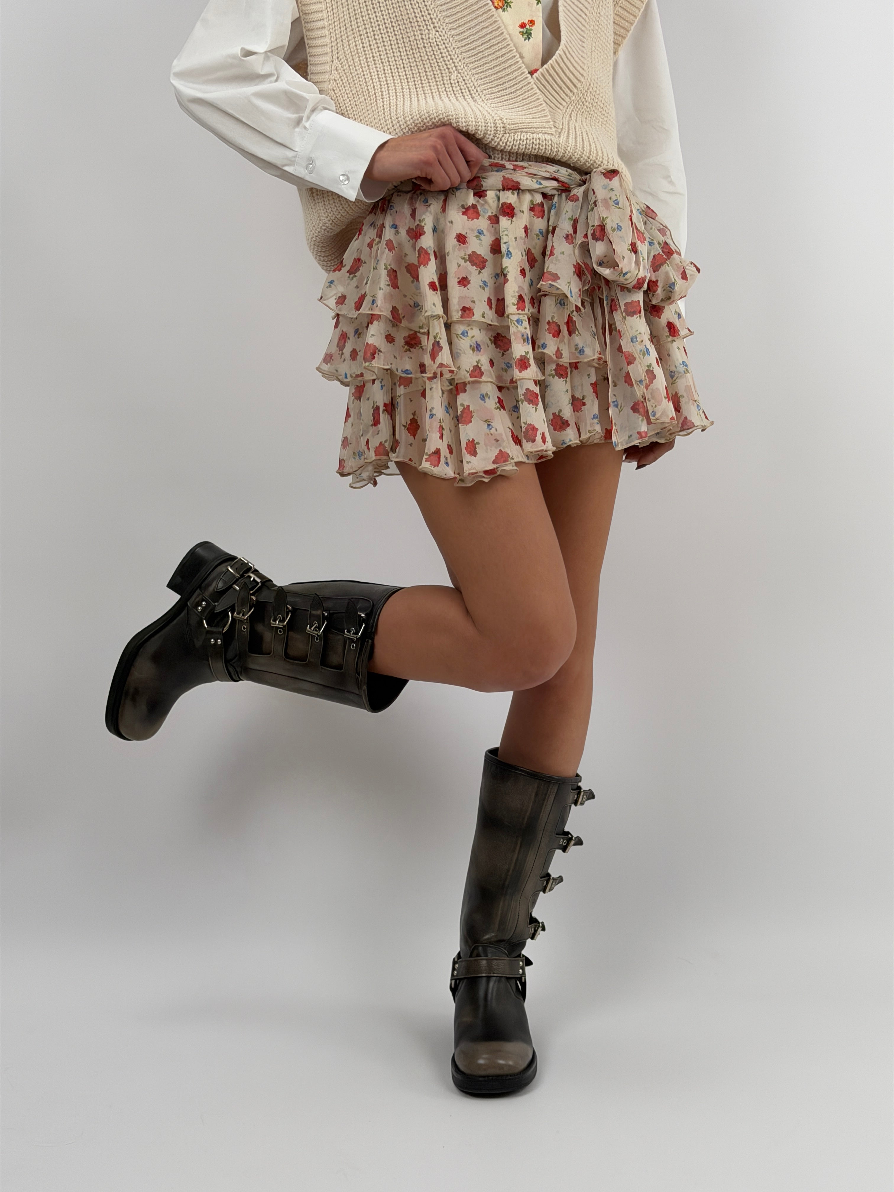 Gonna Lumina corta con motivo a fiori rossi, tripla balza, elastico e fusciacca in vita, con coulotte interna.