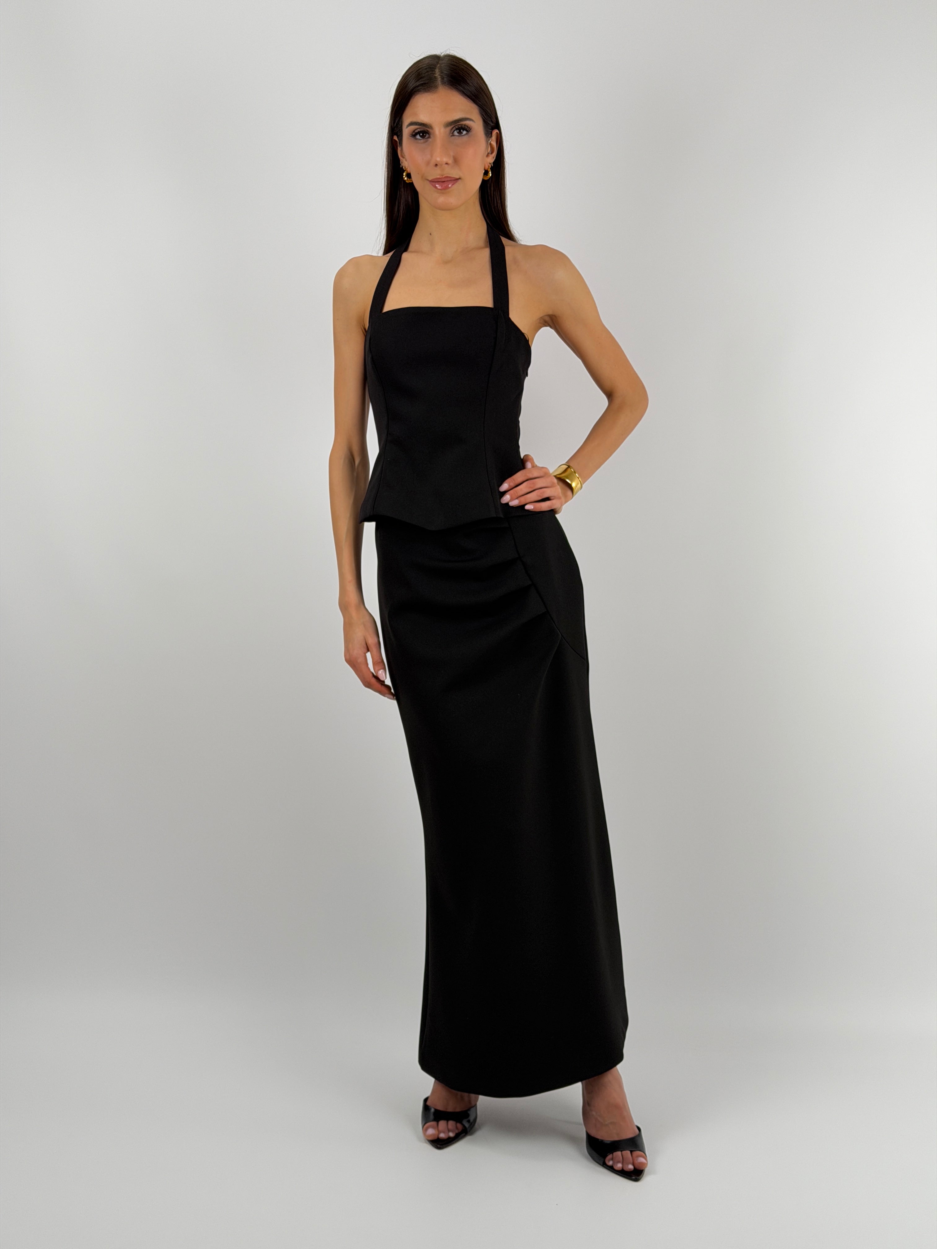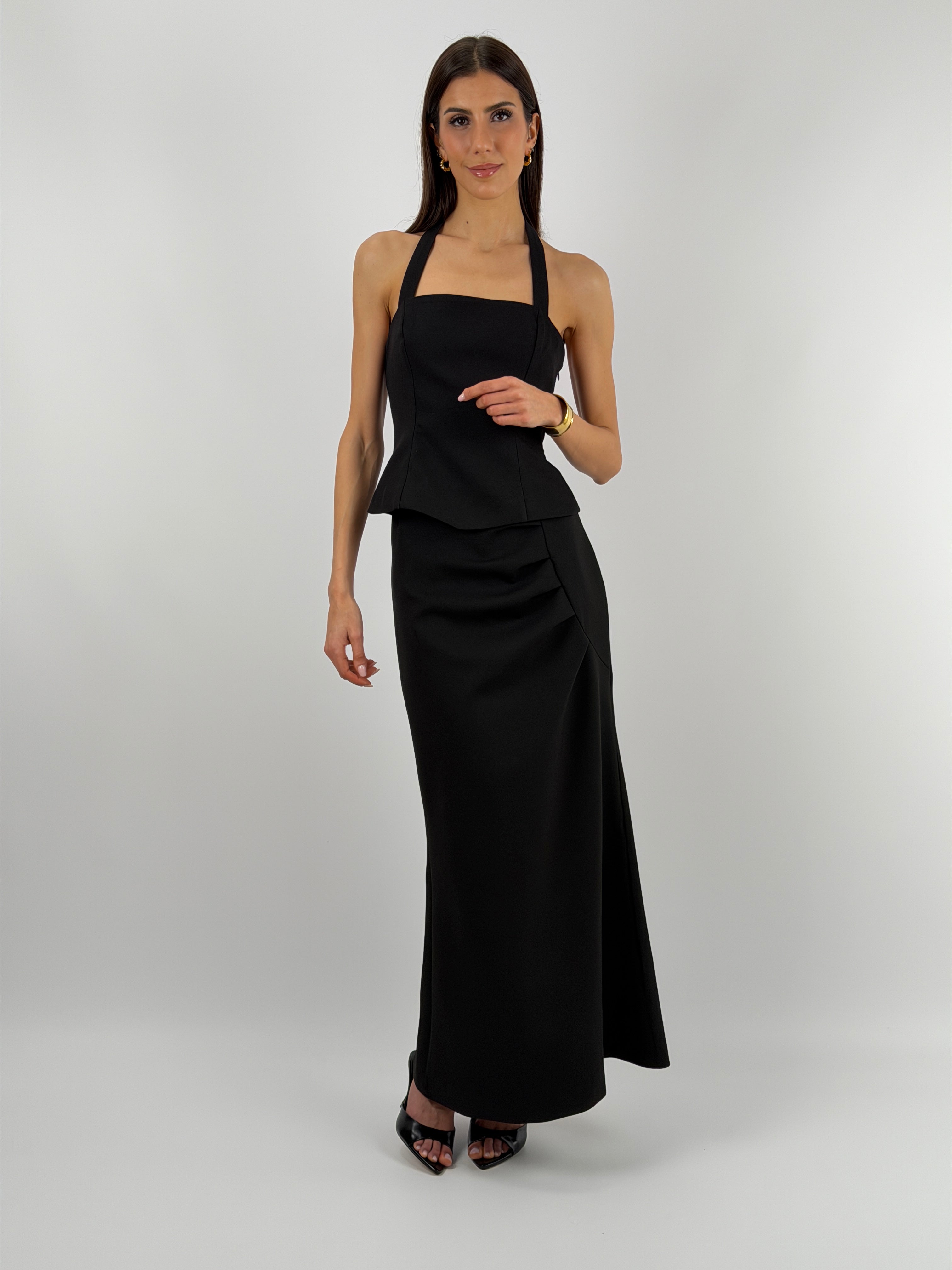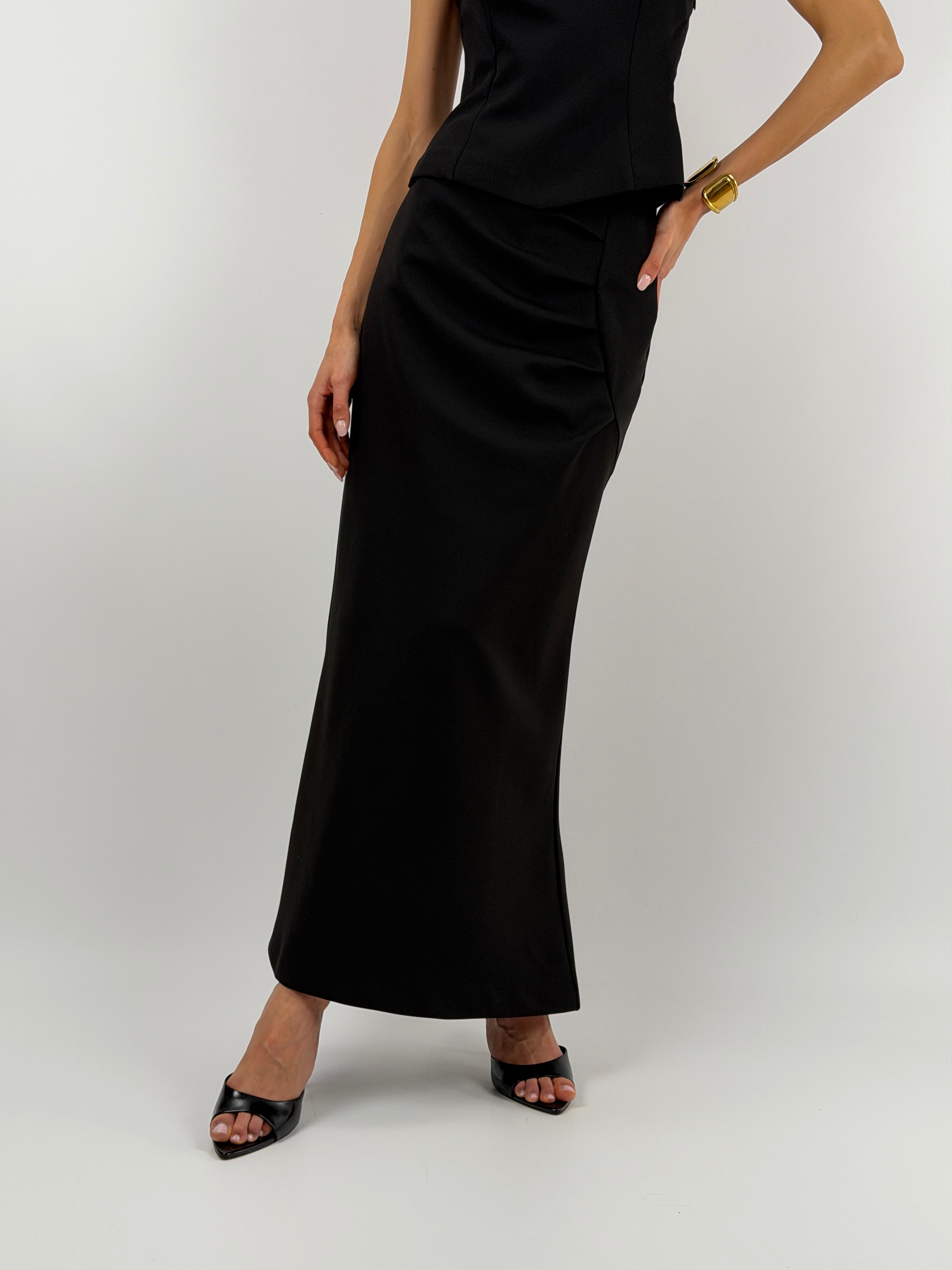 Gonna longuette nera Lumina con drappeggio frontale, spacco sul retro e chiusura con zip sul retro