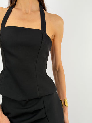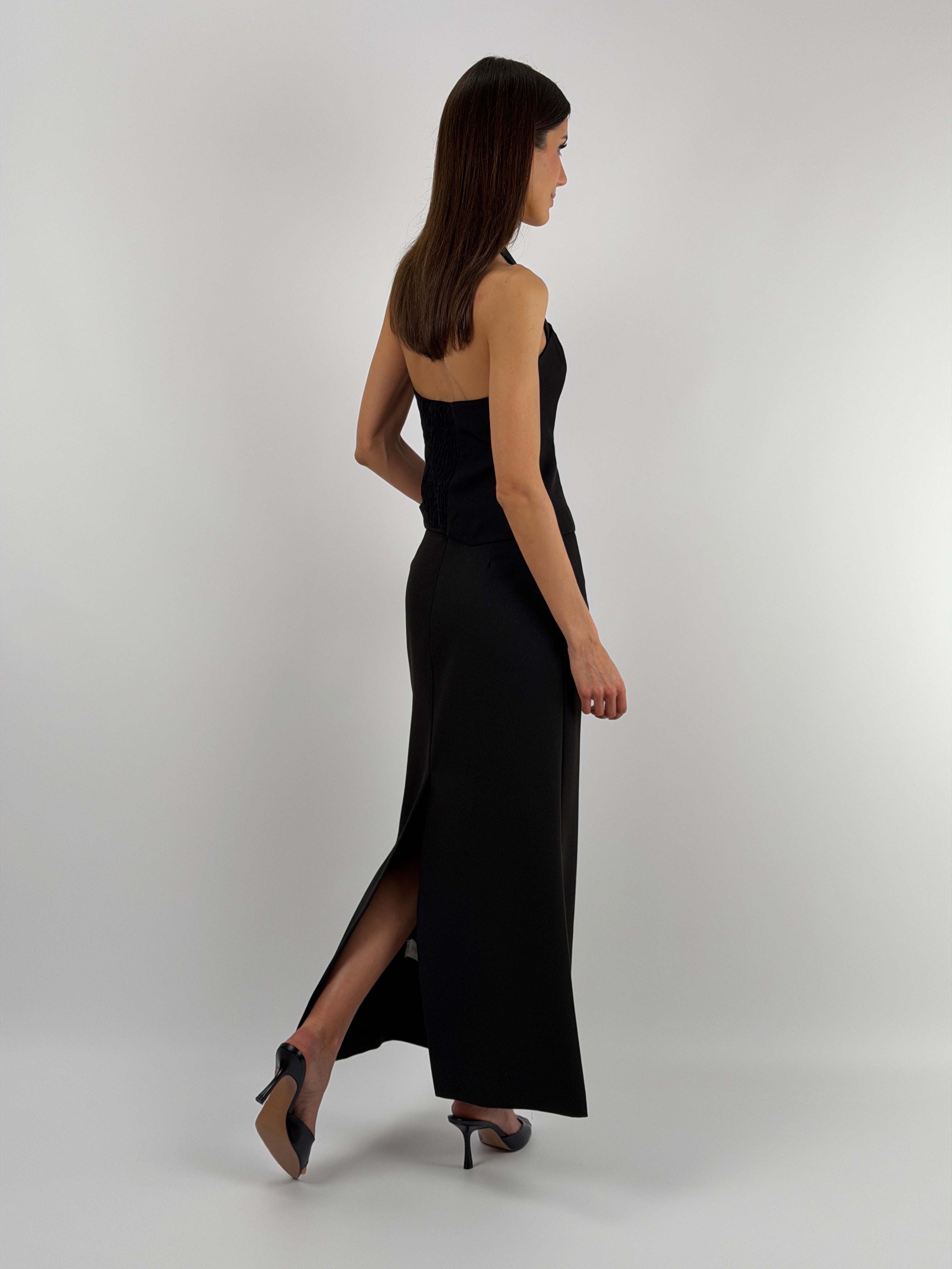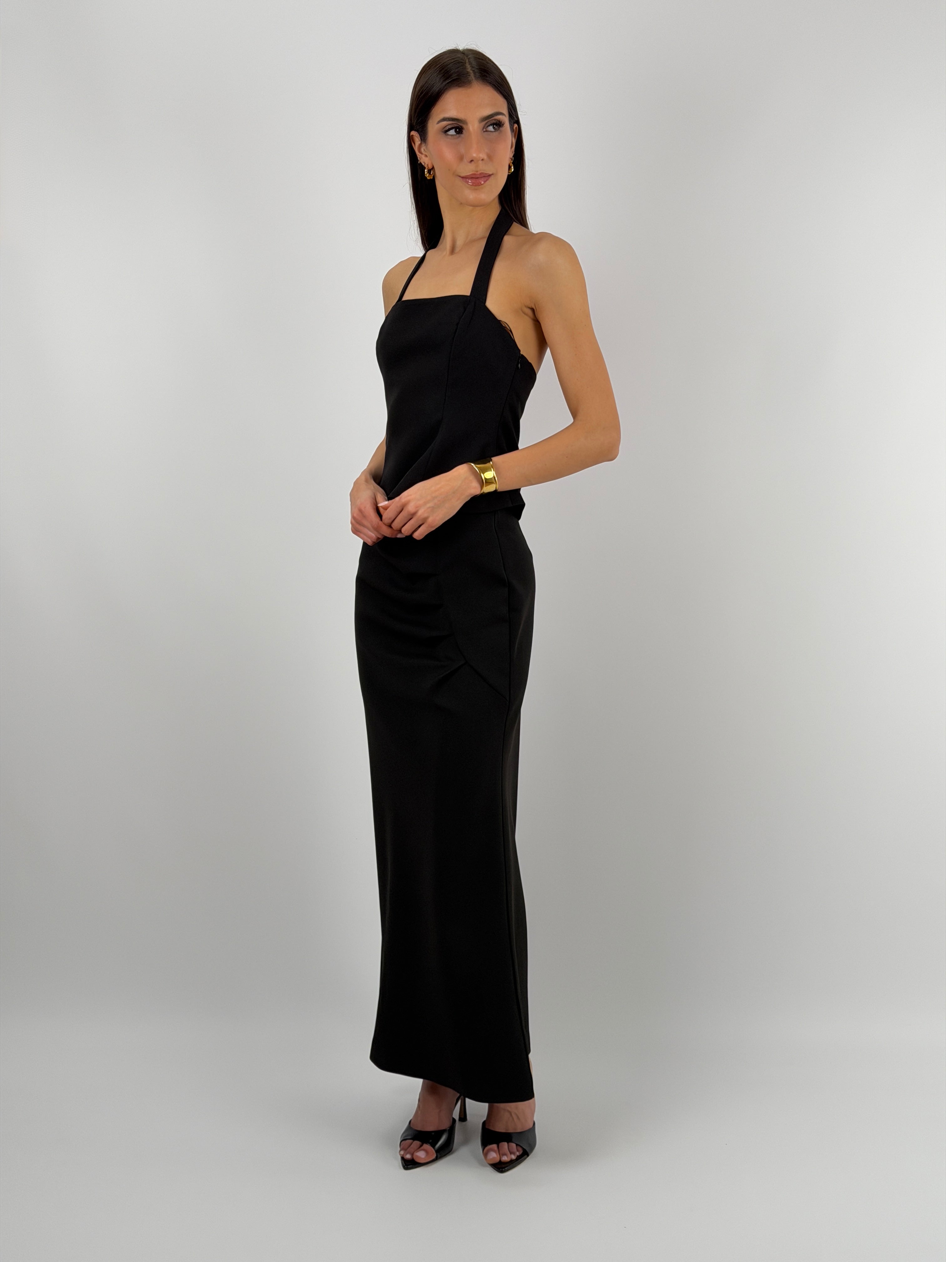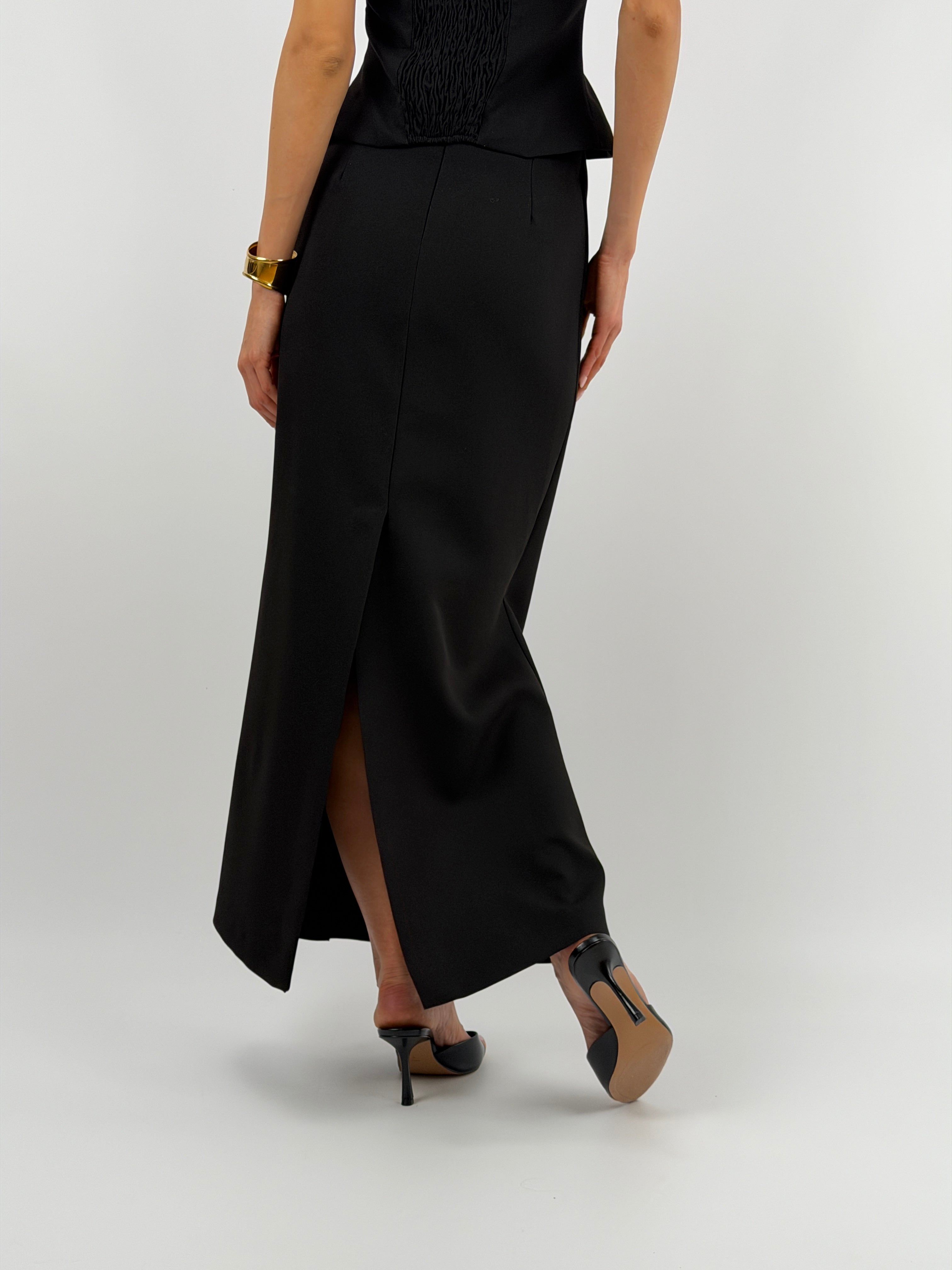 Gonna longuette nera Lumina con drappeggio frontale, spacco sul retro e chiusura con zip sul retro