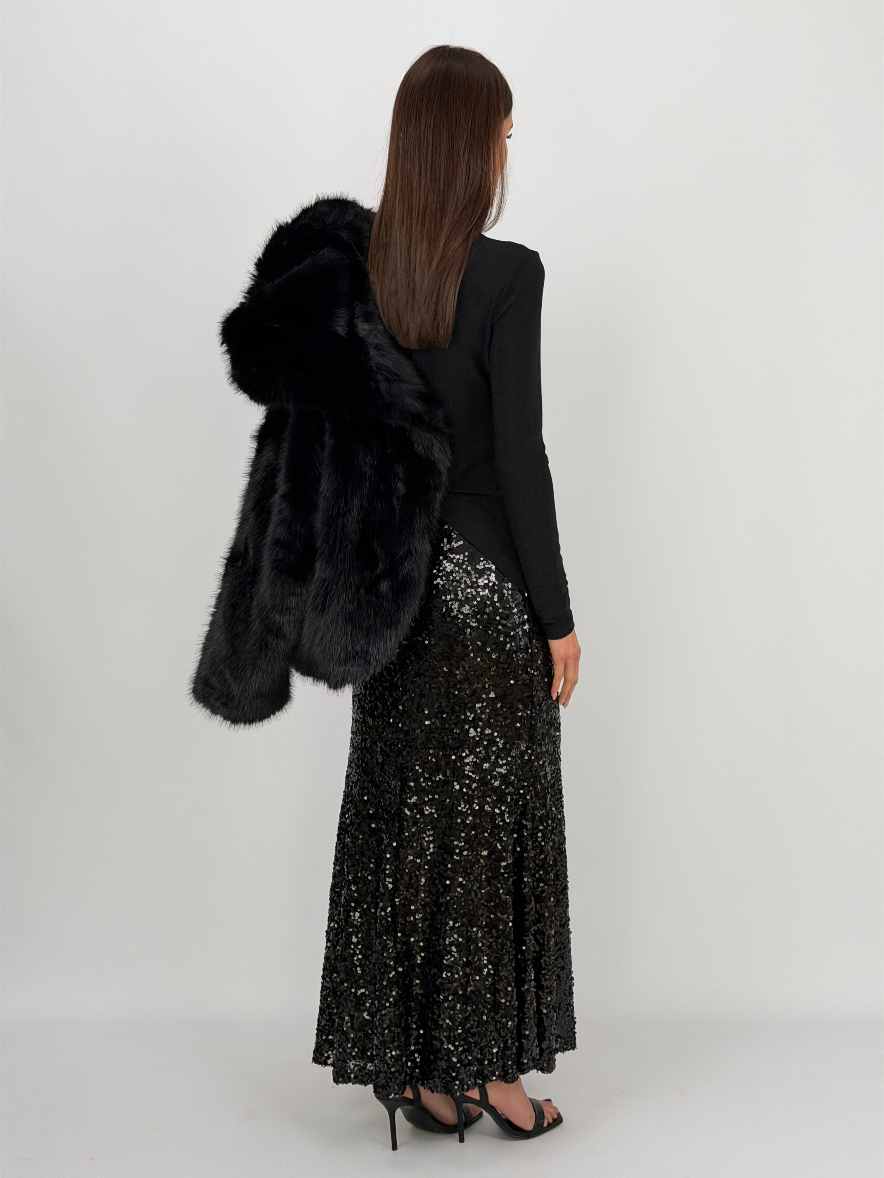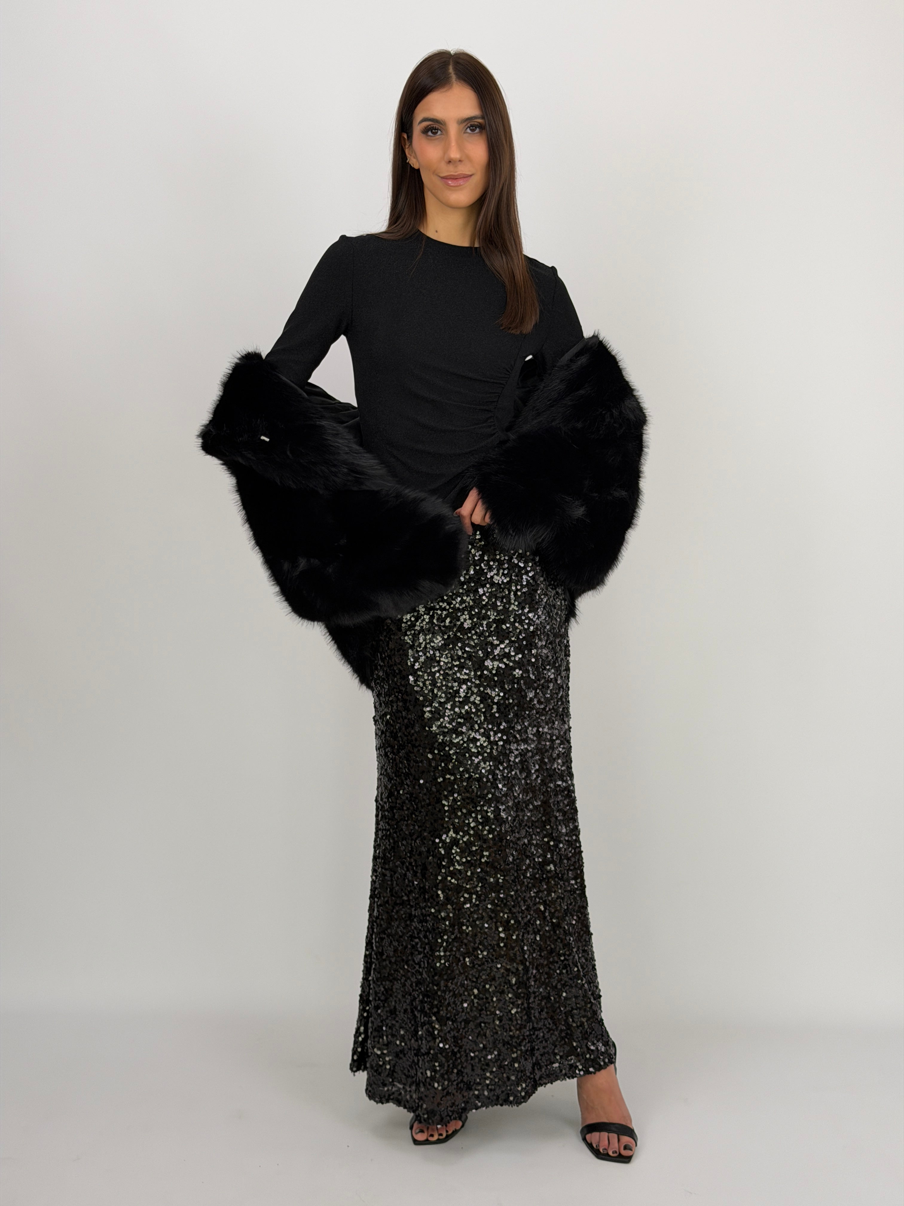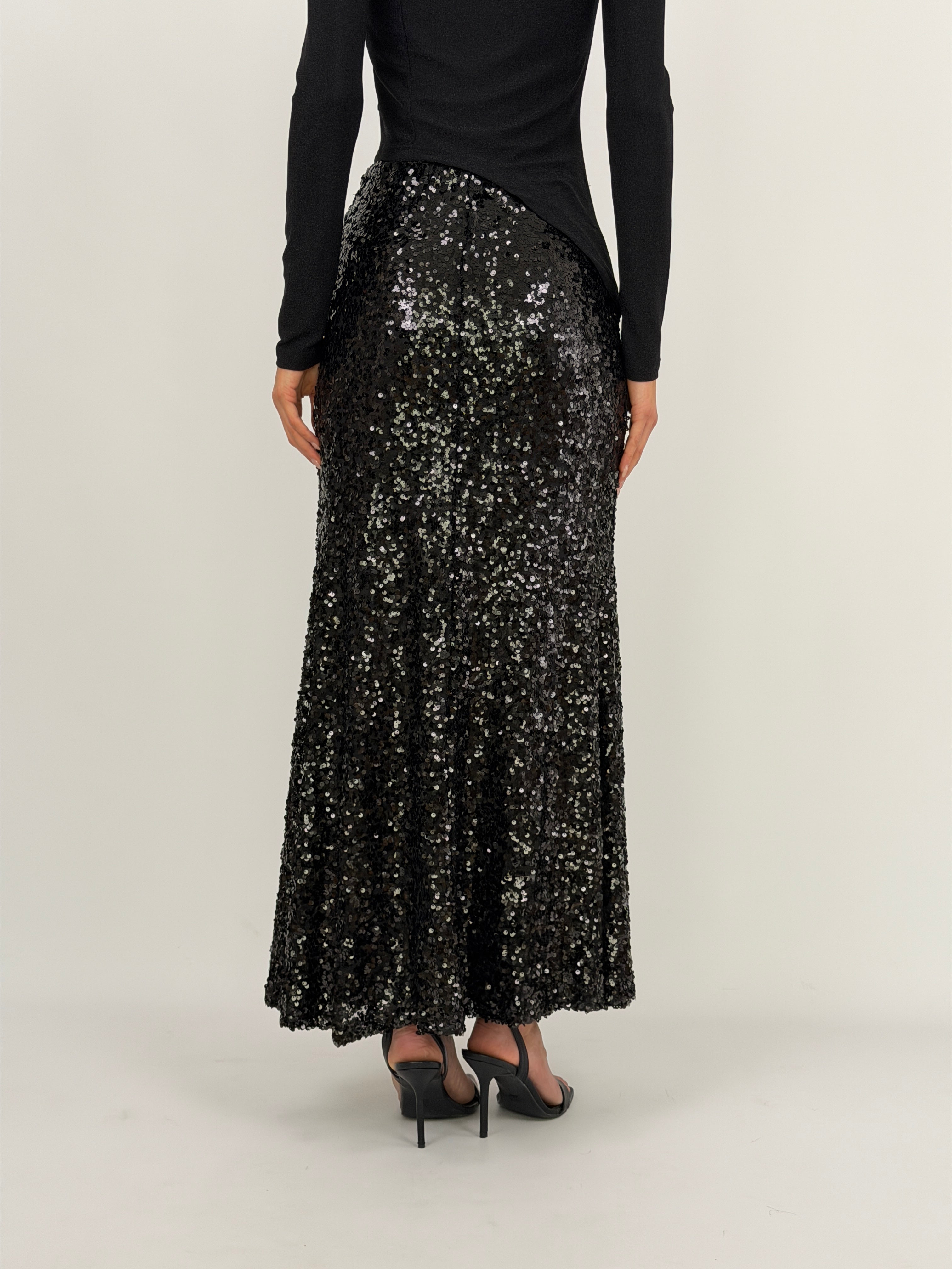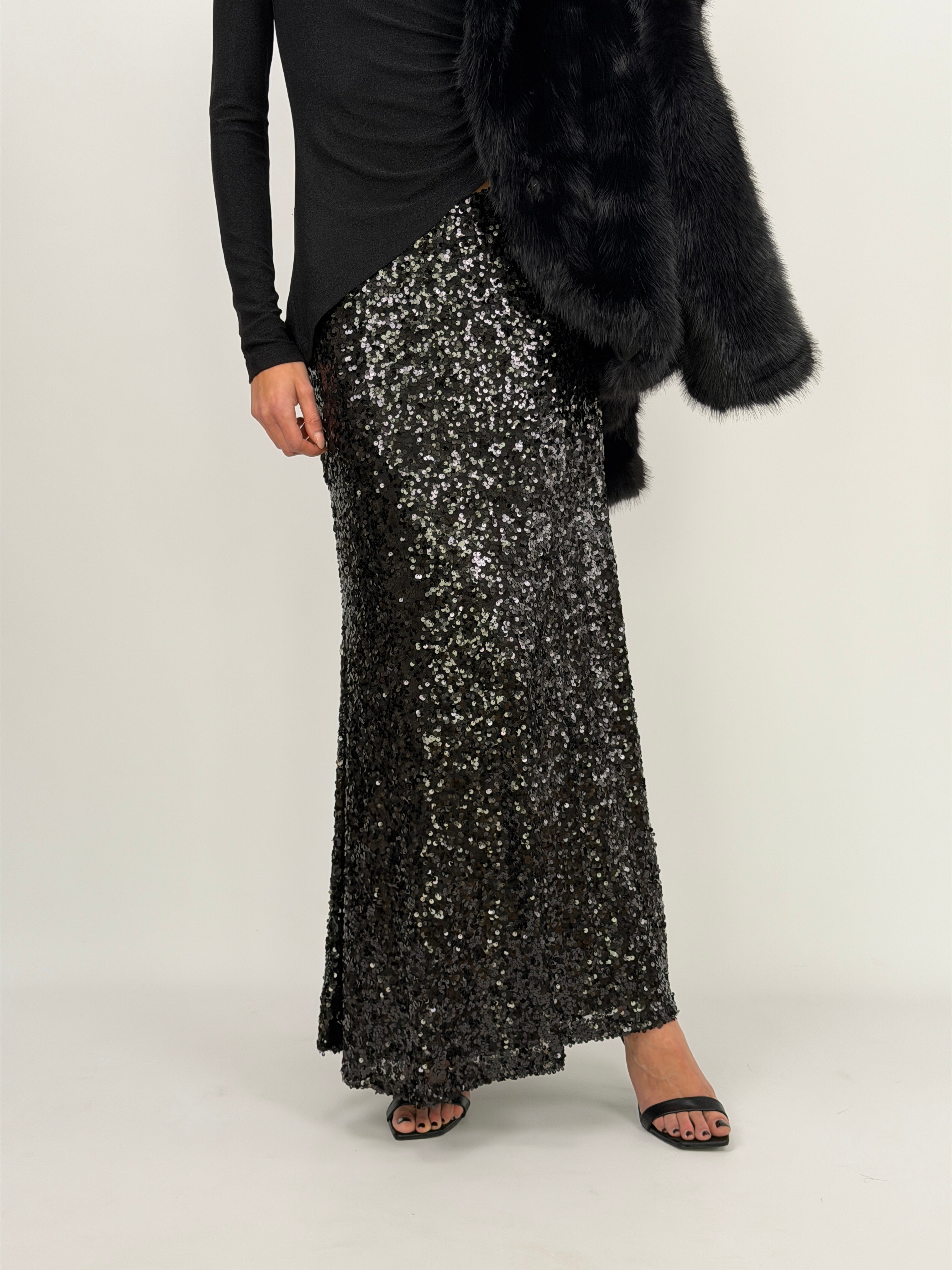 Gonna lunga nera a sirena con applicazione di paillettes tono su tono