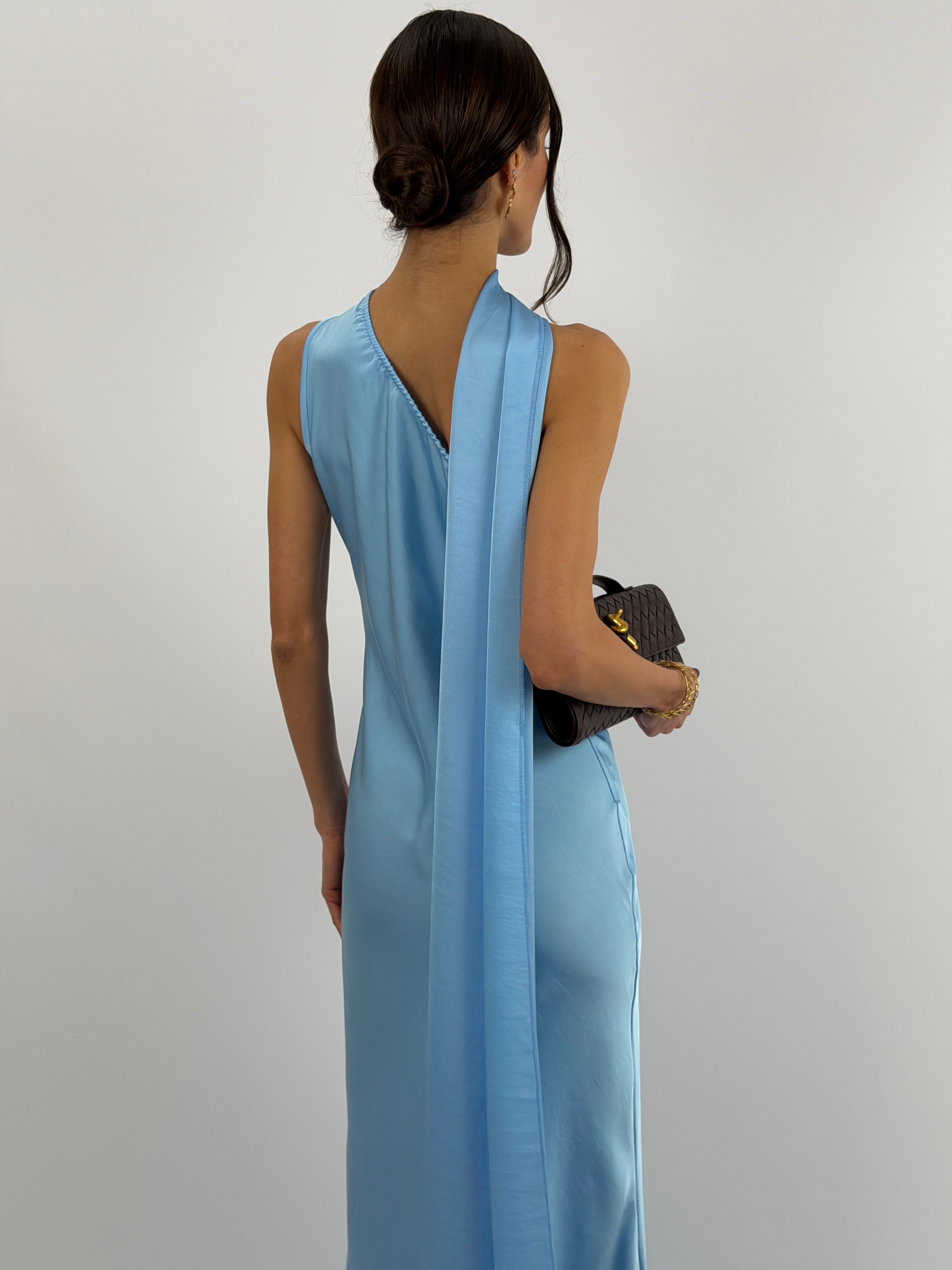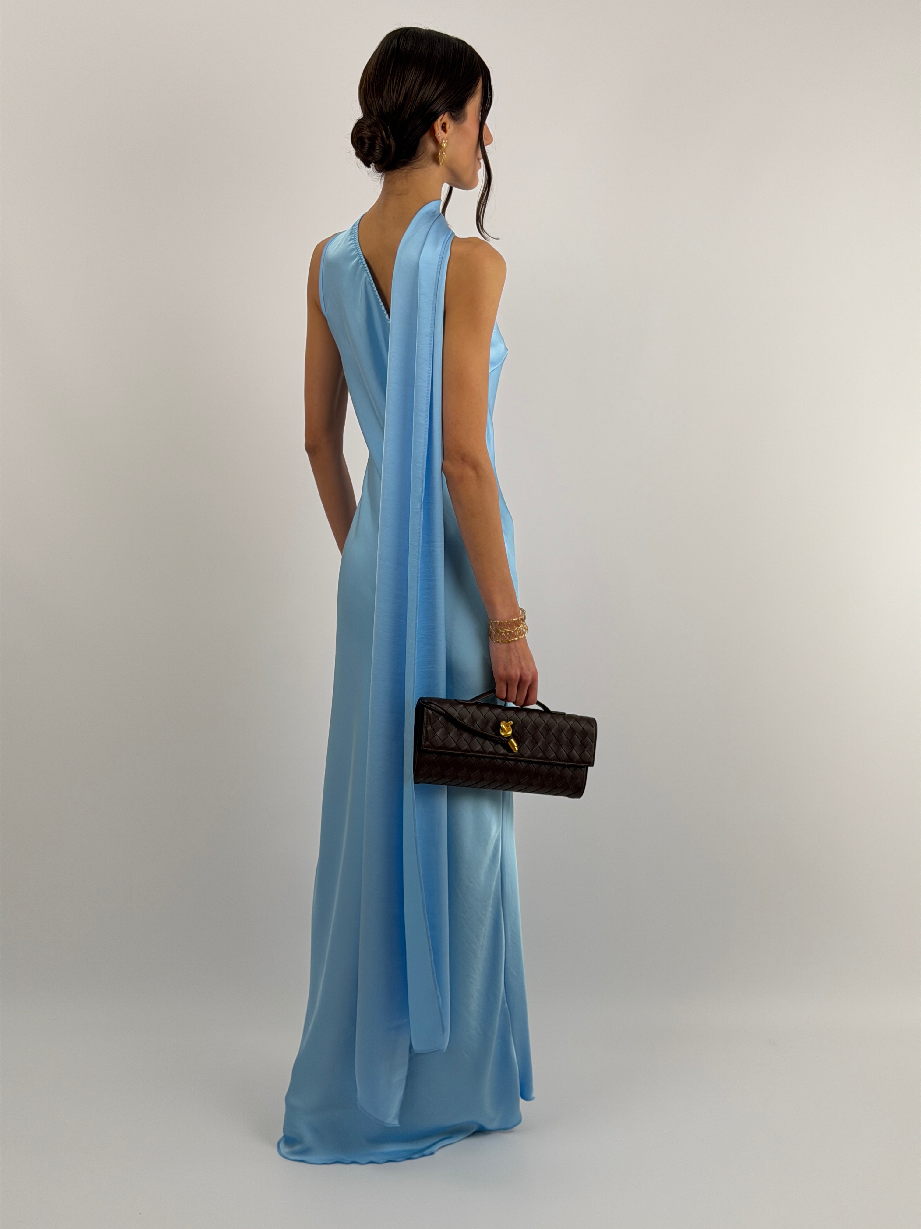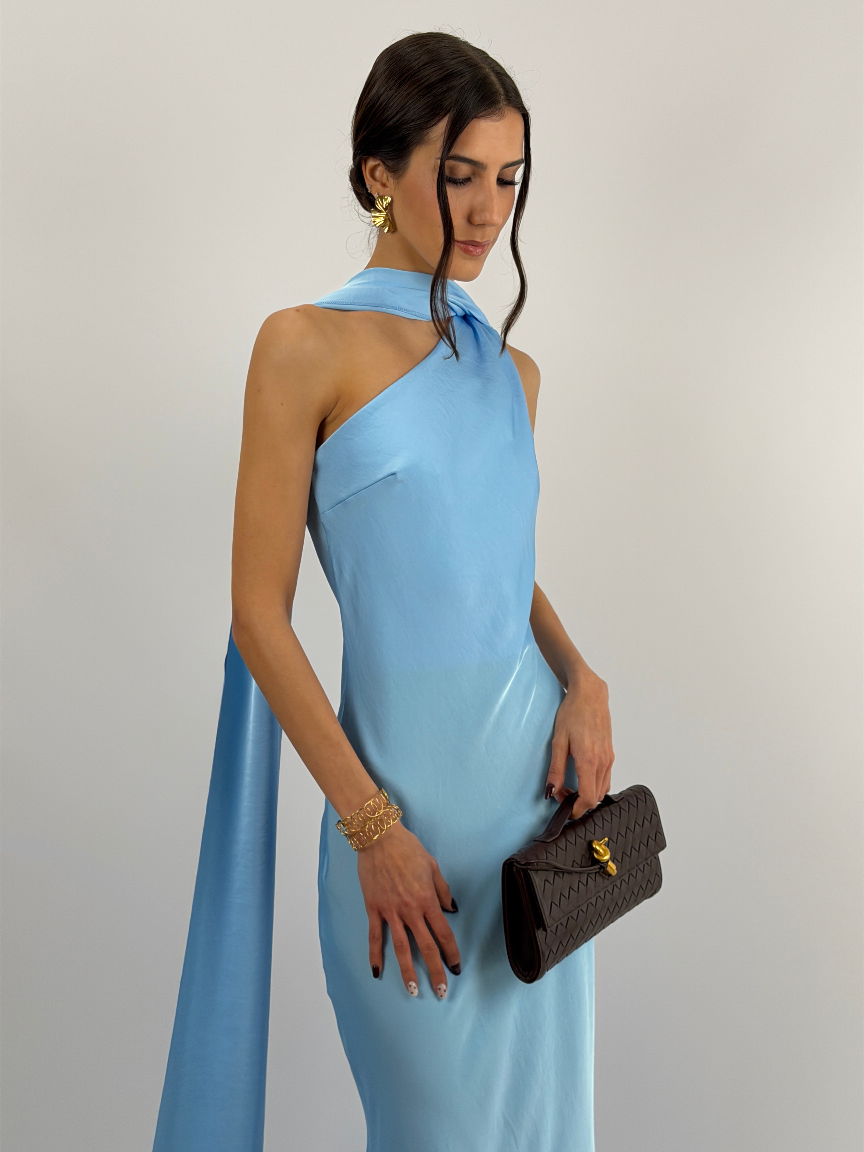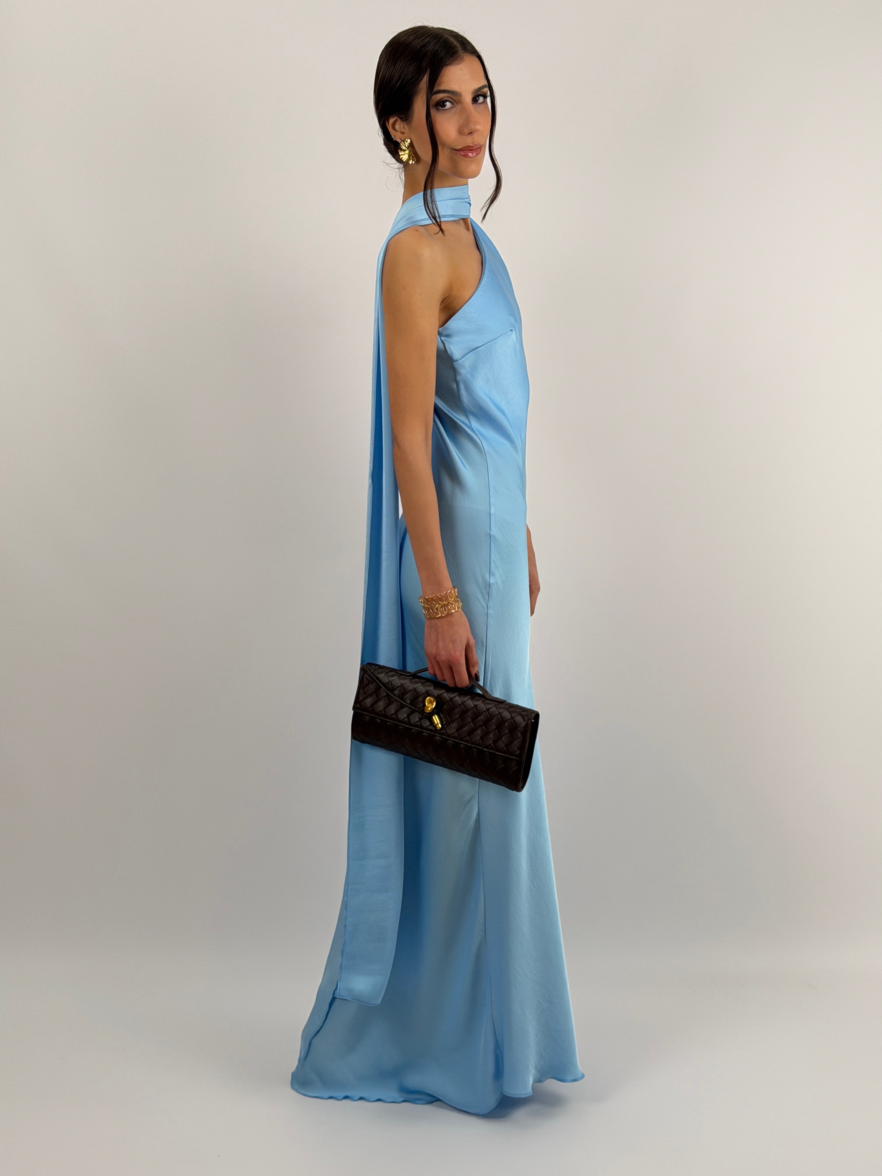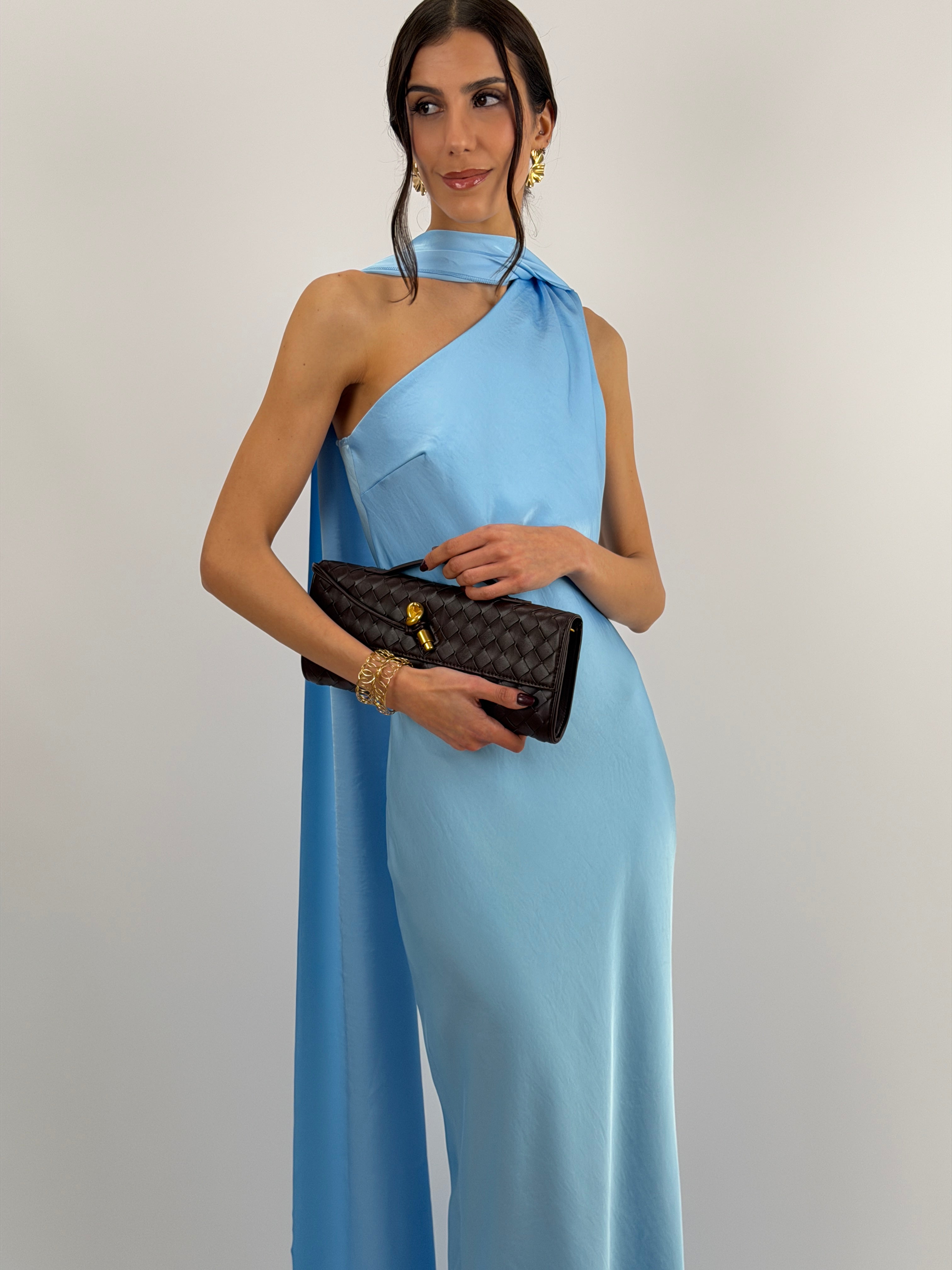 Abito azzurro lungo fluido in tessuto satinato, monospalla con stola incorporata