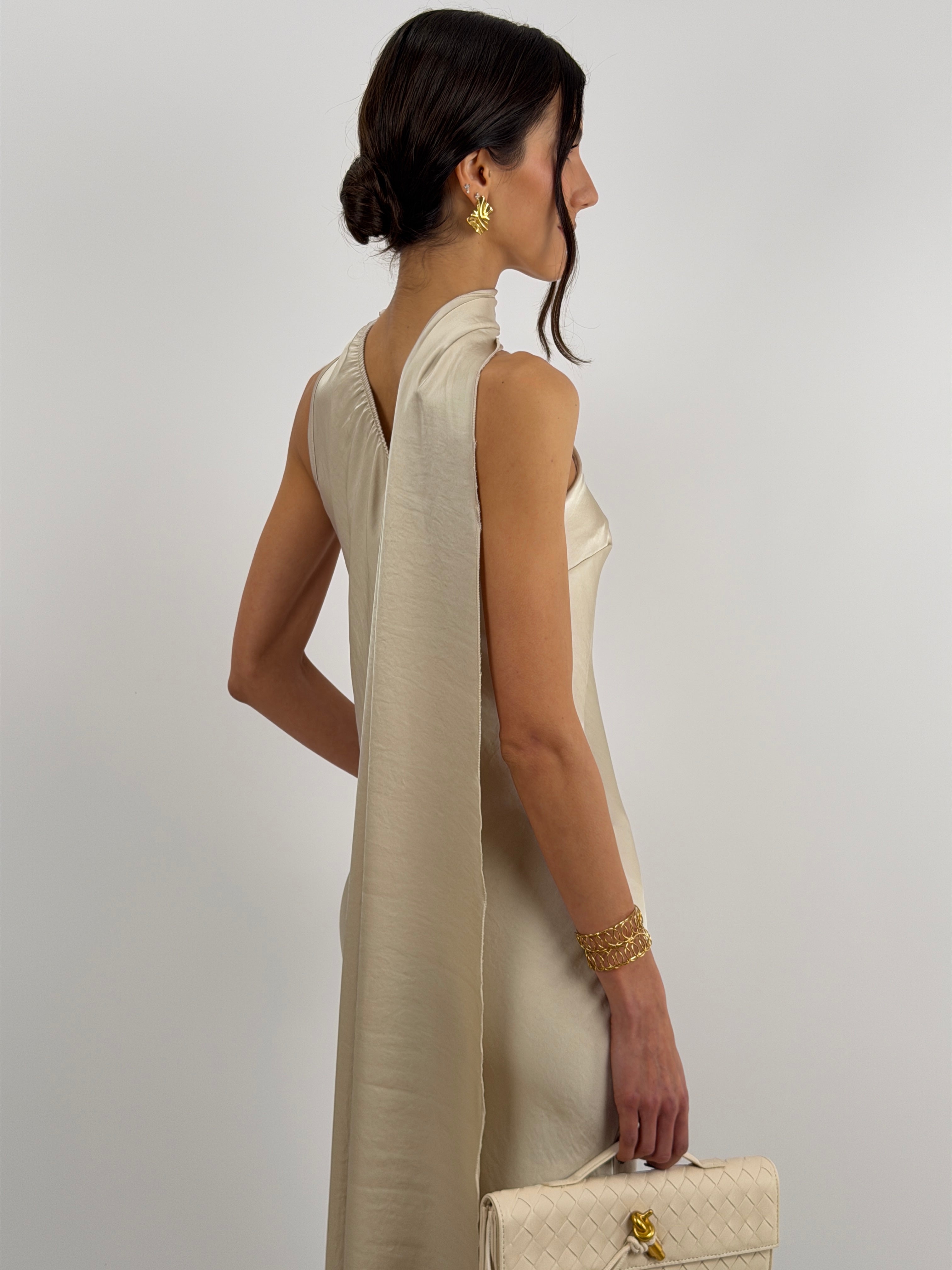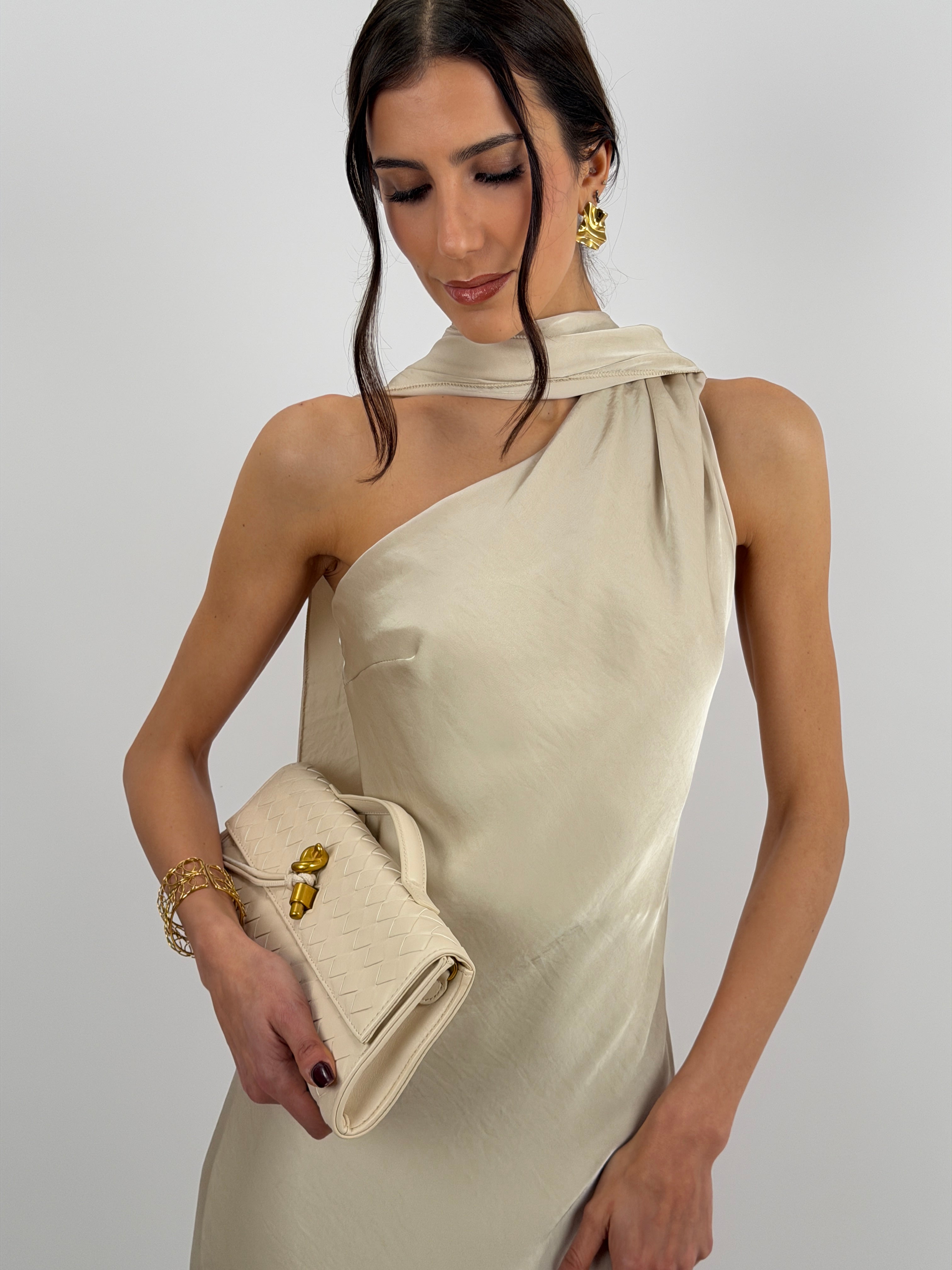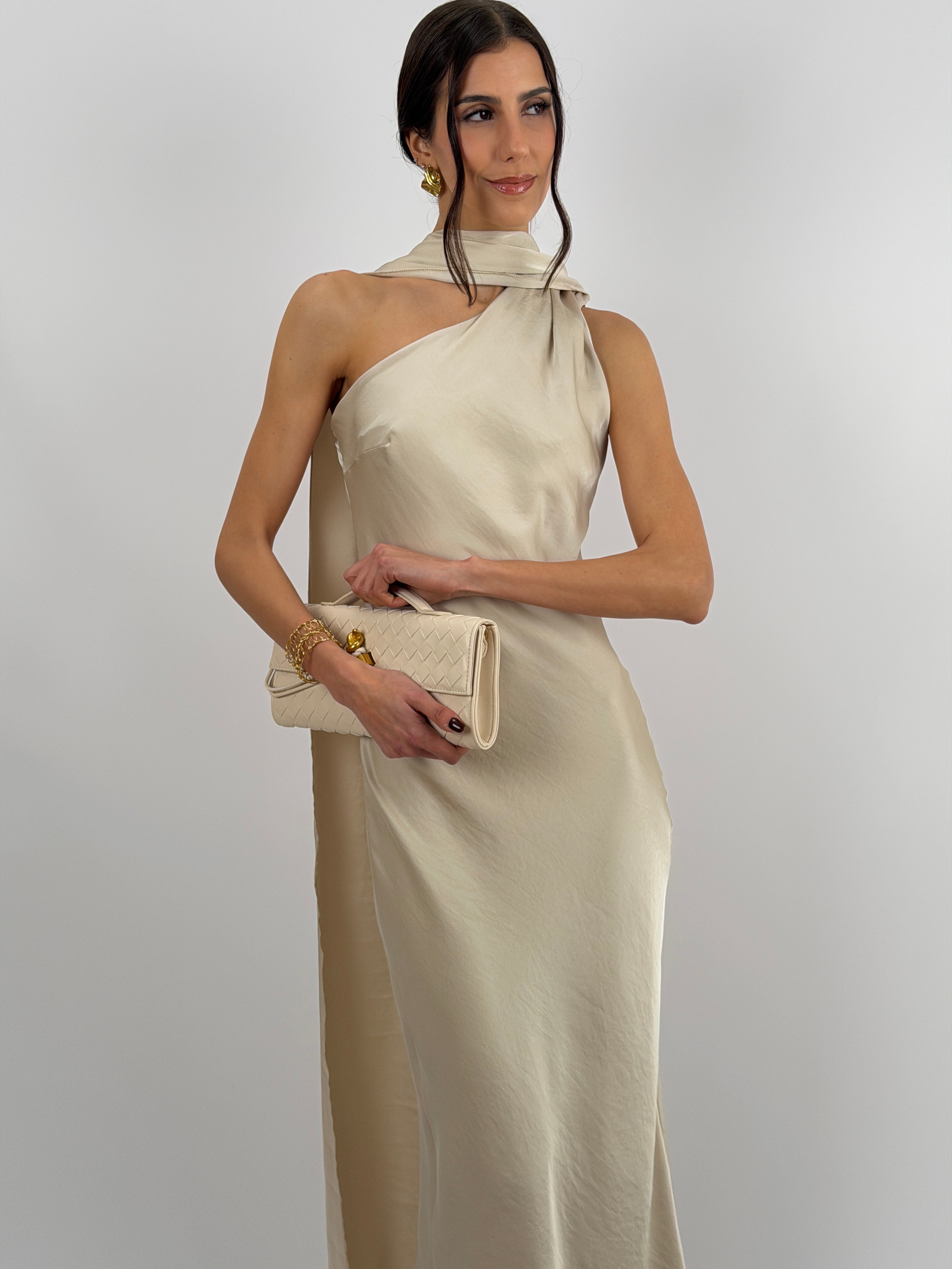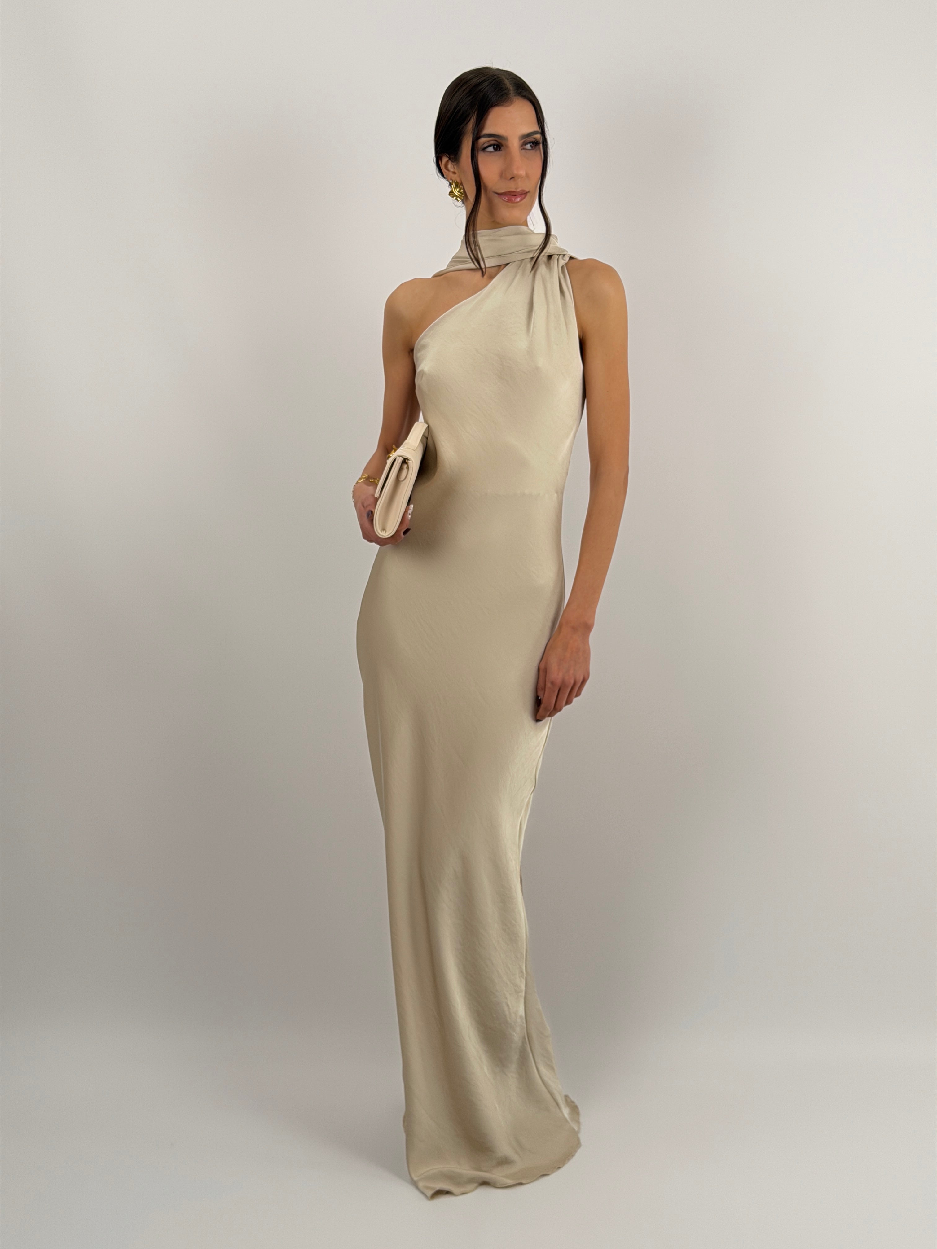 Abito beige lungo fluido in tessuto satinato, monospalla con stola incorporata