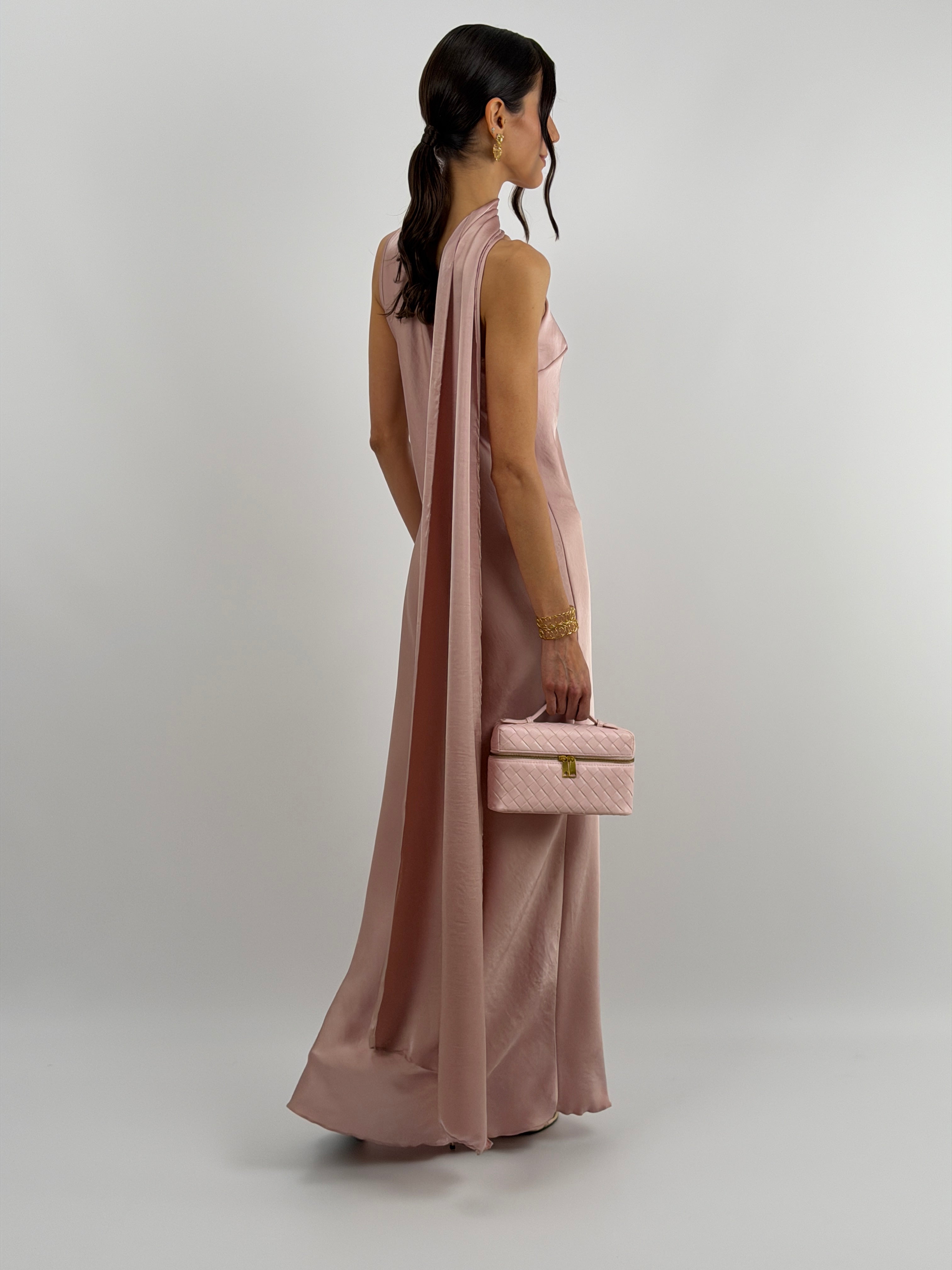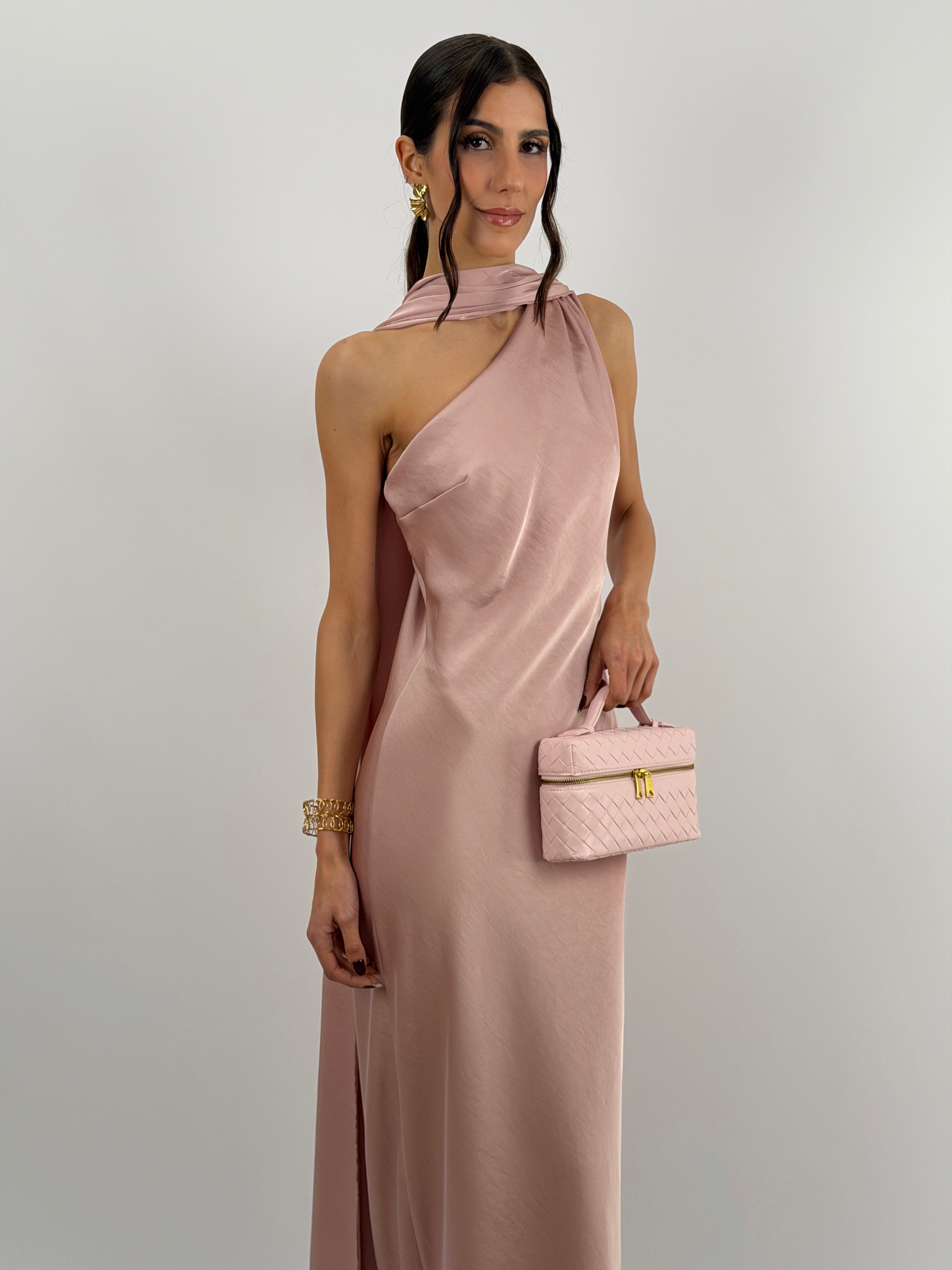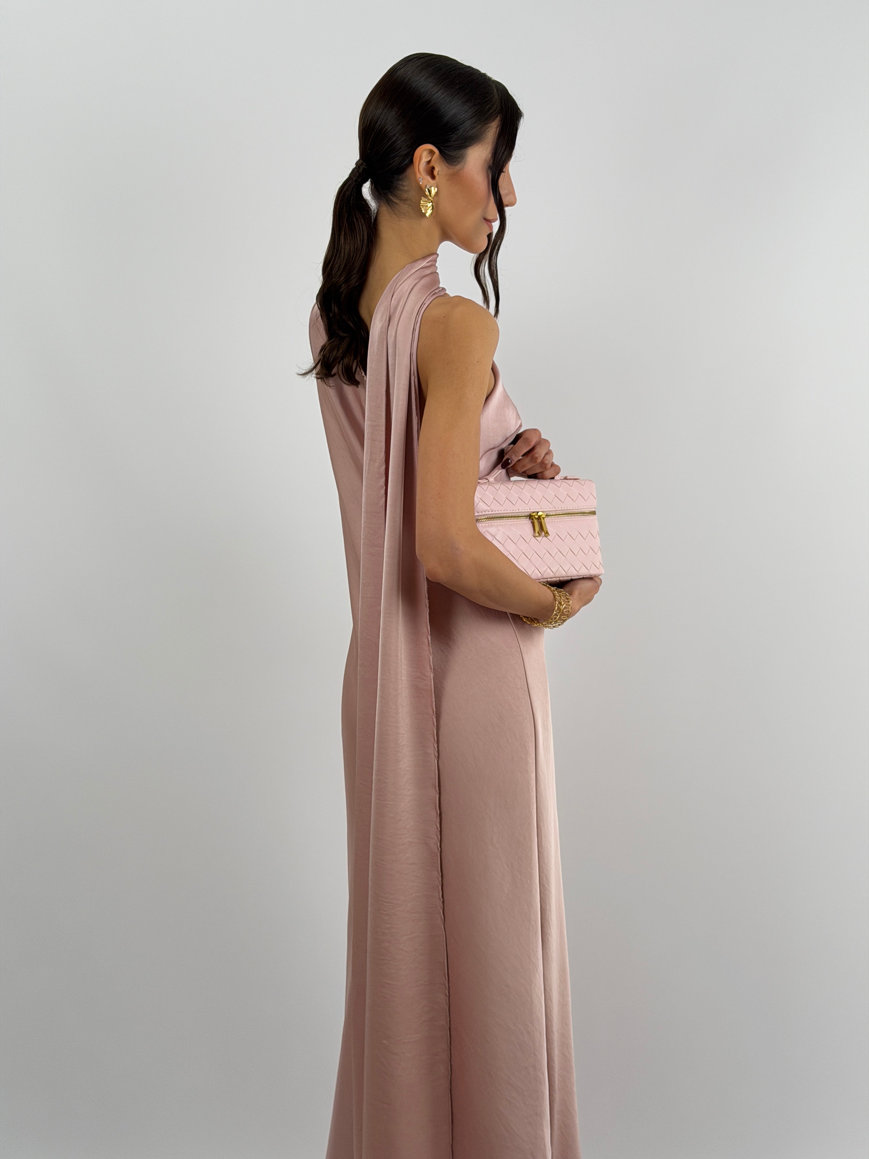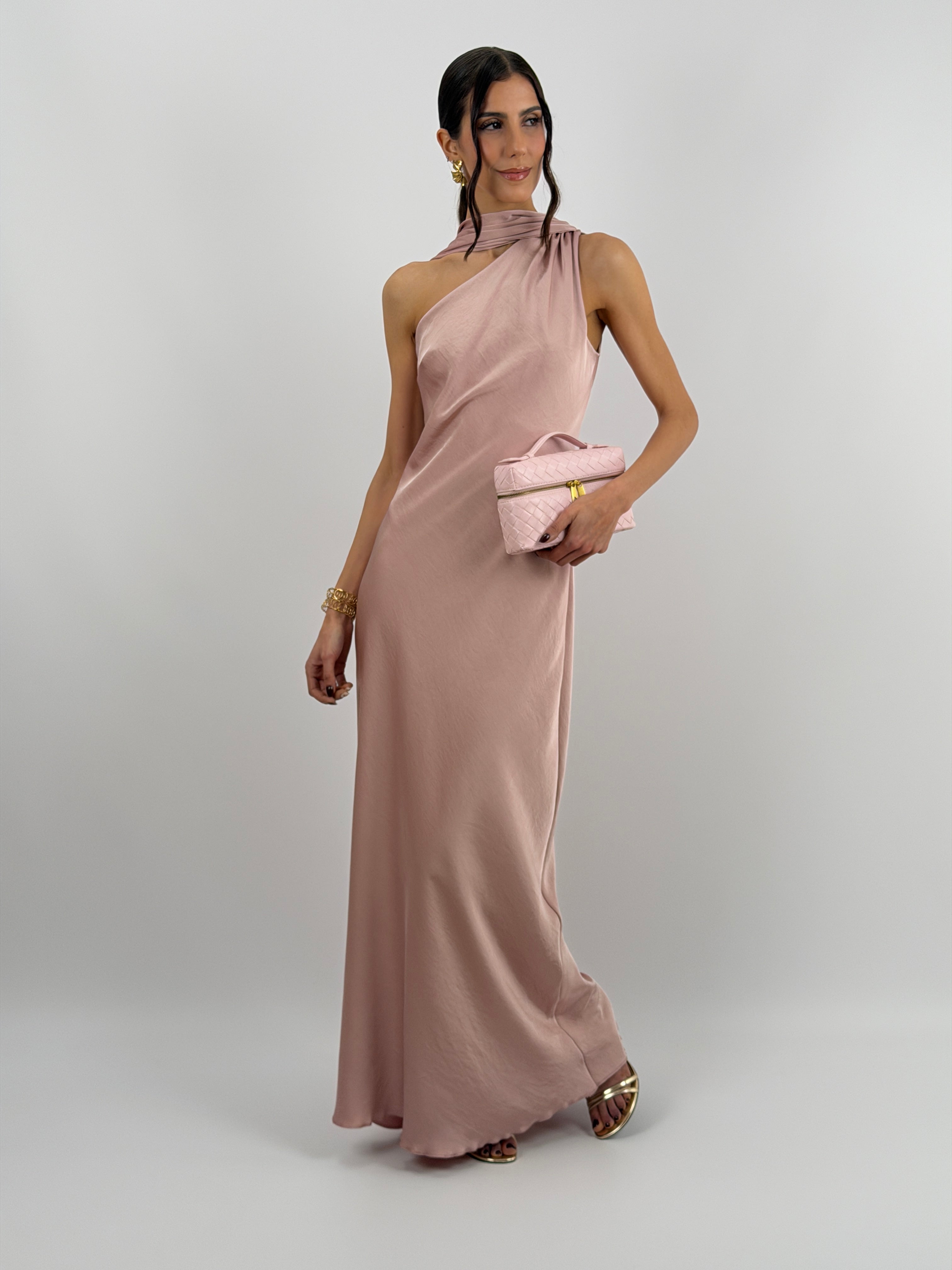 Abito rosa lungo fluido in tessuto satinato, monospalla con stola incorporata