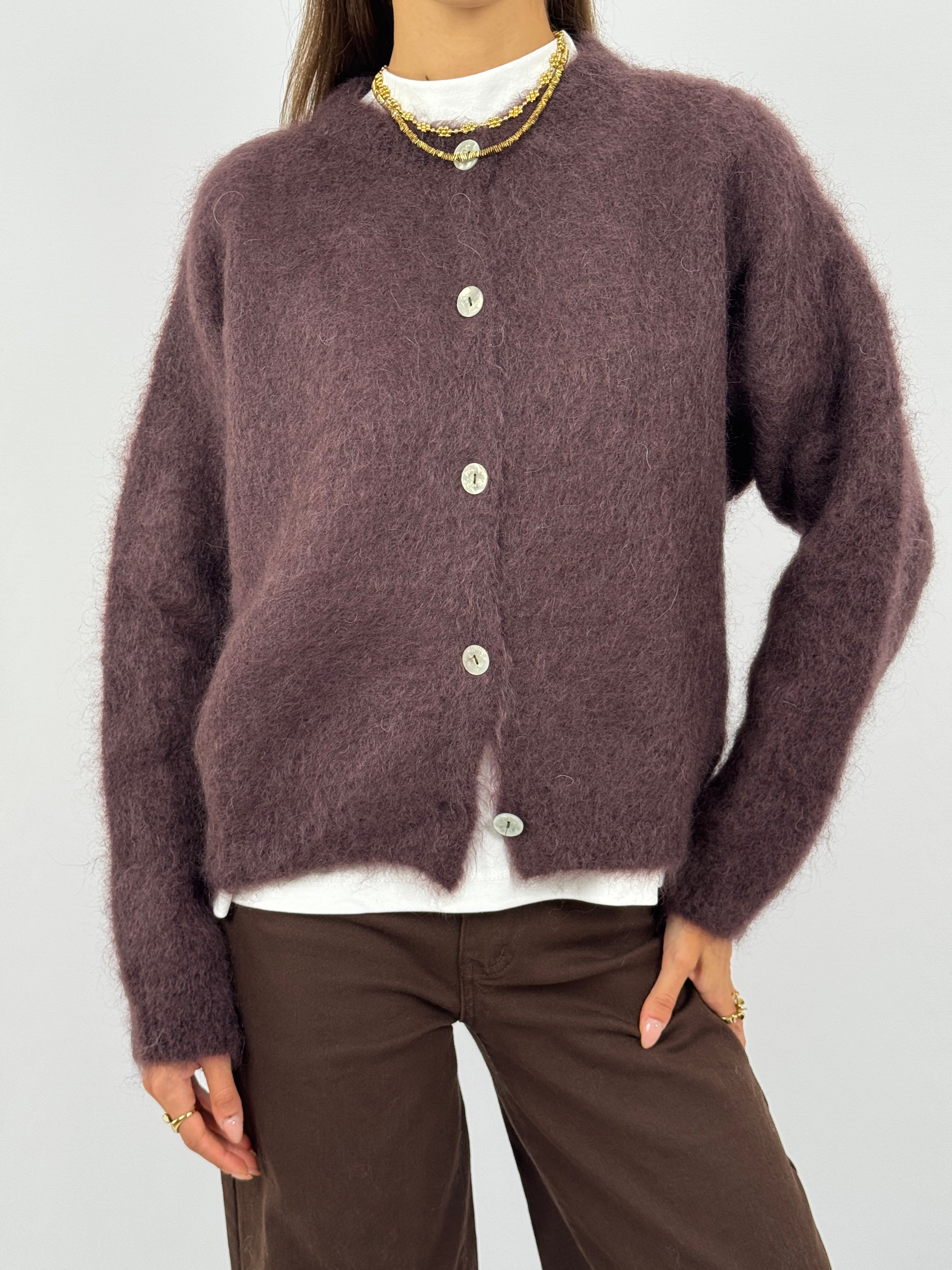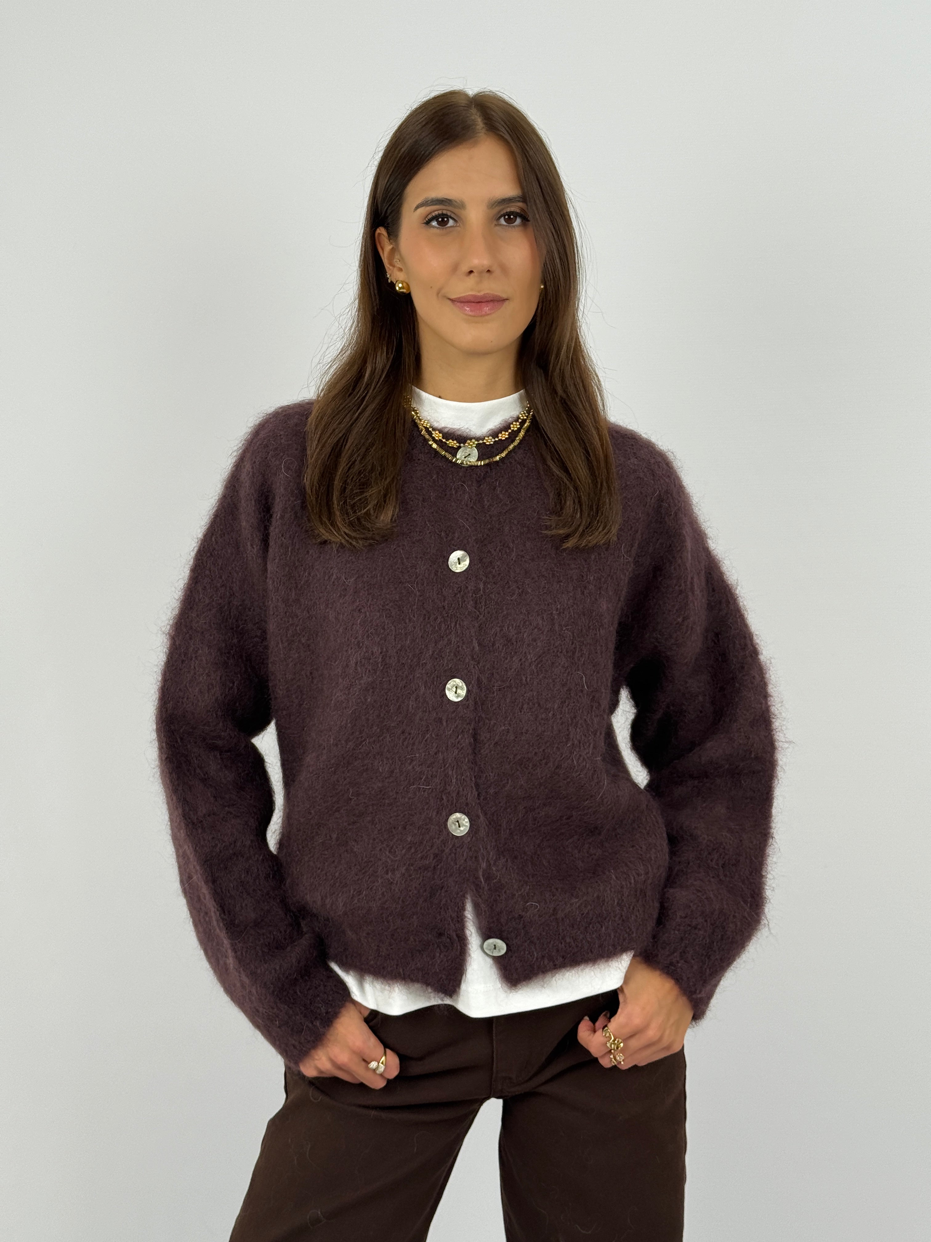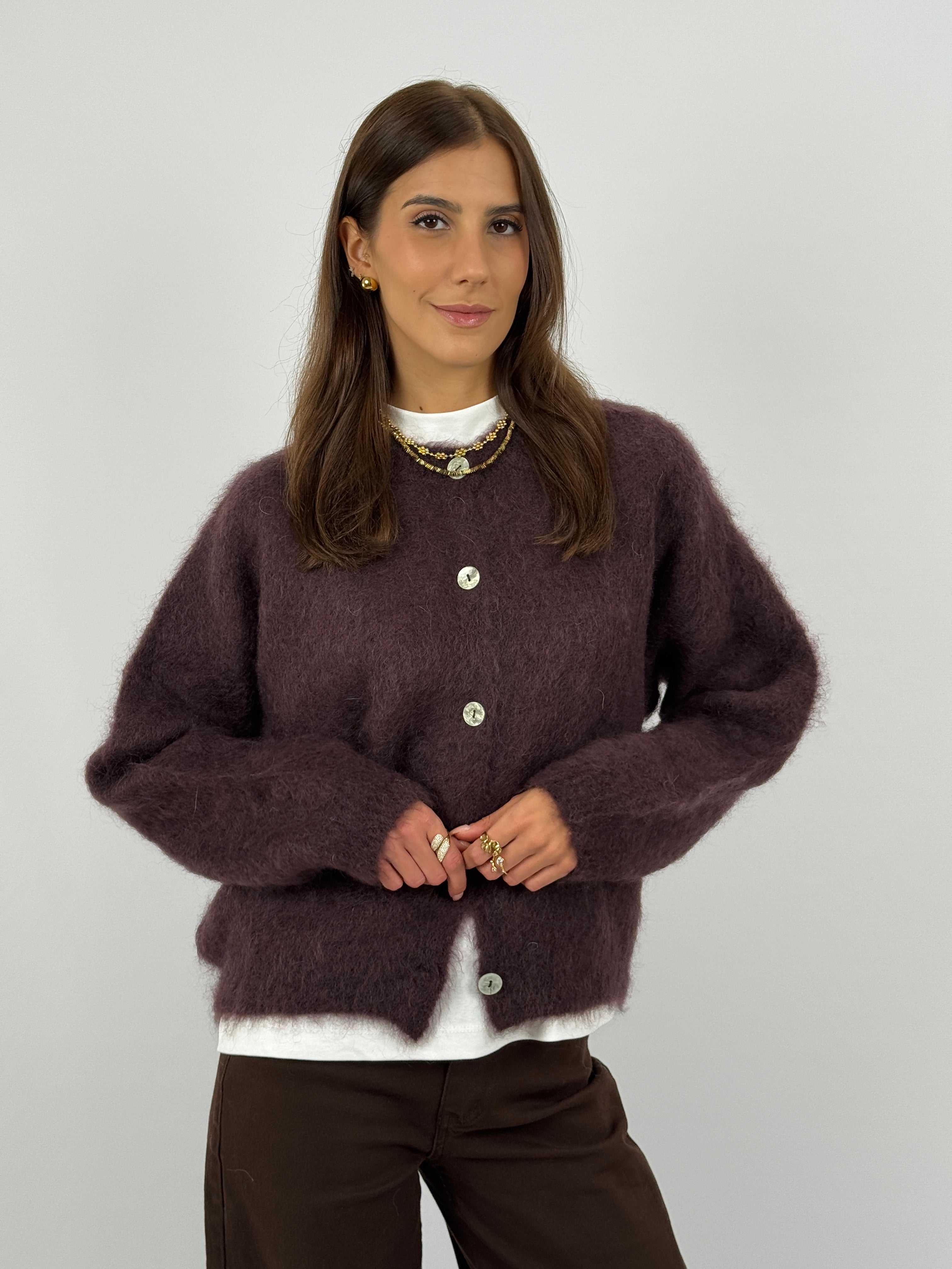 Cardigan morbido marrone in mohair con girocollo, maniche lunghe e chiusura frontale con bottoni. Tessuto soffice e fit confortevole.