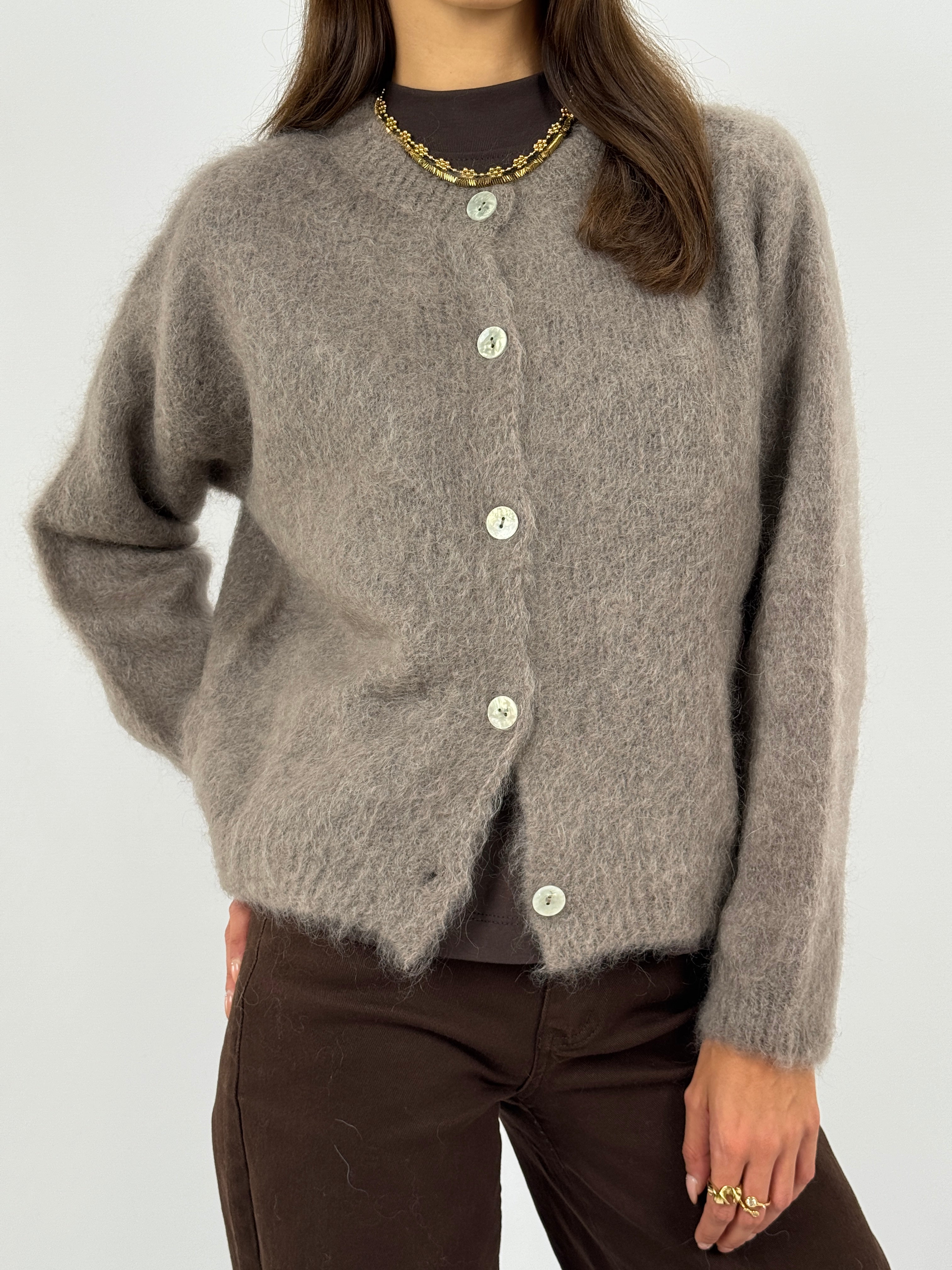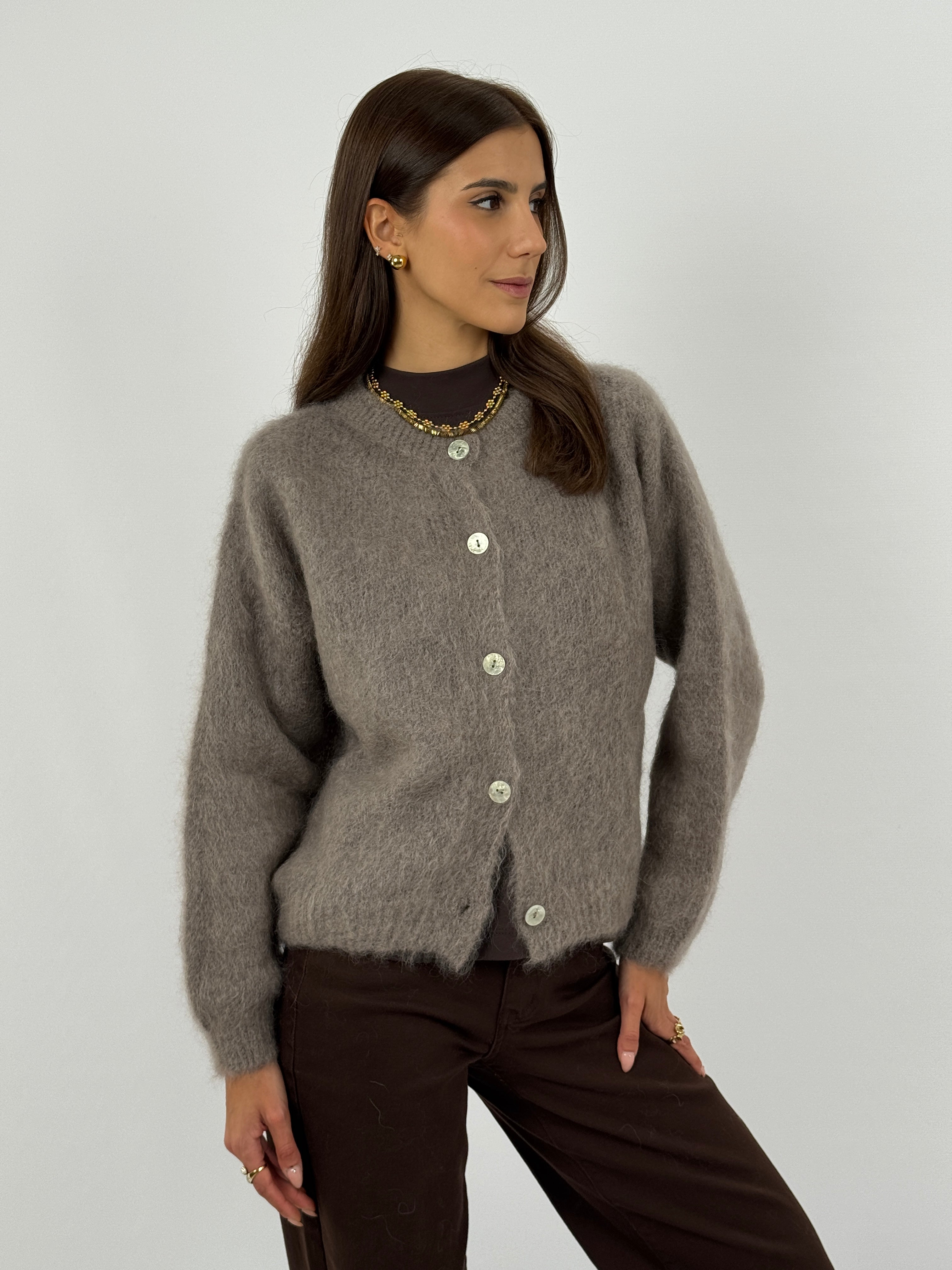 Cardigan morbido color mocha mousse in mohair con girocollo, maniche lunghe e chiusura frontale con bottoni. Tessuto soffice e fit confortevole.