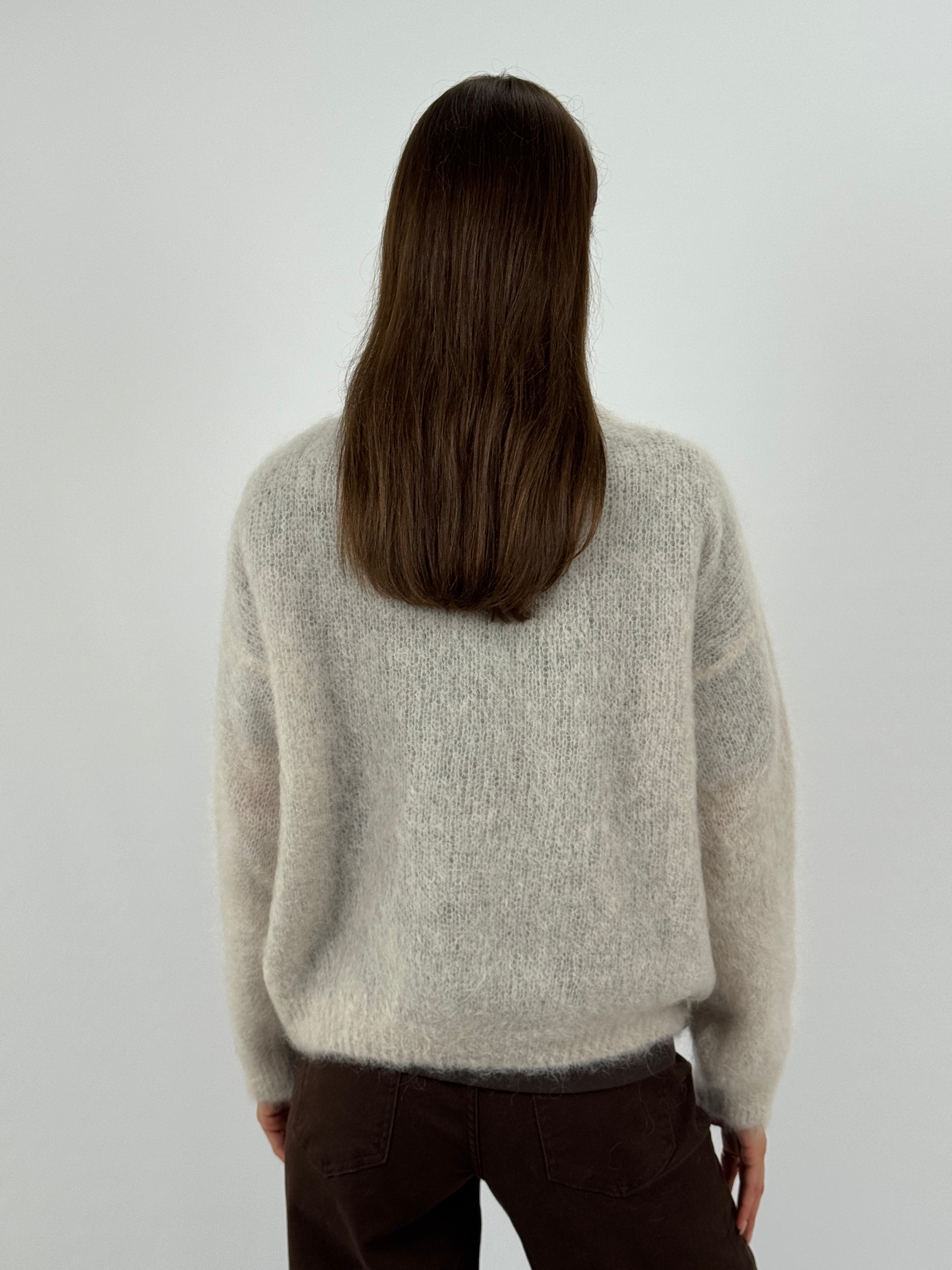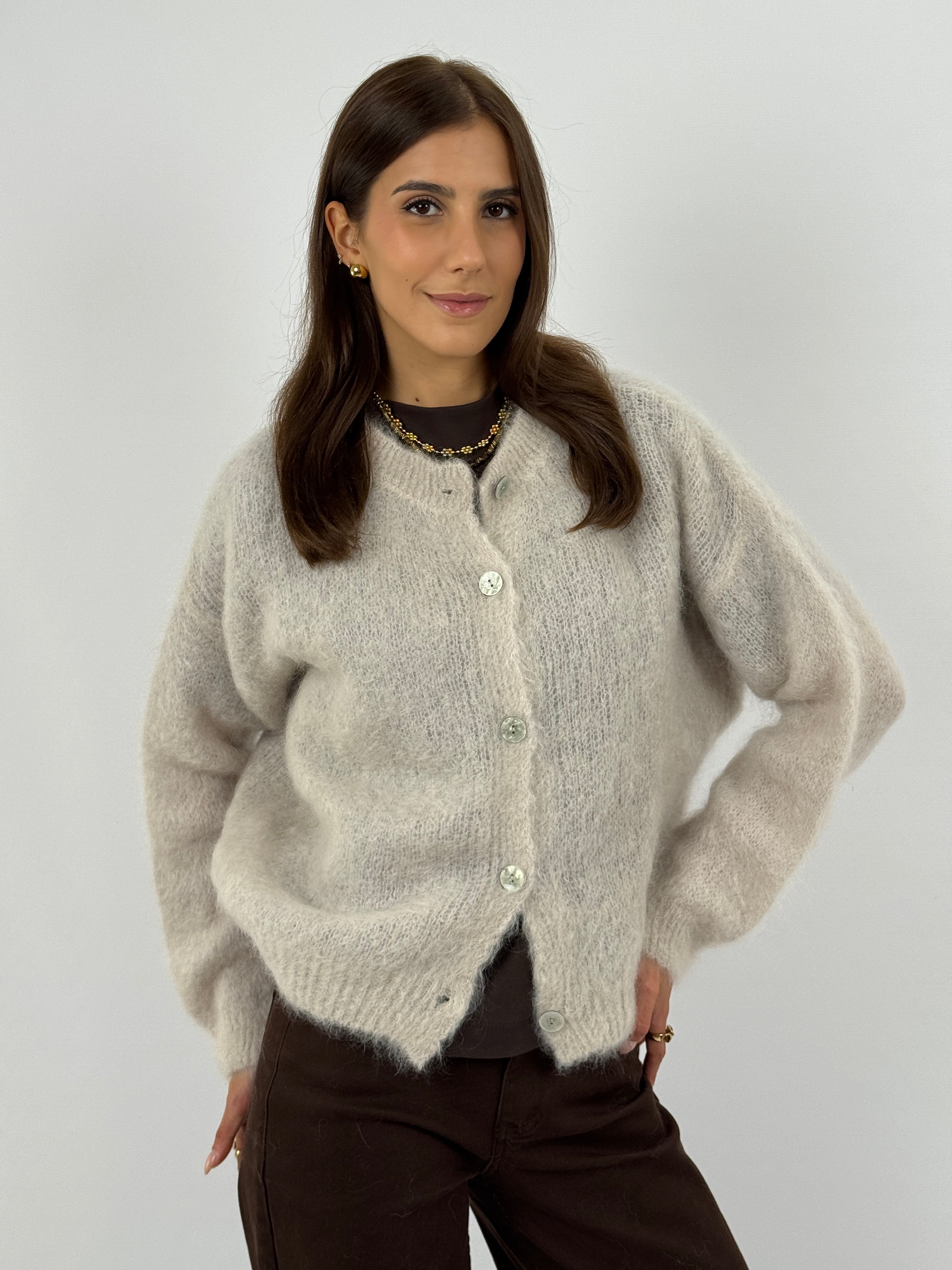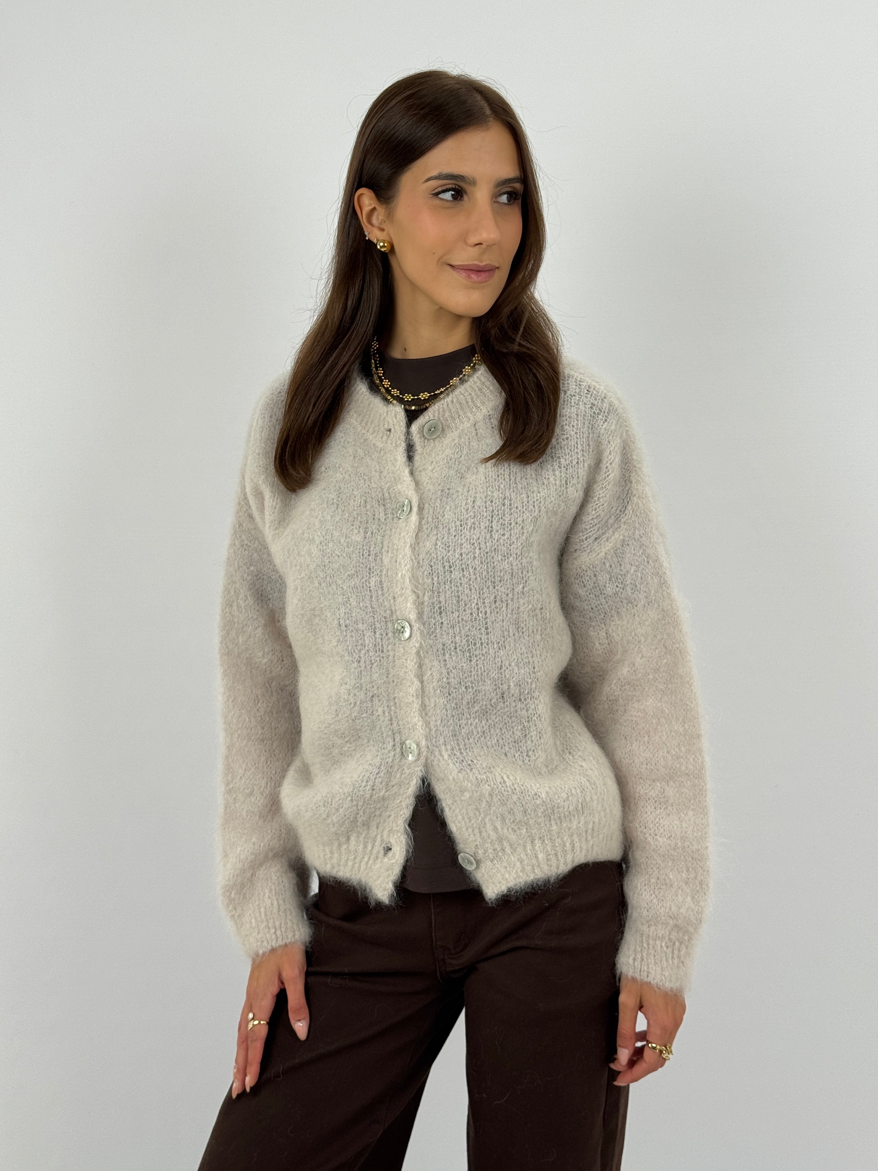 Cardigan morbido color sabbia in mohair con girocollo, maniche lunghe e chiusura frontale con bottoni. Tessuto soffice e fit confortevole.