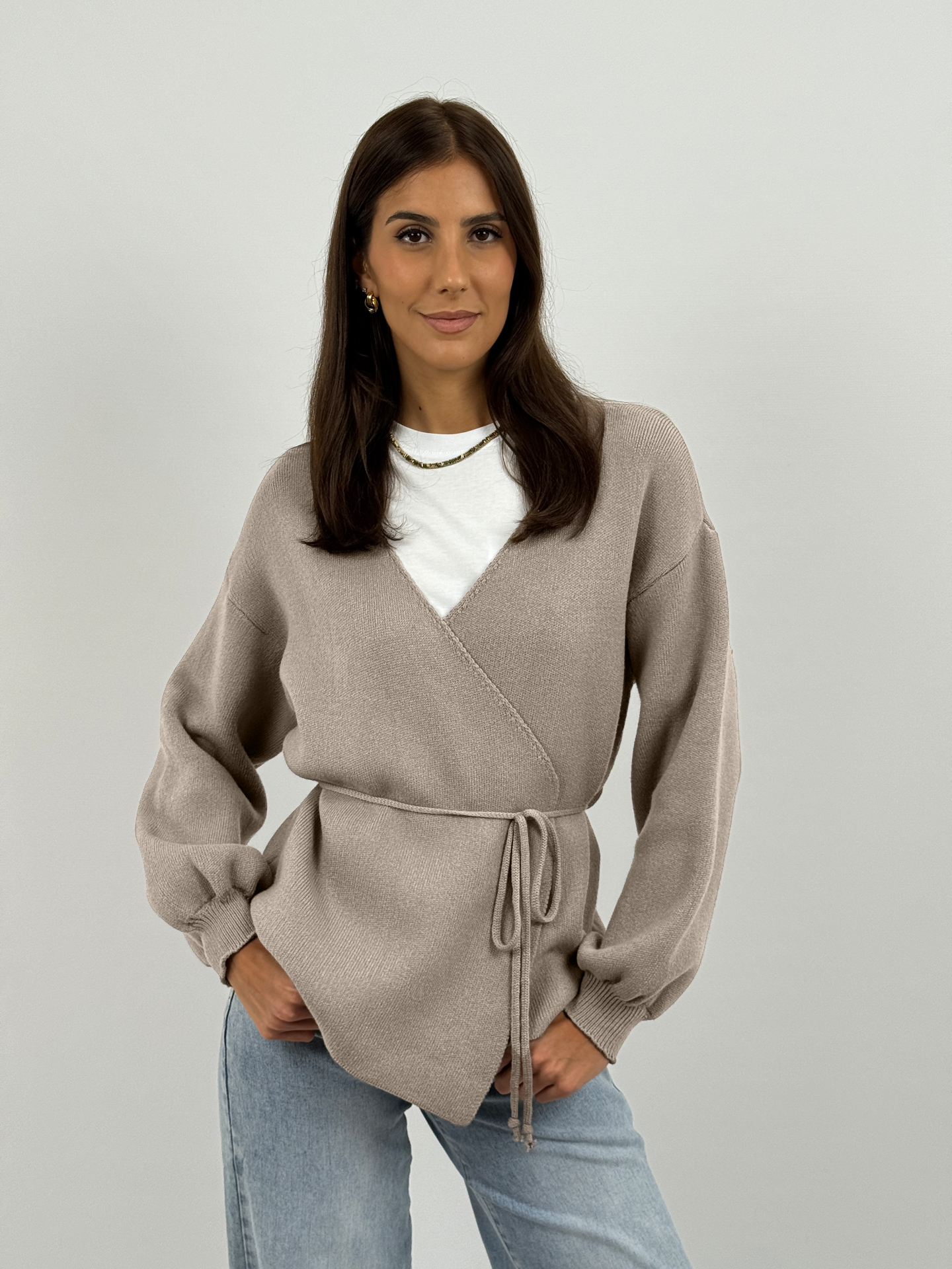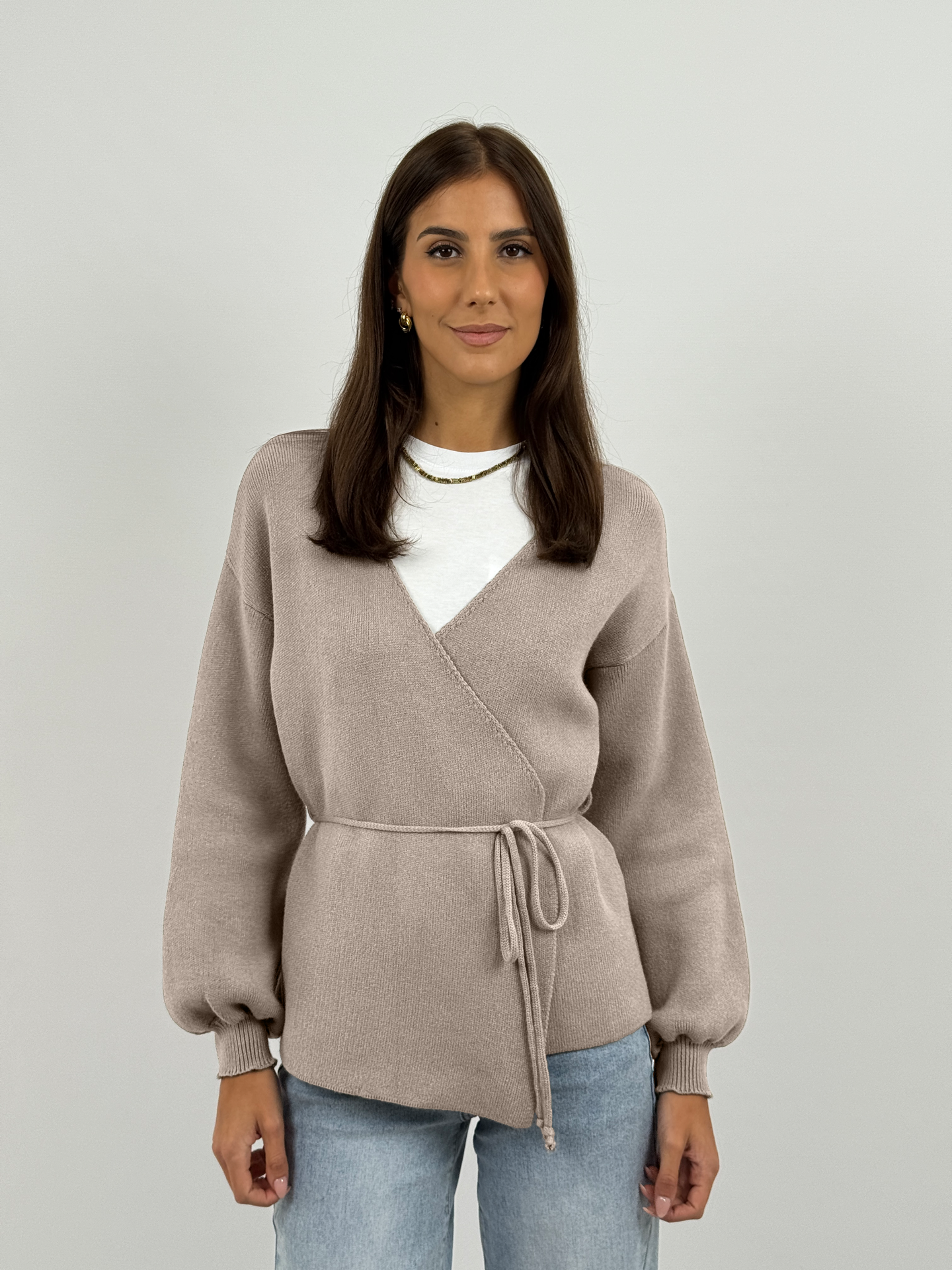 Cardigan sabbia incrociato con chiusura a laccetti interni ed esterni. Scollo a V, maniche lunghe e fit versatile. Perfetto per un look casual-chic, ideale per ogni occasione.