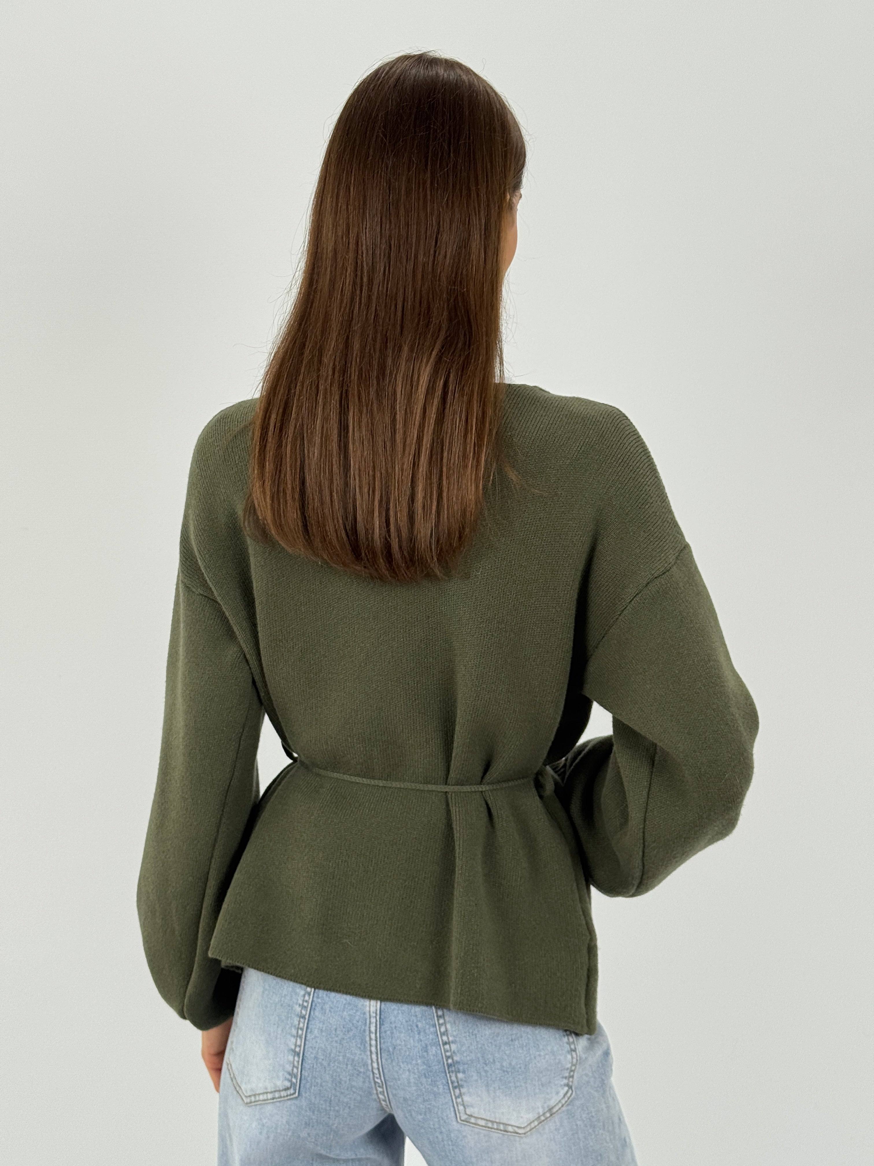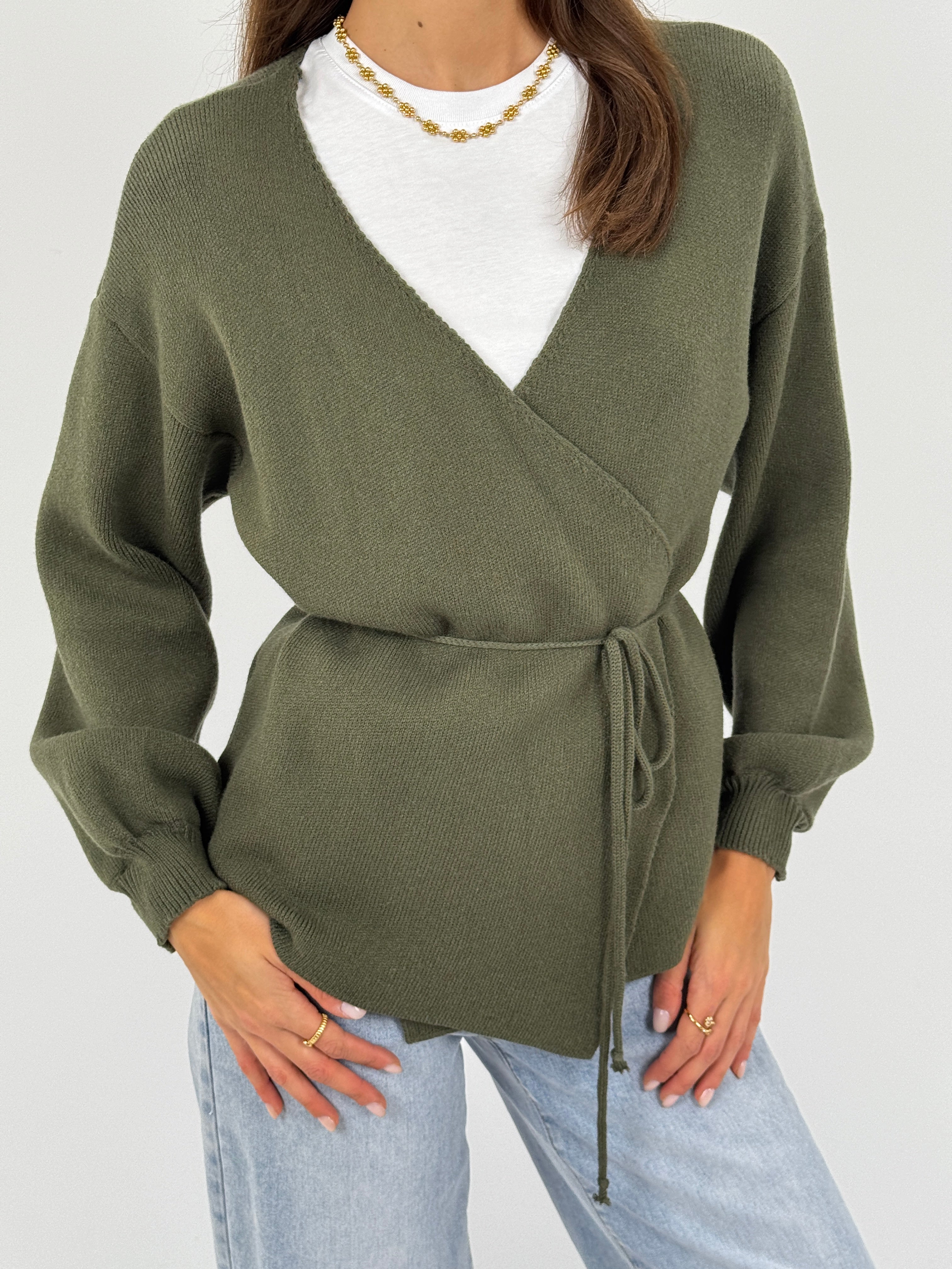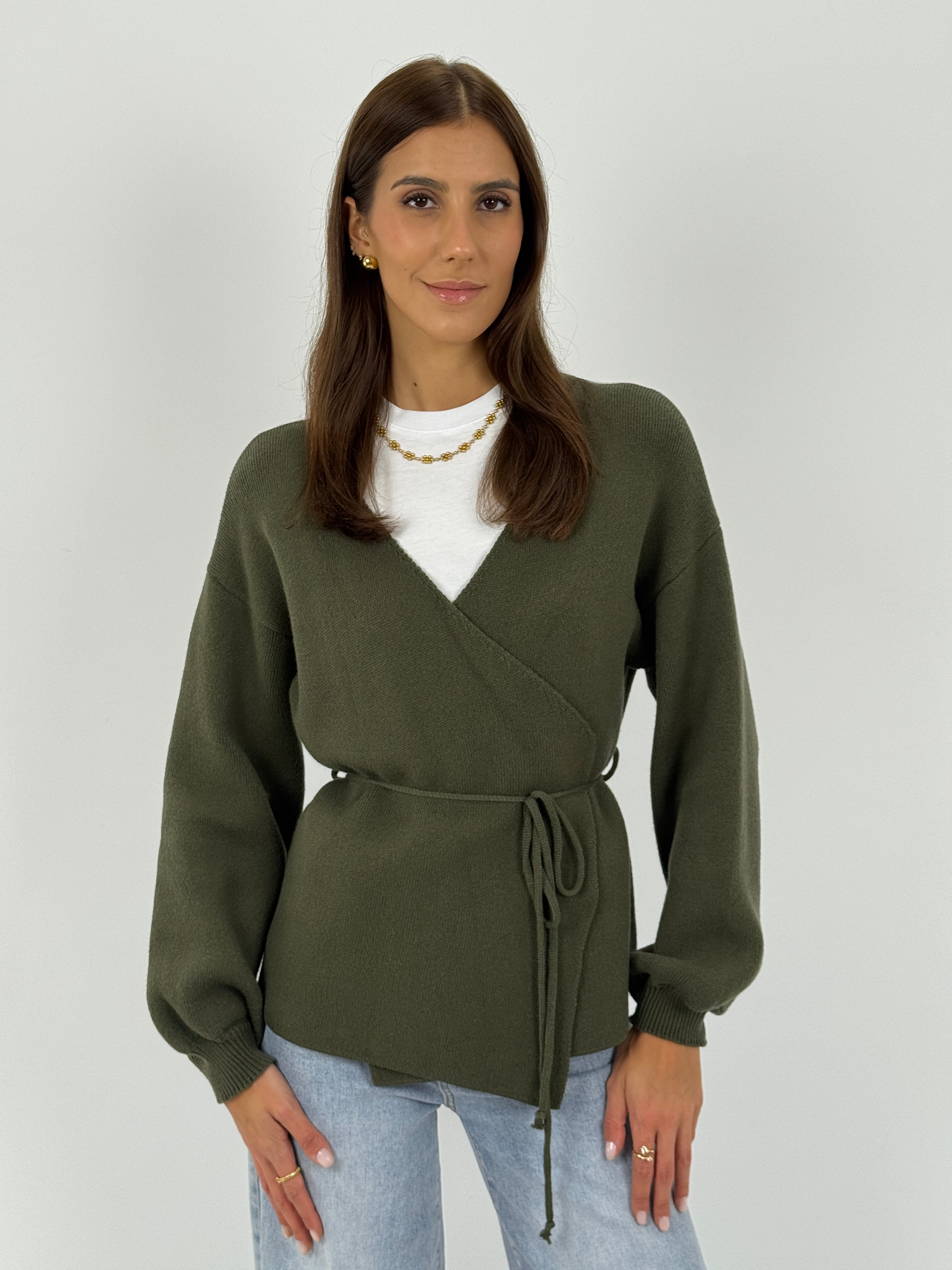 Cardigan verde incrociato con chiusura a laccetti interni ed esterni. Scollo a V, maniche lunghe e fit versatile. Perfetto per un look casual-chic, ideale per ogni occasione.