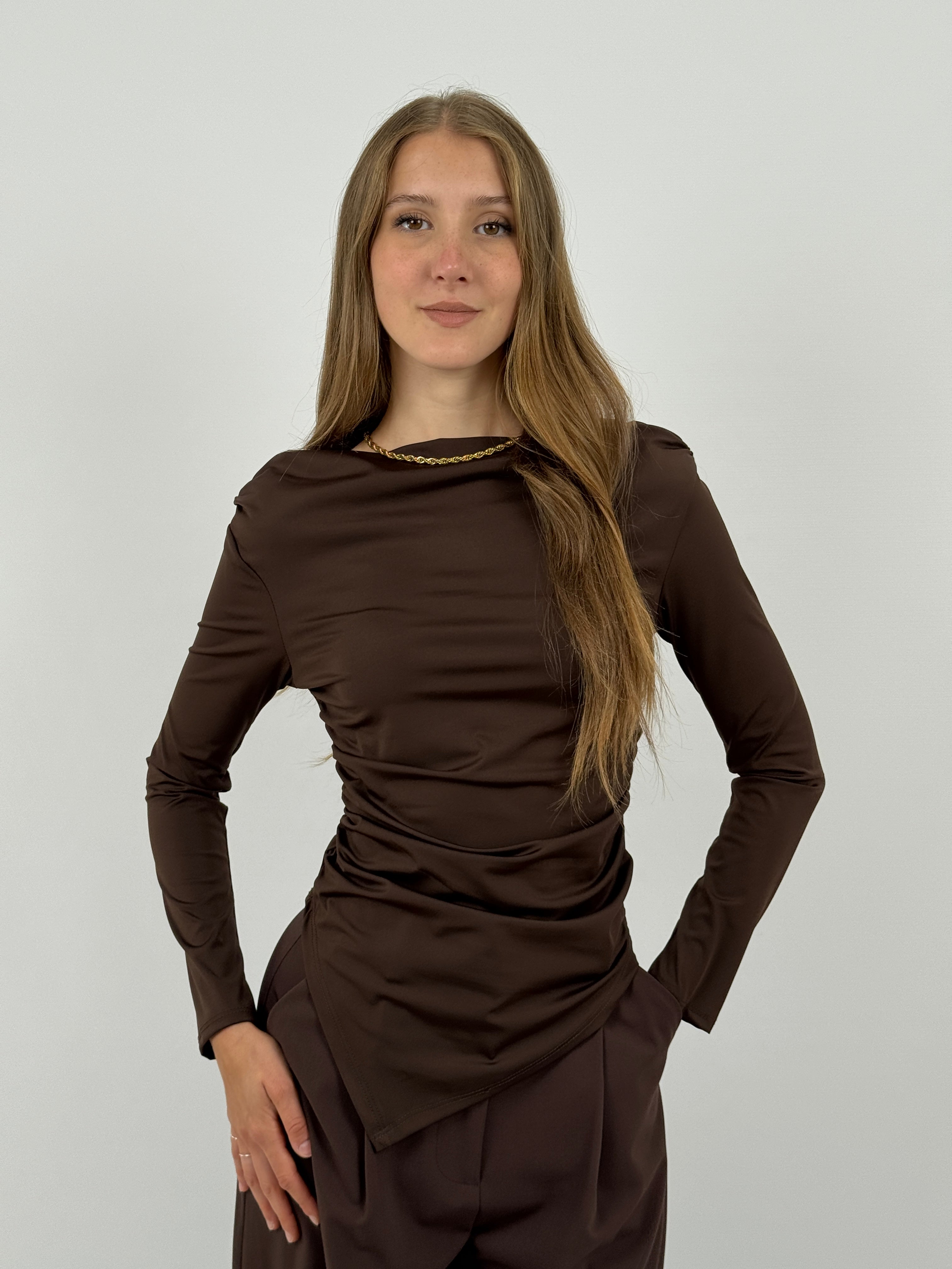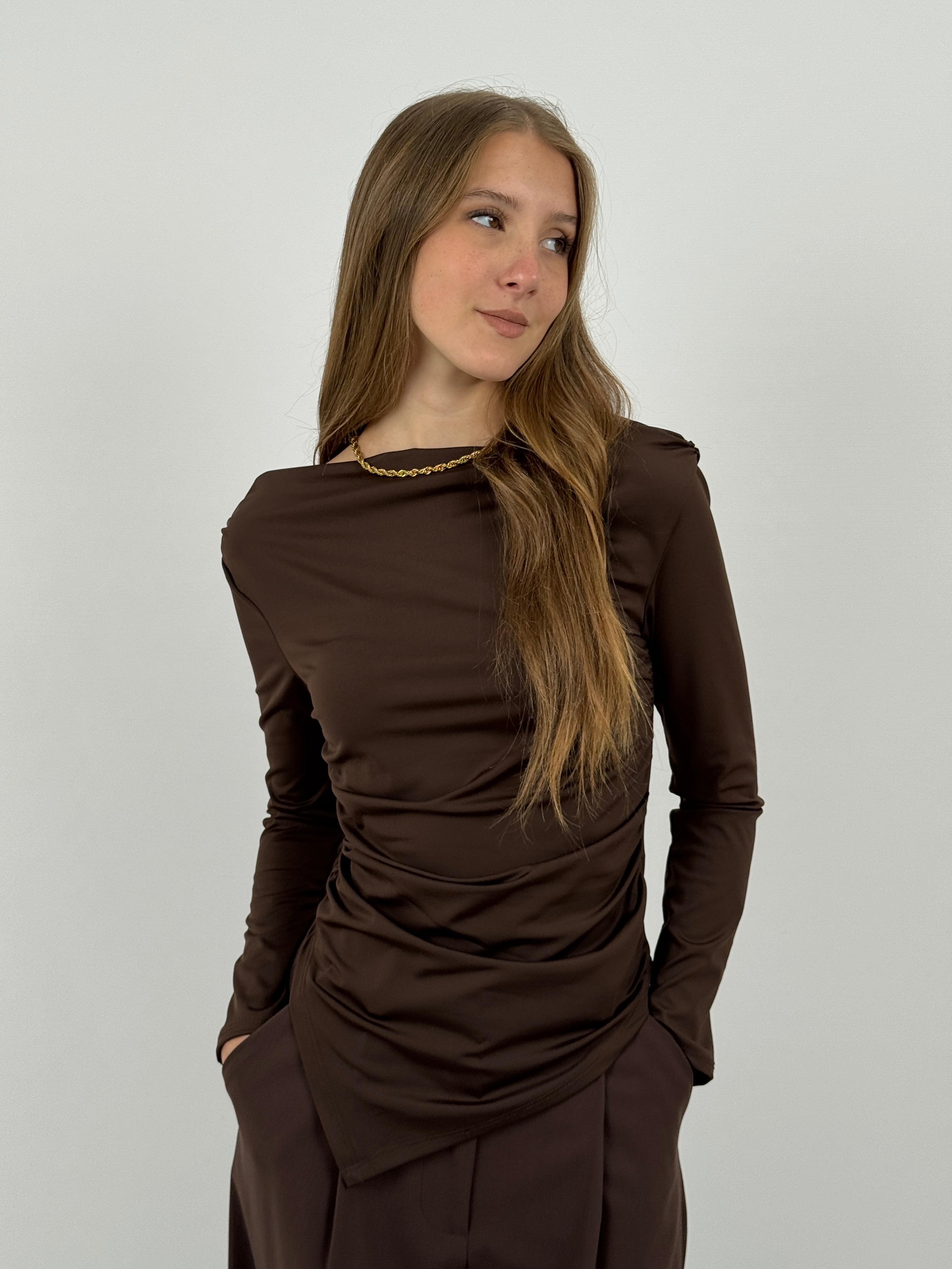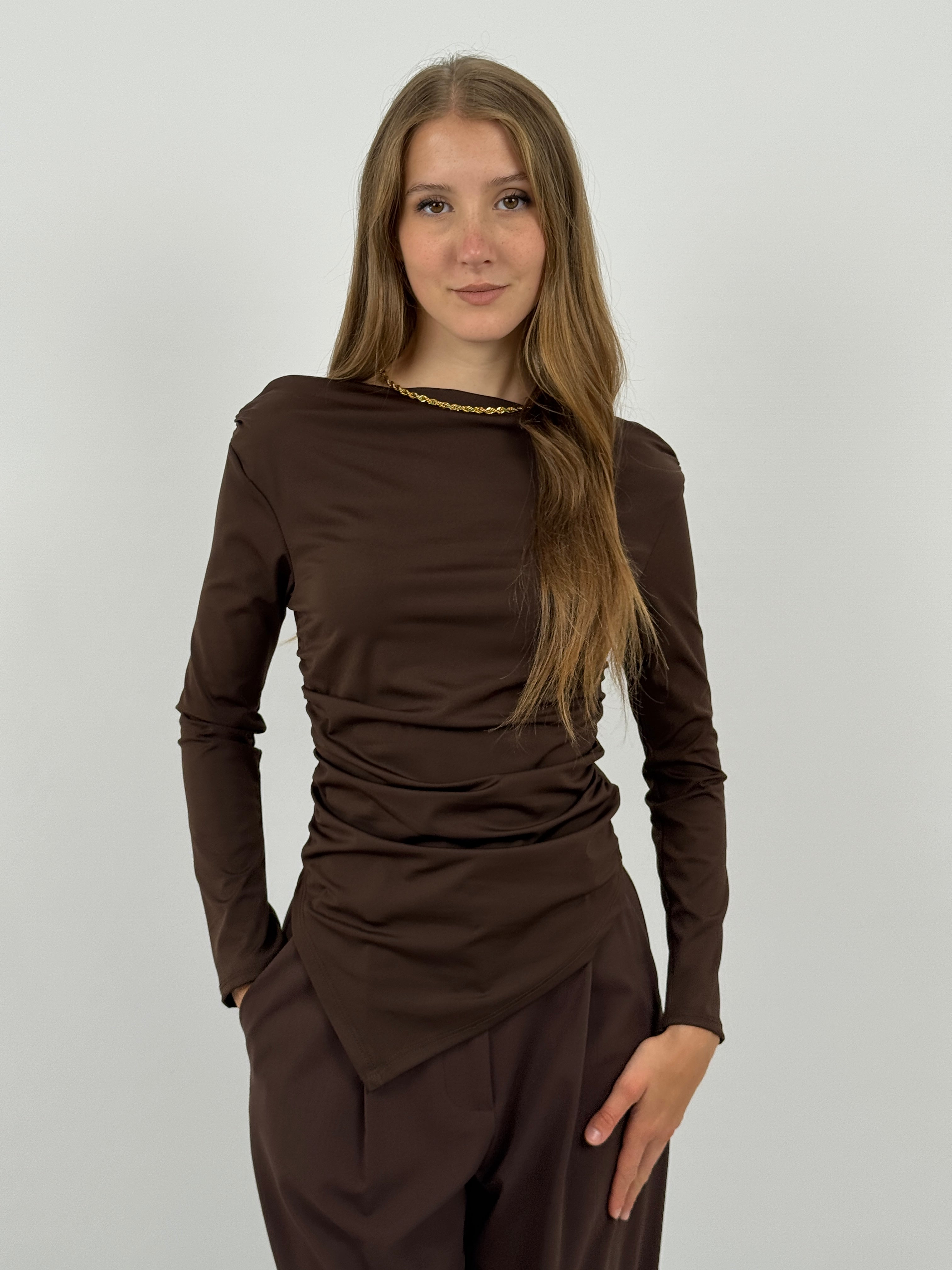 Maglia marrone a maniche lunghe in lycra elasticizzata con arricciature sul davanti e fondo asimmetrico.