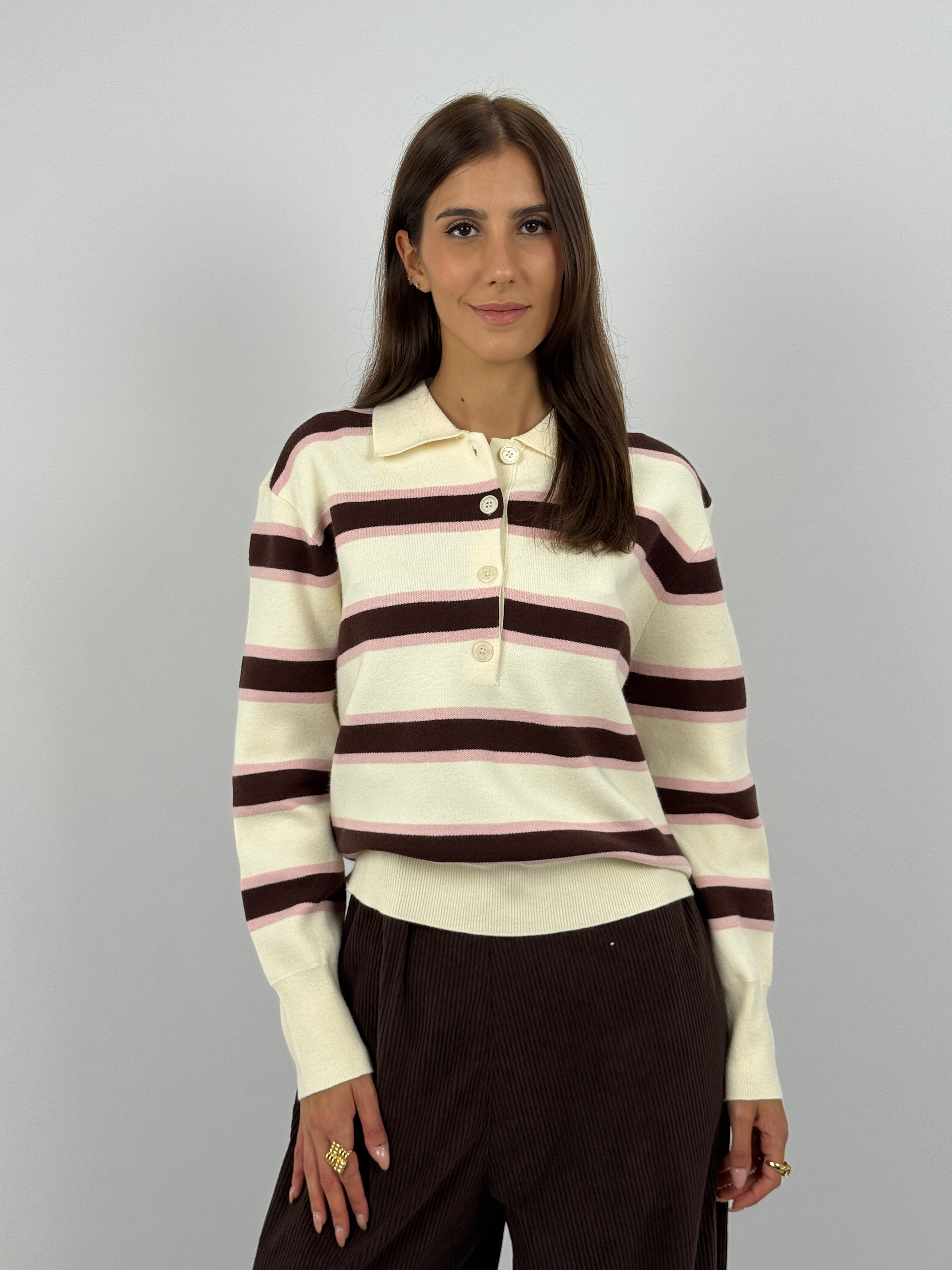 Maglia polo crema a righe con colletto classico e chiusura frontale con bottoni. Tessuto a maglia morbido e linea casual.