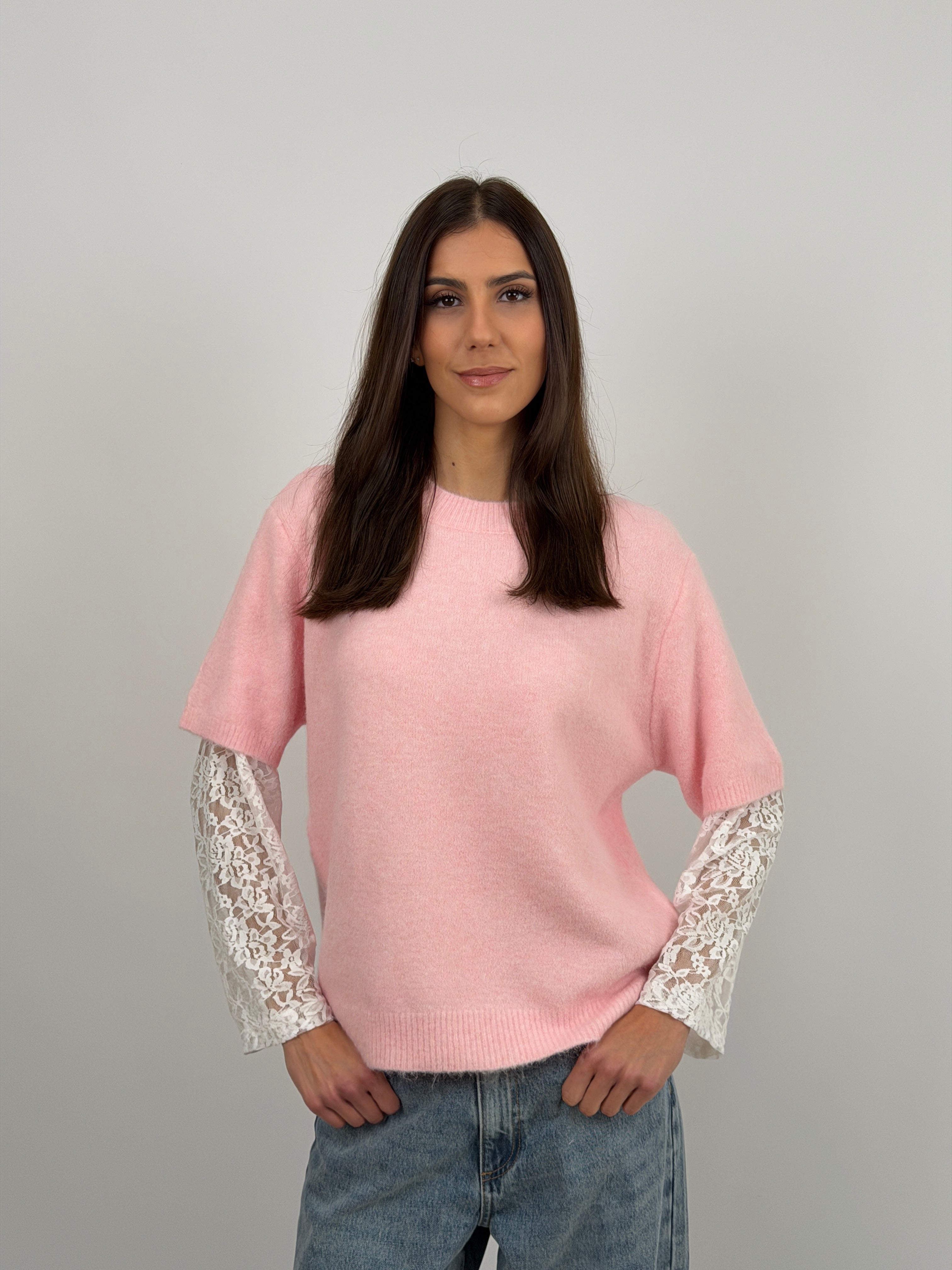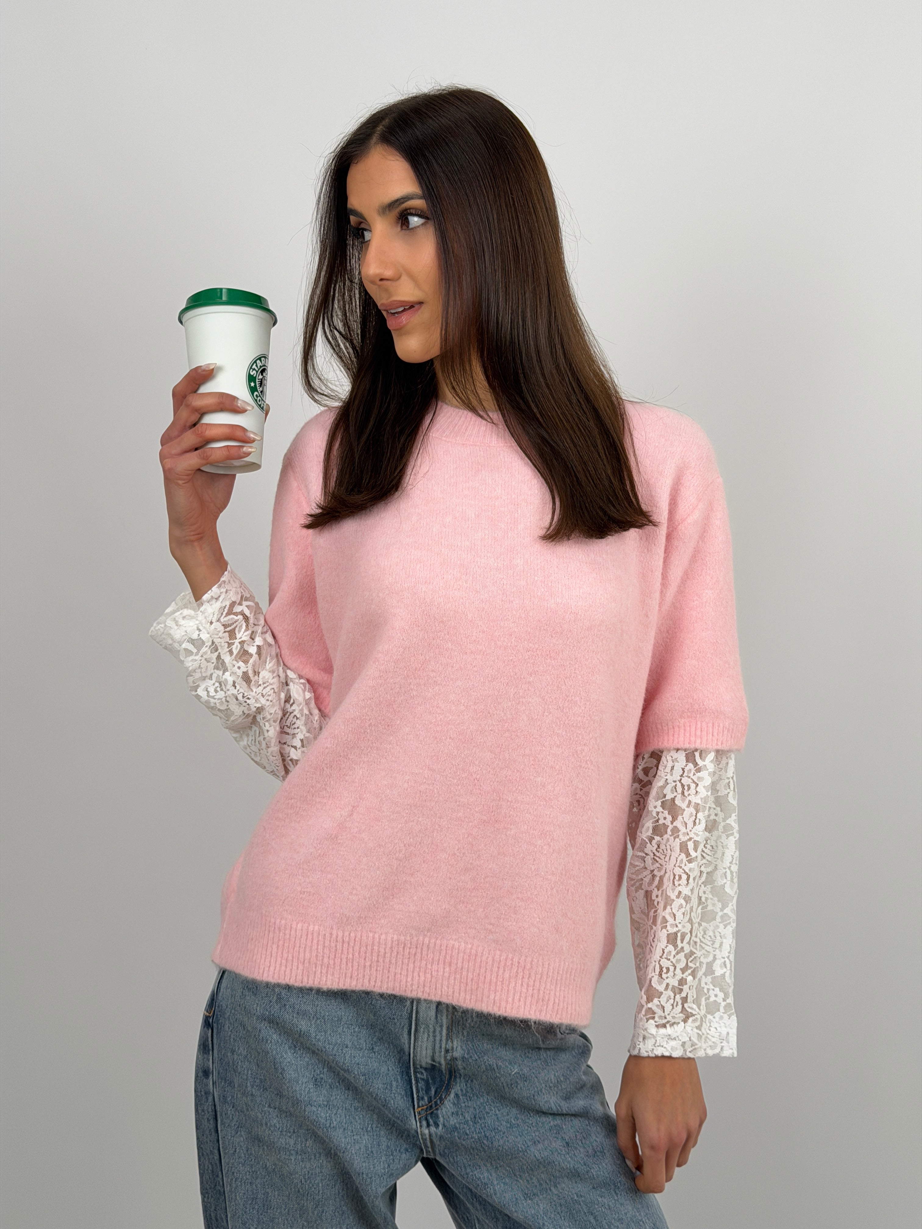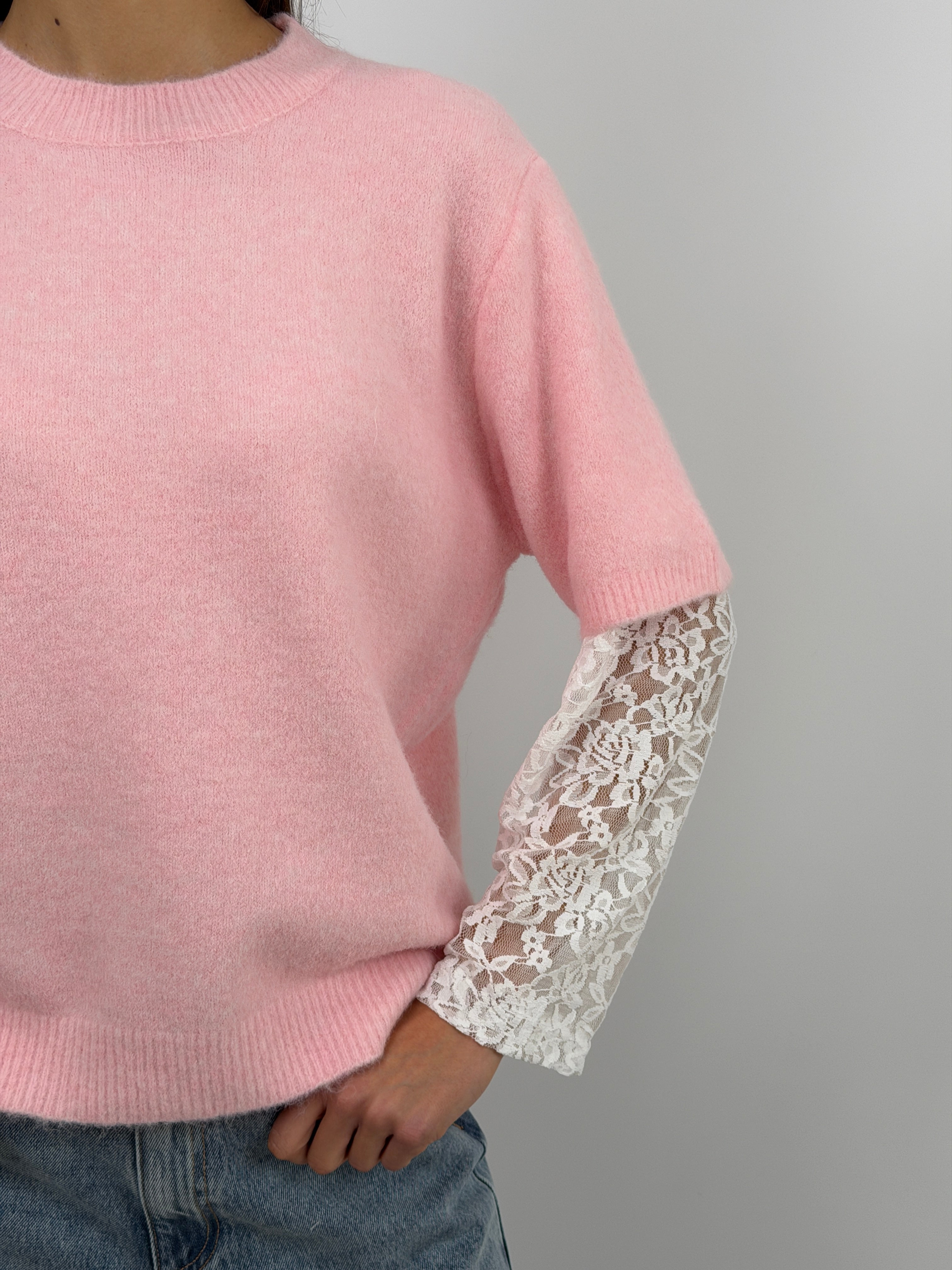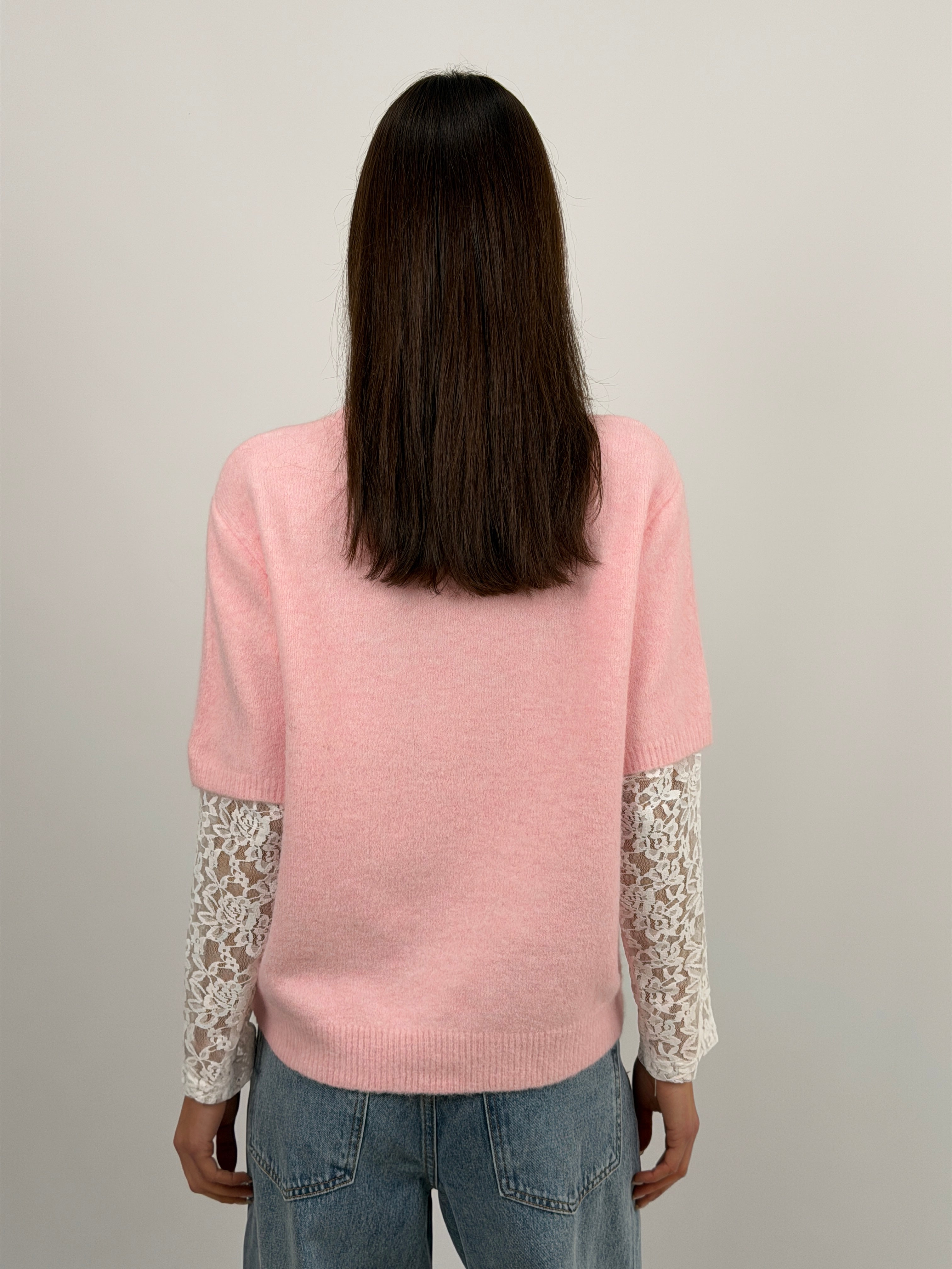 Maglione rosa a girocollo con finiture a costine e maniche in pizzo a contrasto
