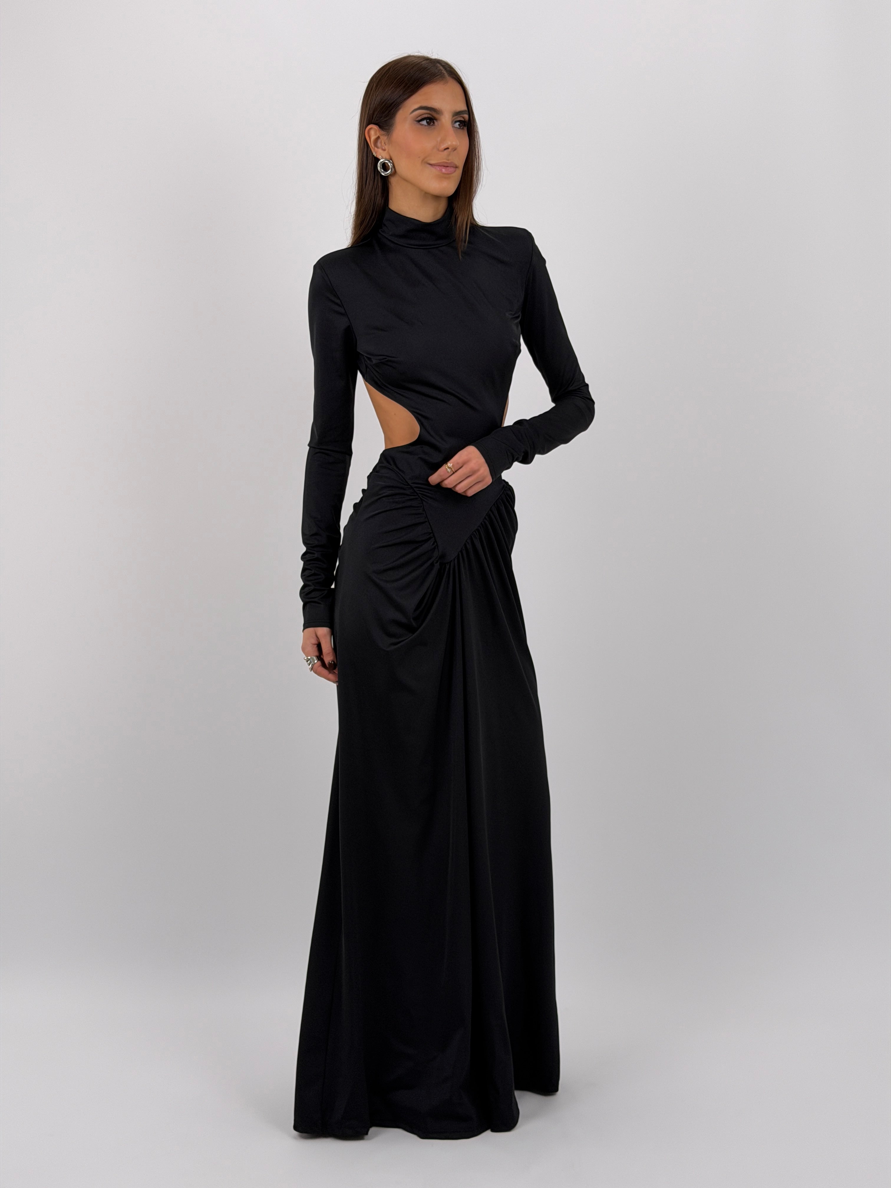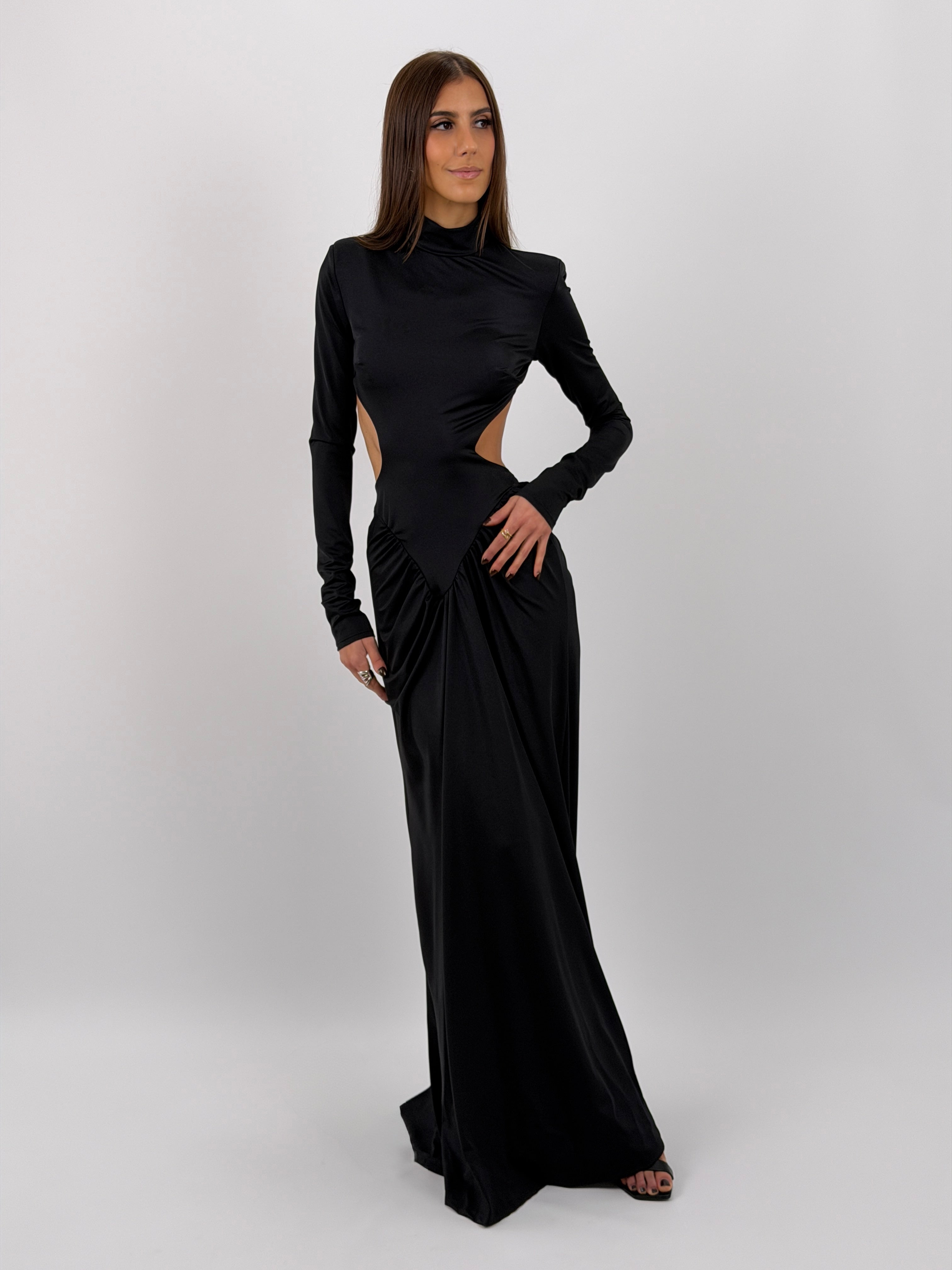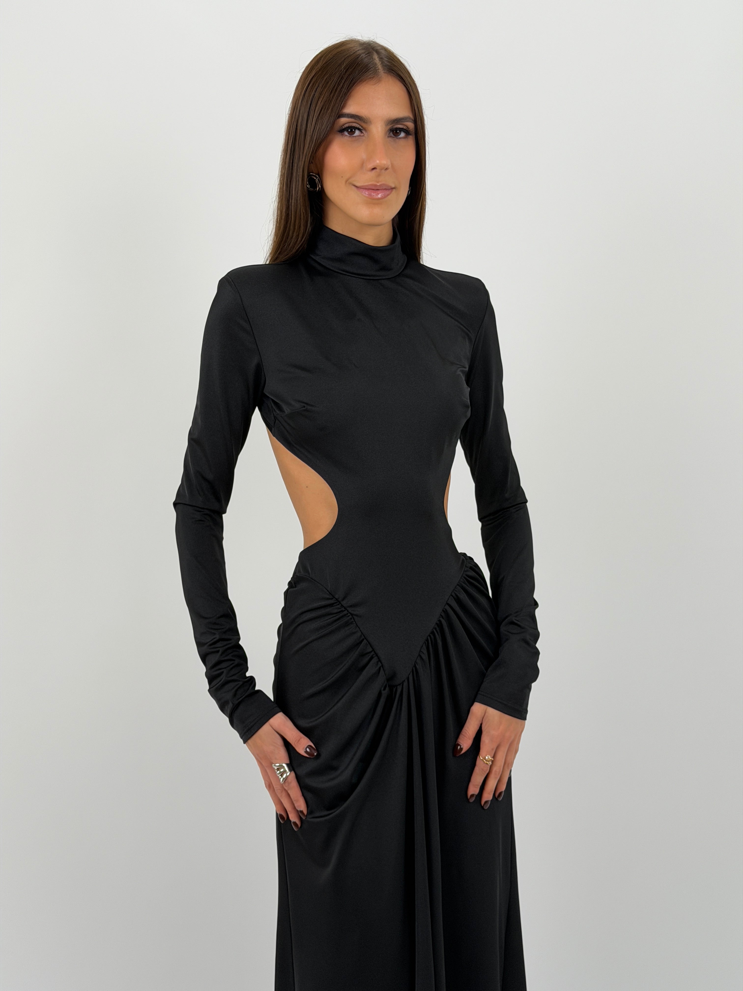 Abito lungo nero in tessuto elasticizzato con maniche lunghe, collo alto, spalline imbottite, coppe preformate e schiena scoperta.