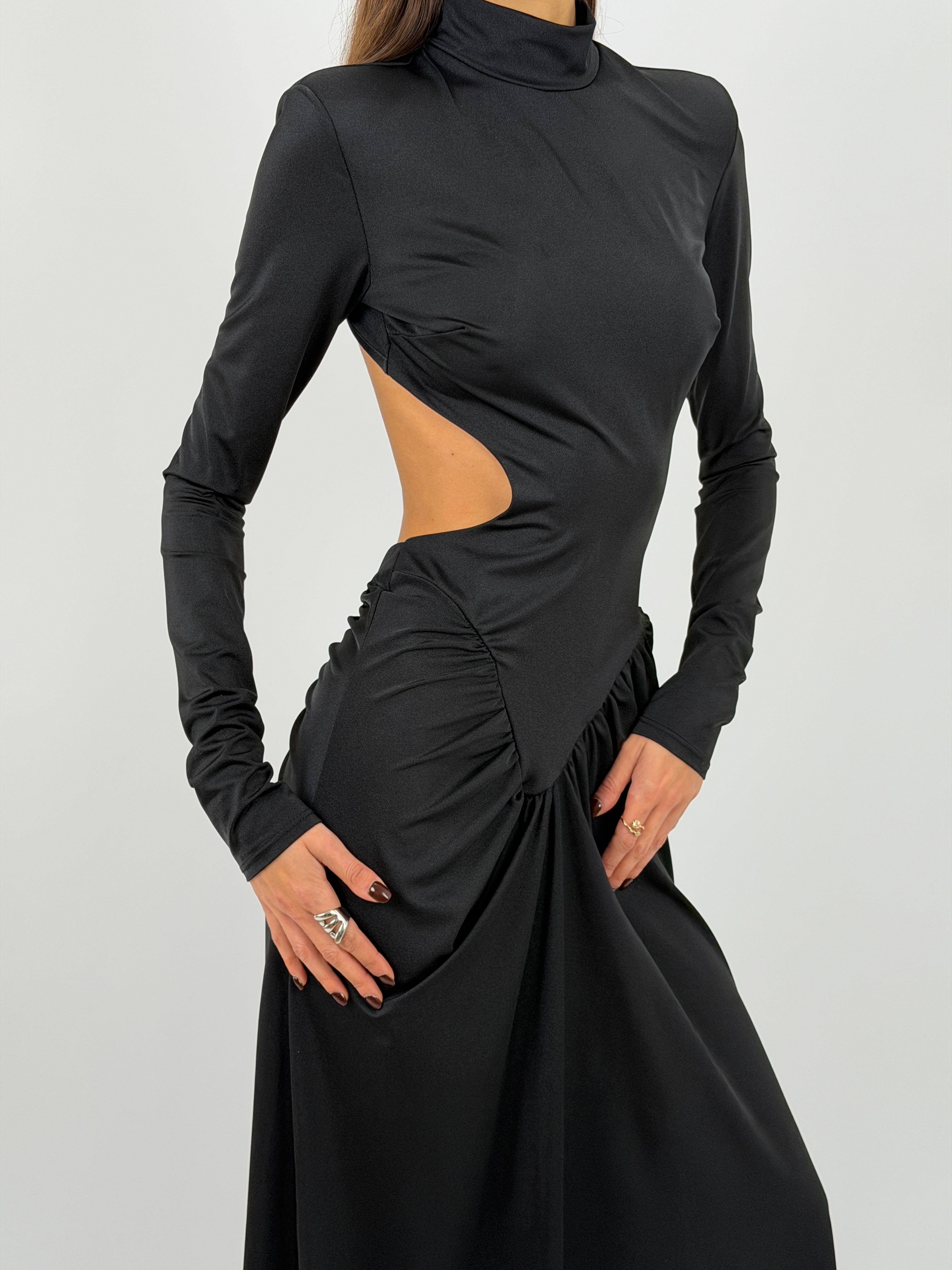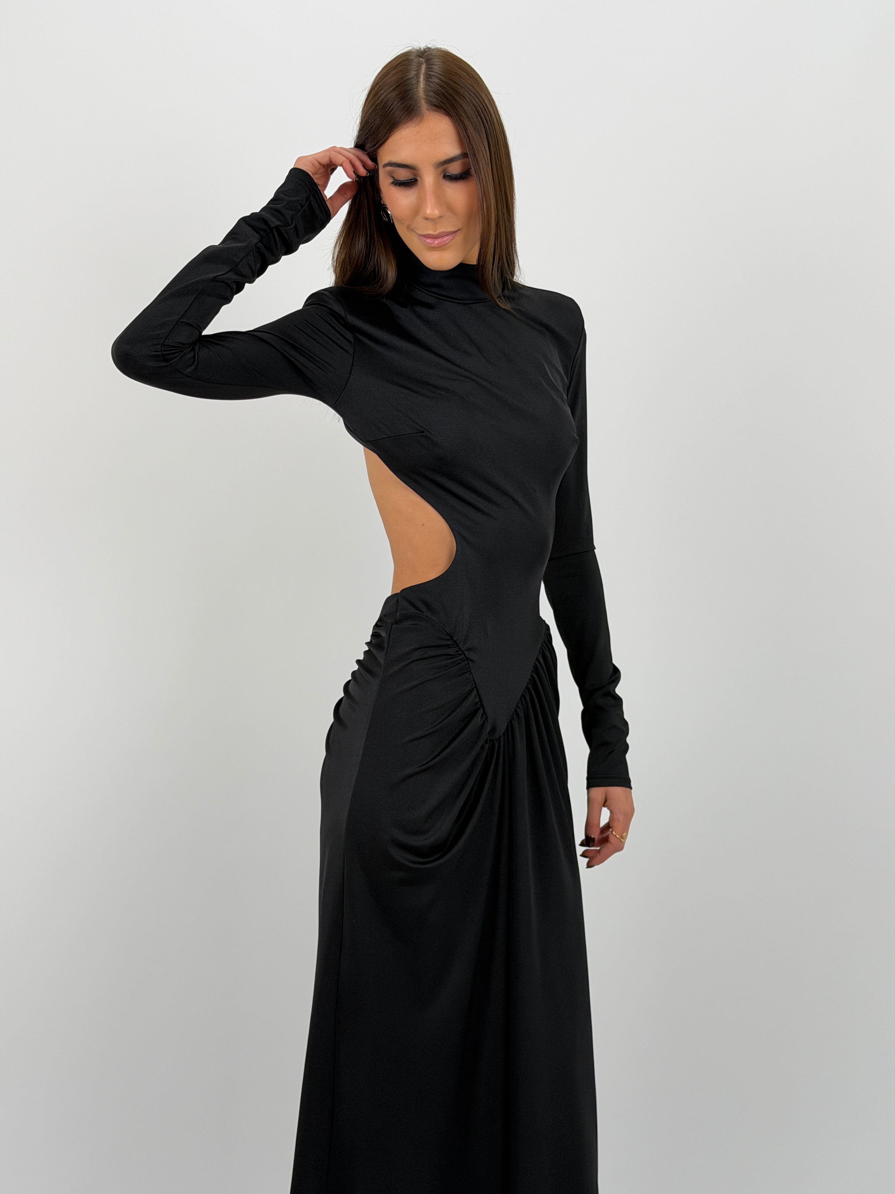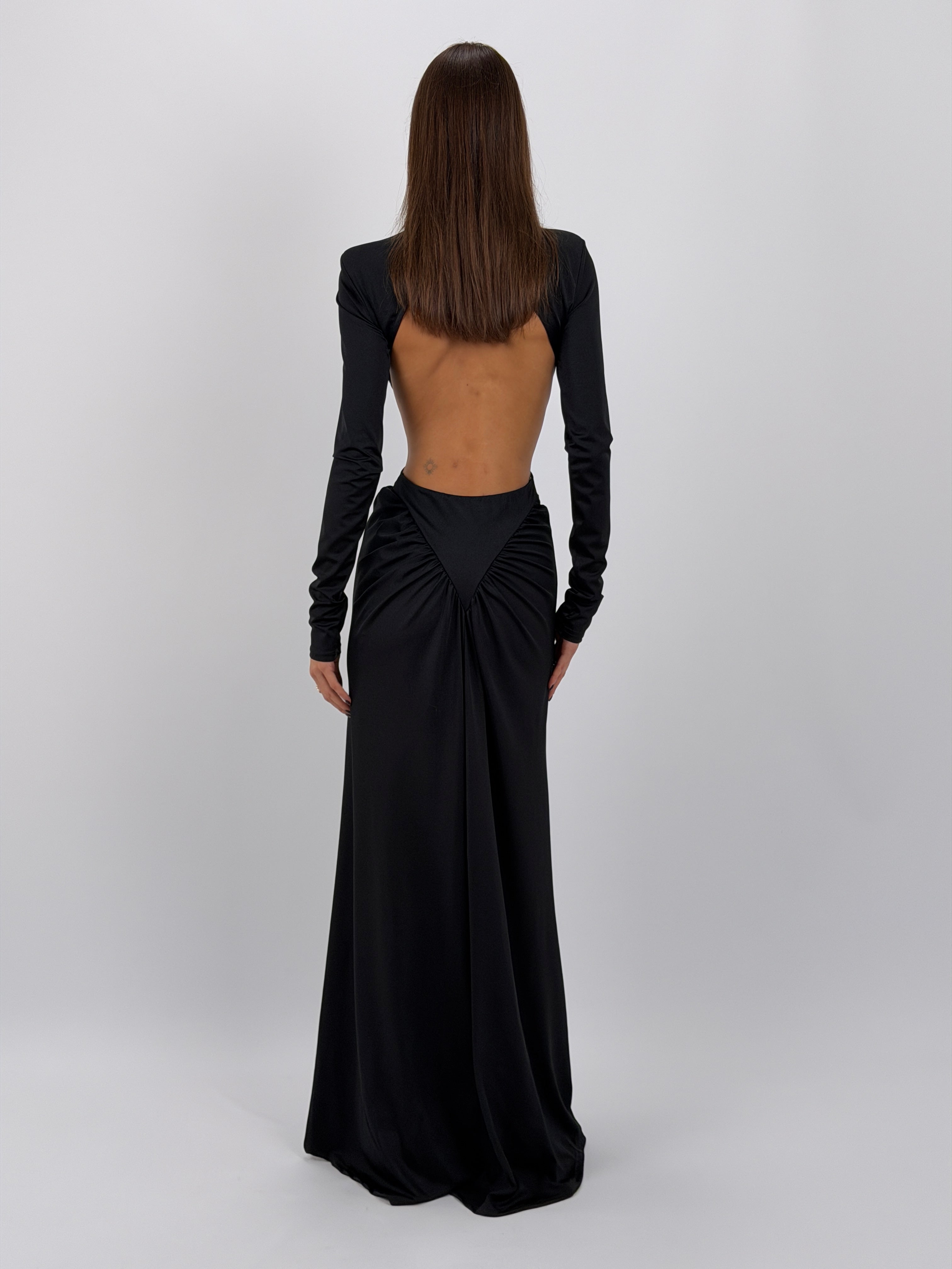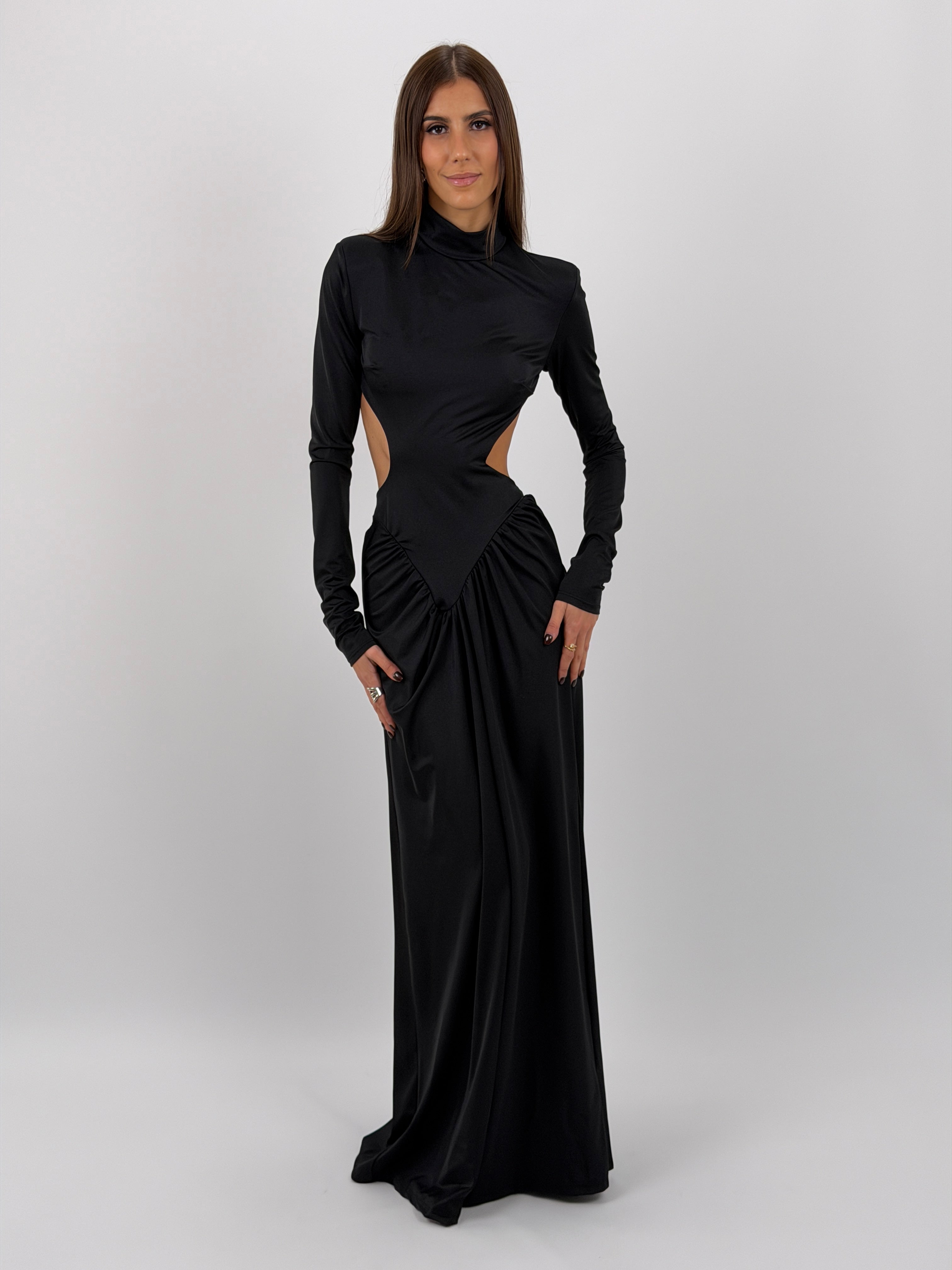Abito lungo nero in tessuto elasticizzato con maniche lunghe, collo alto, spalline imbottite, coppe preformate e schiena scoperta.
