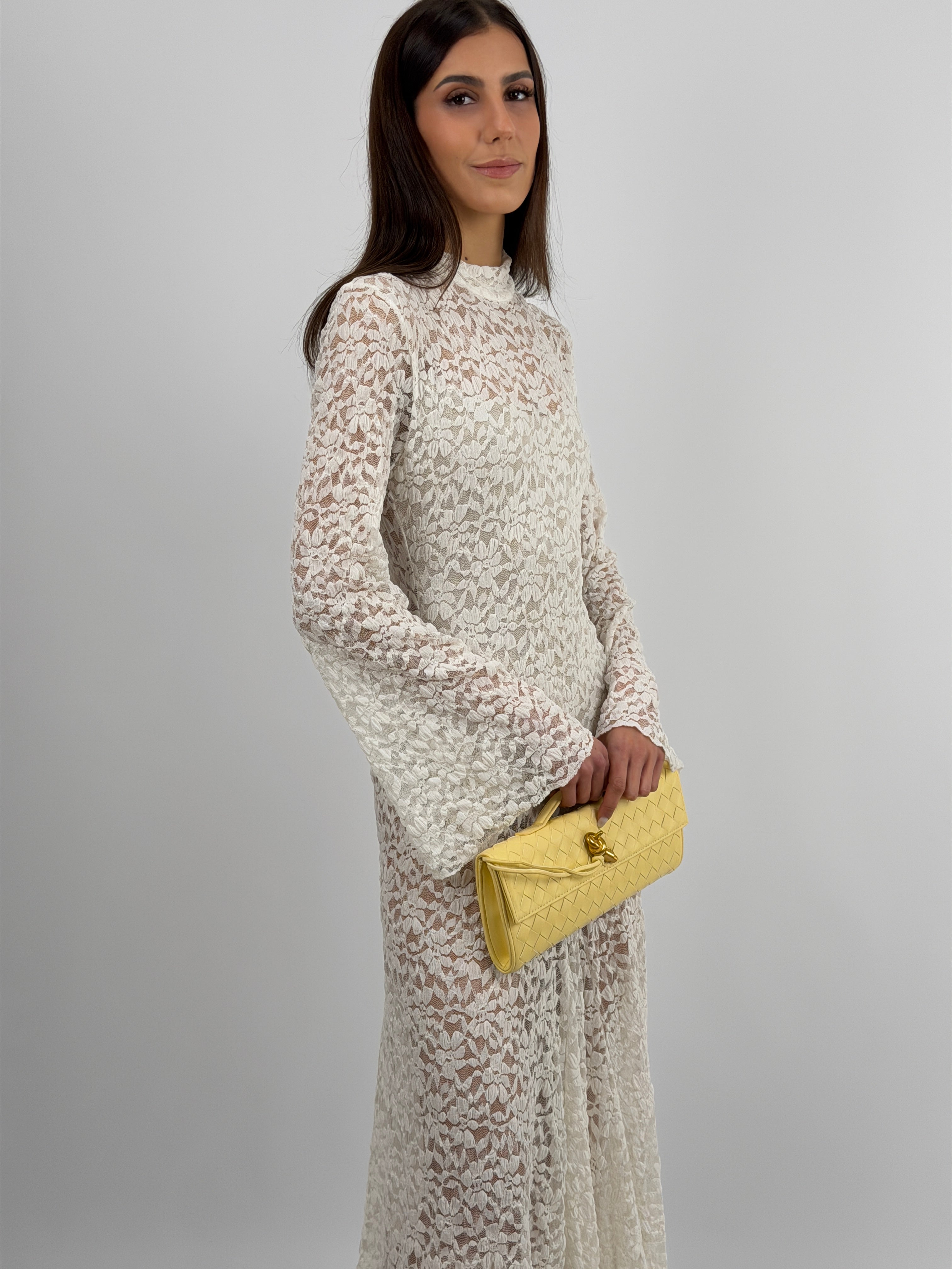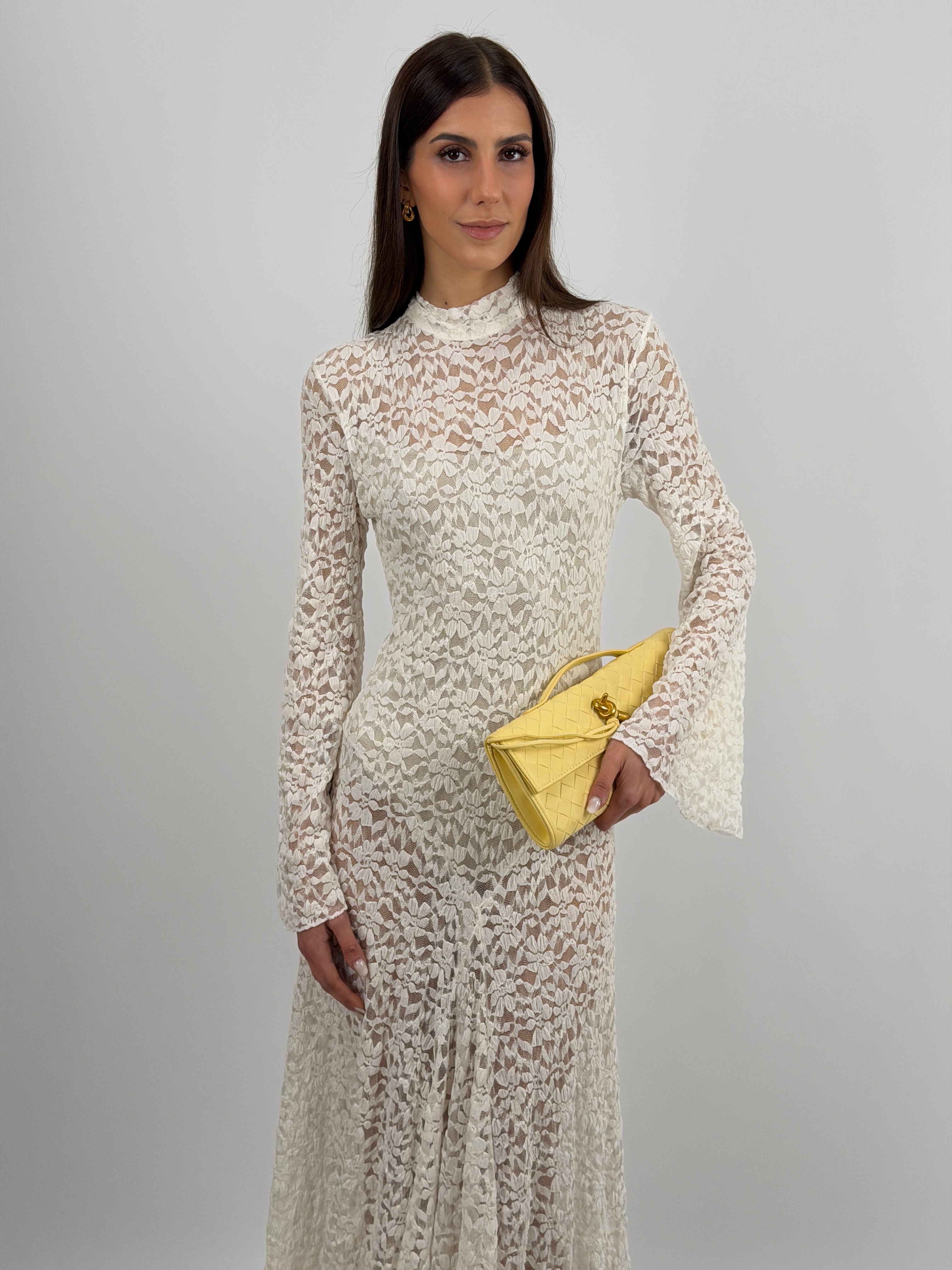 Abito Lumina bianco lungo in pizzo con body incorporato, maniche lunghe e collo alto, schiena scoperta e chiusura con fiocco in satin sul retro