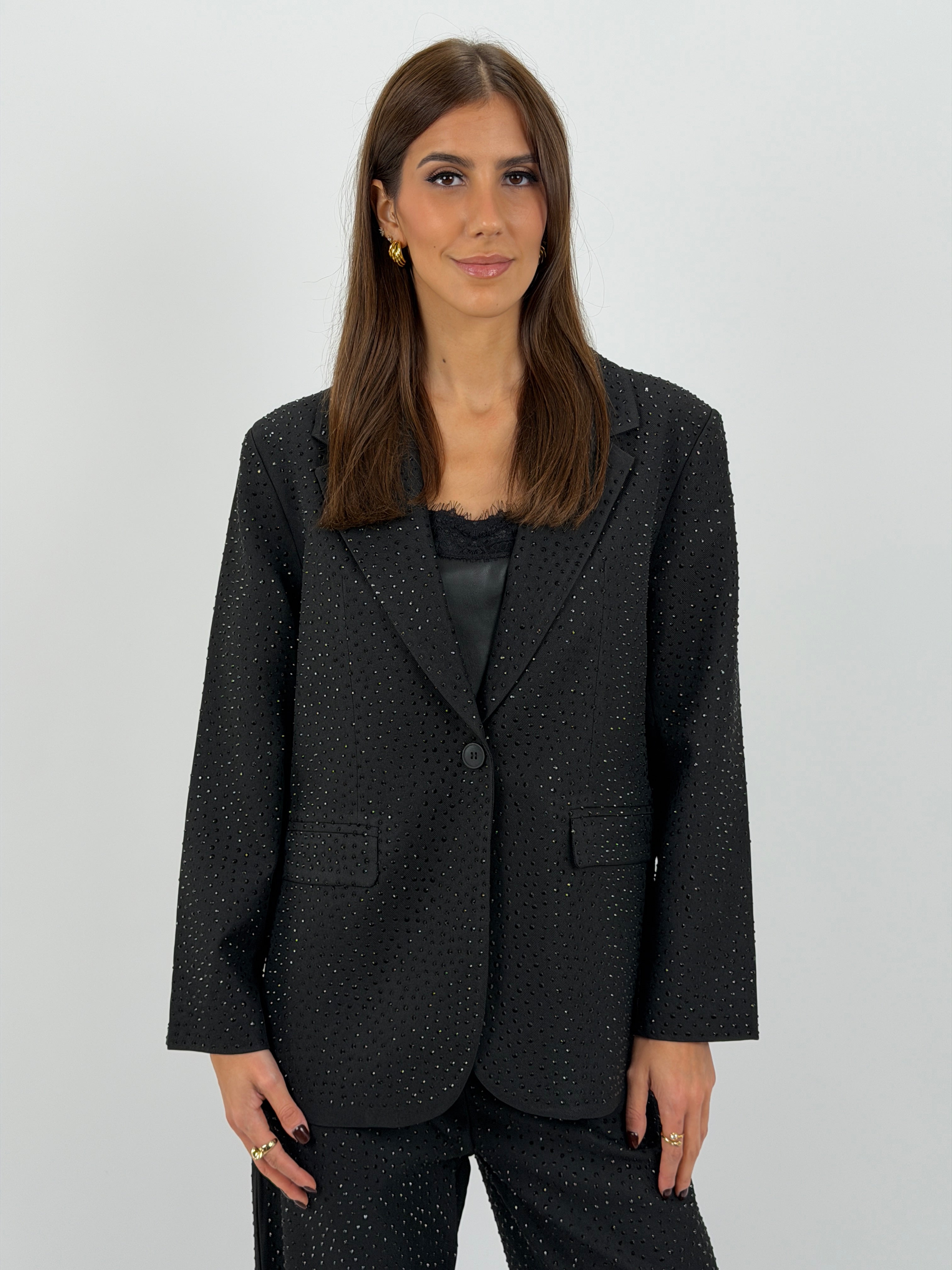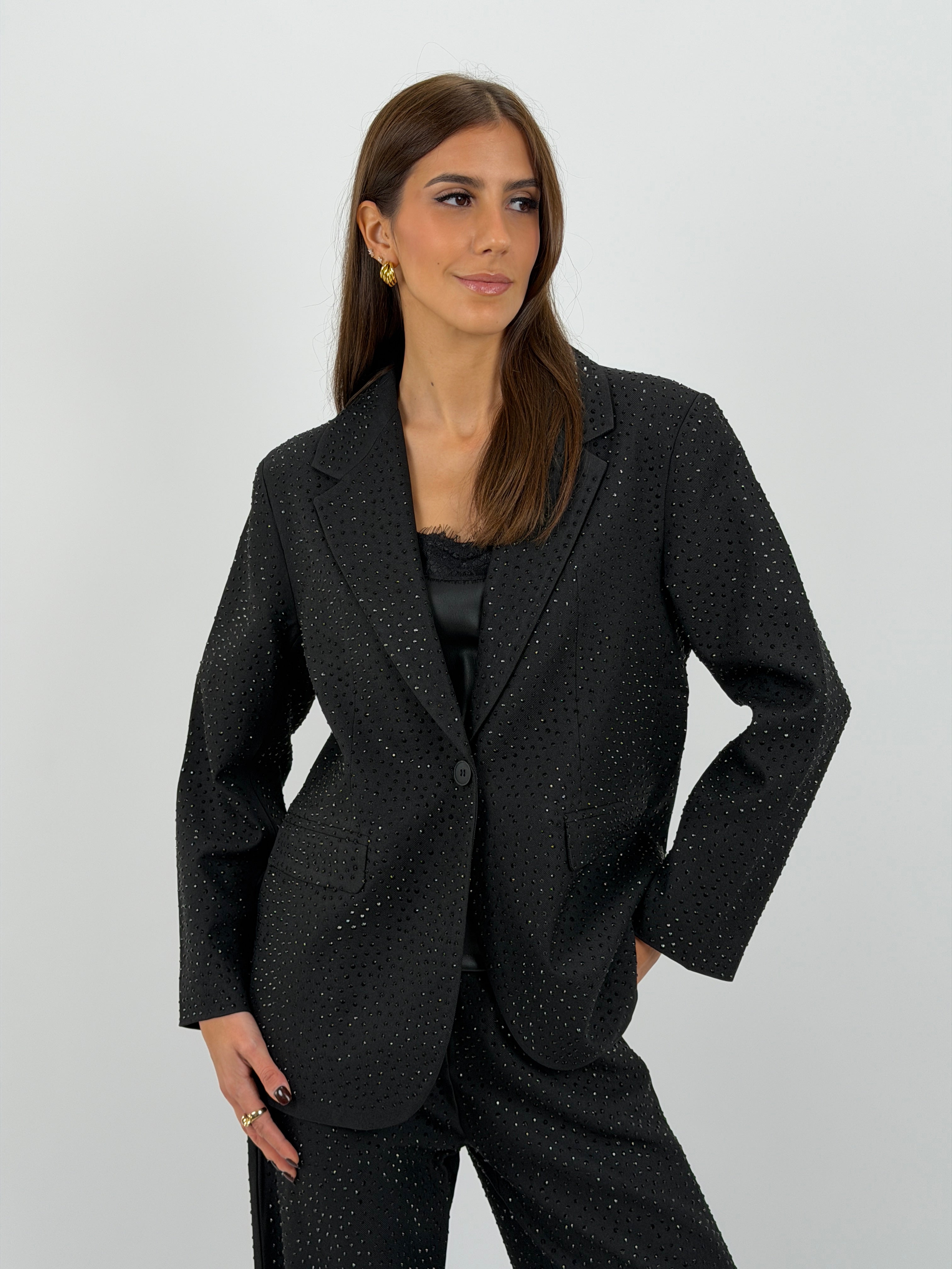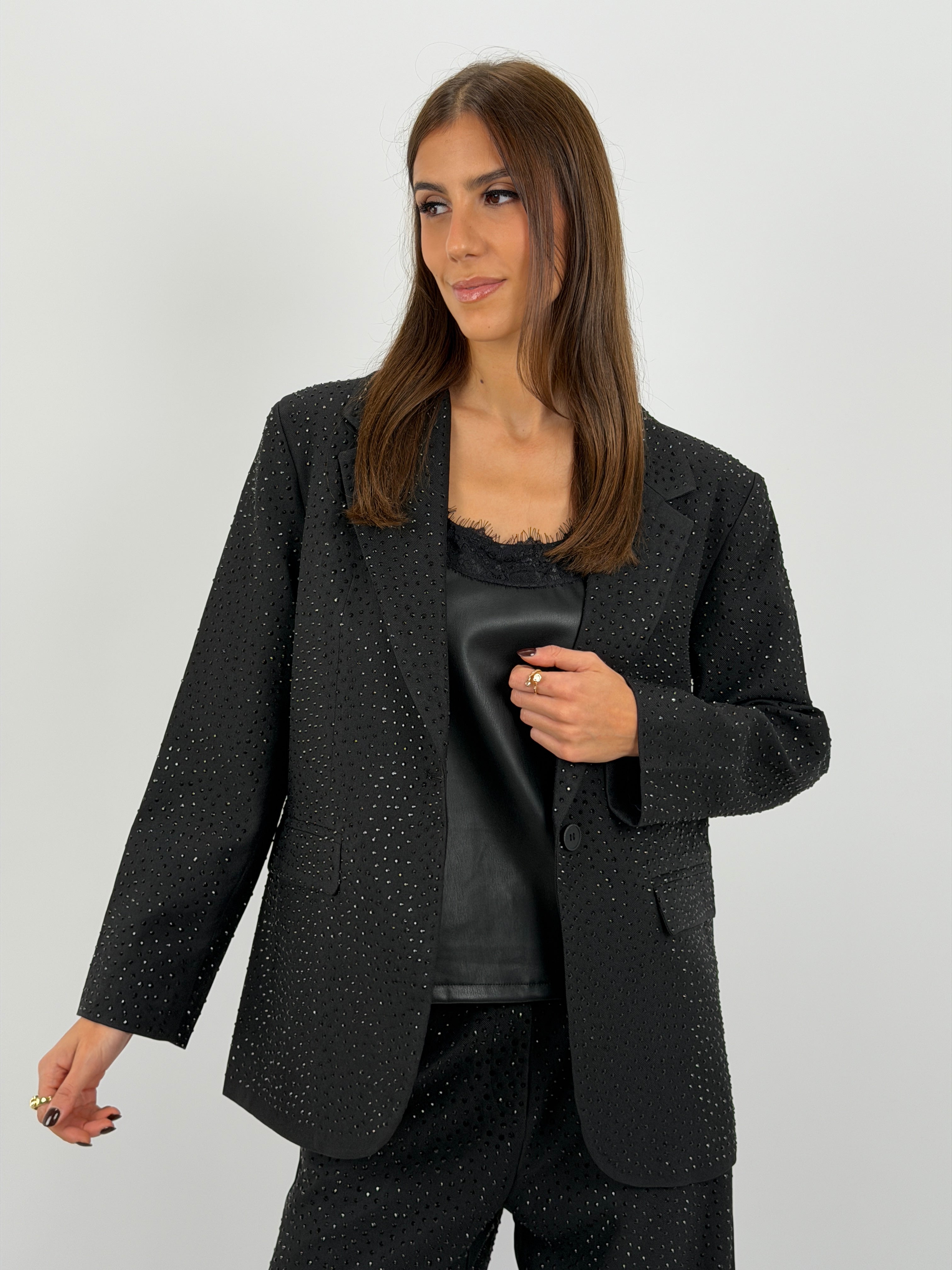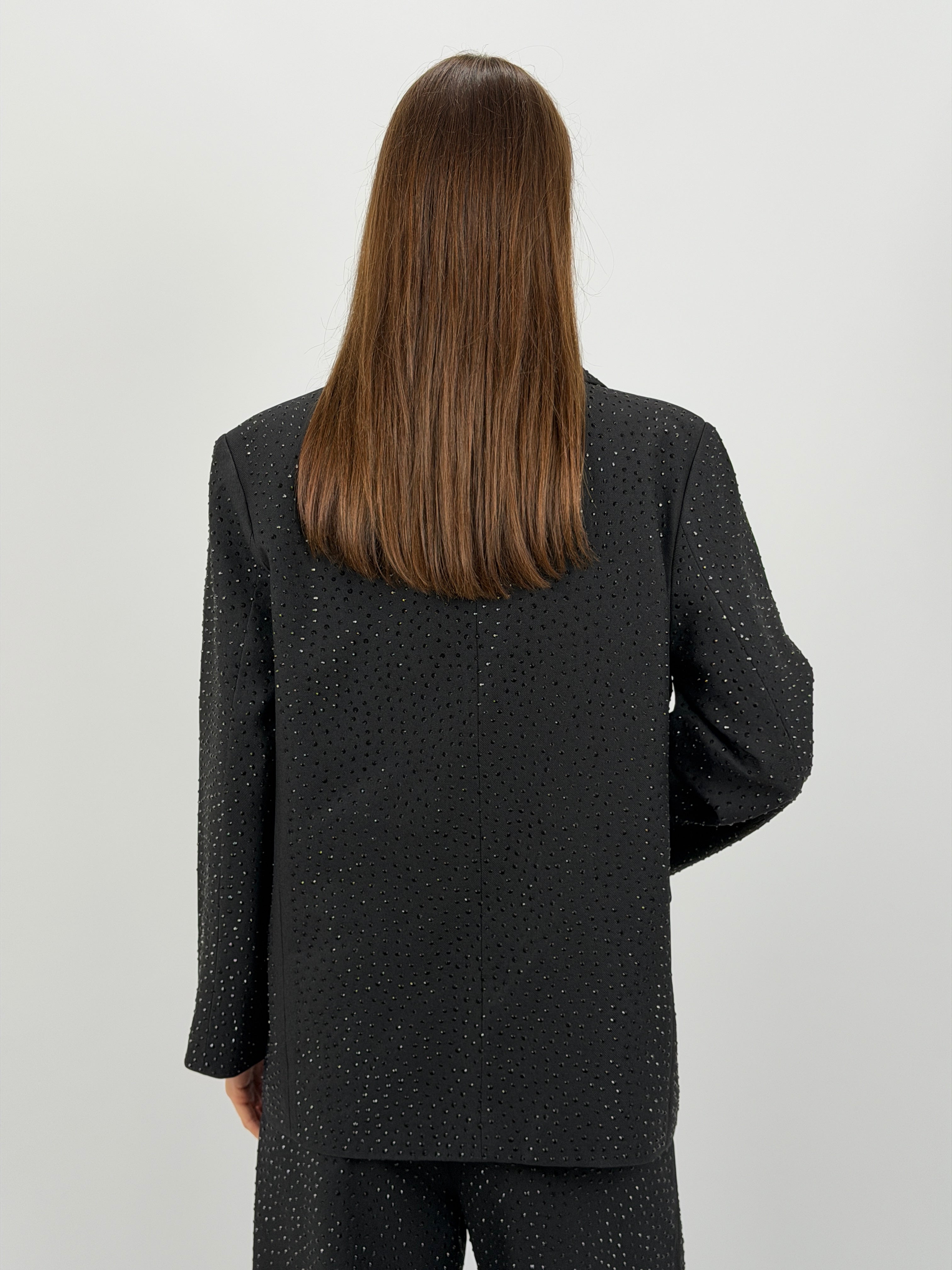Giacca monopetto nera con collo a revers e applicazione di strass tono su tono sull’intero tessuto, completa di fodera interna.