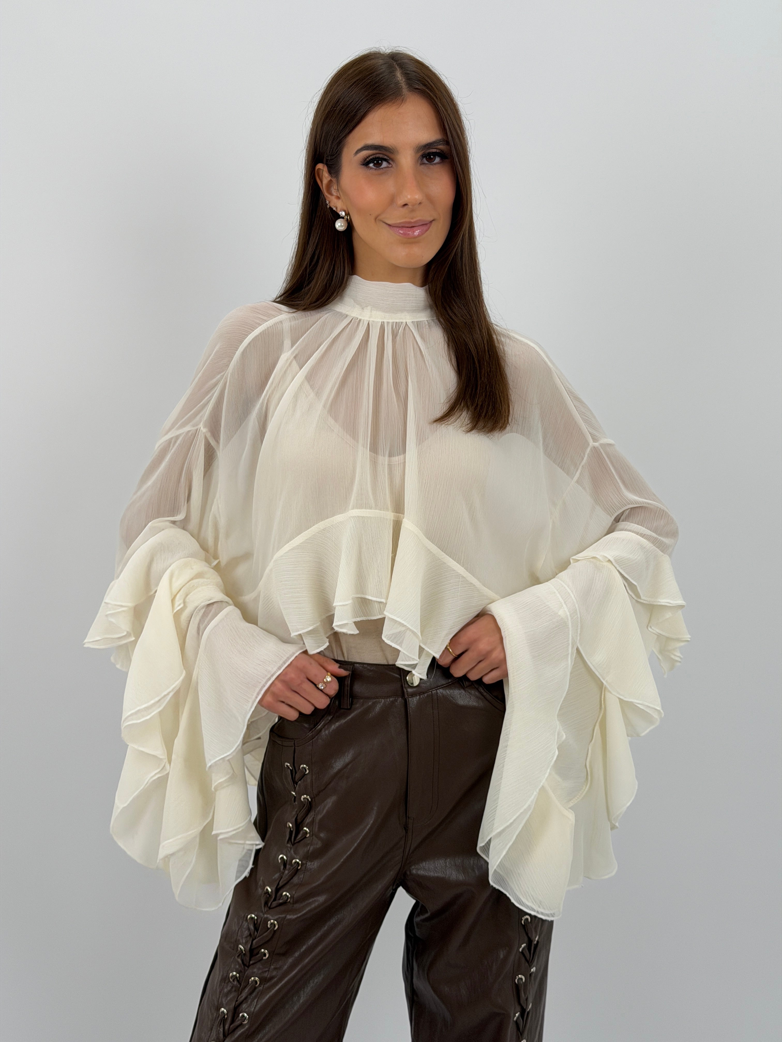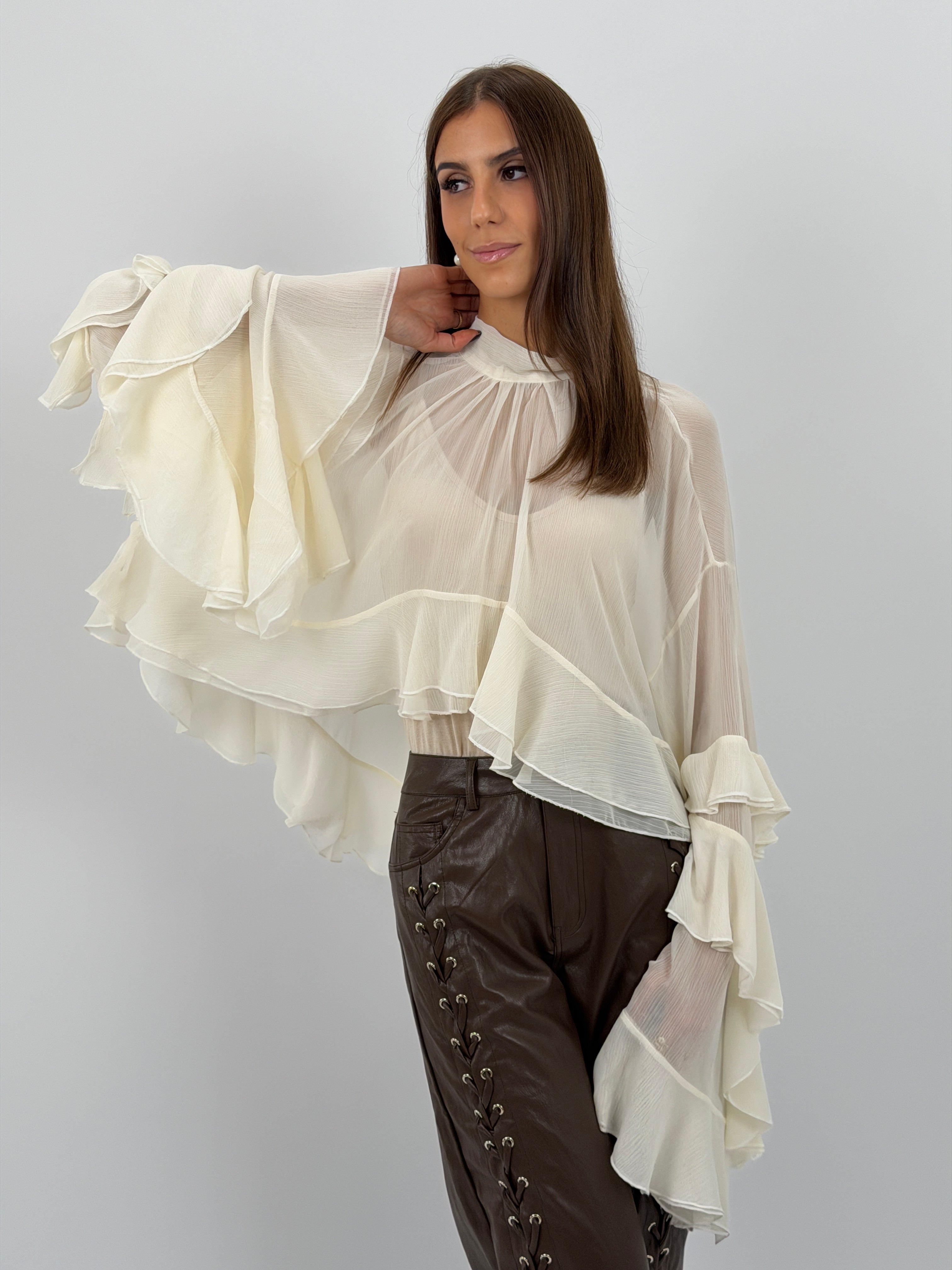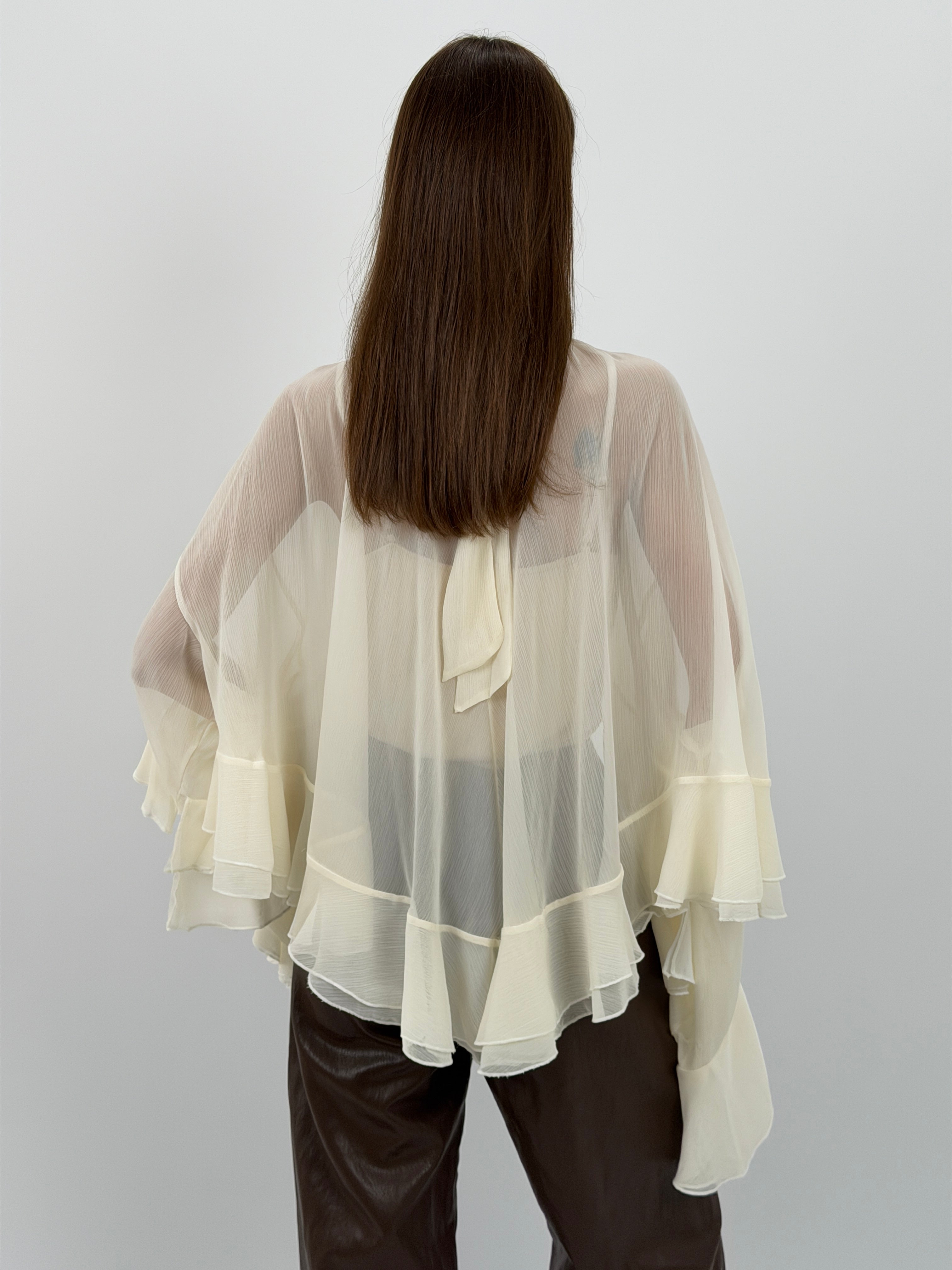 Blusa color crema in tessuto semitrasparente con maniche ampie, balze e volant, chiusa da lacci sul collo.
