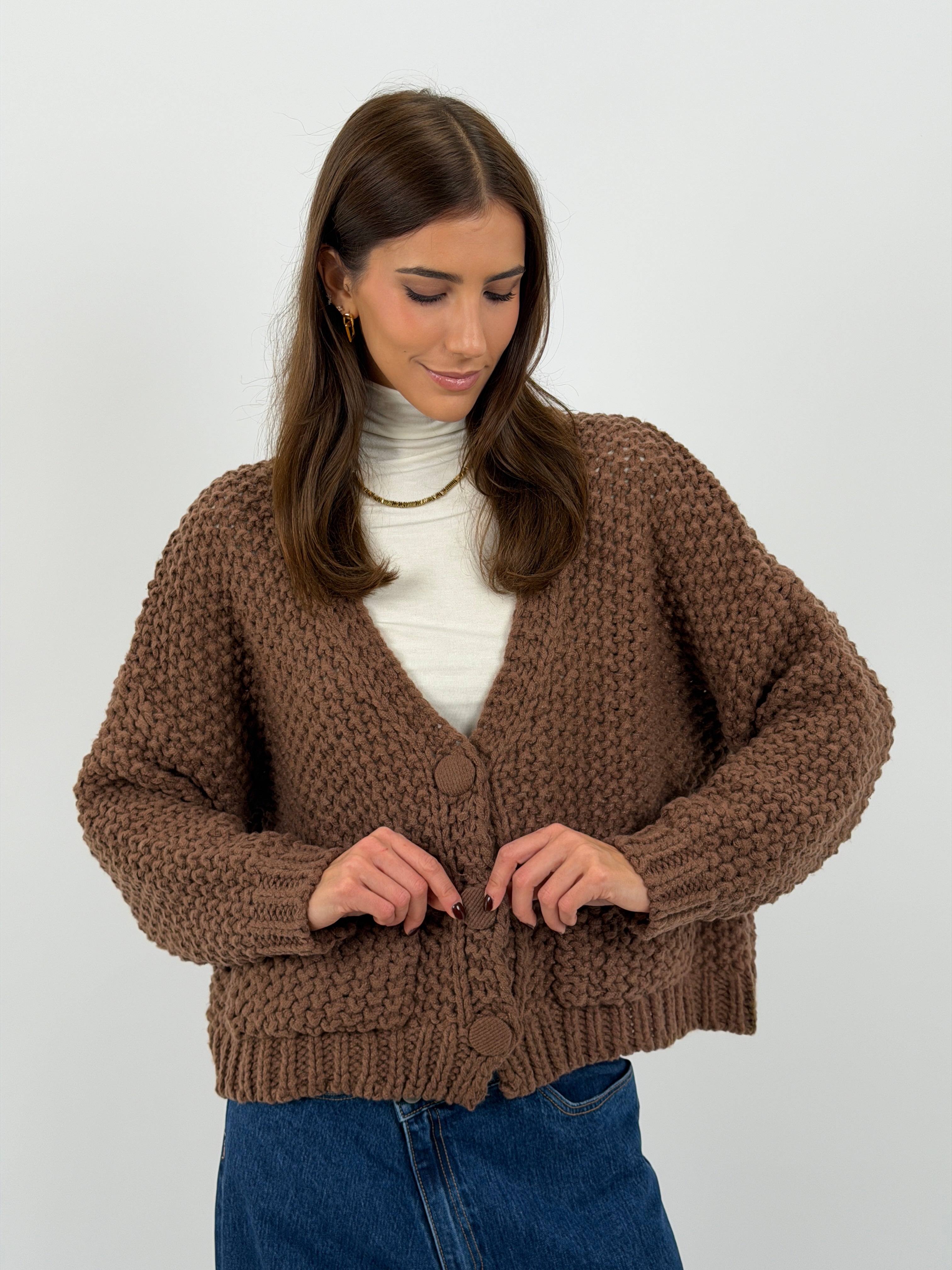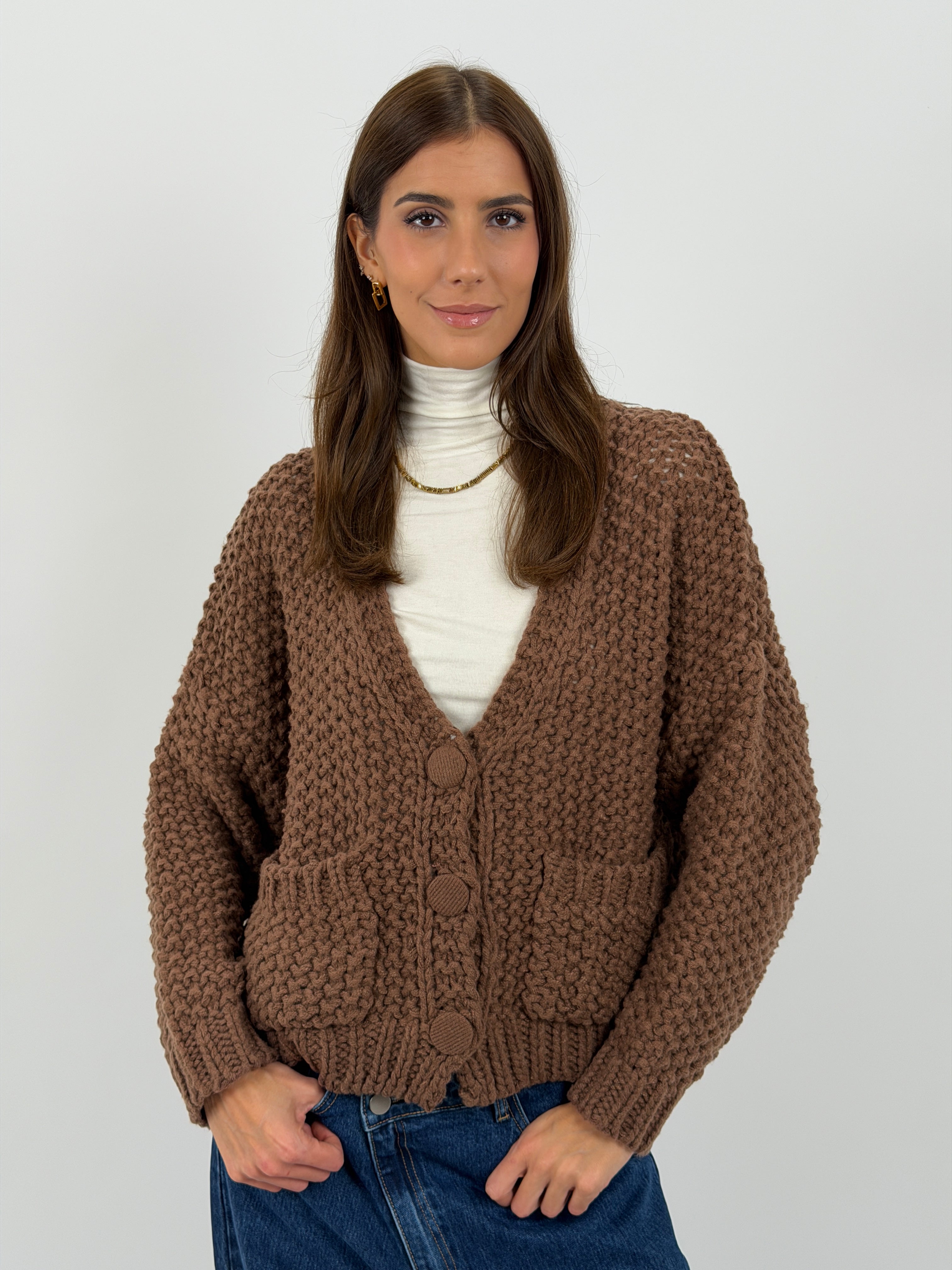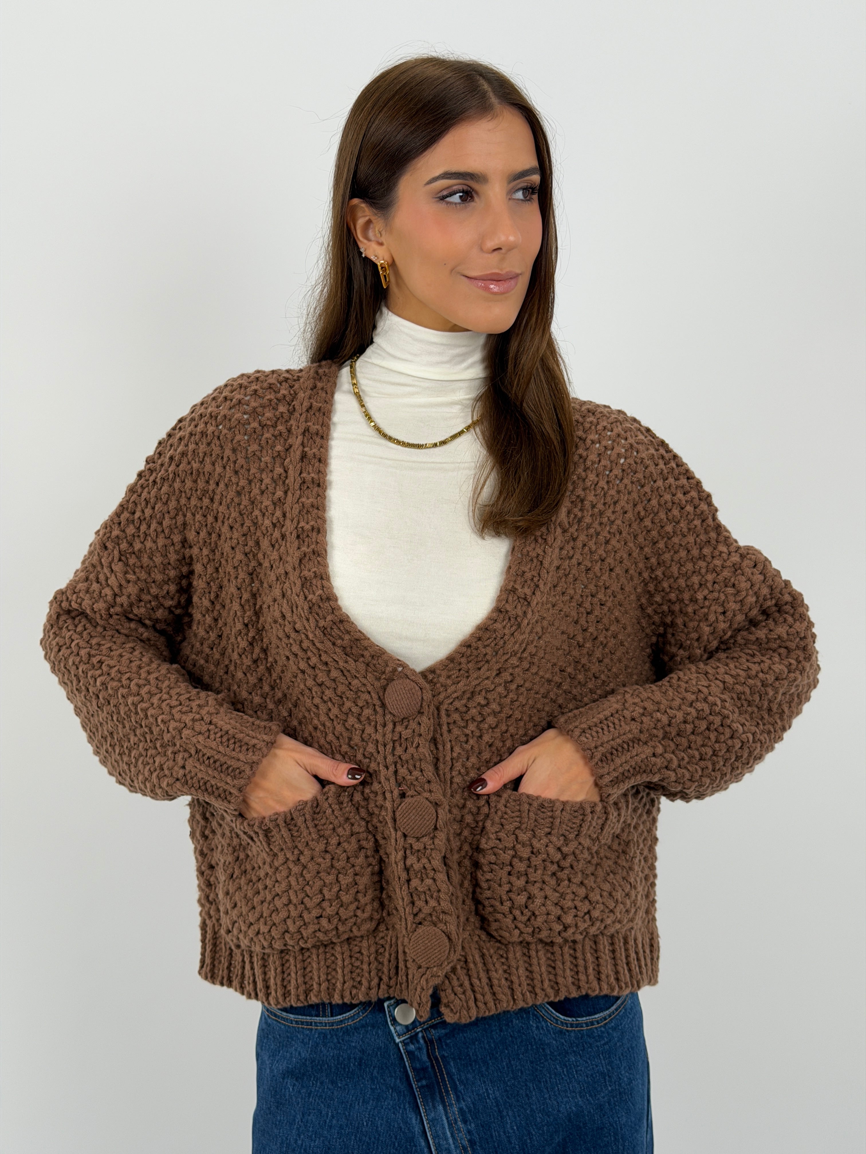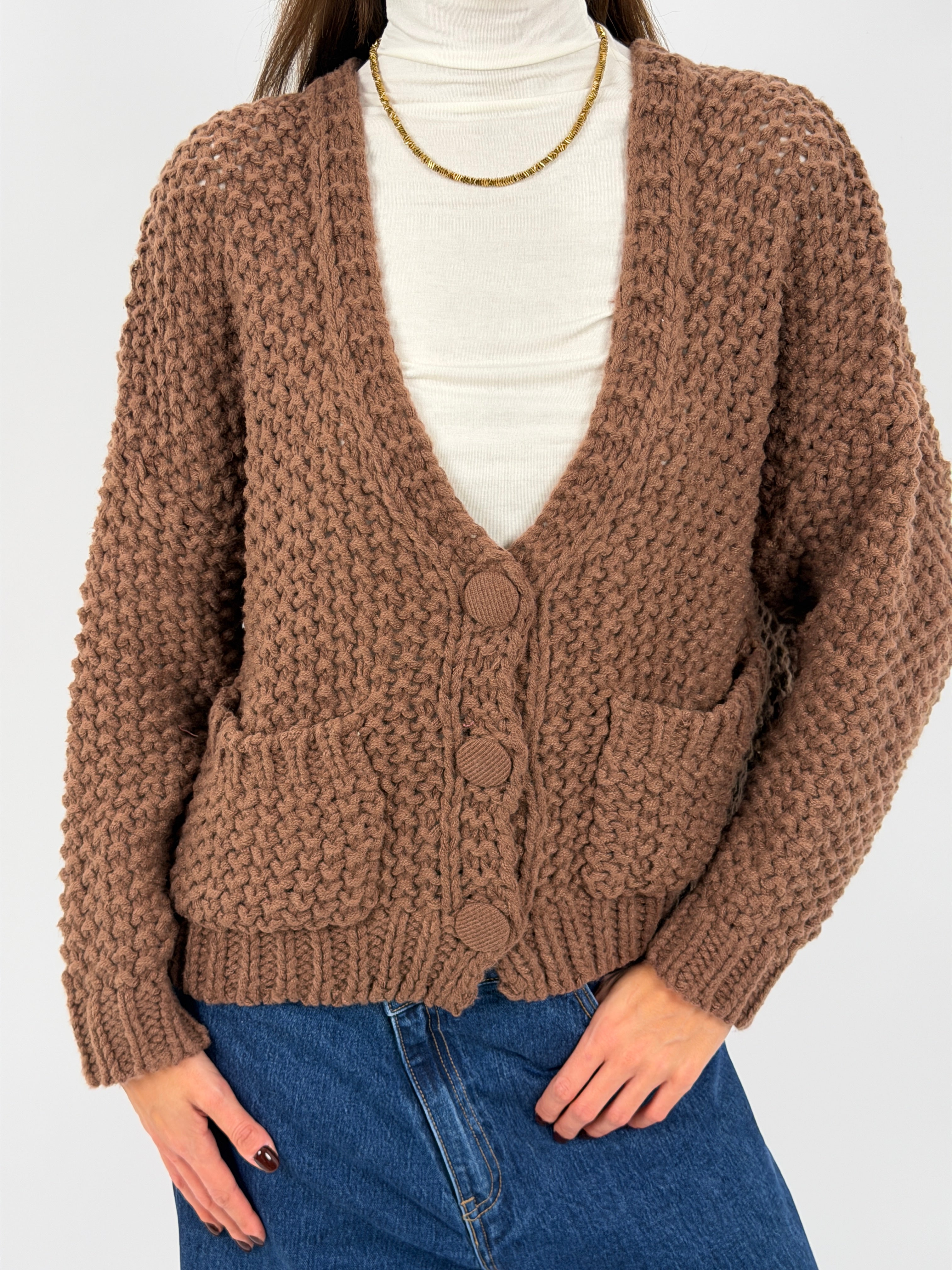 Mobido cardigan marrone in maglia lavorata con scollo a V, tasche frontali e maxi bottoni.