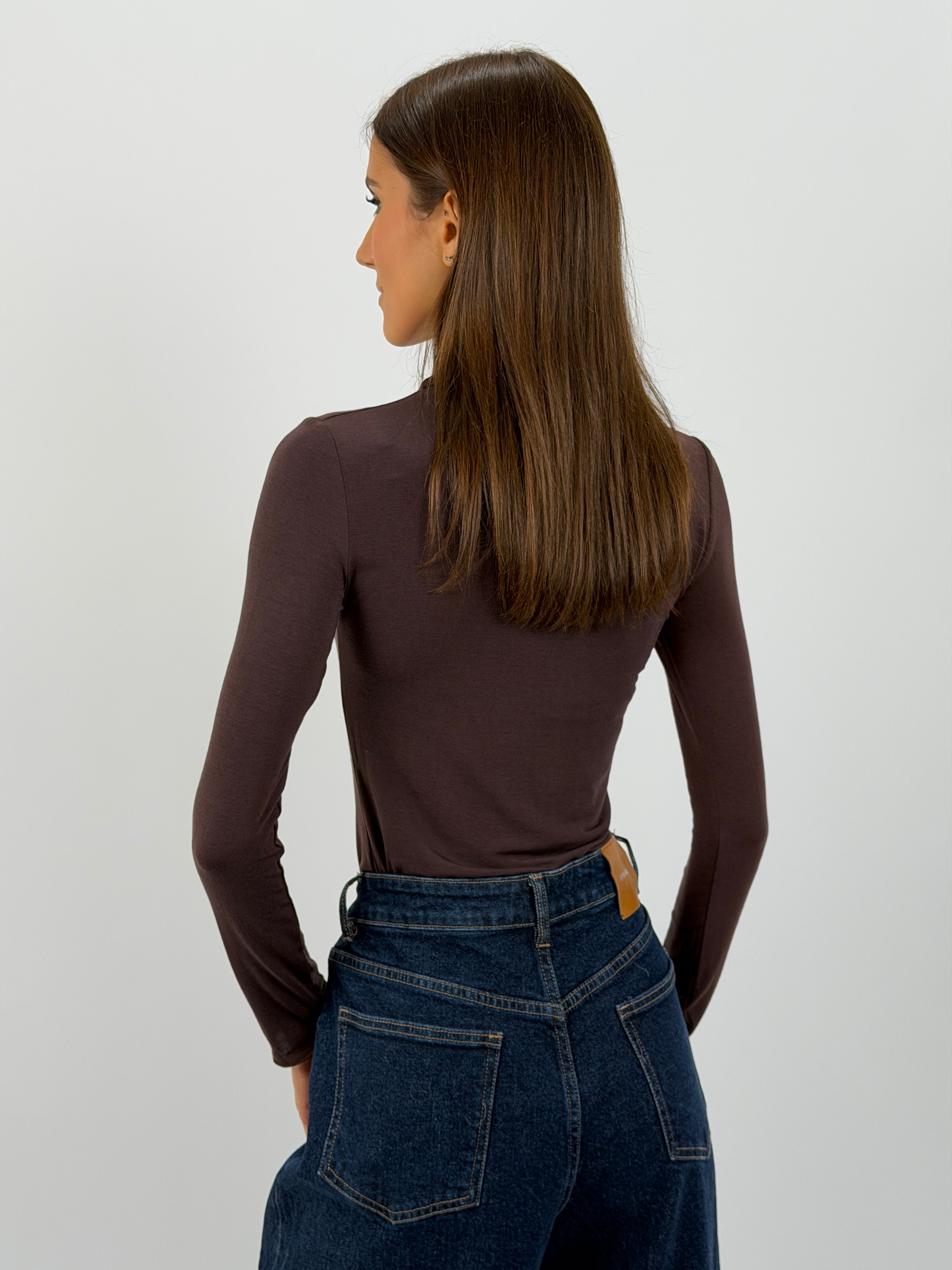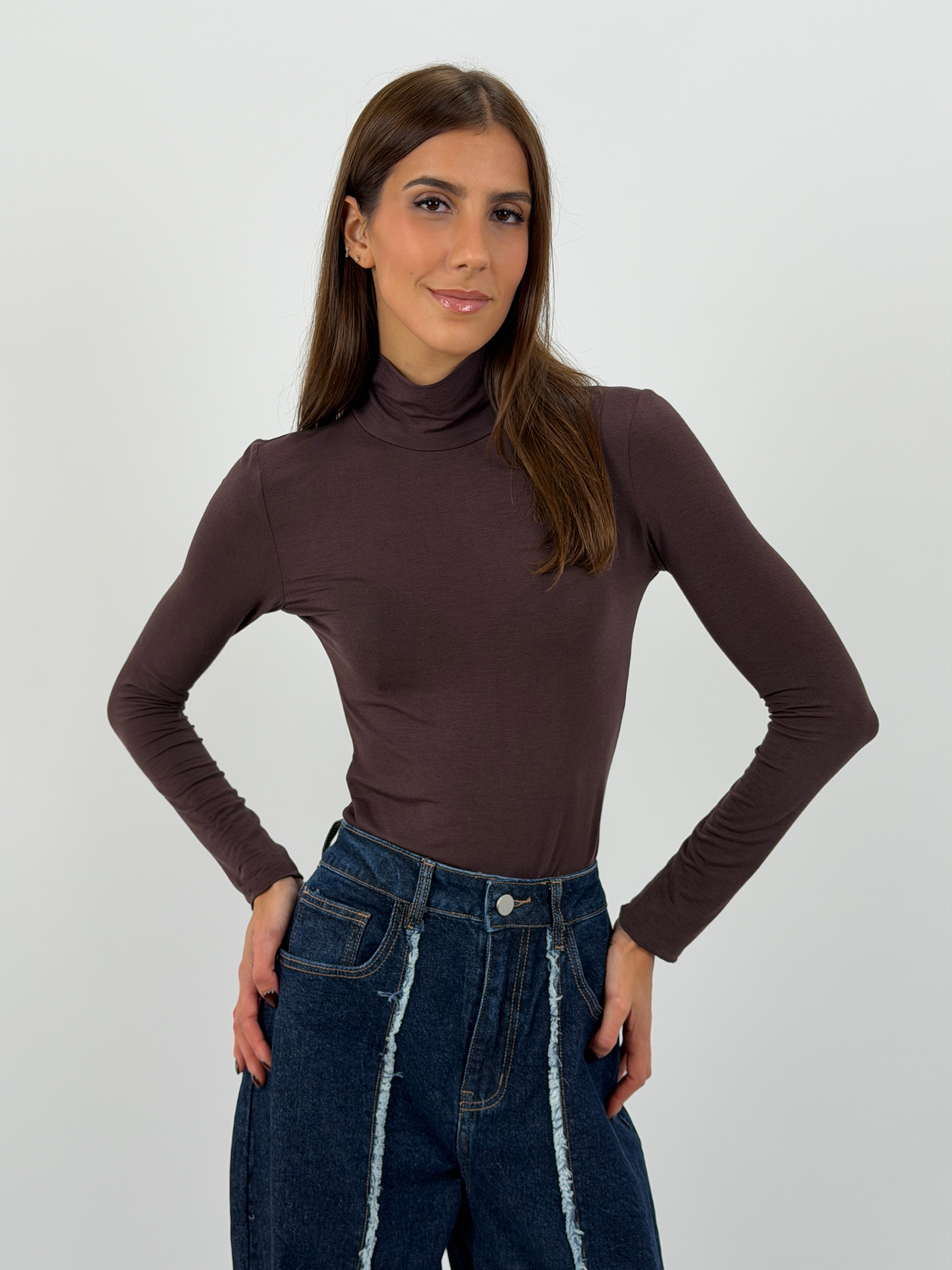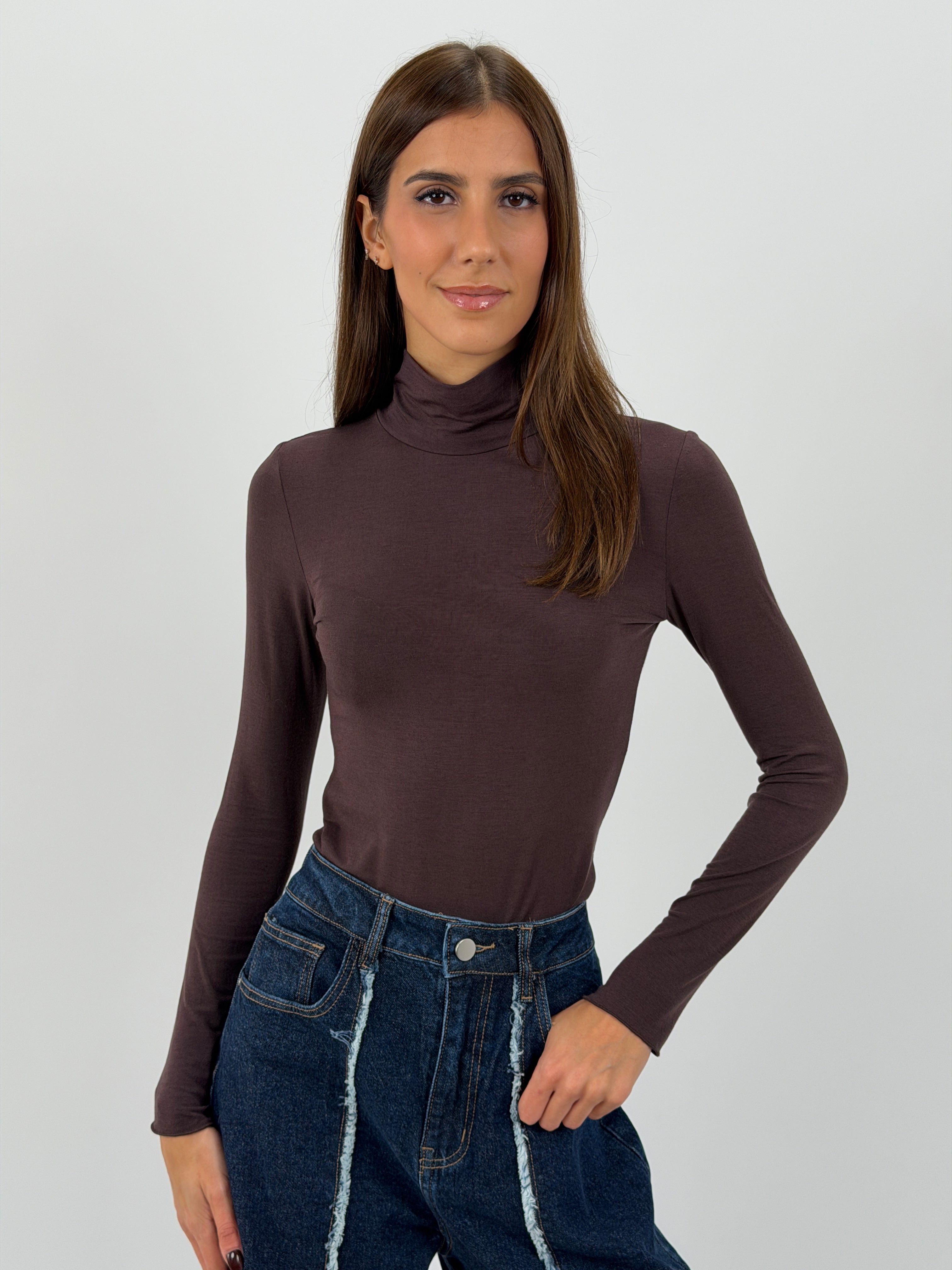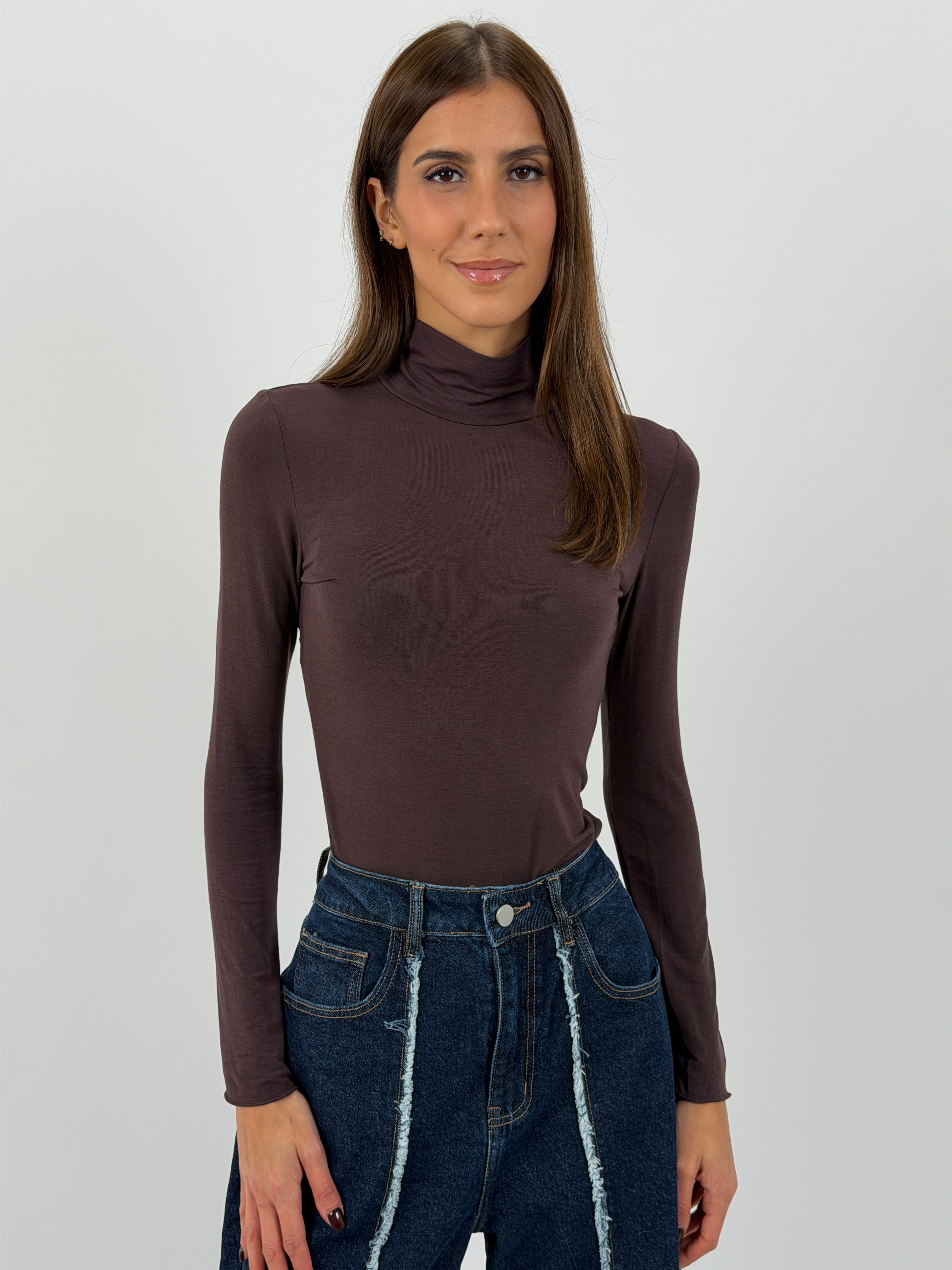 Maglia dolcevita marrone con collo alto in tessuto leggero e morbido misto cashmere.
