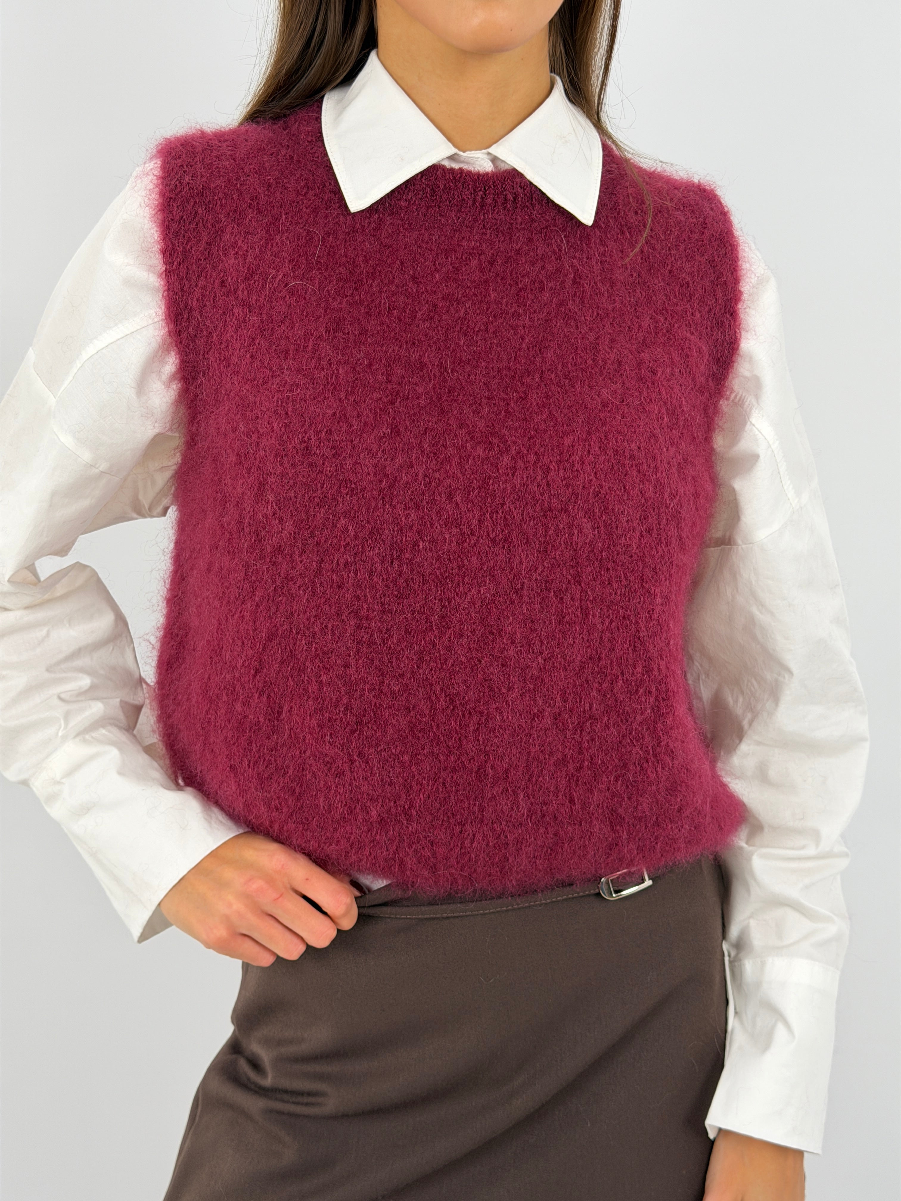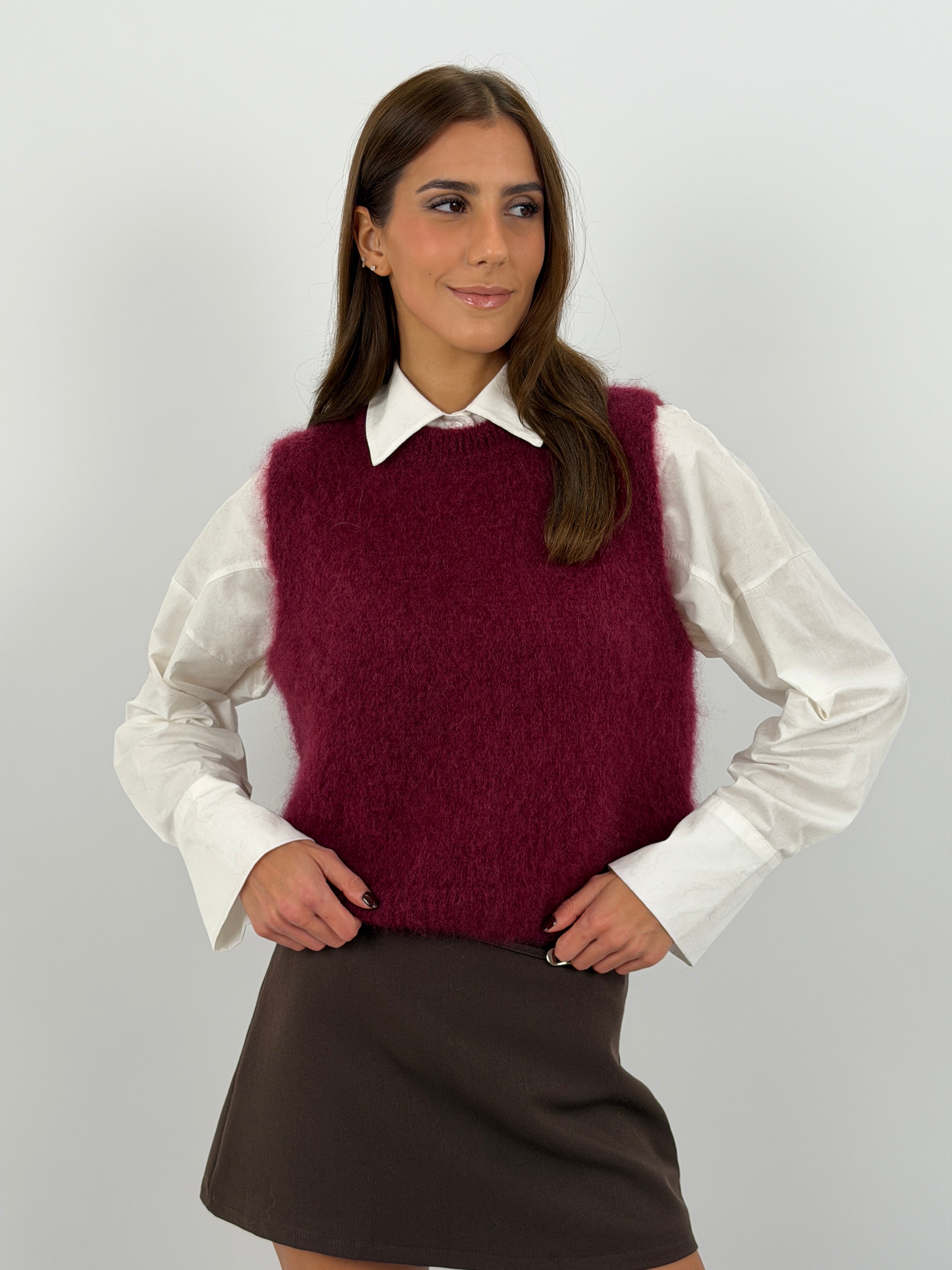 Gilet bordeaux smanicato a girocollo in kid mohair con finiture a costine.