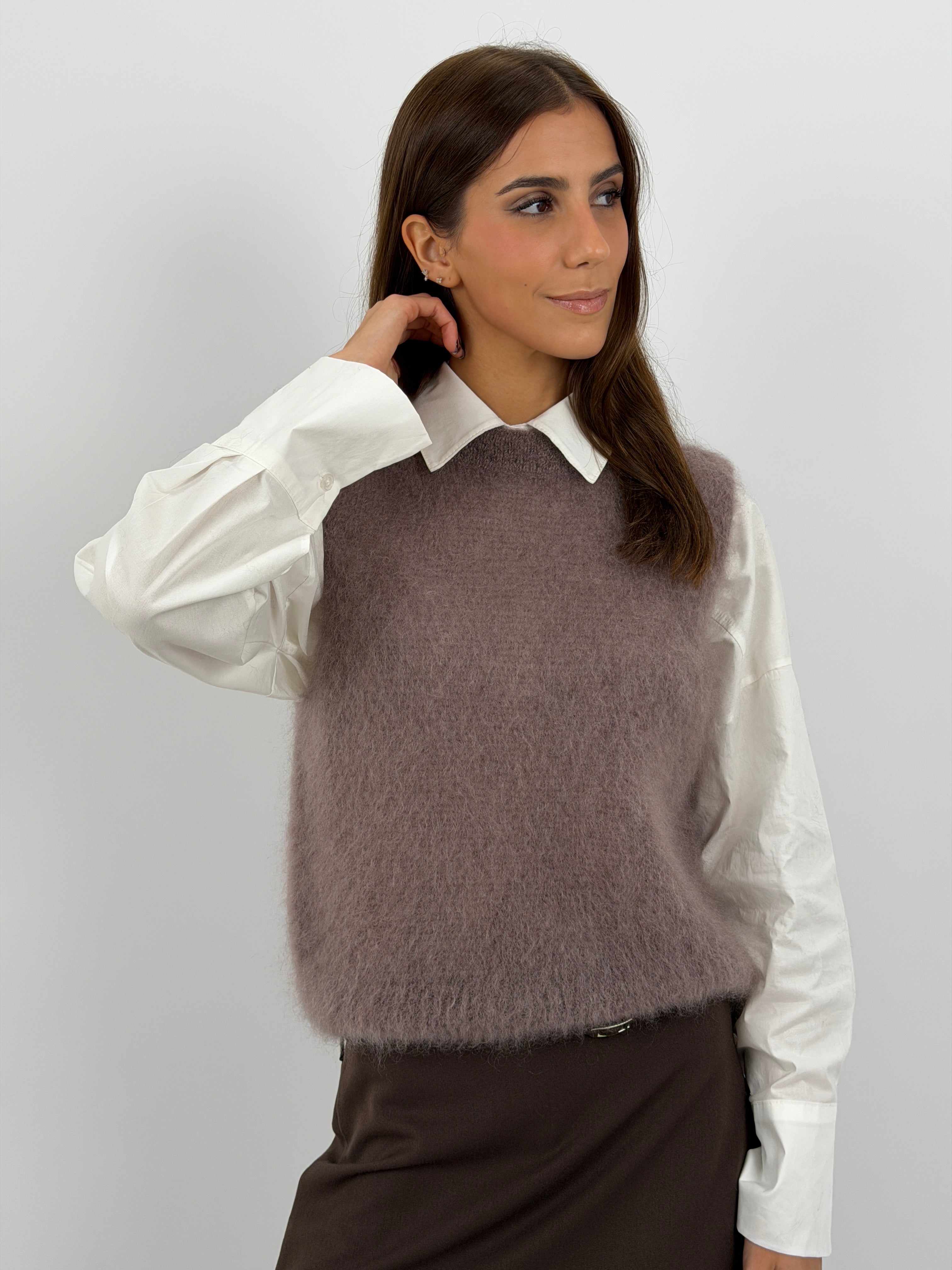 Gilet mocha mousse smanicato a girocollo in kid mohair con finiture a costine.