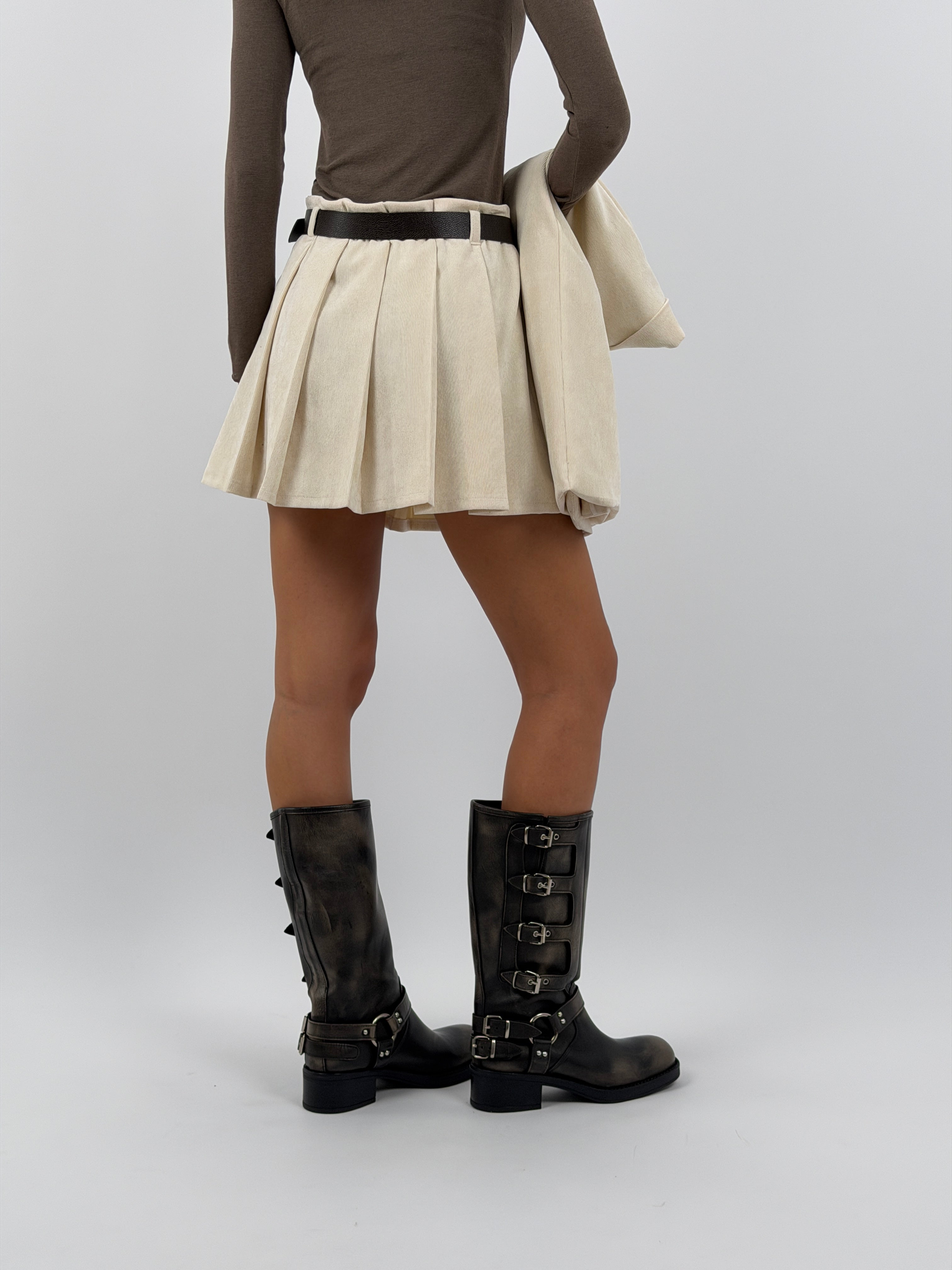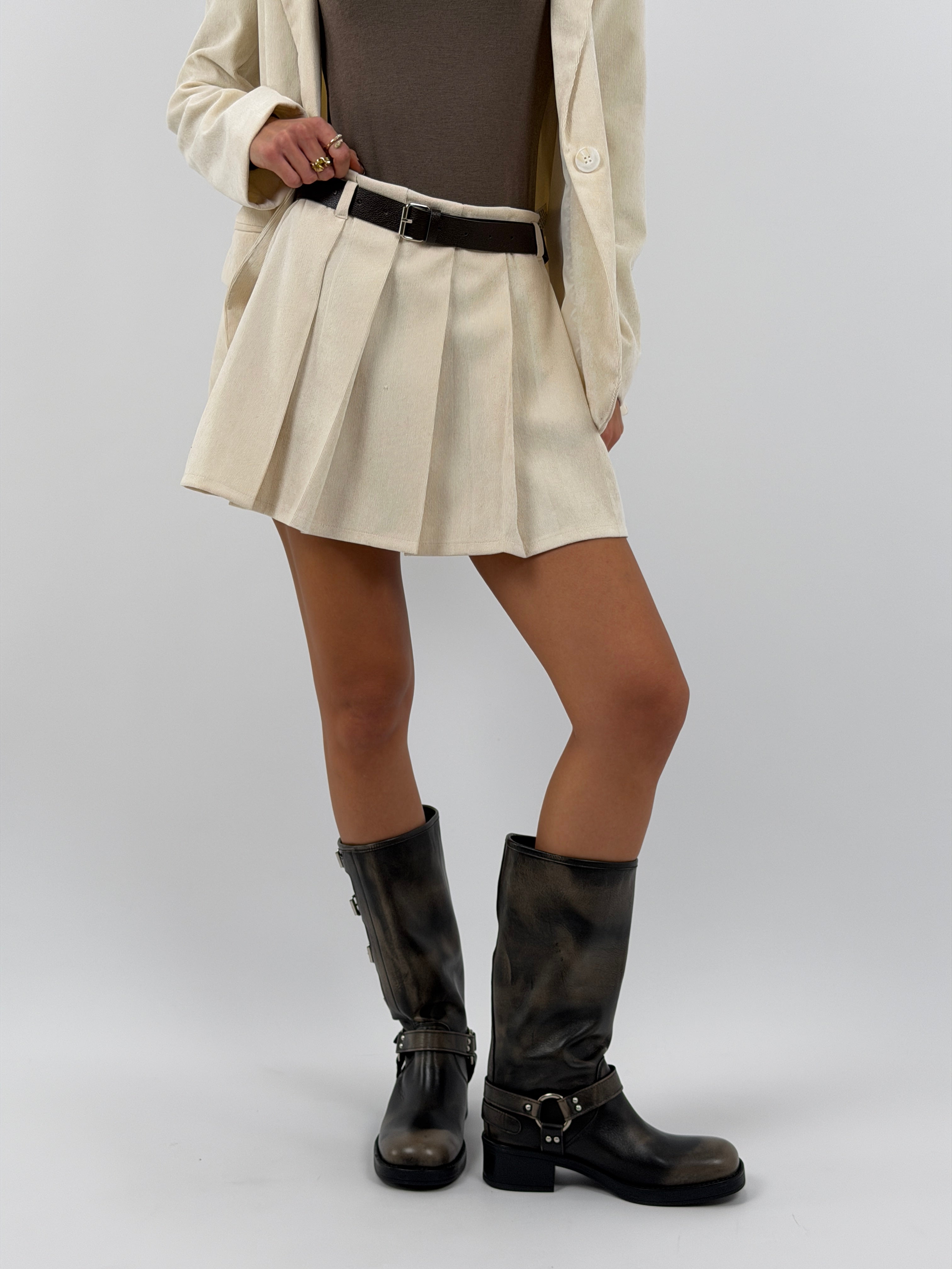Gonna corta a pieghe crema in velluto a coste con cintura coordinata e chiusura laterale con zip.