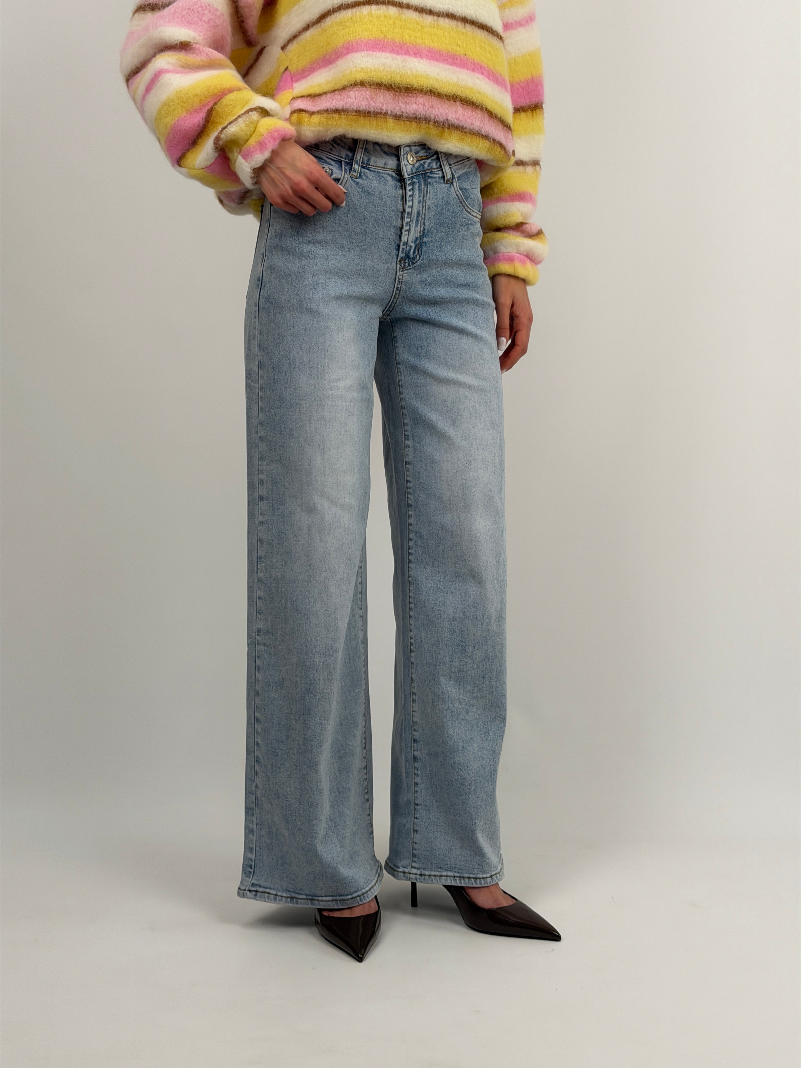 Jeans wide leg in denim lavaggio chiaro con cinque tasche, chiusura con zip e bottone.