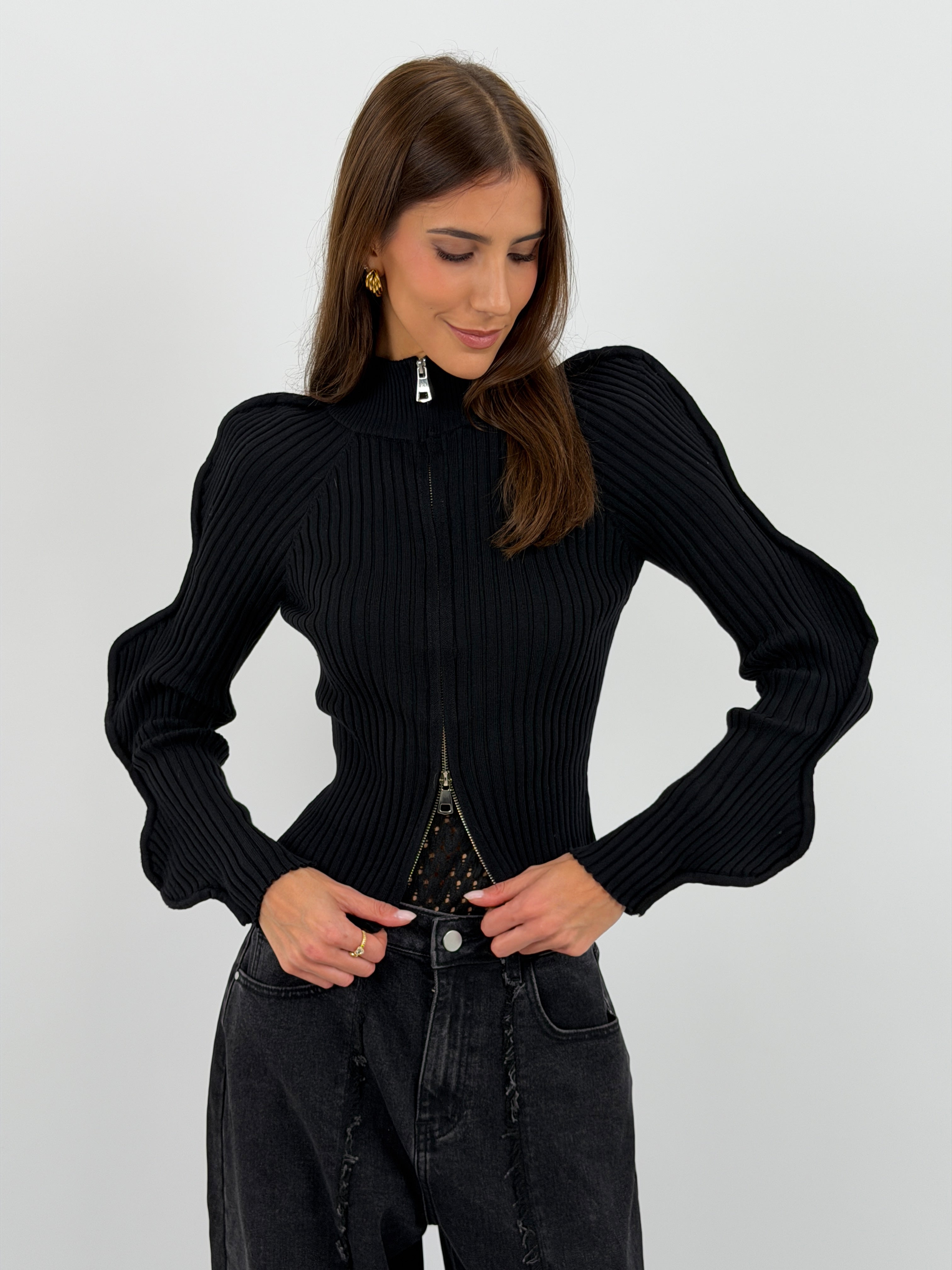Maglia a costine nera con collo a lupetto, maniche effetto onda e chiusura frontale con zip.
