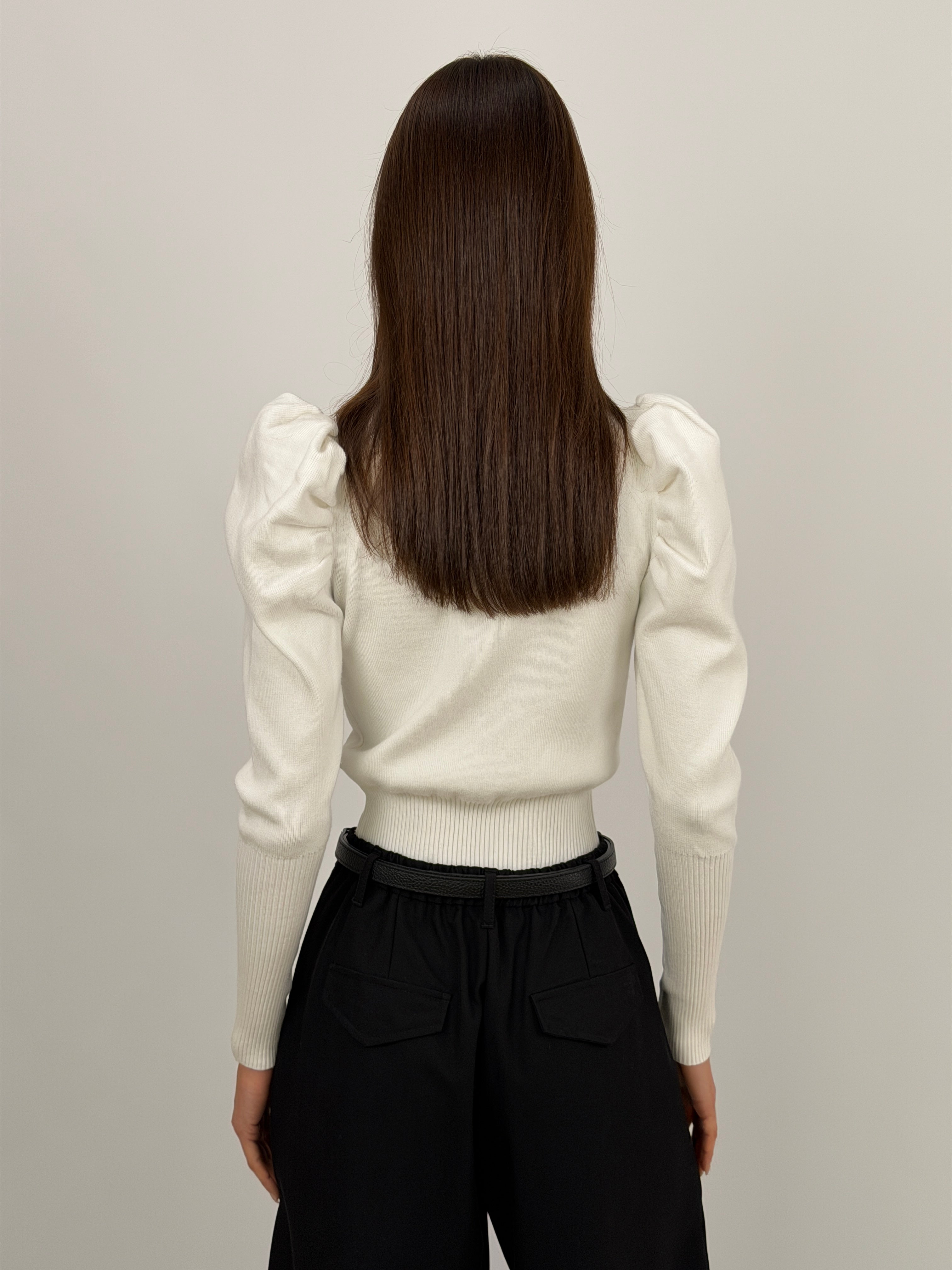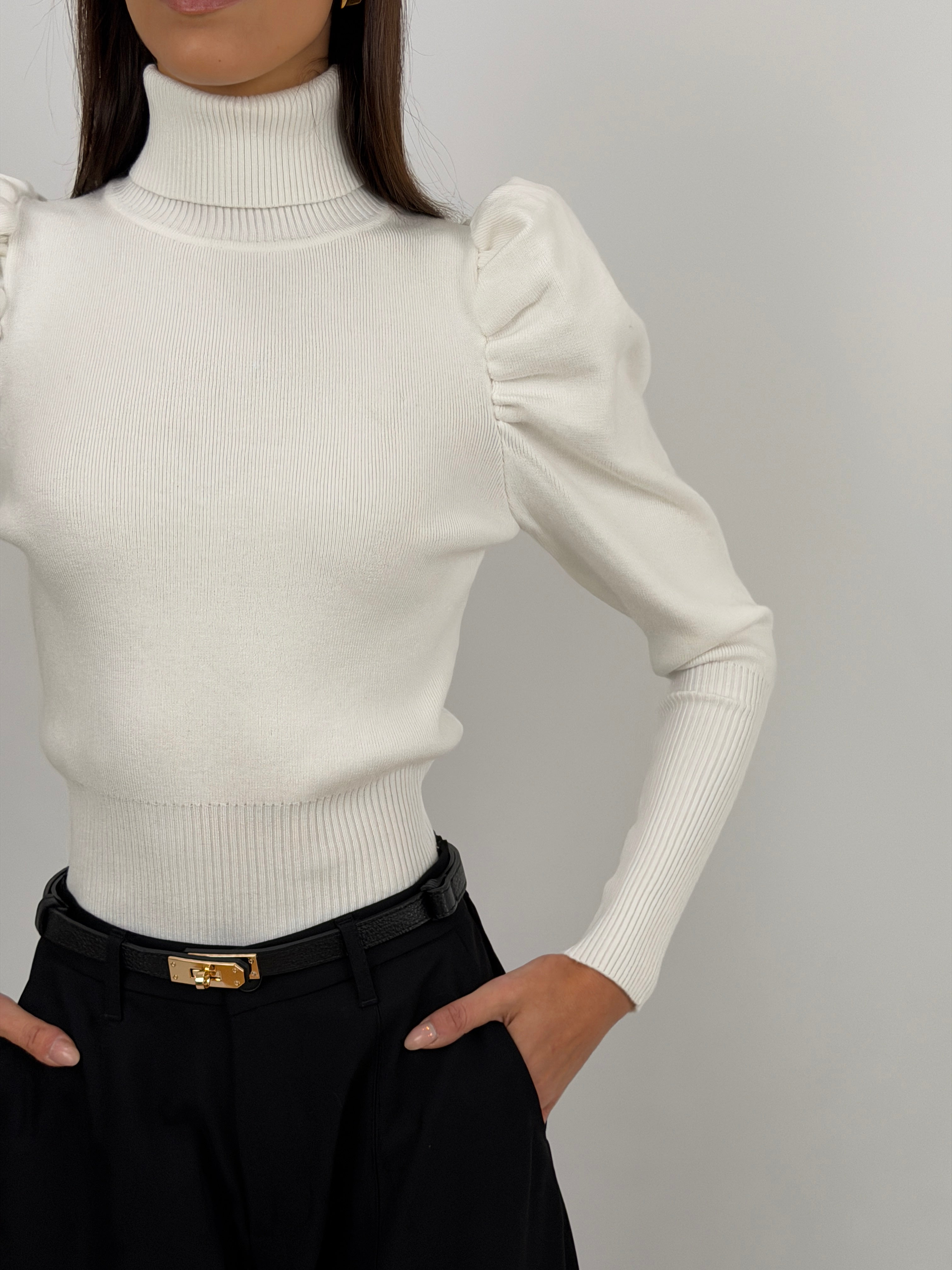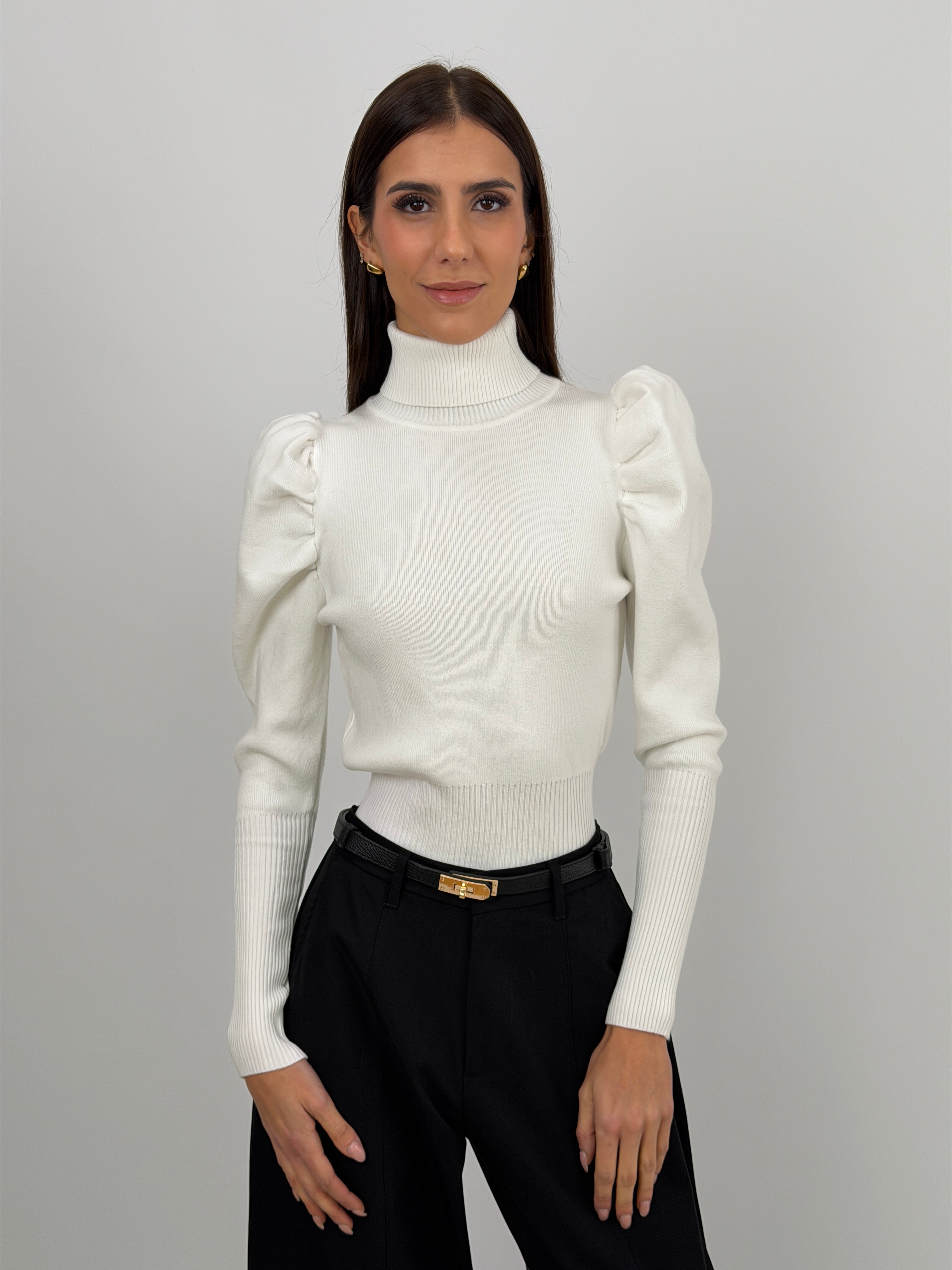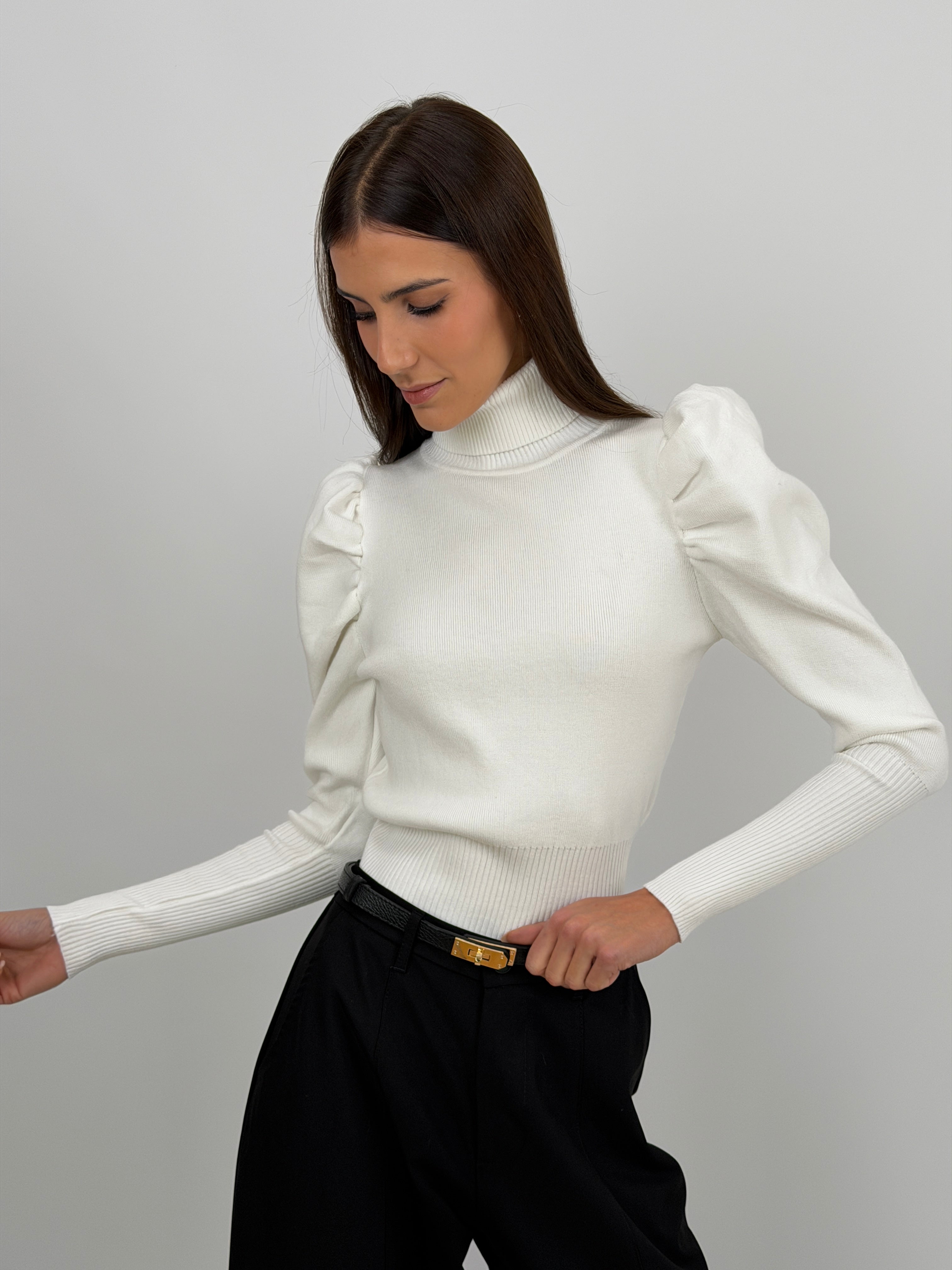 Maglione bianco a collo alto con maniche a sbuffo e finiture a coste