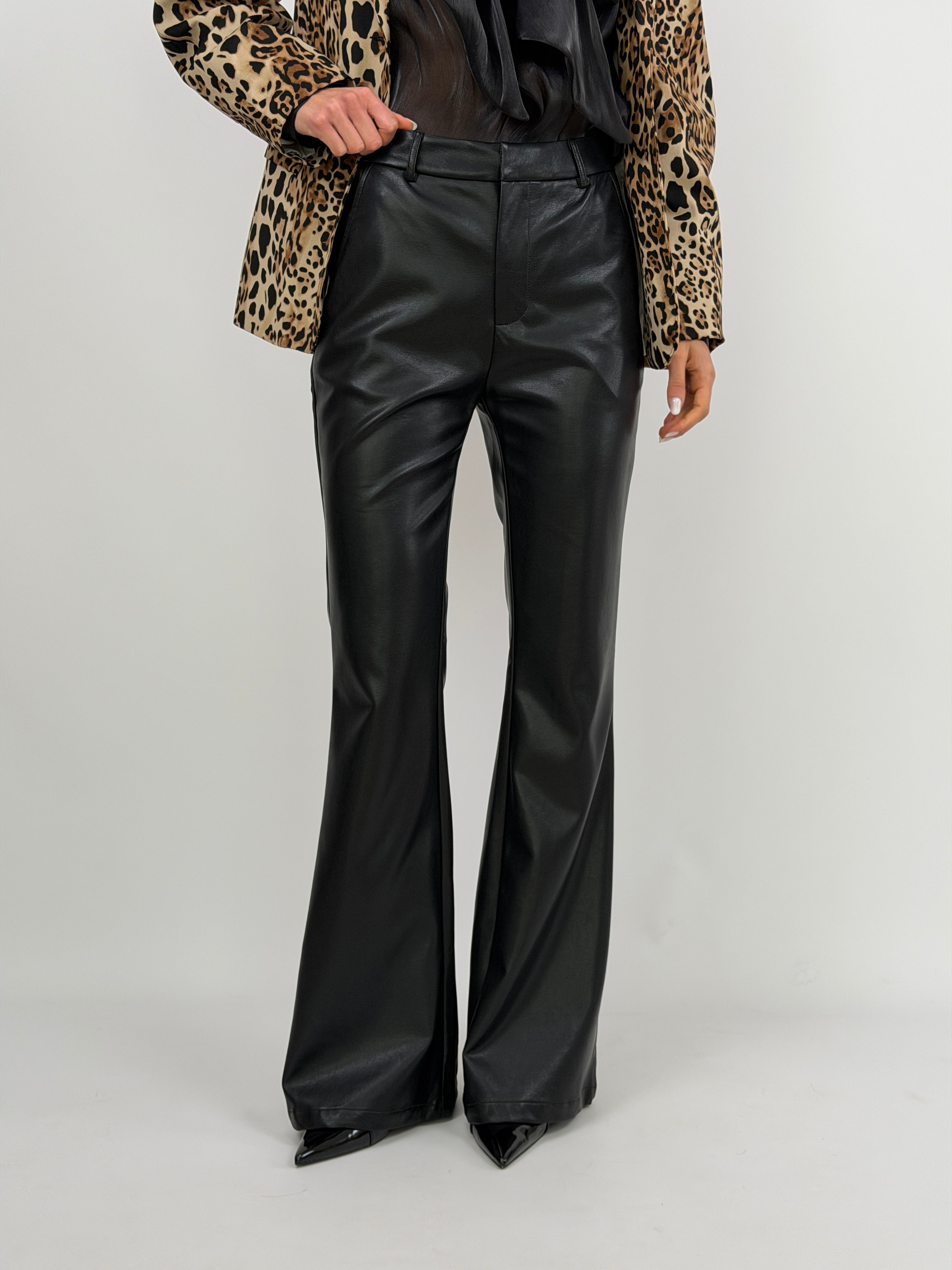 Pantalone Lumina lungo modello flare in eco pelle nero con tasche laterali, chiusura con zip e gancetto