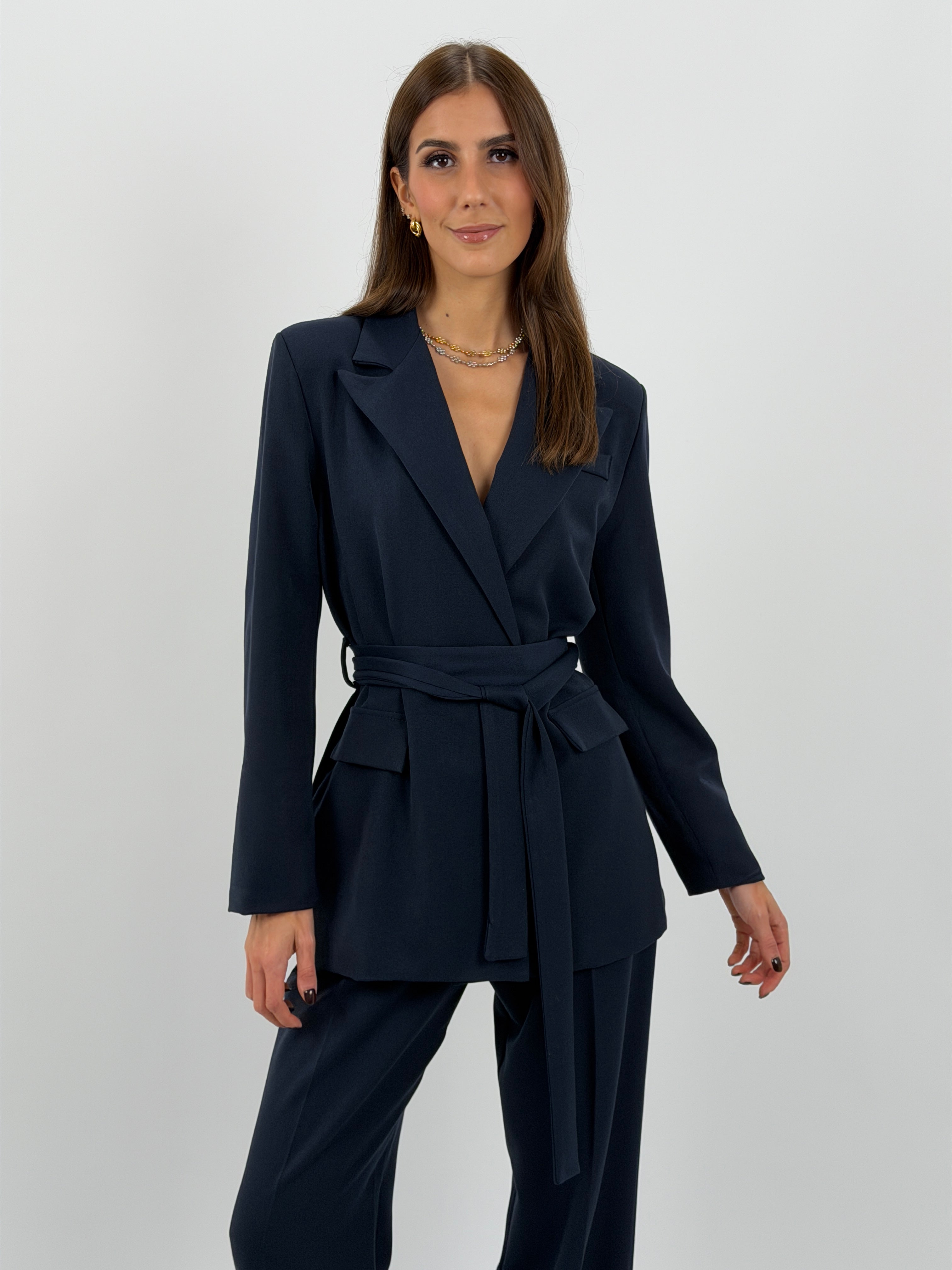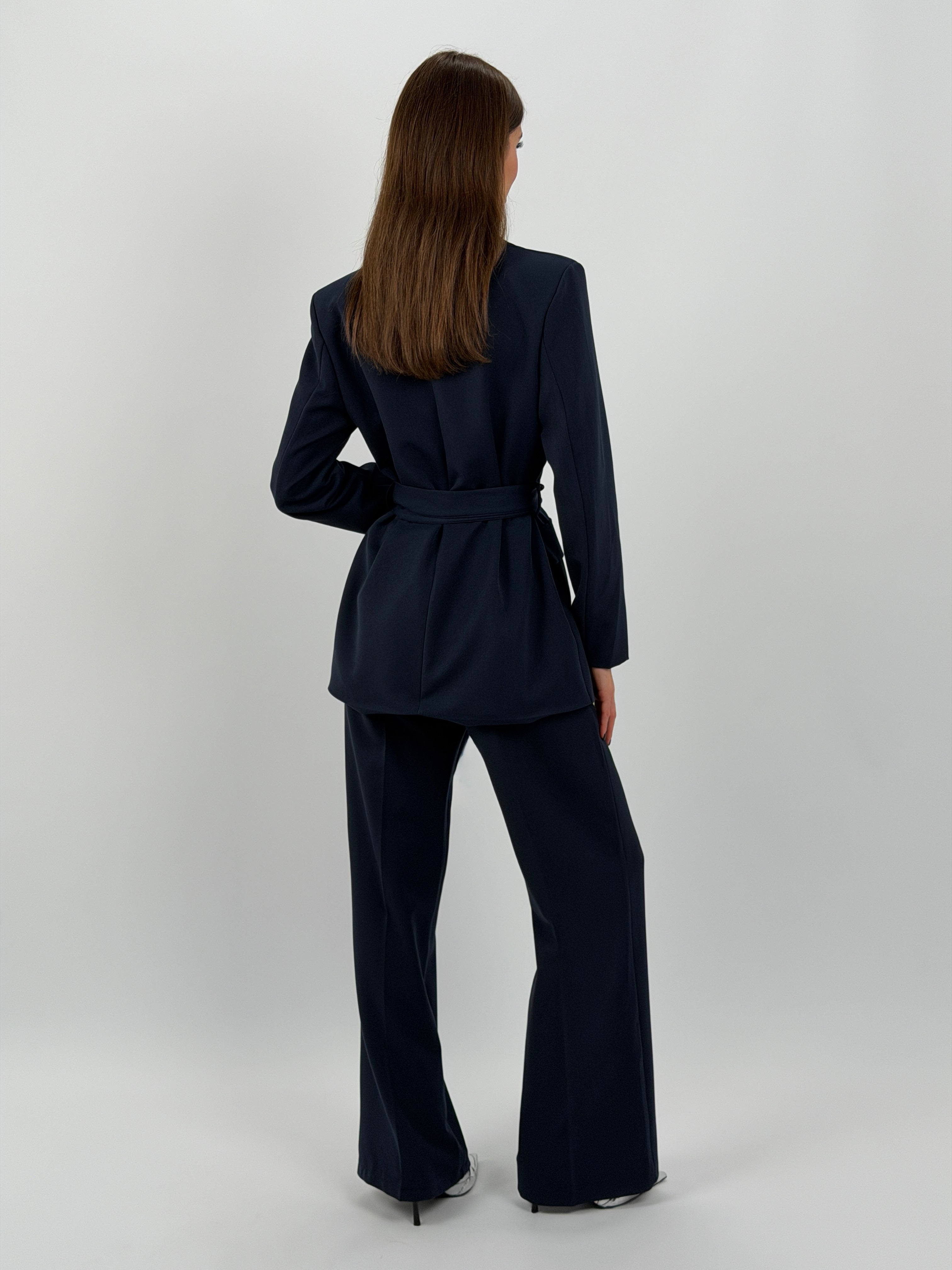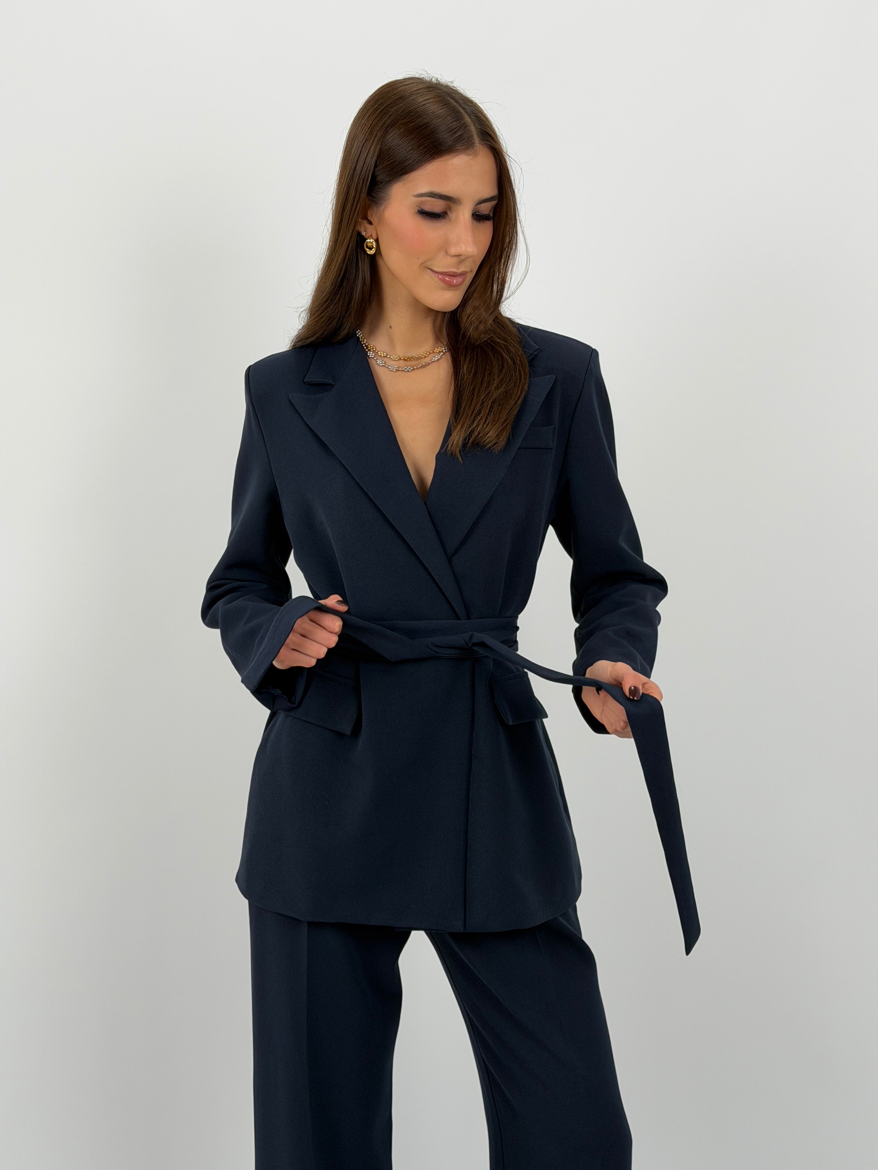 Completo blu in morbido tessuto con giacca doppiopetto foderata e cintura. Pantalone lungo a palazzo con tasche laterali, chiusura con zip e bottone ed elastico in vita.