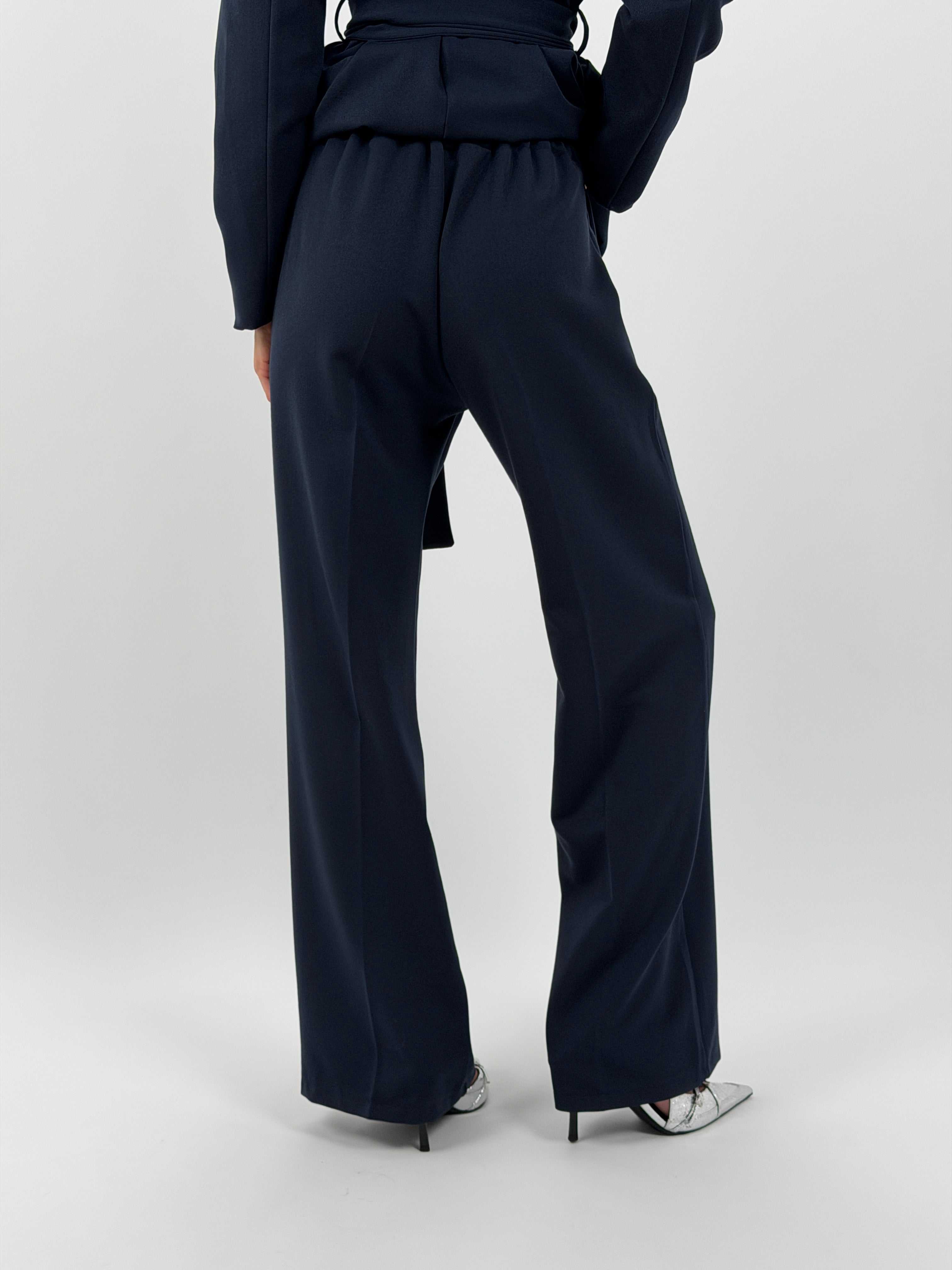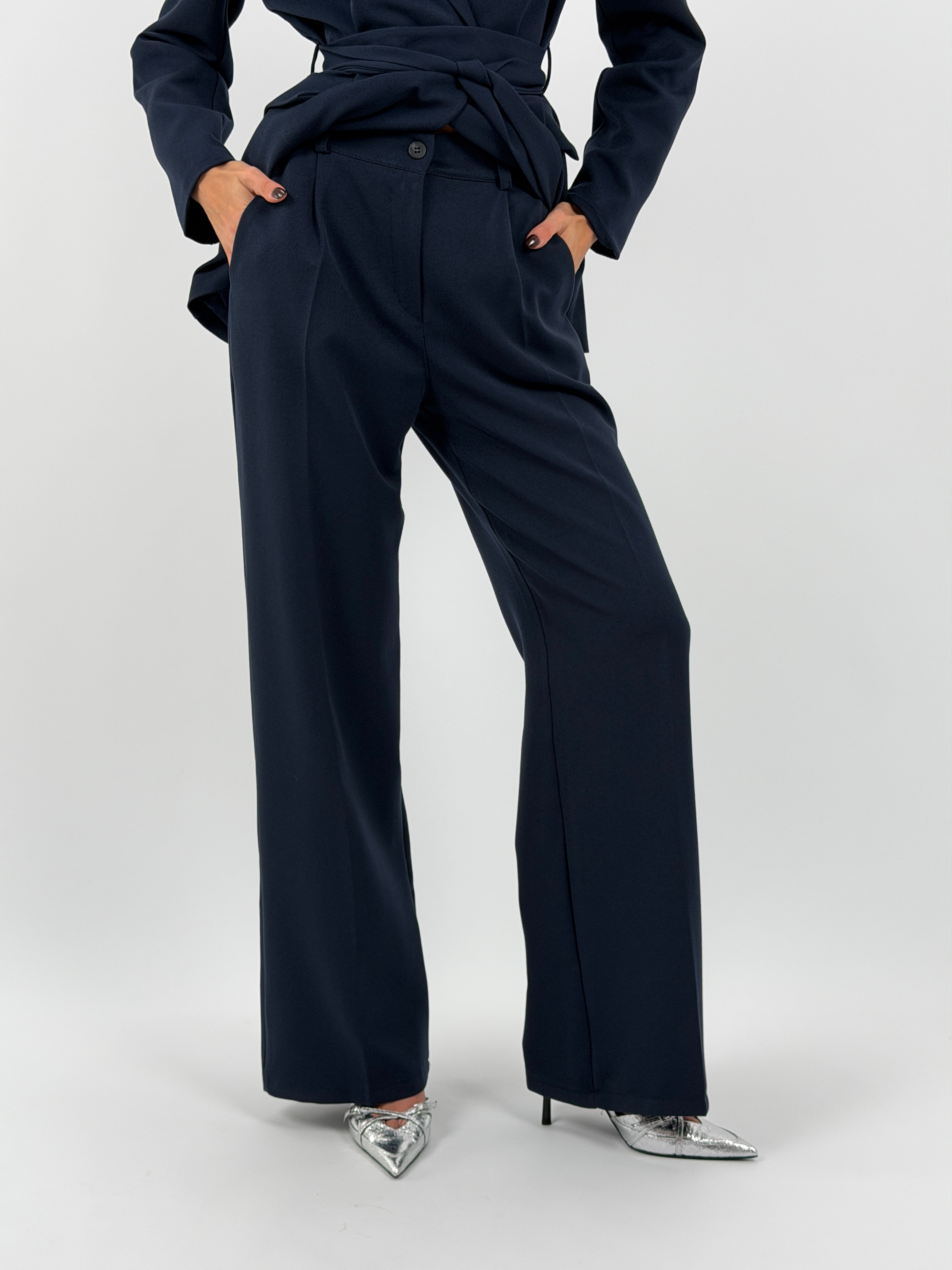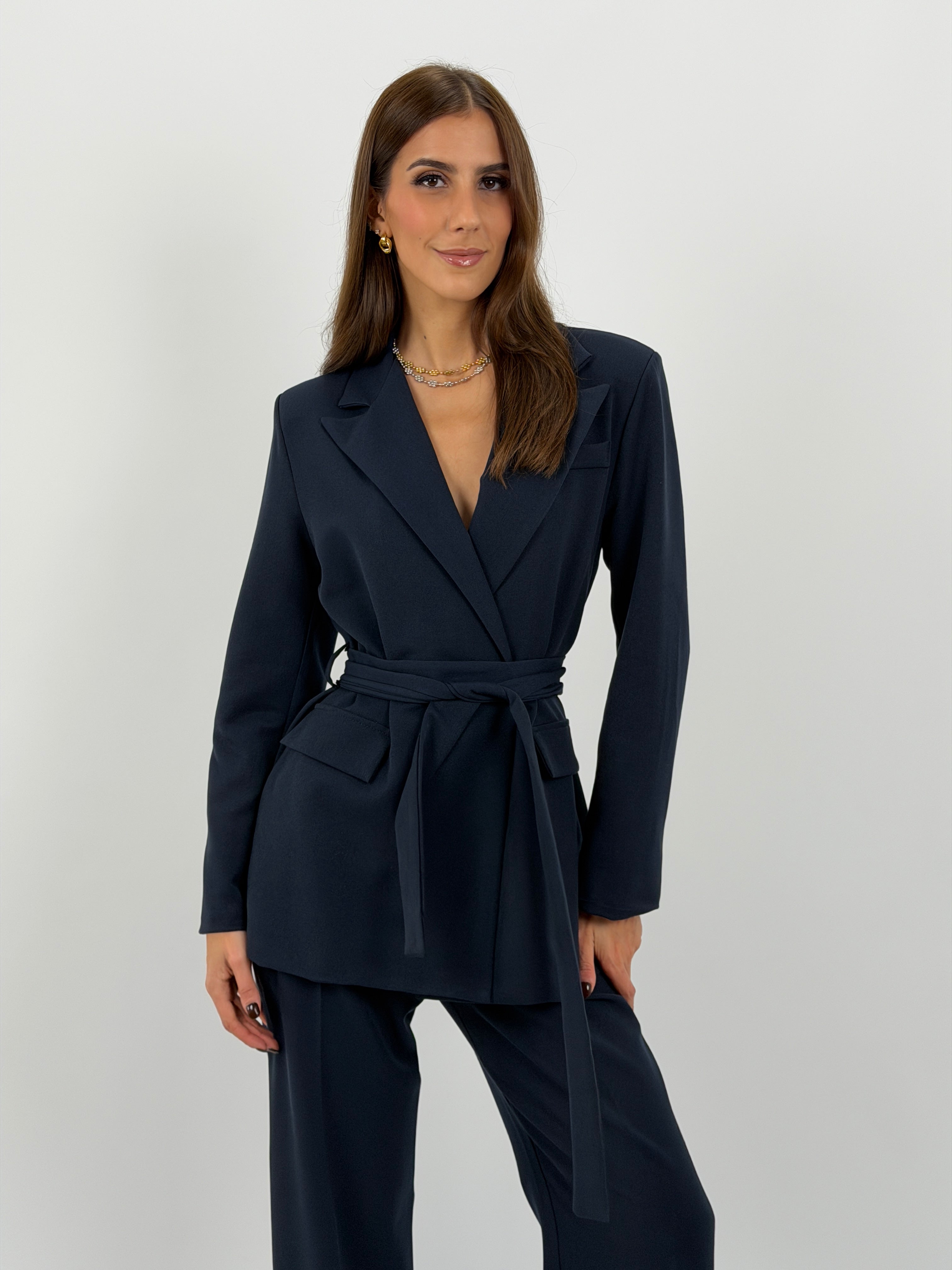 Completo blu in morbido tessuto con giacca doppiopetto foderata e cintura. Pantalone lungo a palazzo con tasche laterali, chiusura con zip e bottone ed elastico in vita.