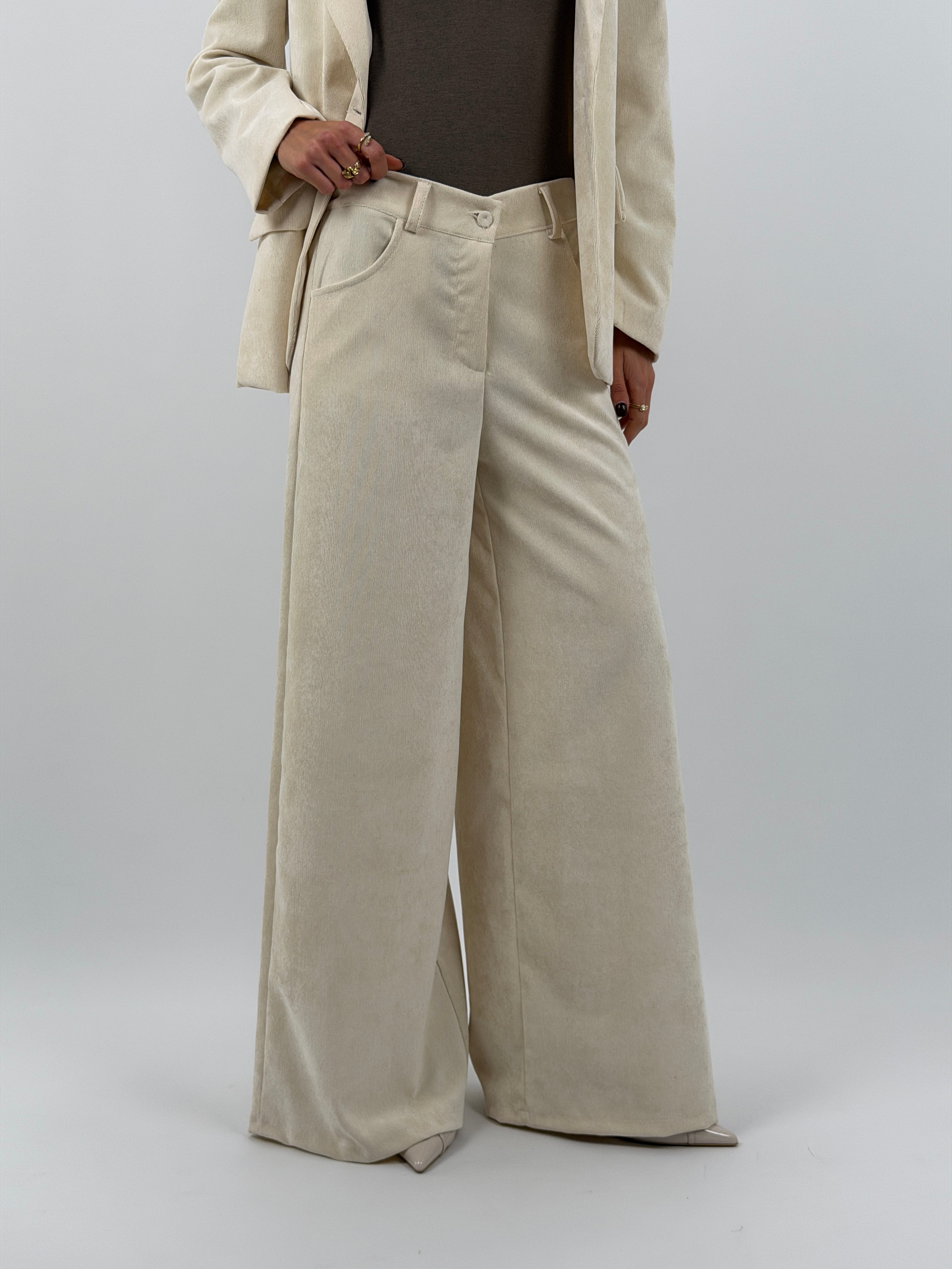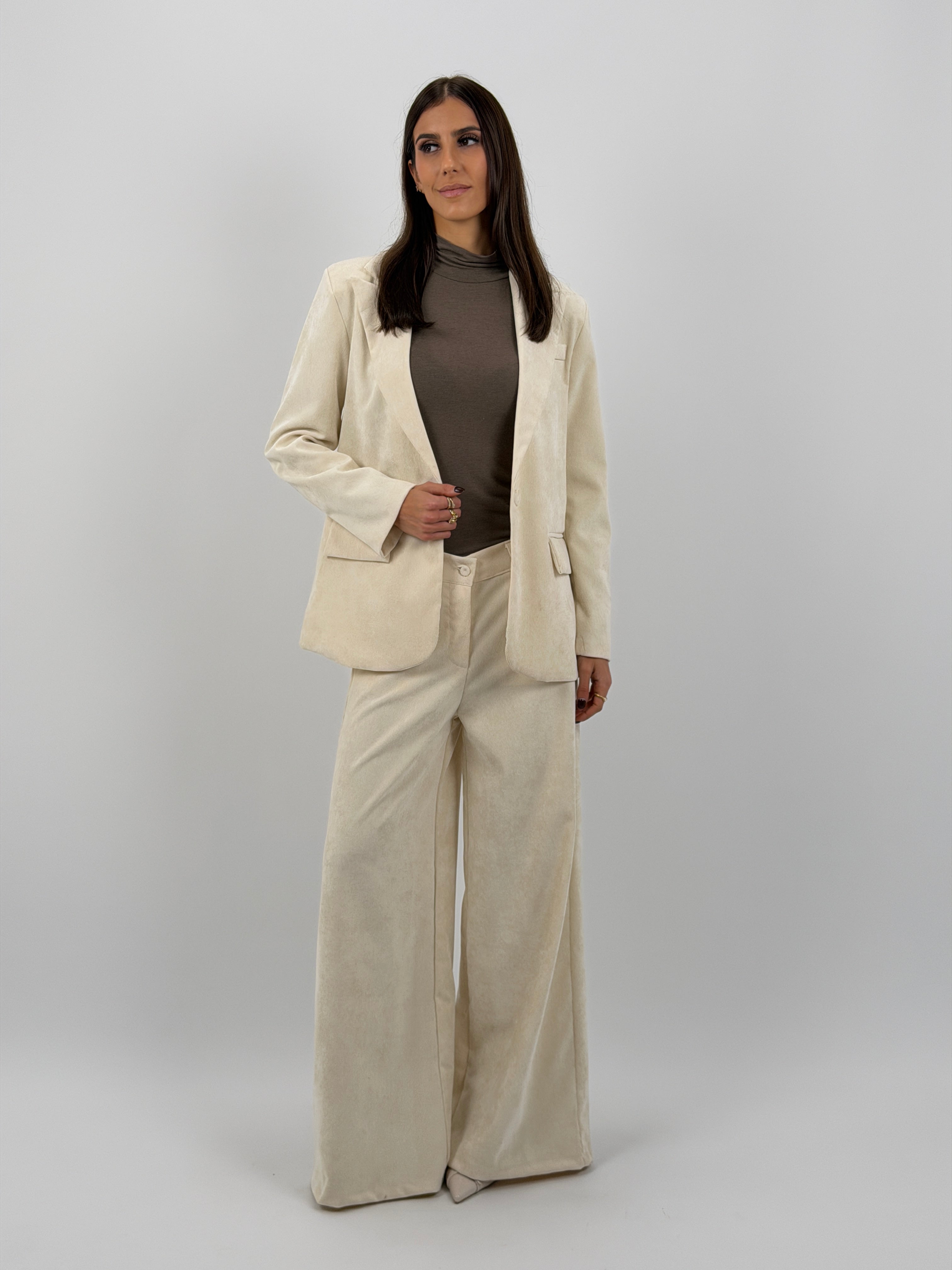 Completo in velluto crema a coste strette con giacca e pantalone.
