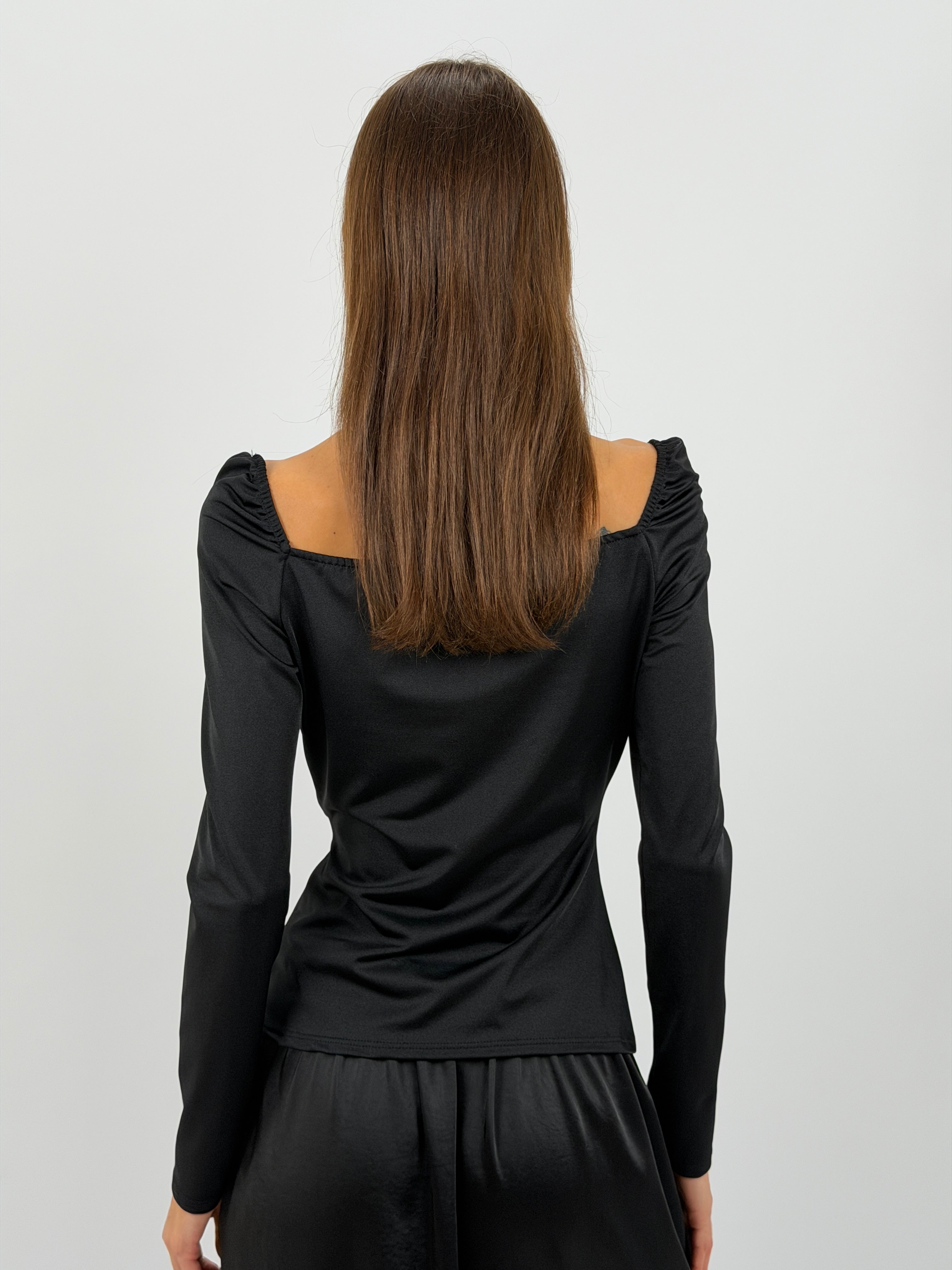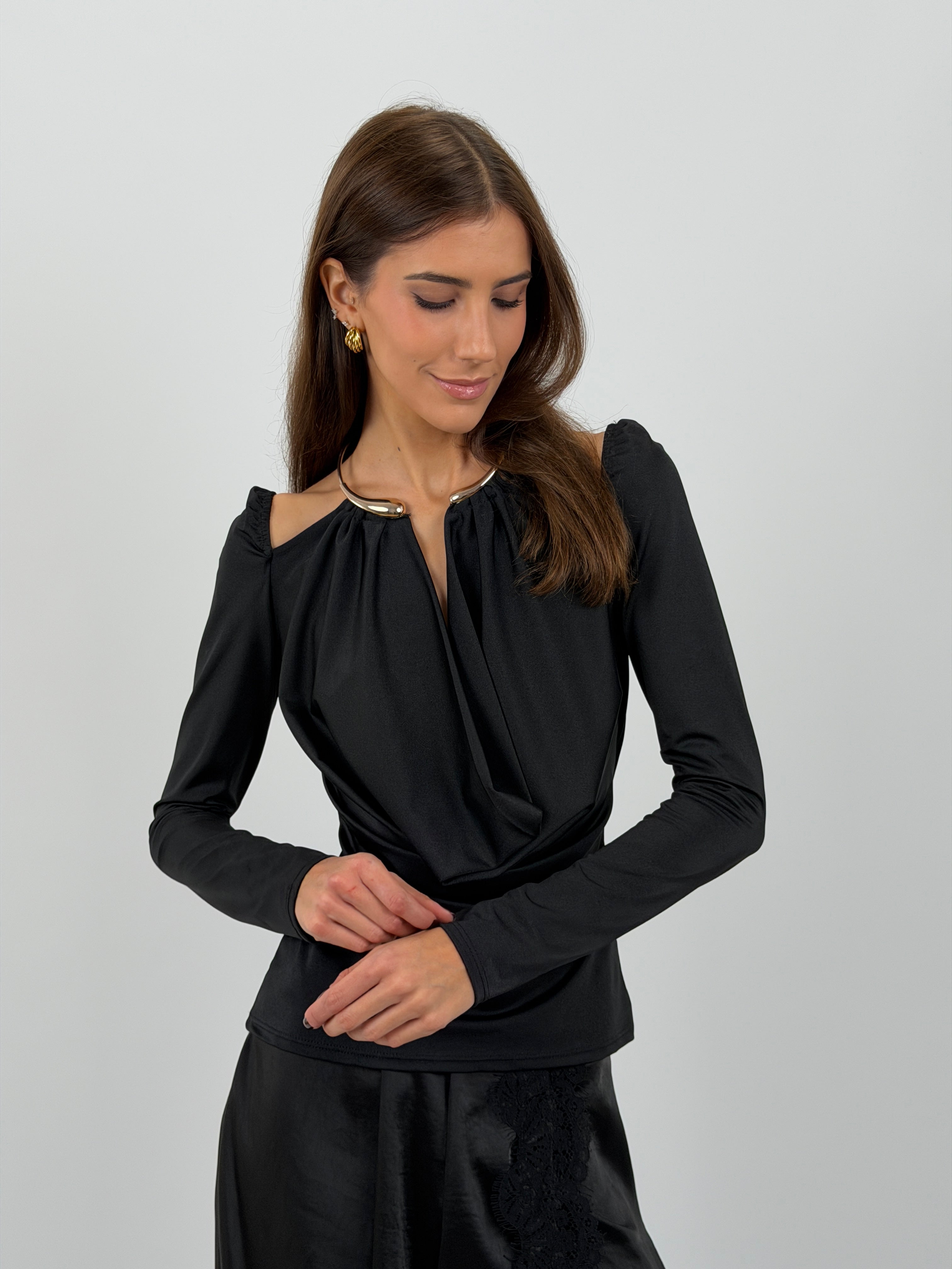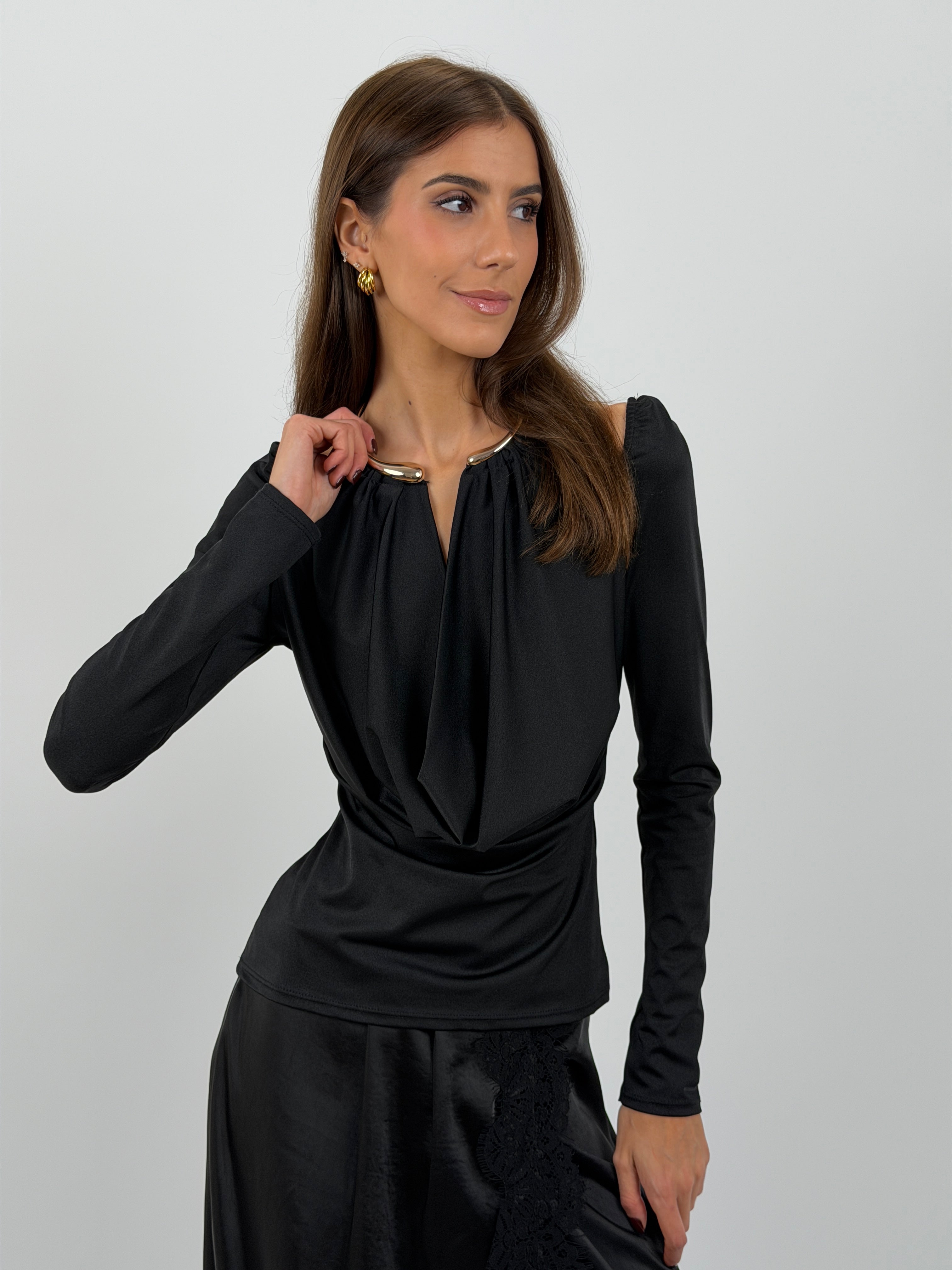 Maglia nera in lycra a maniche lunghe con scollo squadrato, drappeggio frontale e collarino gioiello.