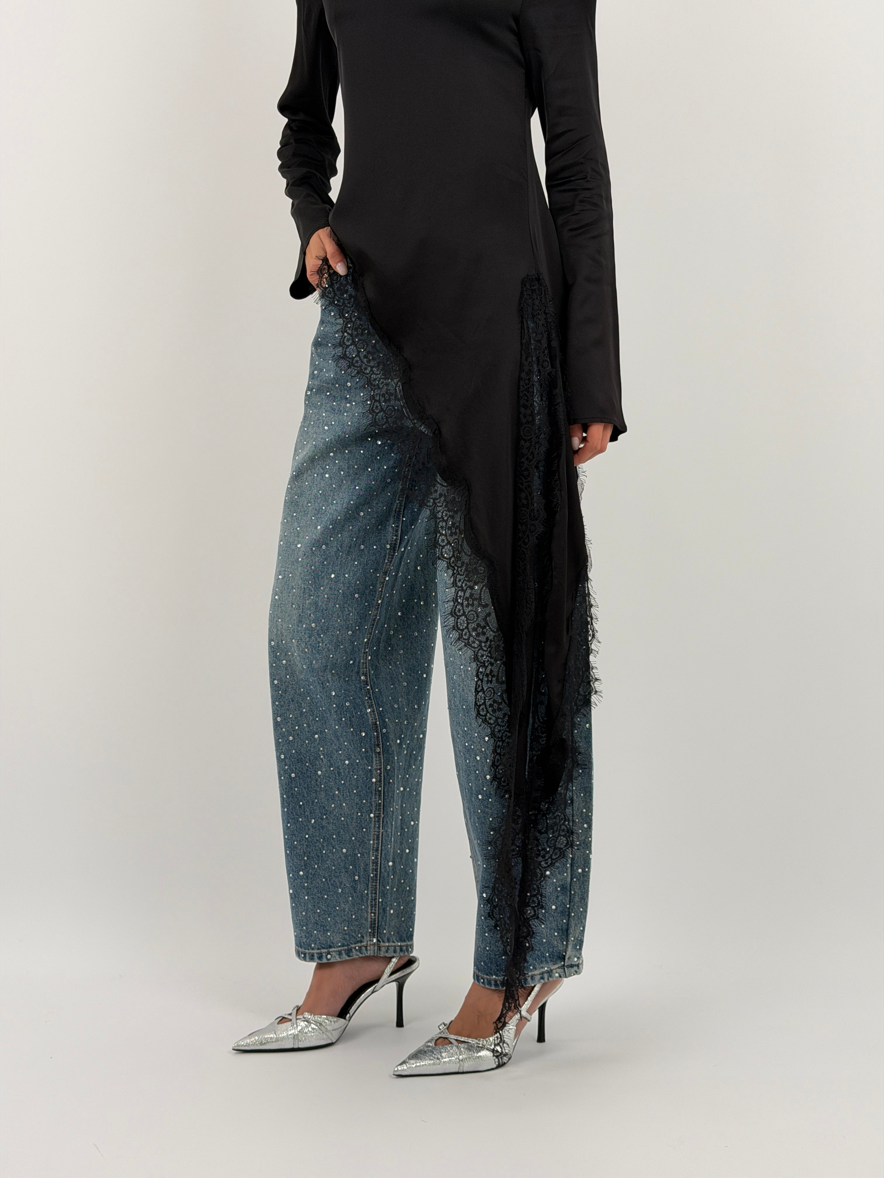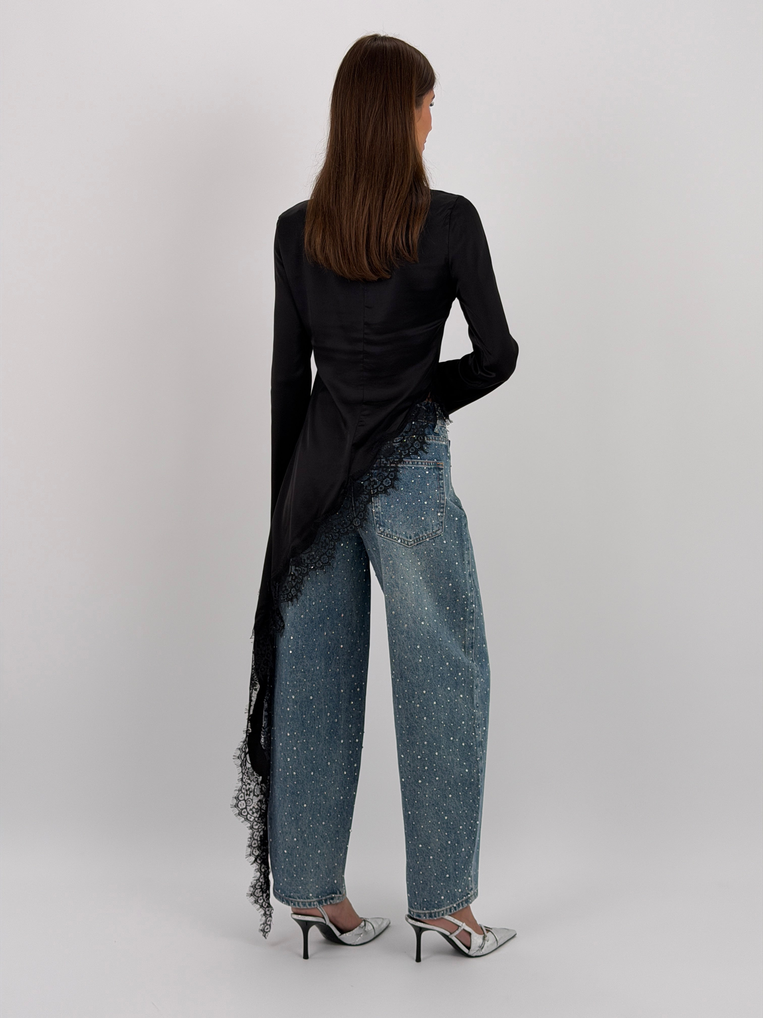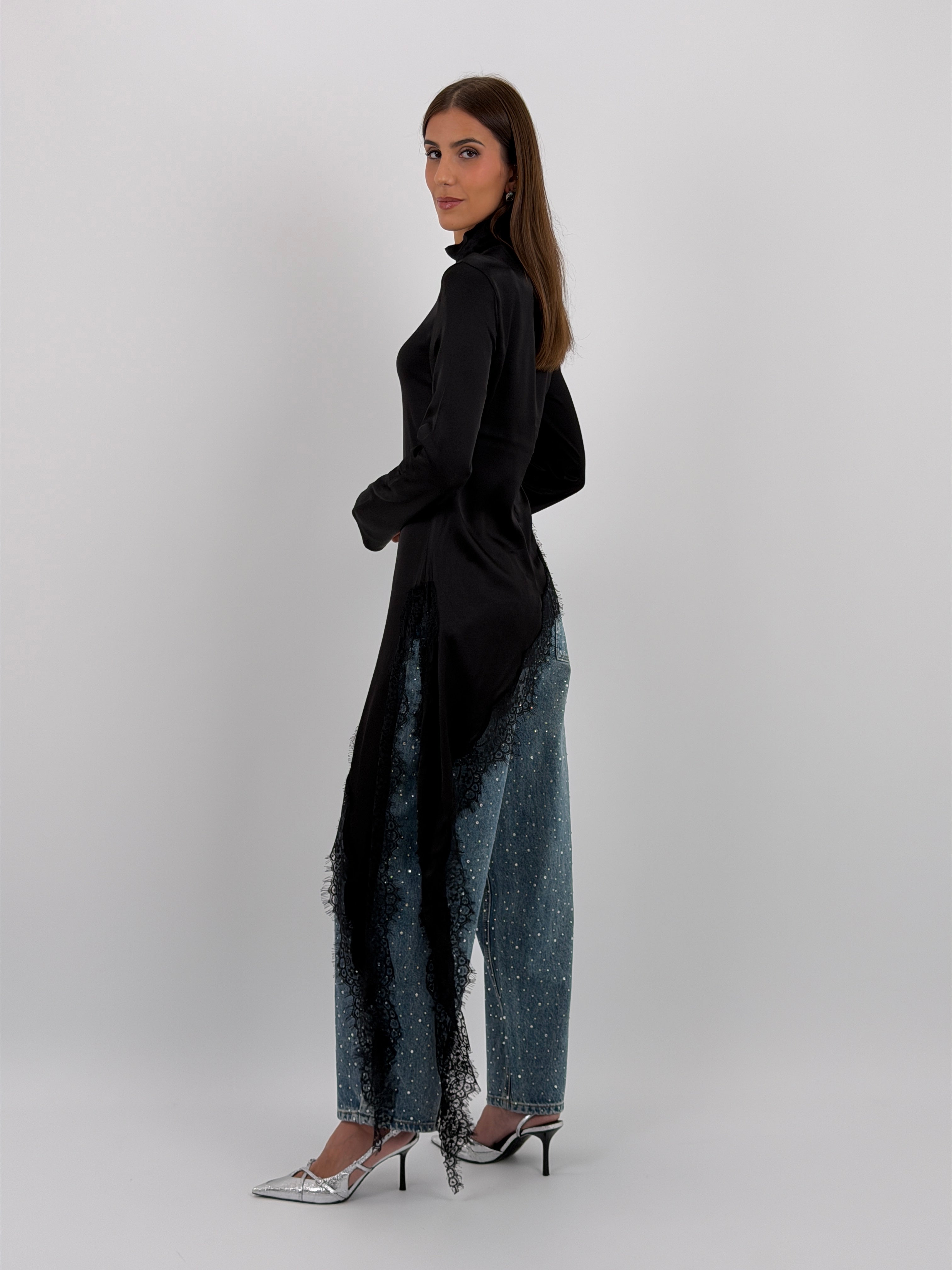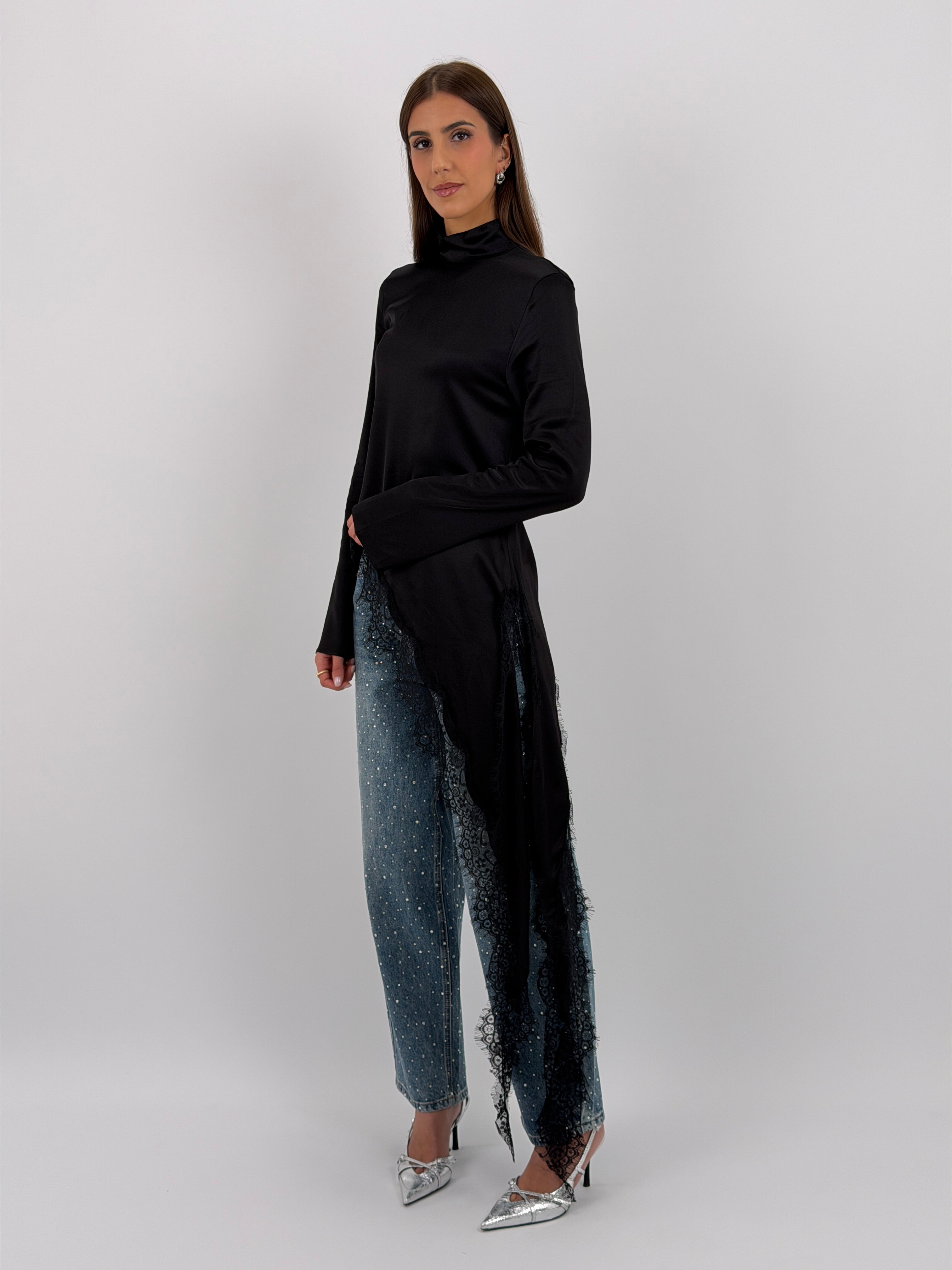 Maglia nera in tessuto satinato con maniche lunghe e collo a lupetto. Lunghezza asimmetrica rifinita con delicati bordi in pizzo.