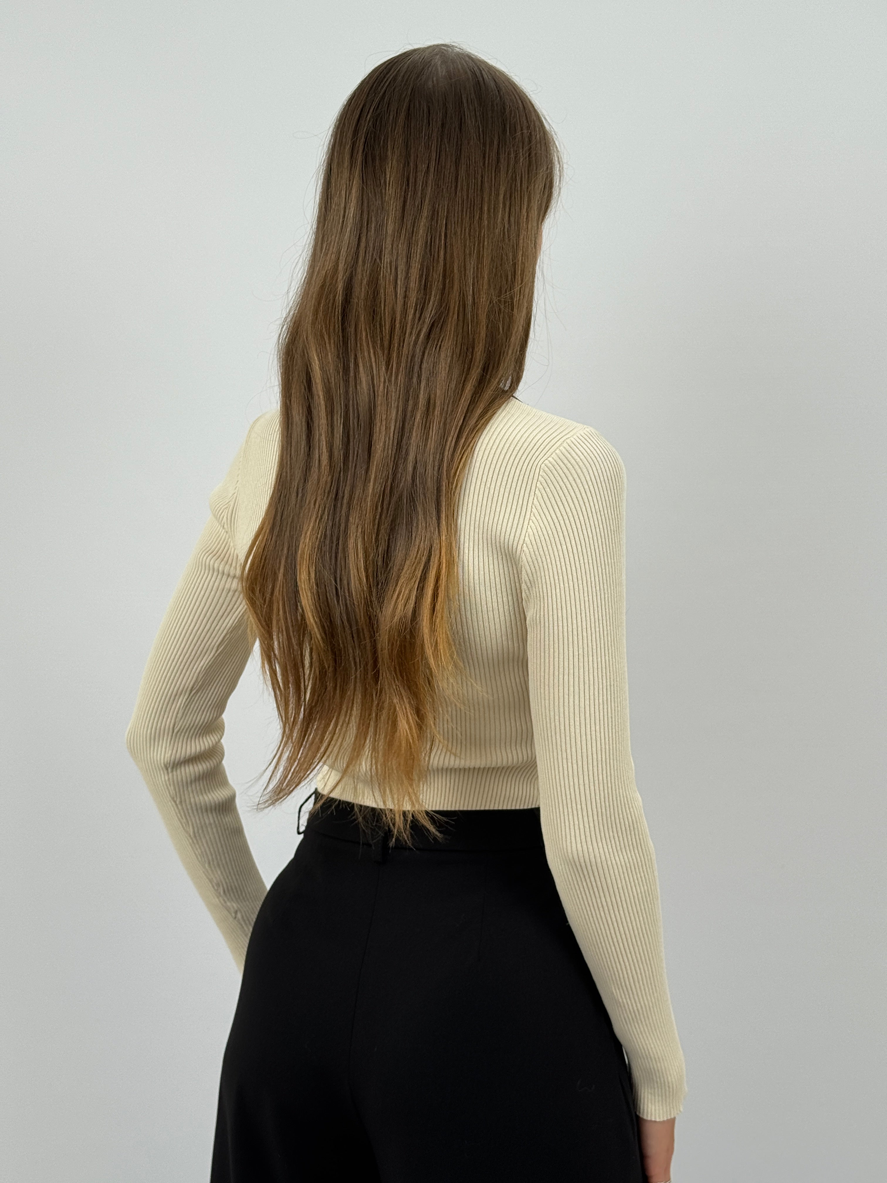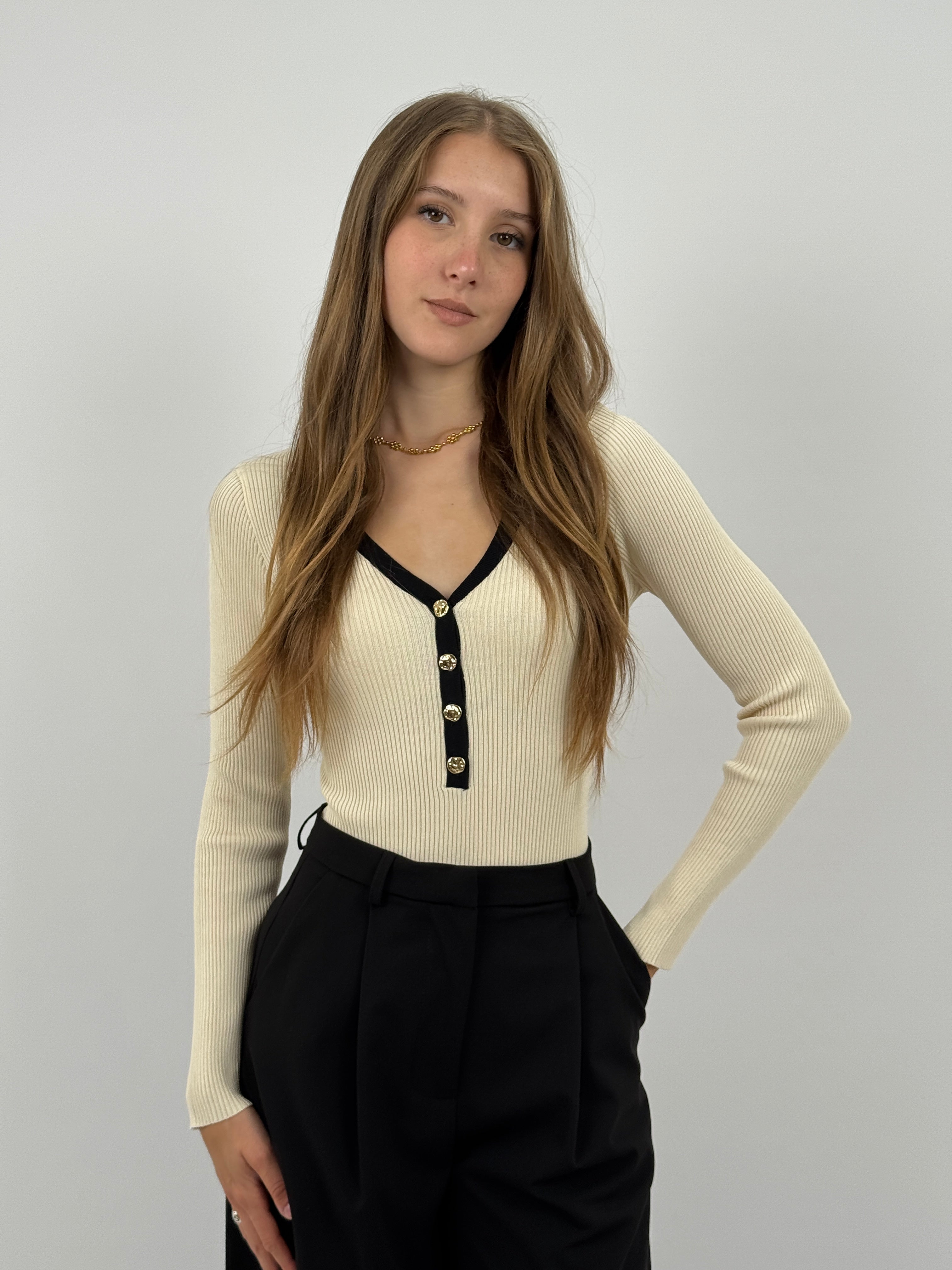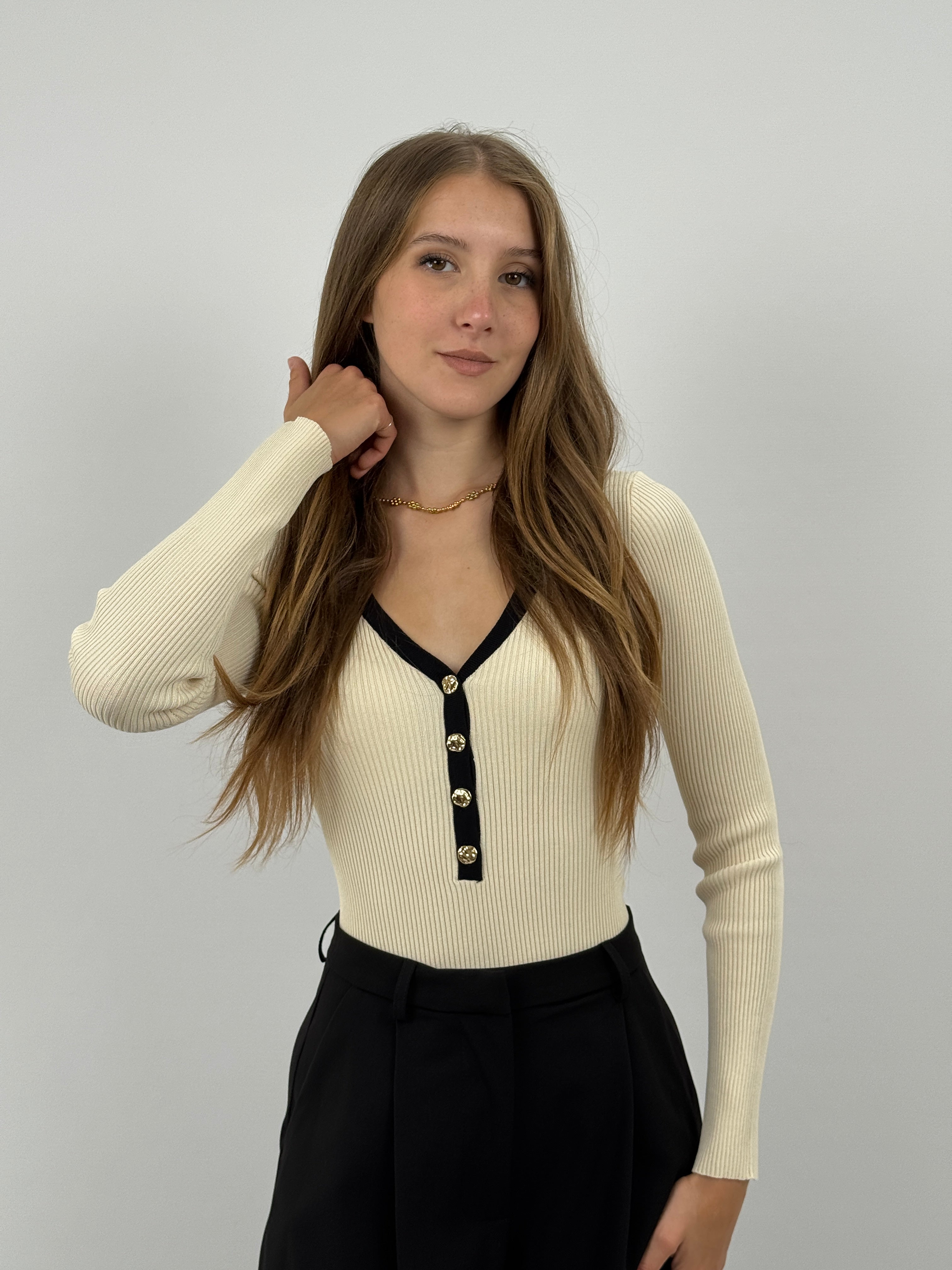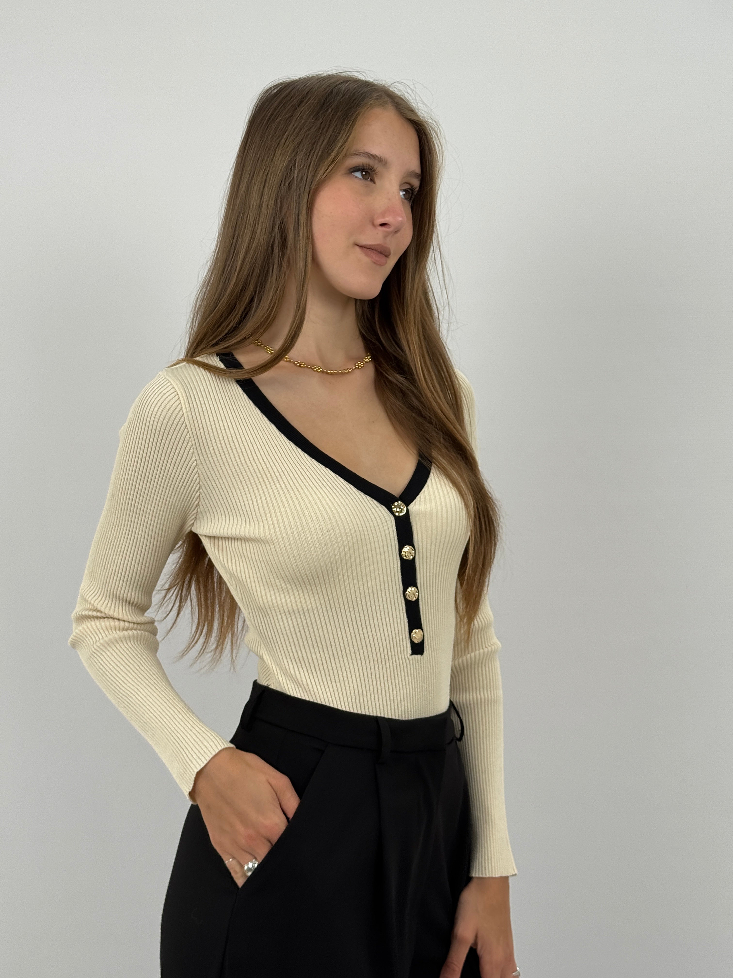 Body in maglia color crema a costine con bordi a contrasto e bottoni dorati sul davanti.